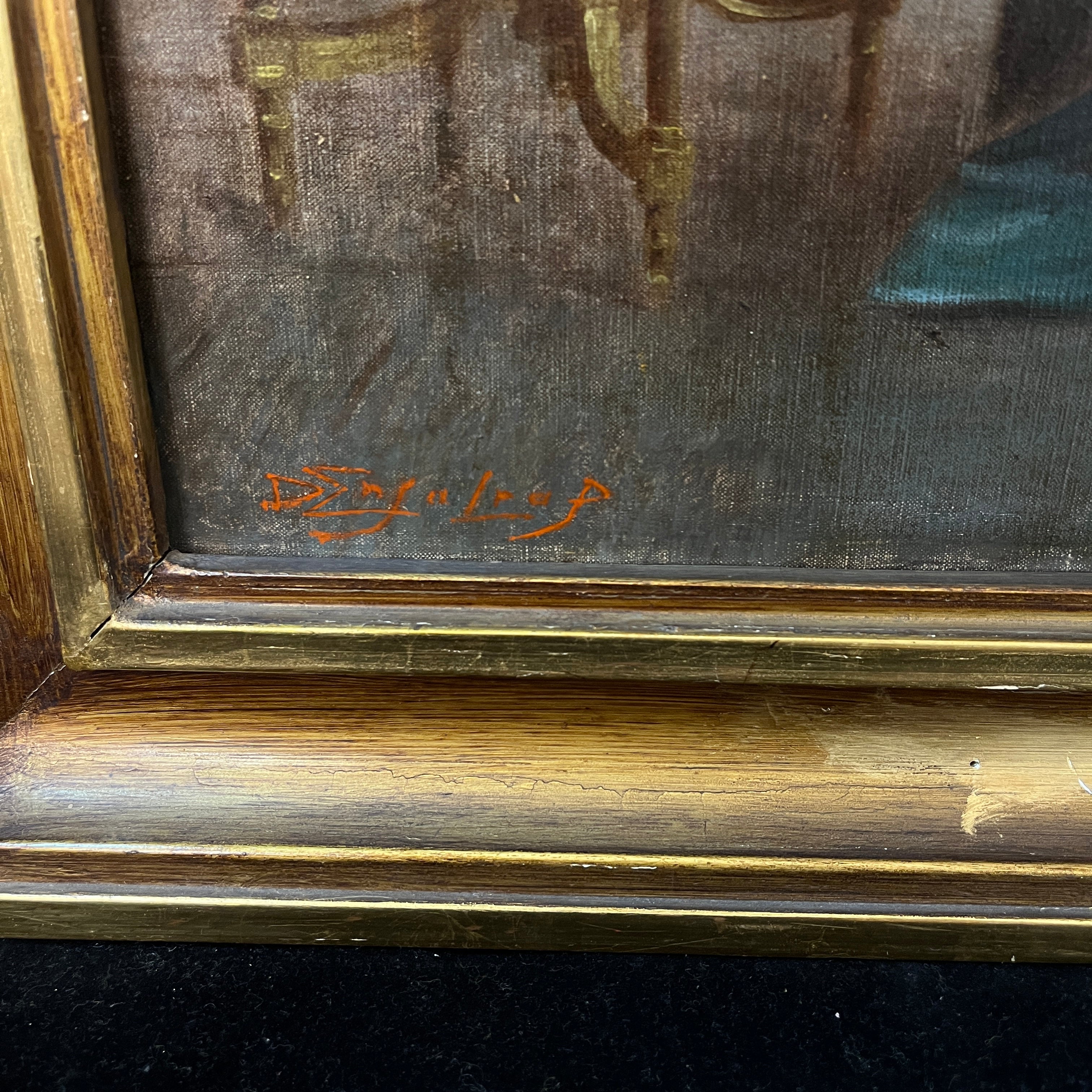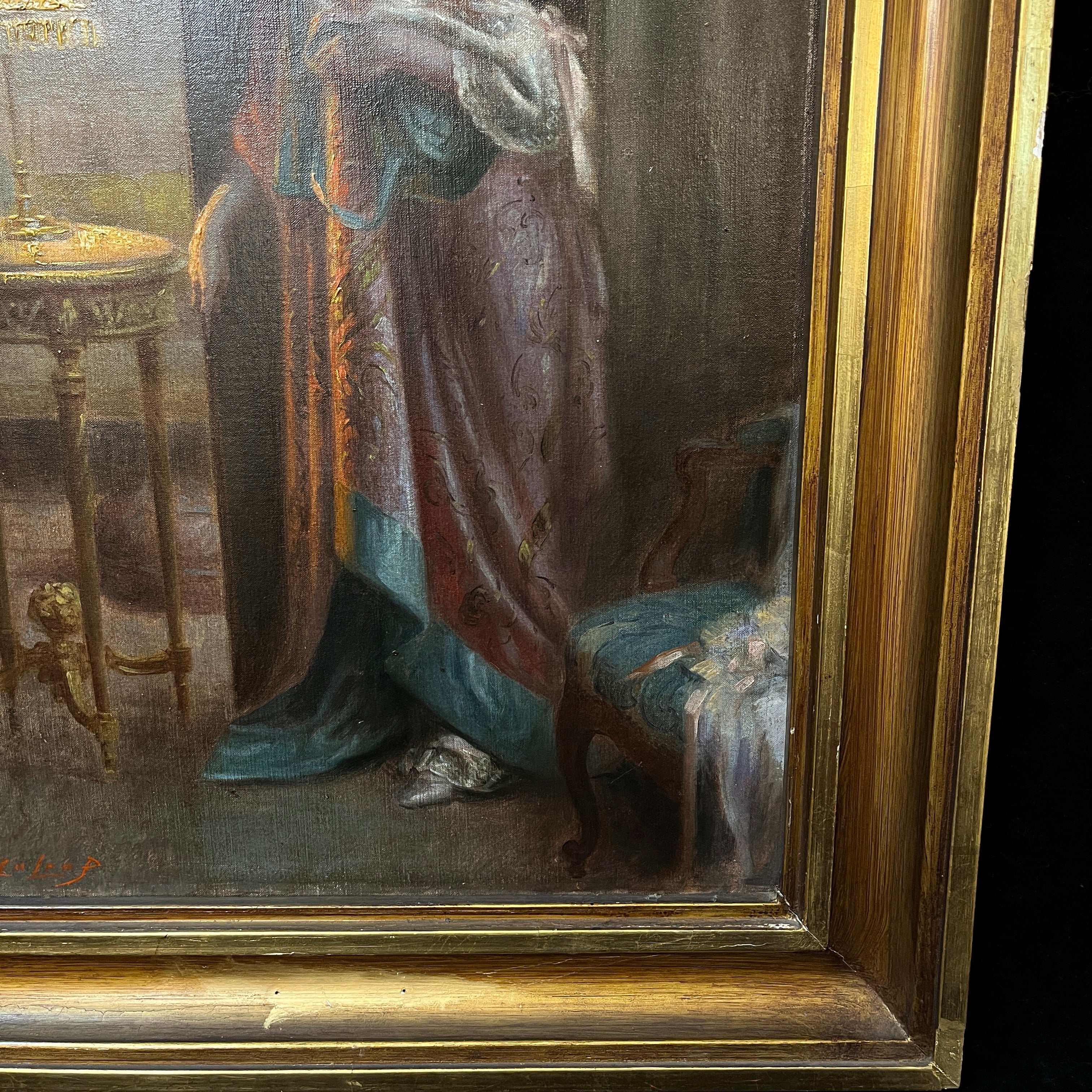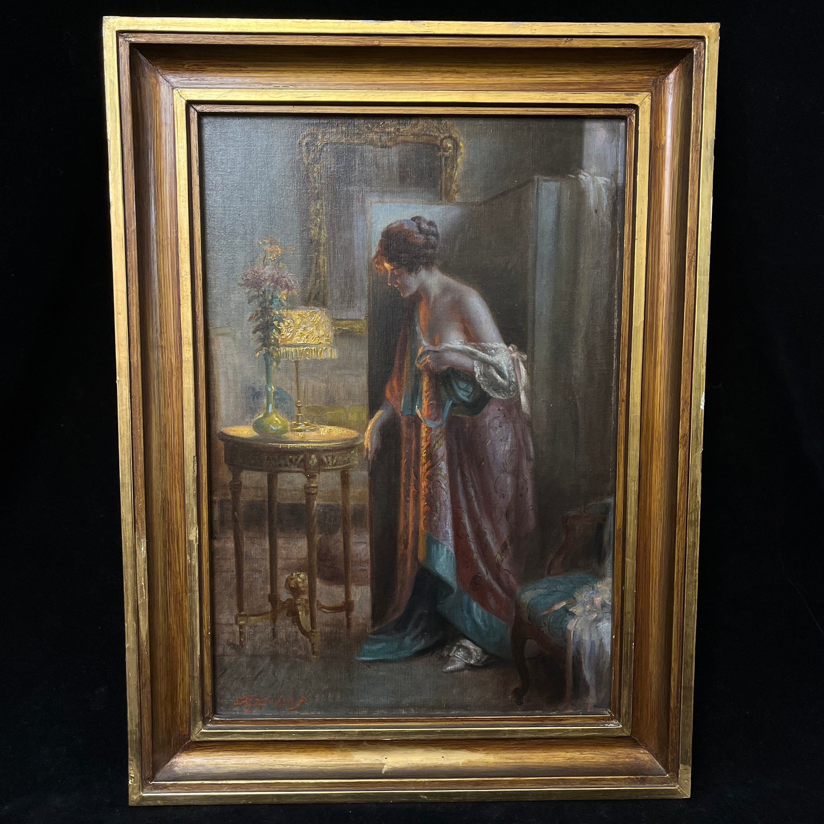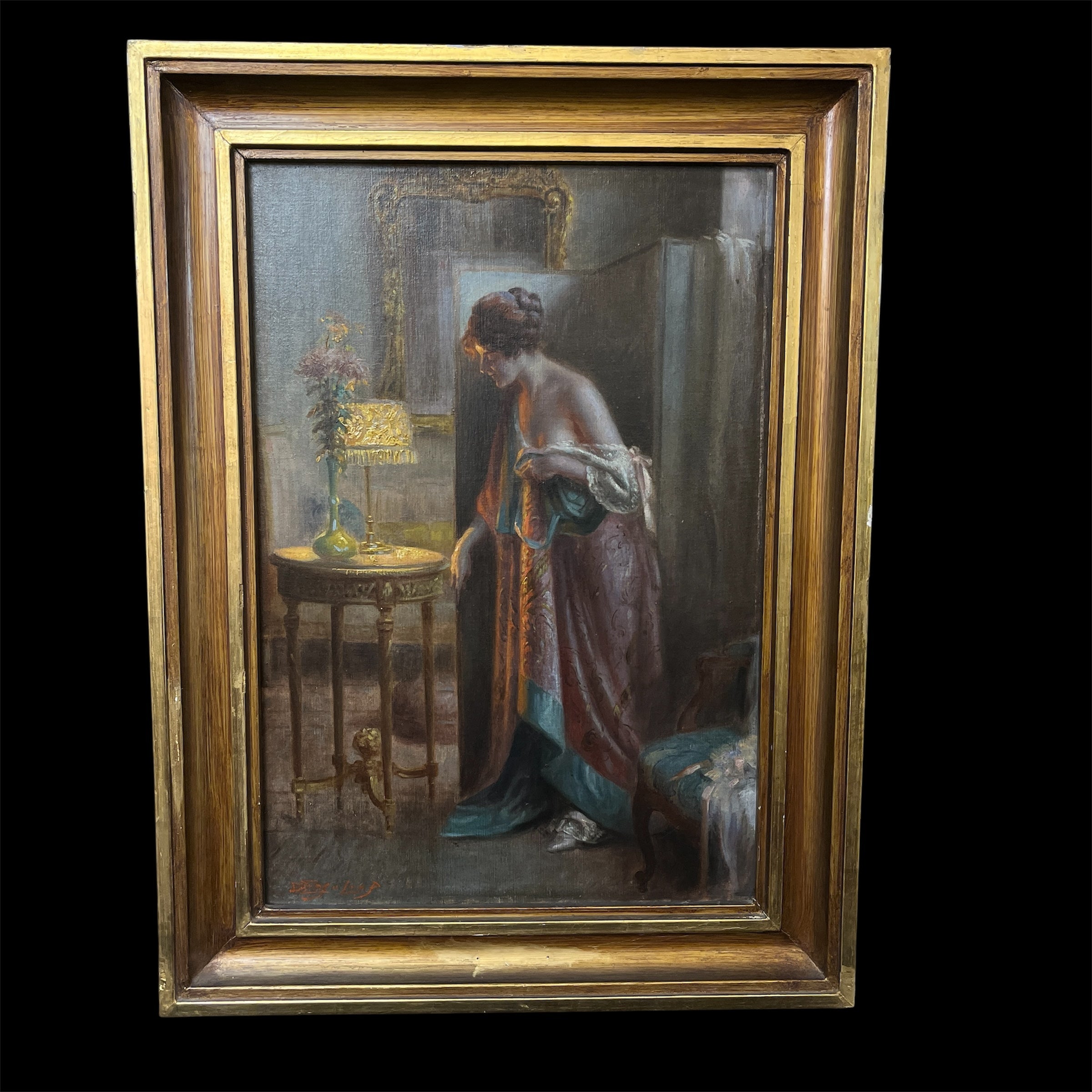 Hermoso óleo sobre tela del reconocido pintor francés Delphin Enjolras, maestro en capturar la luz y la atmósfera en escenas de interior. La obra retrata a una mujer que, con delicadeza, se acerca a una mesita de noche para encender o apagar una lámpara, en lo que parece ser un momento íntimo al levantarse de la cama. La cálida iluminación de la lámpara baña suavemente la escena, generando un juego sutil de luces y sombras que transmite serenidad, calidez y una profunda sensación de intimidad.