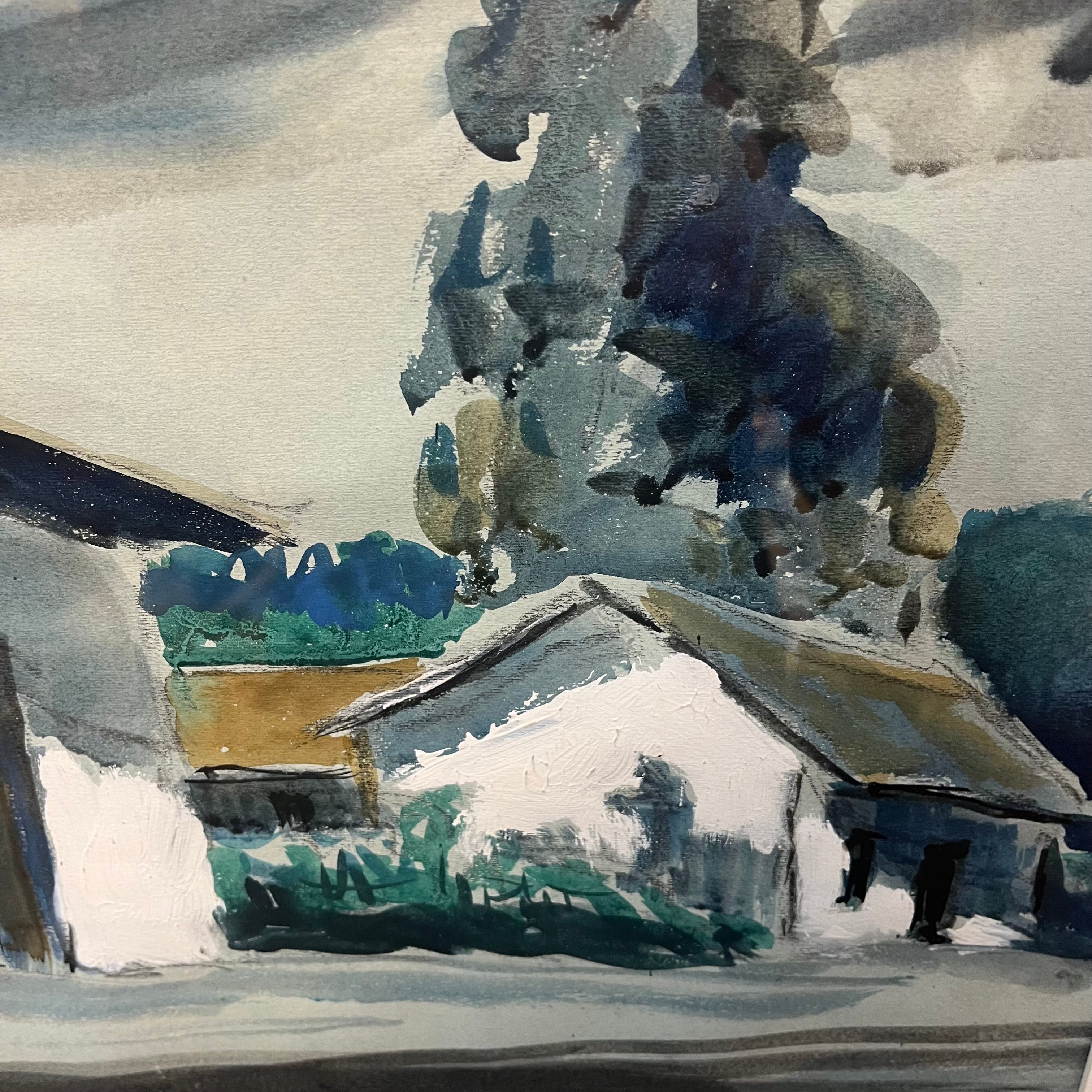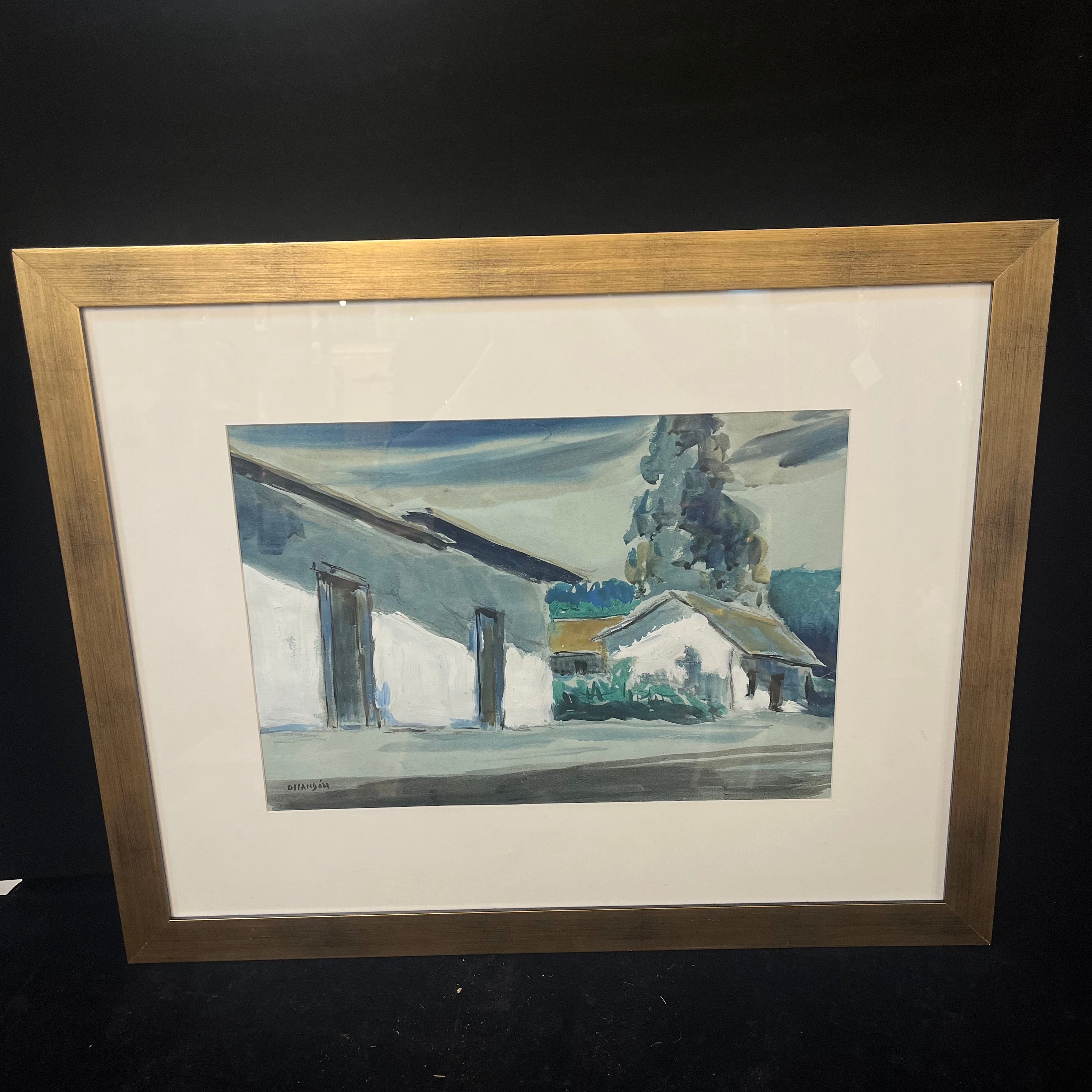 Técnica mixta del pintor chileno Eduardo Ossandón, representando una fachada rural, con una casa blanca, un gran árbol que la acompaña y el horizonte de fondo. El artista utiliza tanto acuarela, medio por el que es más reconocido, como también óleo para resaltar el blanco de la casa, haciendo no solo un bello trabajo de luz y sombra, sino que también de texturas dentro de una paleta sobria. La obra tiene un marco de madera contemporánea en color dorado, complementando las tonalidades del cuadro.