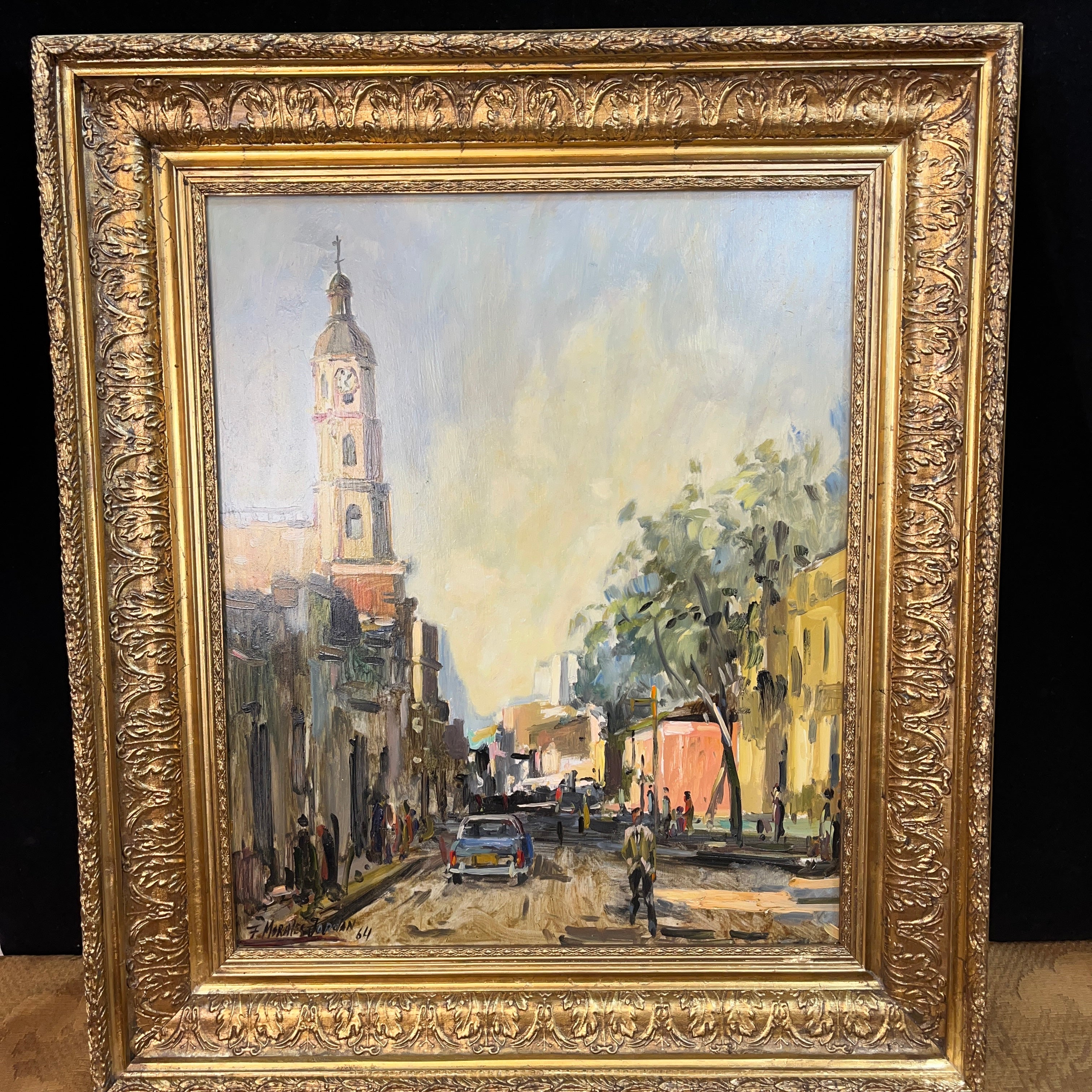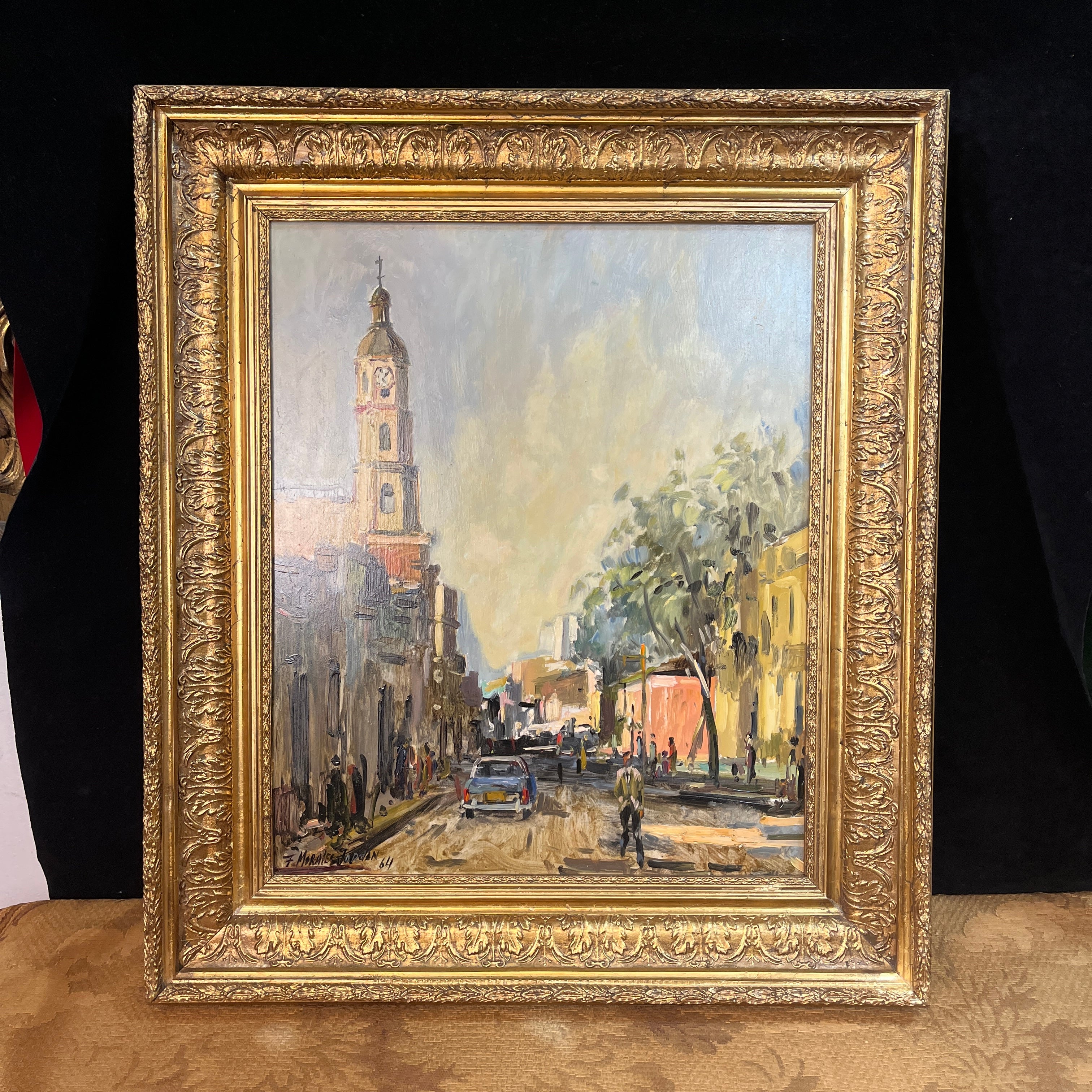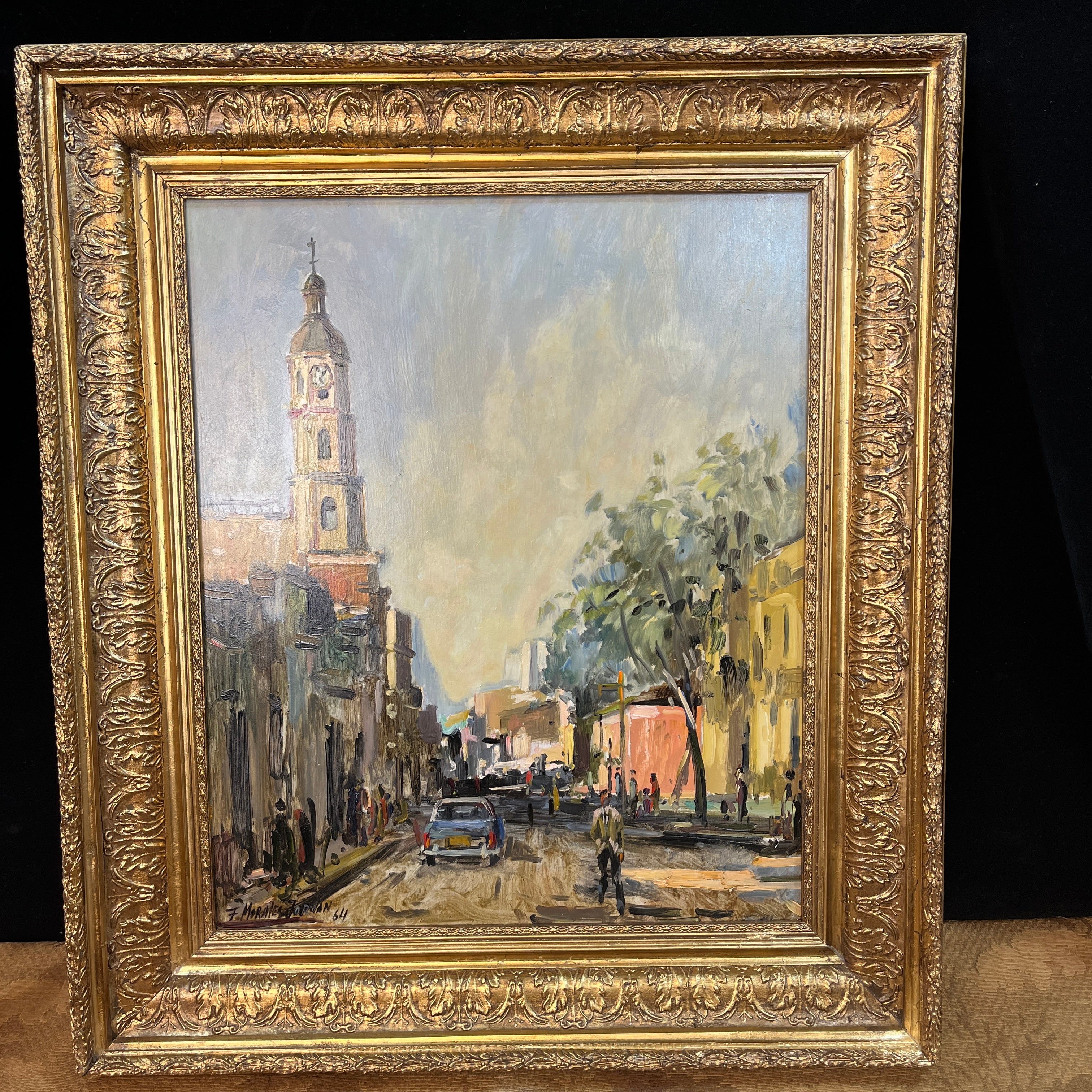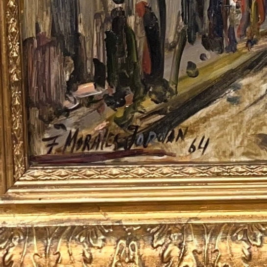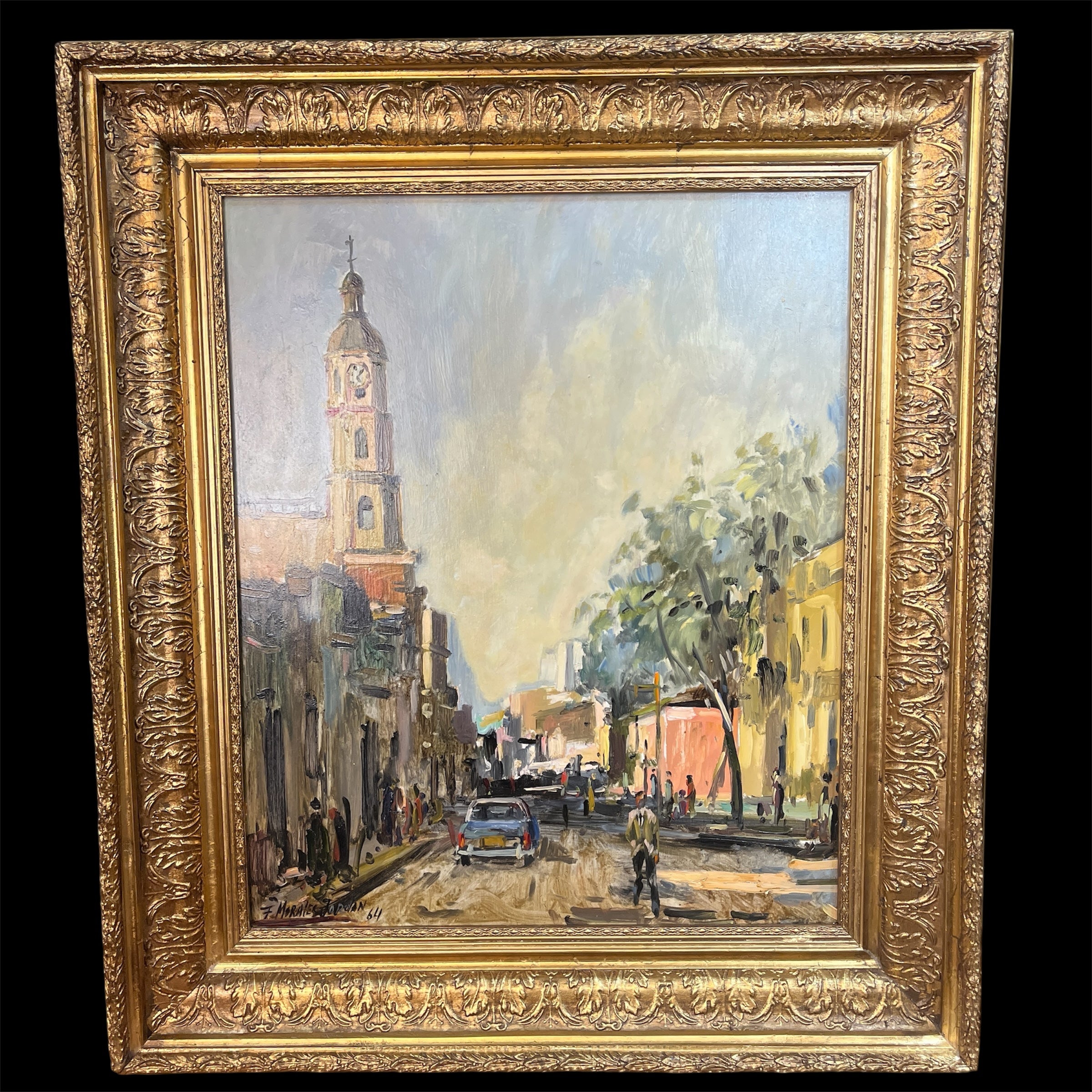 Óleo sobre cholguan del artista chileno Fernando Morales Jordán. La obra representa una reconocible calle urbana chilena, la calle Copiapó, y la Basílica del Inmaculado Corazón de María a un costado. Se aprecia el dinamismo cotidiano: vehículos en tránsito, personas caminando y, como punto focal, el imponente campanario de una iglesia que domina la escena. La pintura está enmarcada en un magnífico marco tallado con relieves y acabado en un elegante dorado, que realza la riqueza visual de la composición.