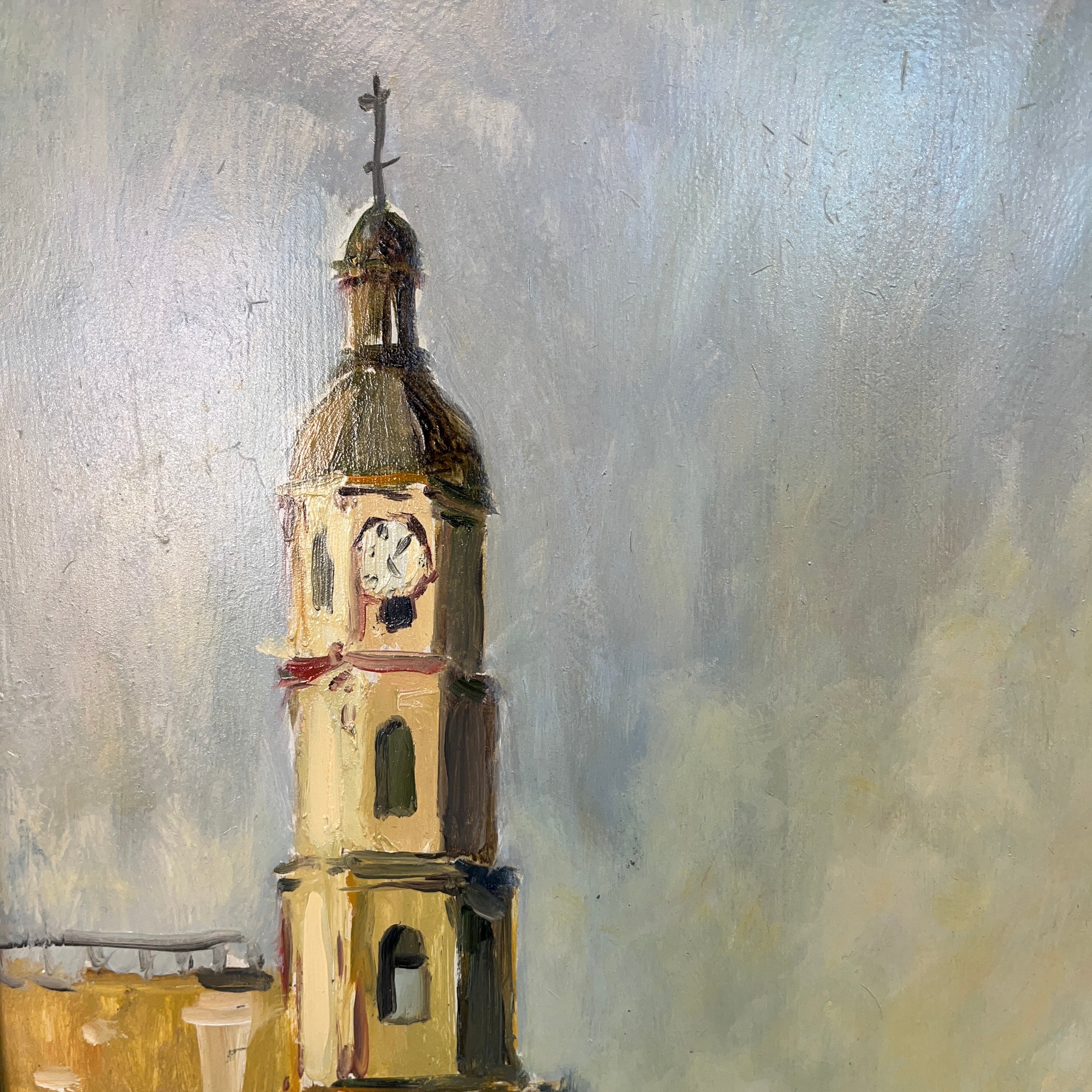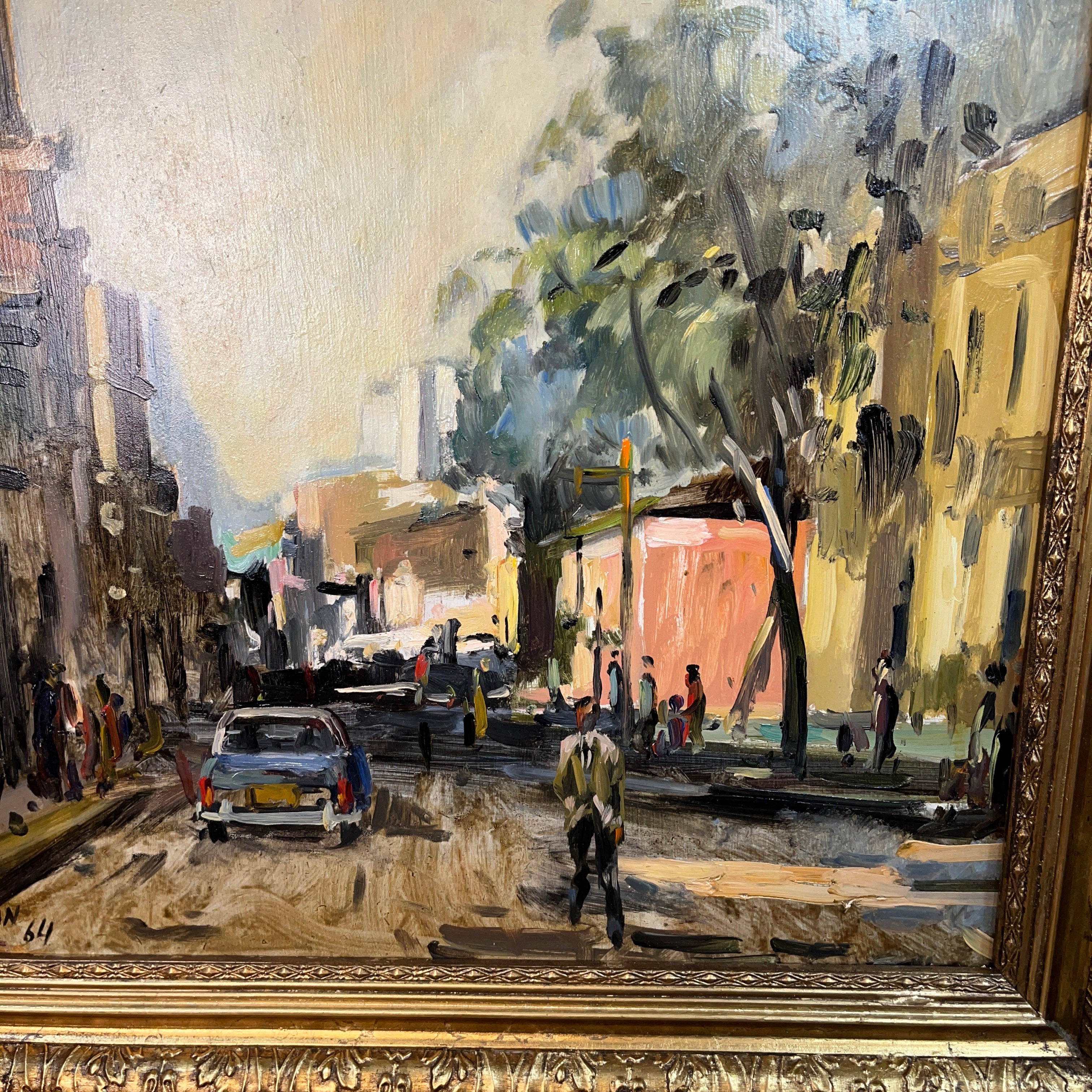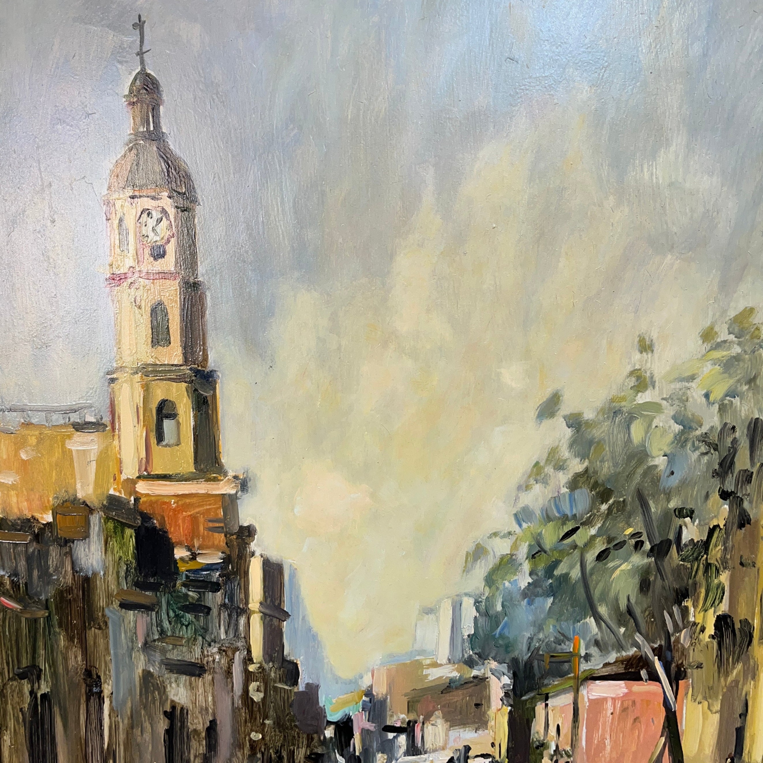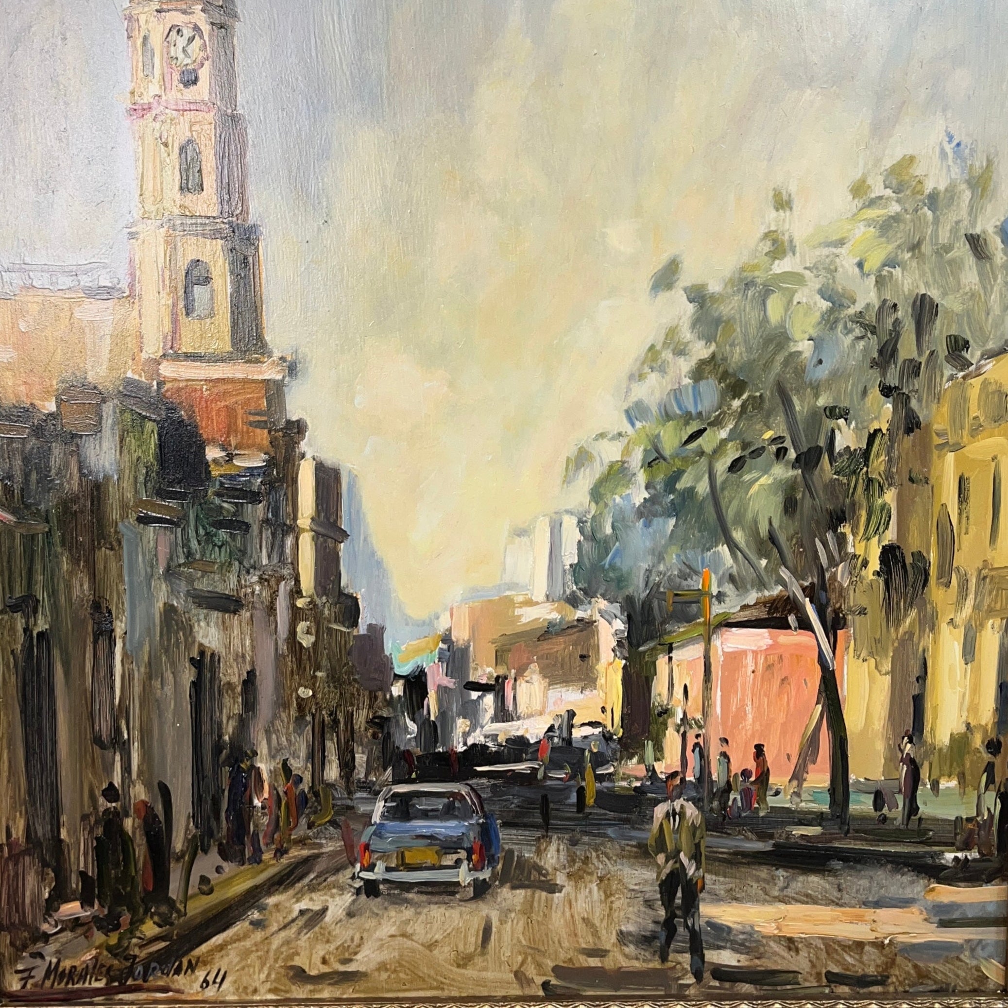 Óleo sobre cholguan del artista chileno Fernando Morales Jordán. La obra representa una reconocible calle urbana chilena, la calle Copiapó, y la Basílica del Inmaculado Corazón de María a un costado. Se aprecia el dinamismo cotidiano: vehículos en tránsito, personas caminando y, como punto focal, el imponente campanario de una iglesia que domina la escena. La pintura está enmarcada en un magnífico marco tallado con relieves y acabado en un elegante dorado, que realza la riqueza visual de la composición.