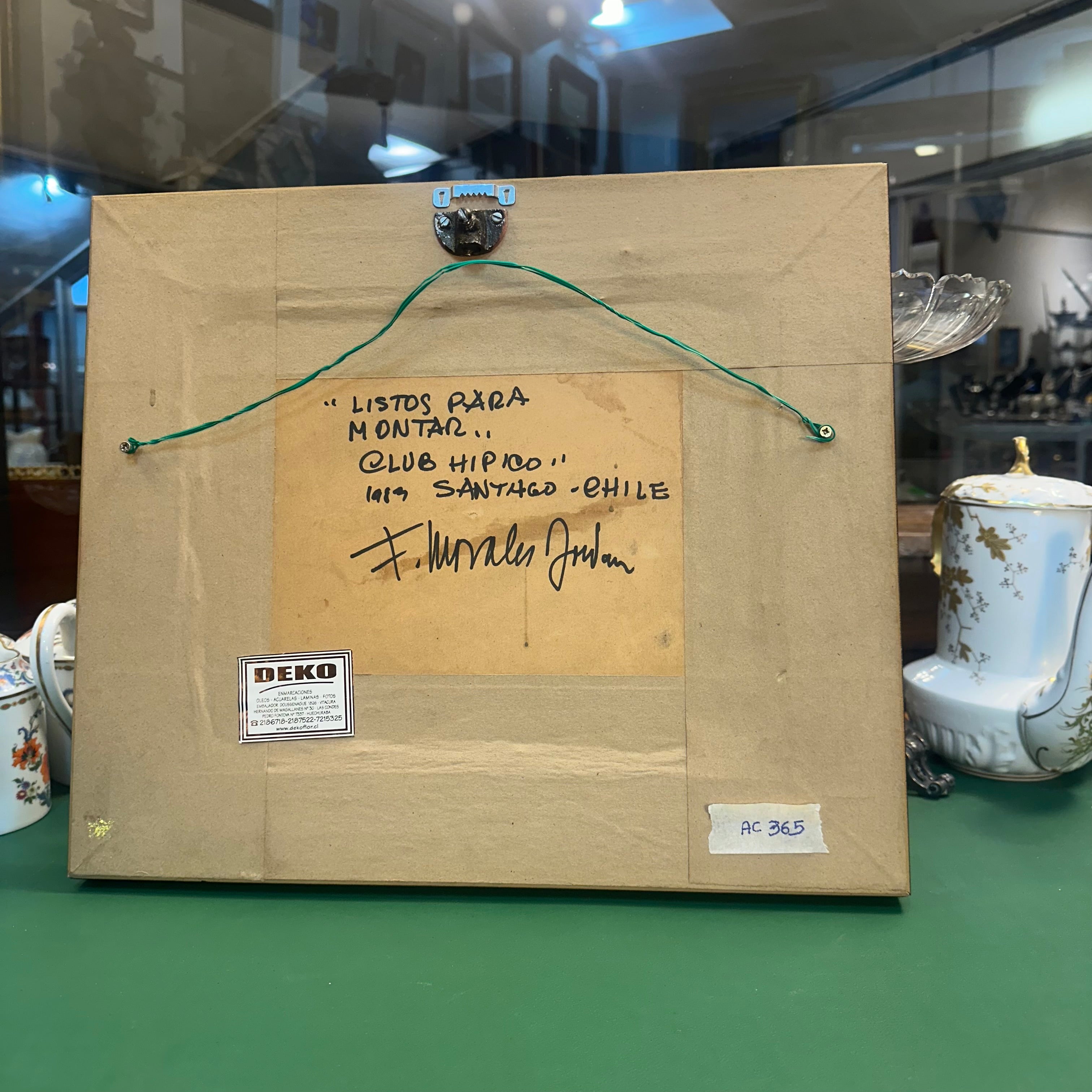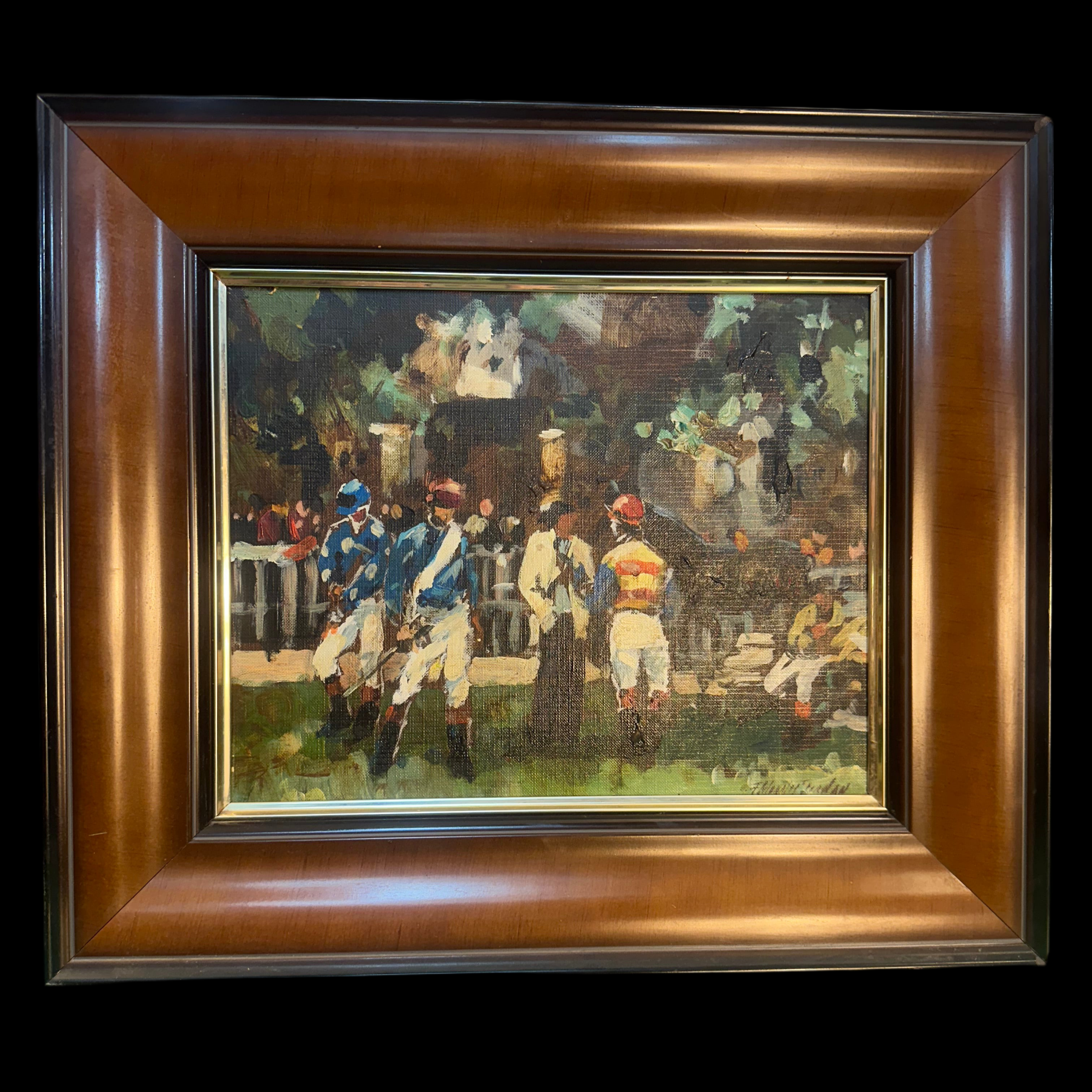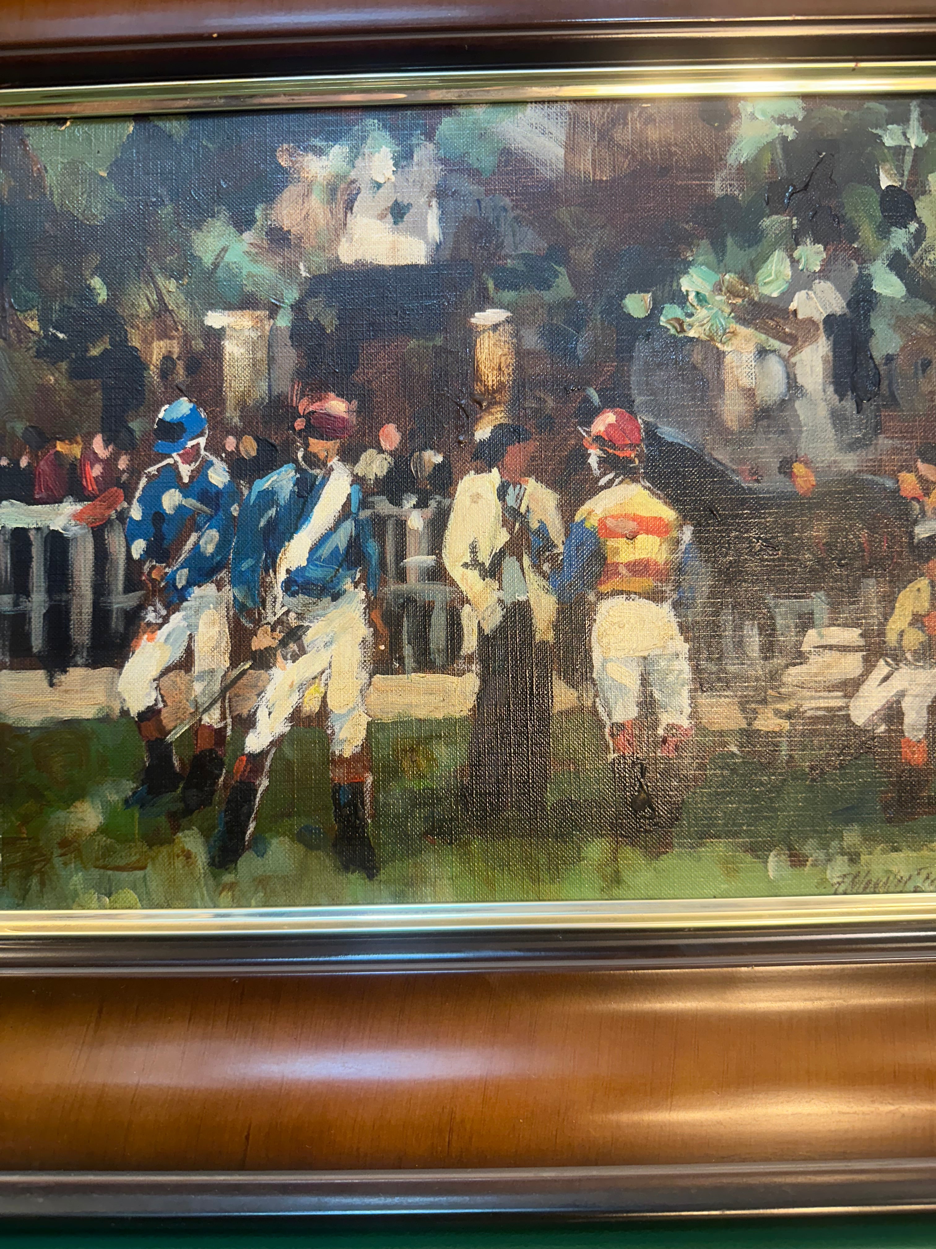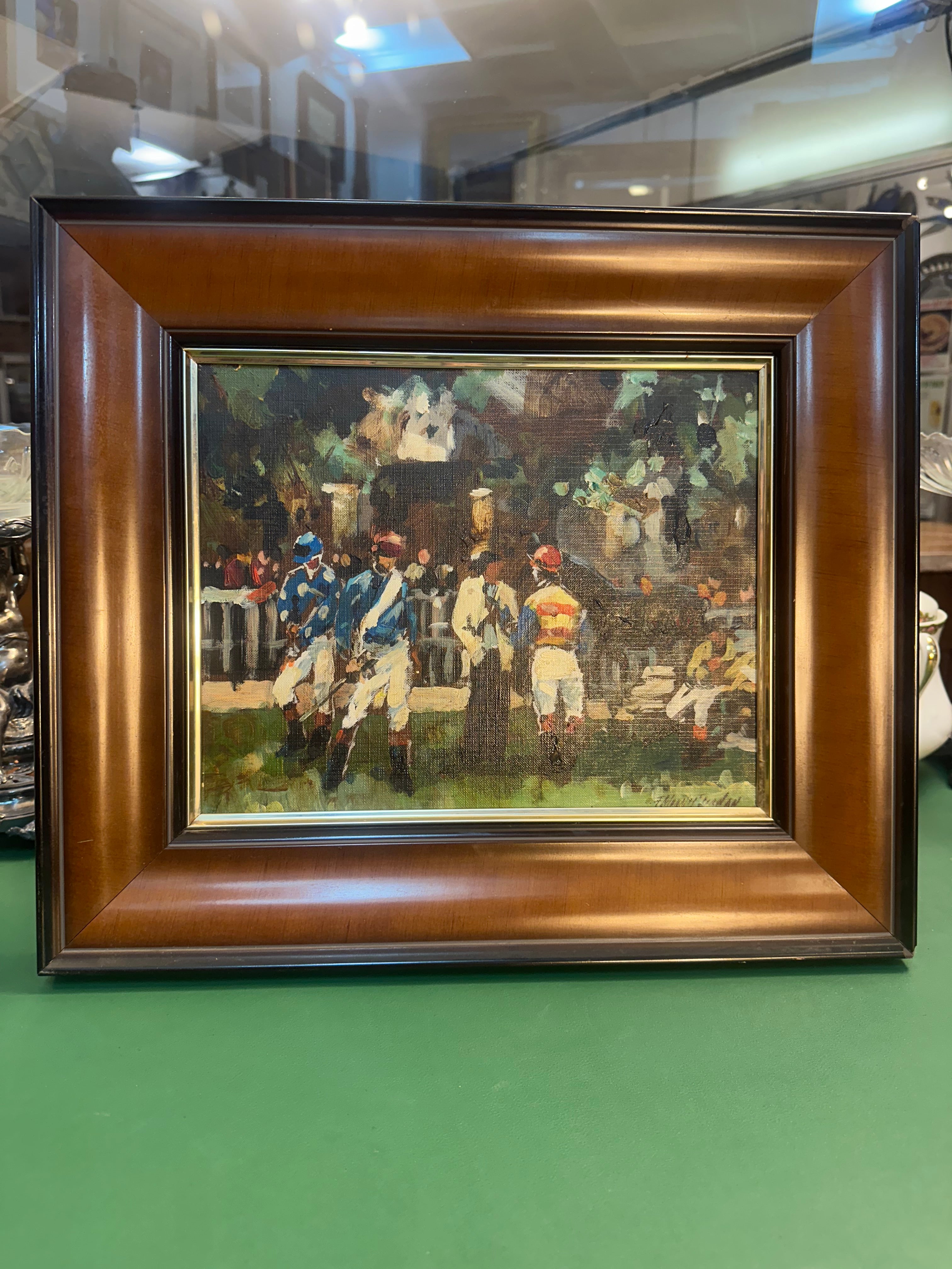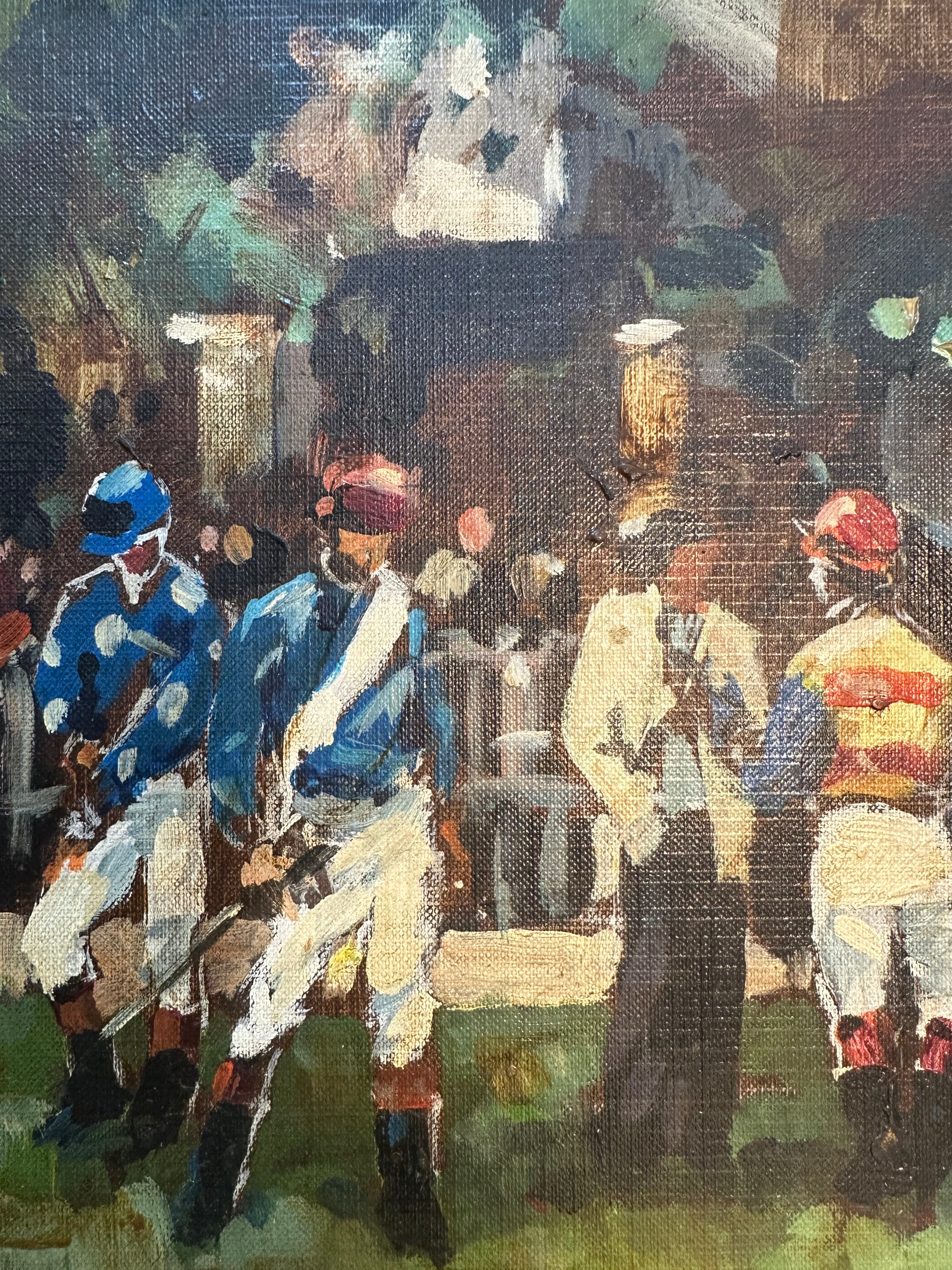 Óleo sobre tela del pintor chileno Fernando Morales Jordán de 1989, se aprecia una escena que retrata la espontánea interacción entre jugadores de polo en el Club Hípico.