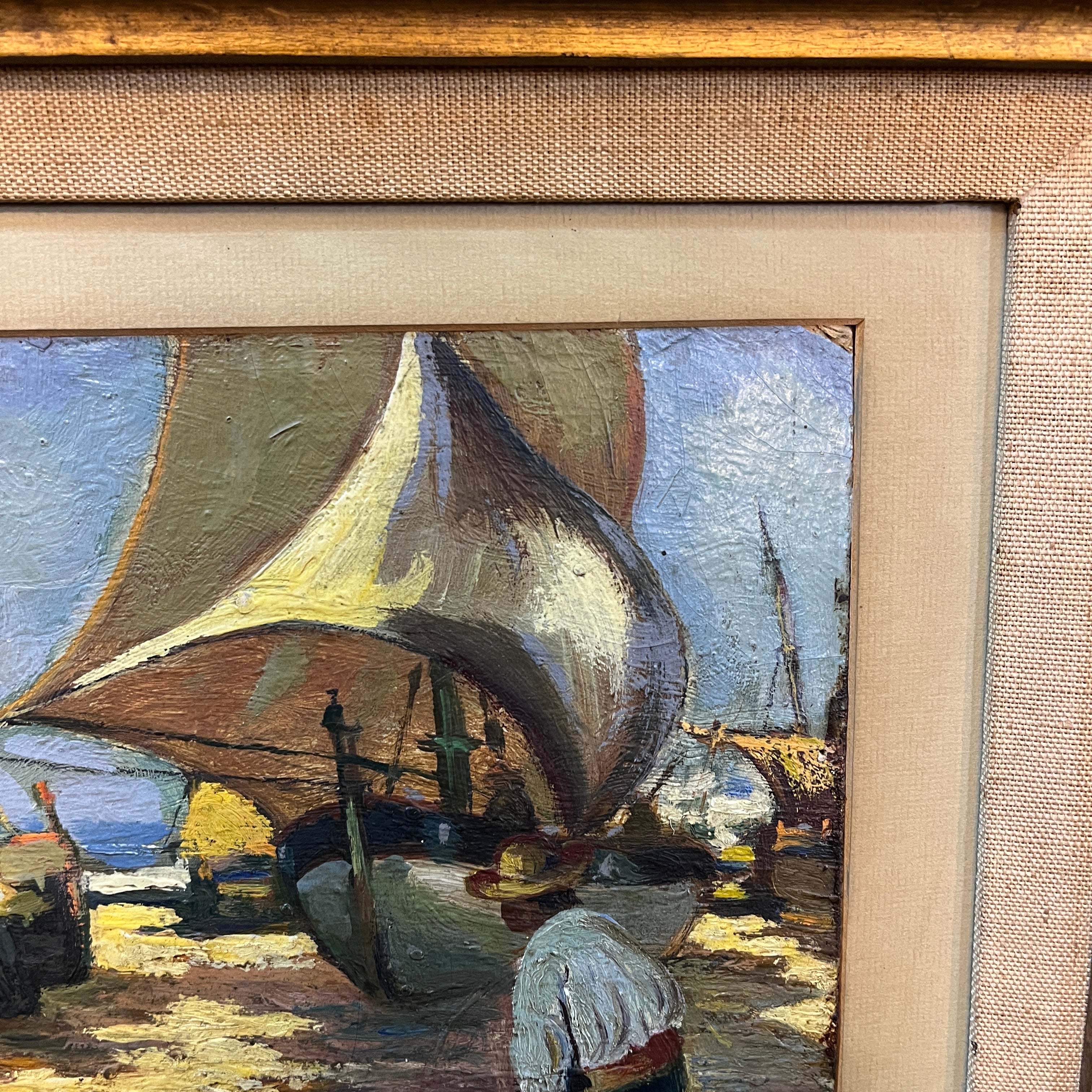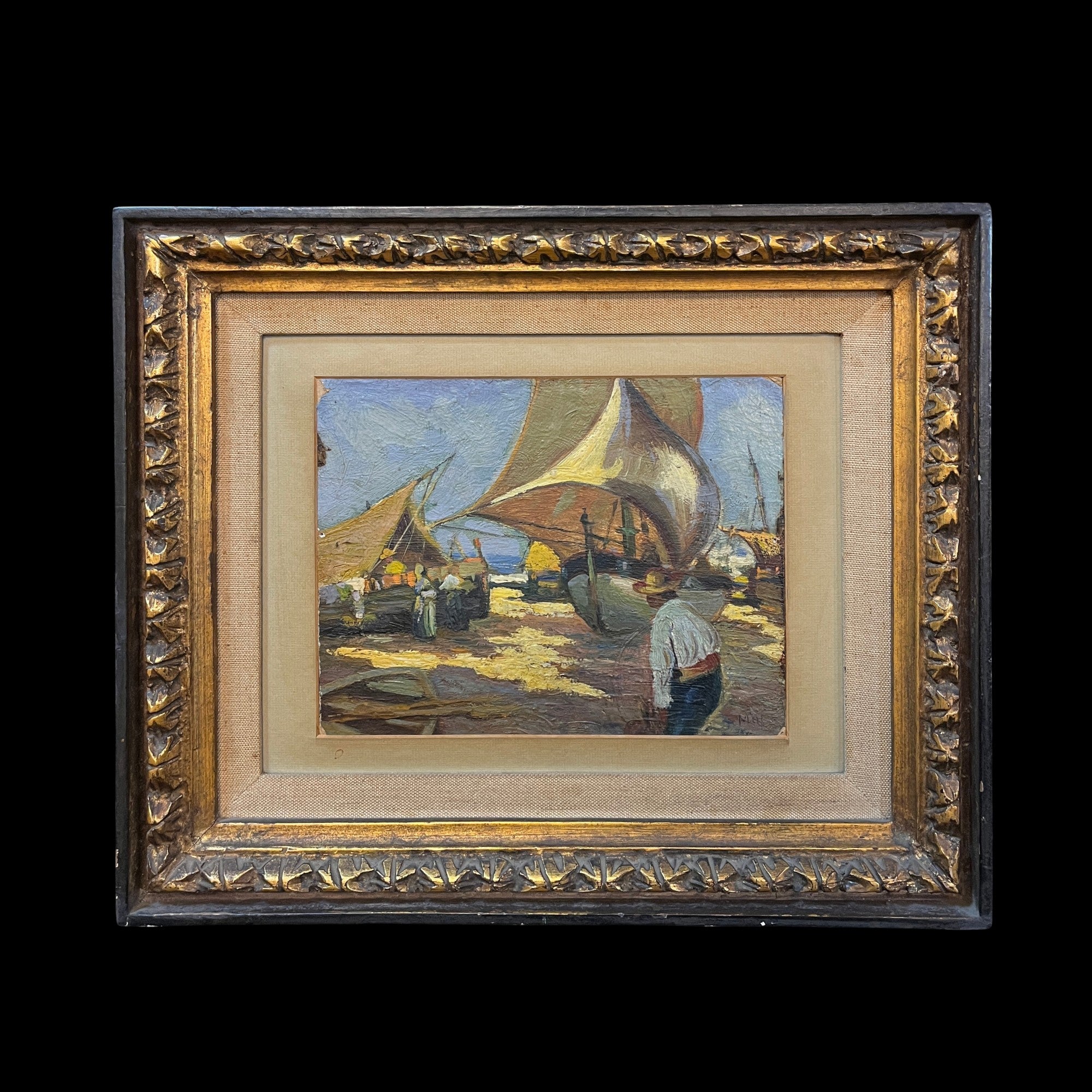 Óleo sobre madera, de firma ilegible, representando una escena costera, en la que pescadores están descargando algunos veleros en una playa. Aunque hay algunos personajes e el cuadro, son las velas, una de ellas inclinada por el viento, las que se vuelven protagonistas de la obra. Se trata de una escena capturada con mucho movimiento, delicadeza y un agudo trabajo de luz. La obra tiene un elegante marco de madera tallada en relieves y terminada en un tono dorado.