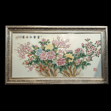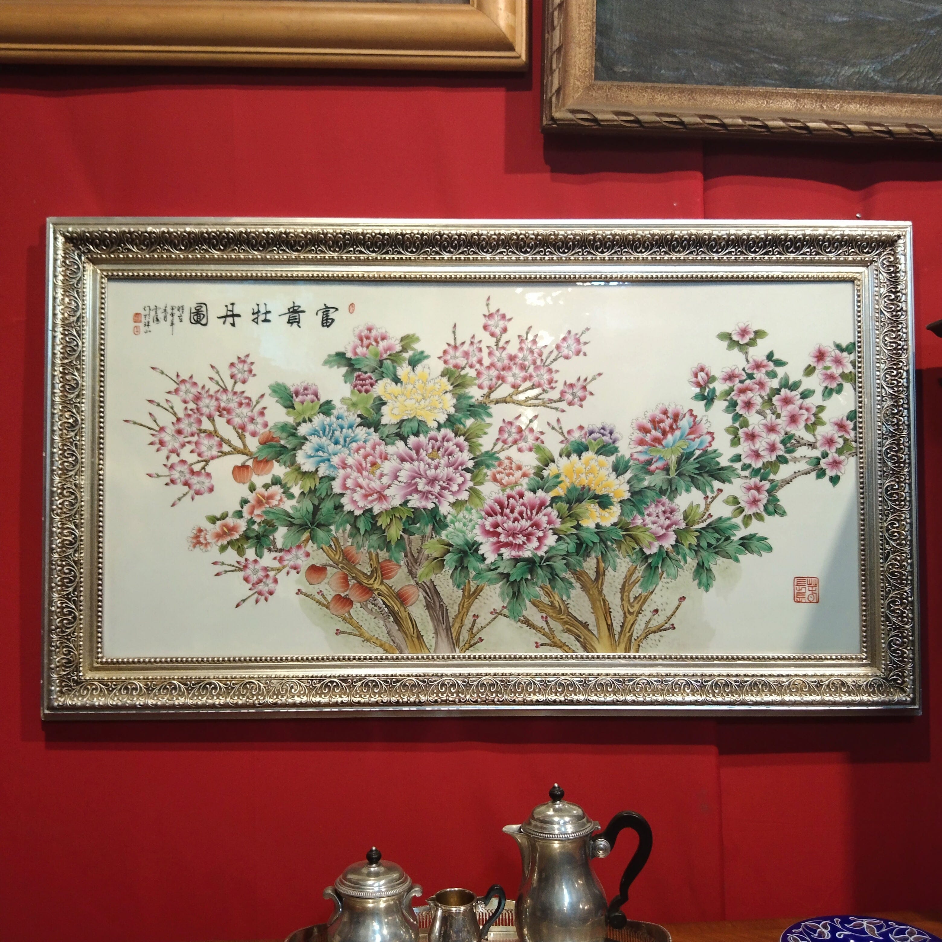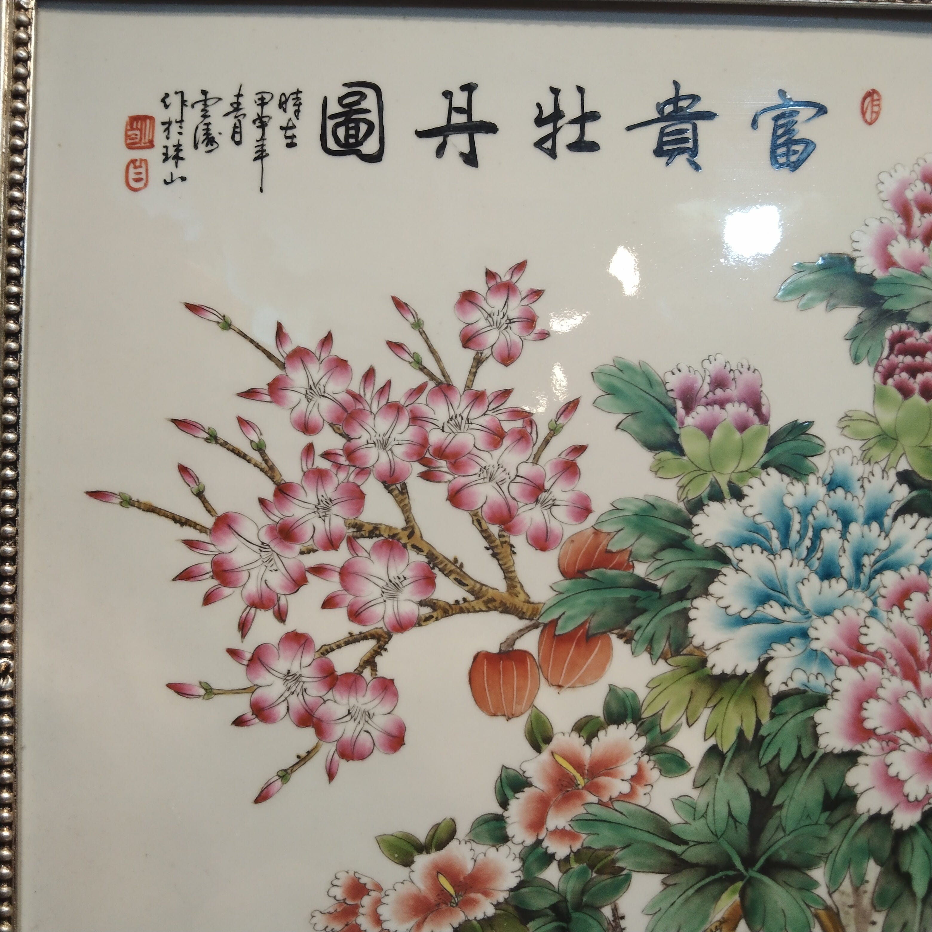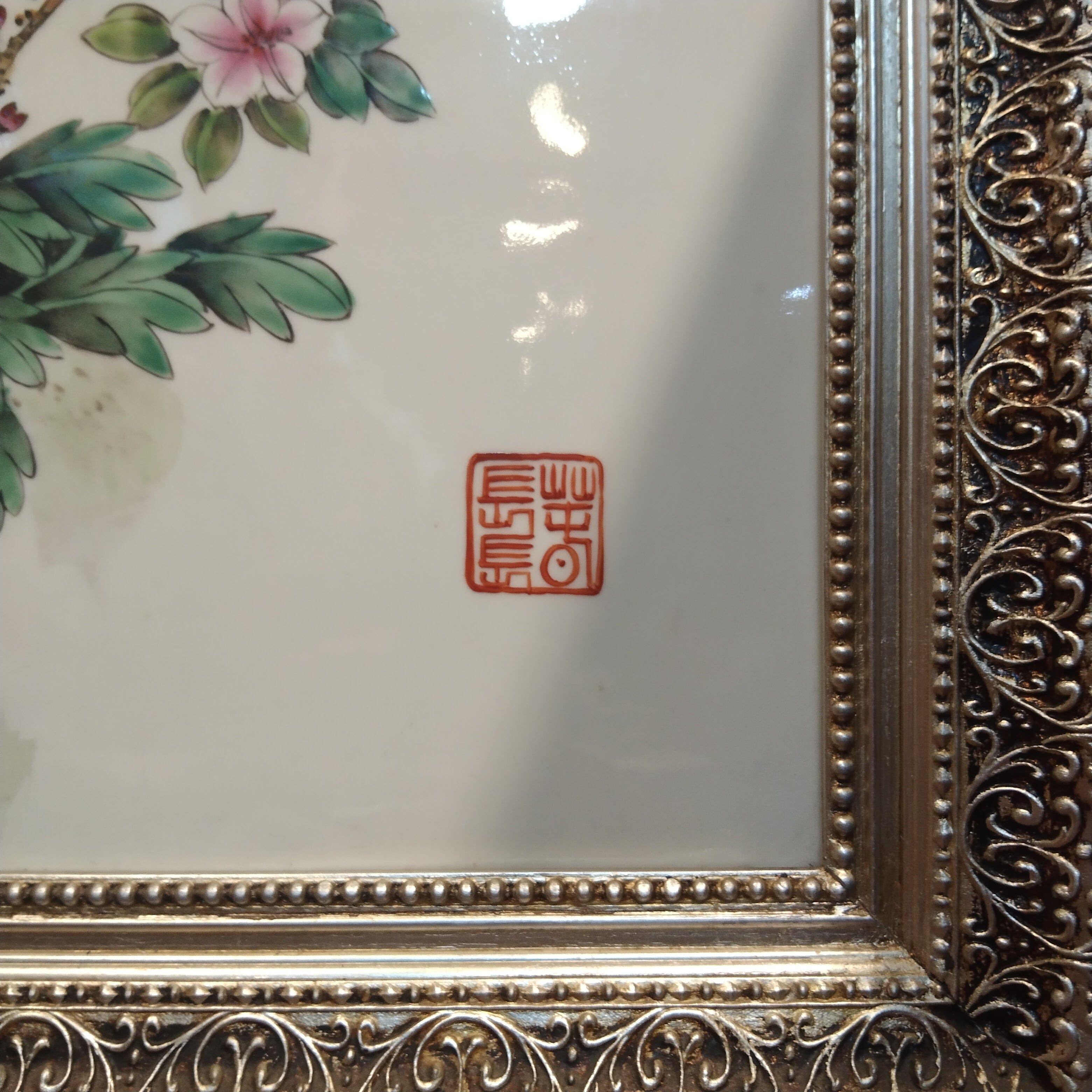 Bellísima porcelana, de origen chino, pintada a mano con motivos florales con un reconocible traso oriental, e tonos verdes, rosas, azules y amarillos. La obra tiene inscripciones y un sello, típico de esta clase de obra. Está enmarcada en madera tallada en relieves y pintada de un elegante plateado.