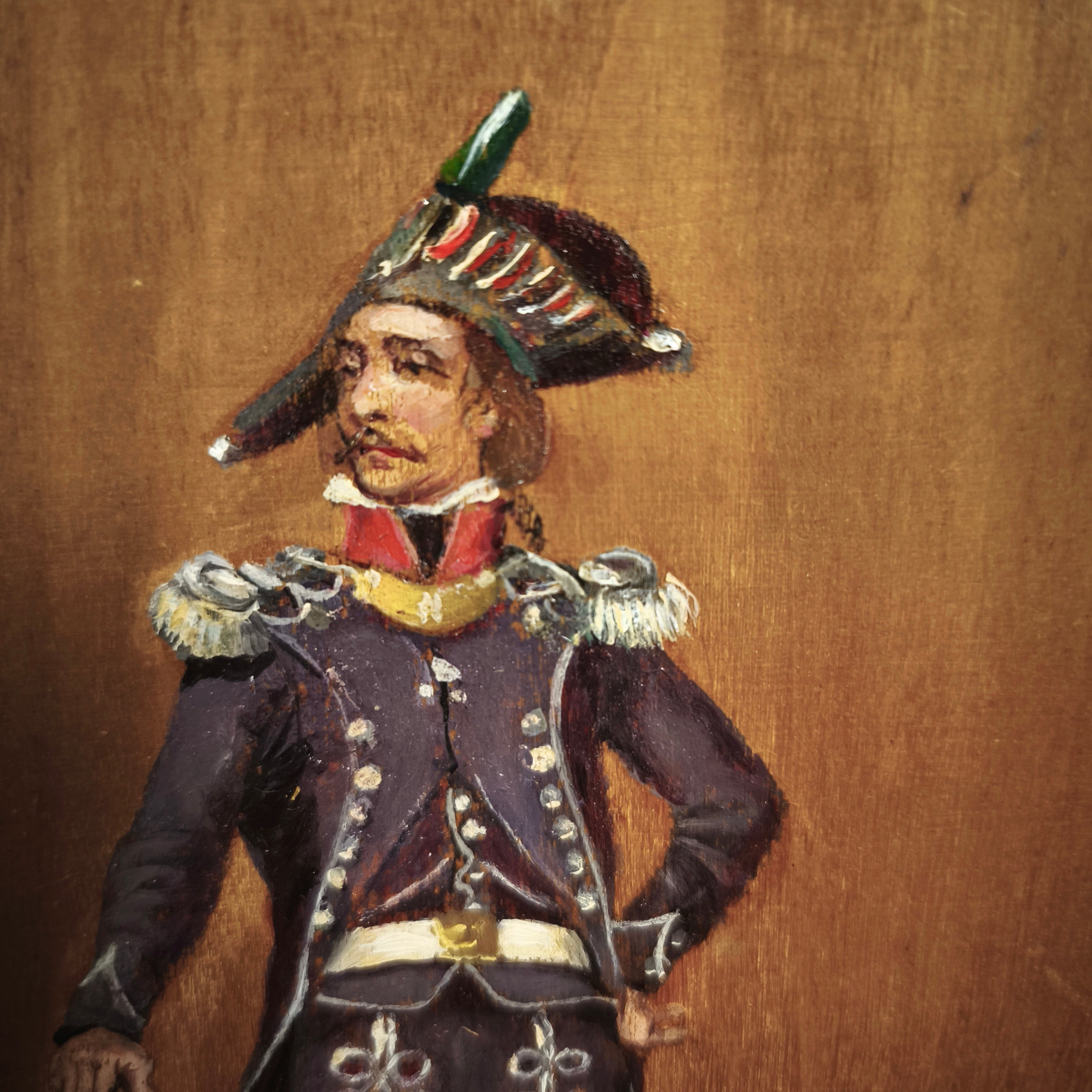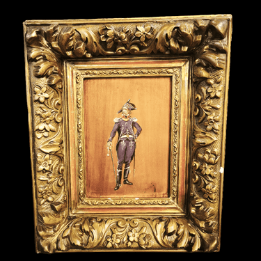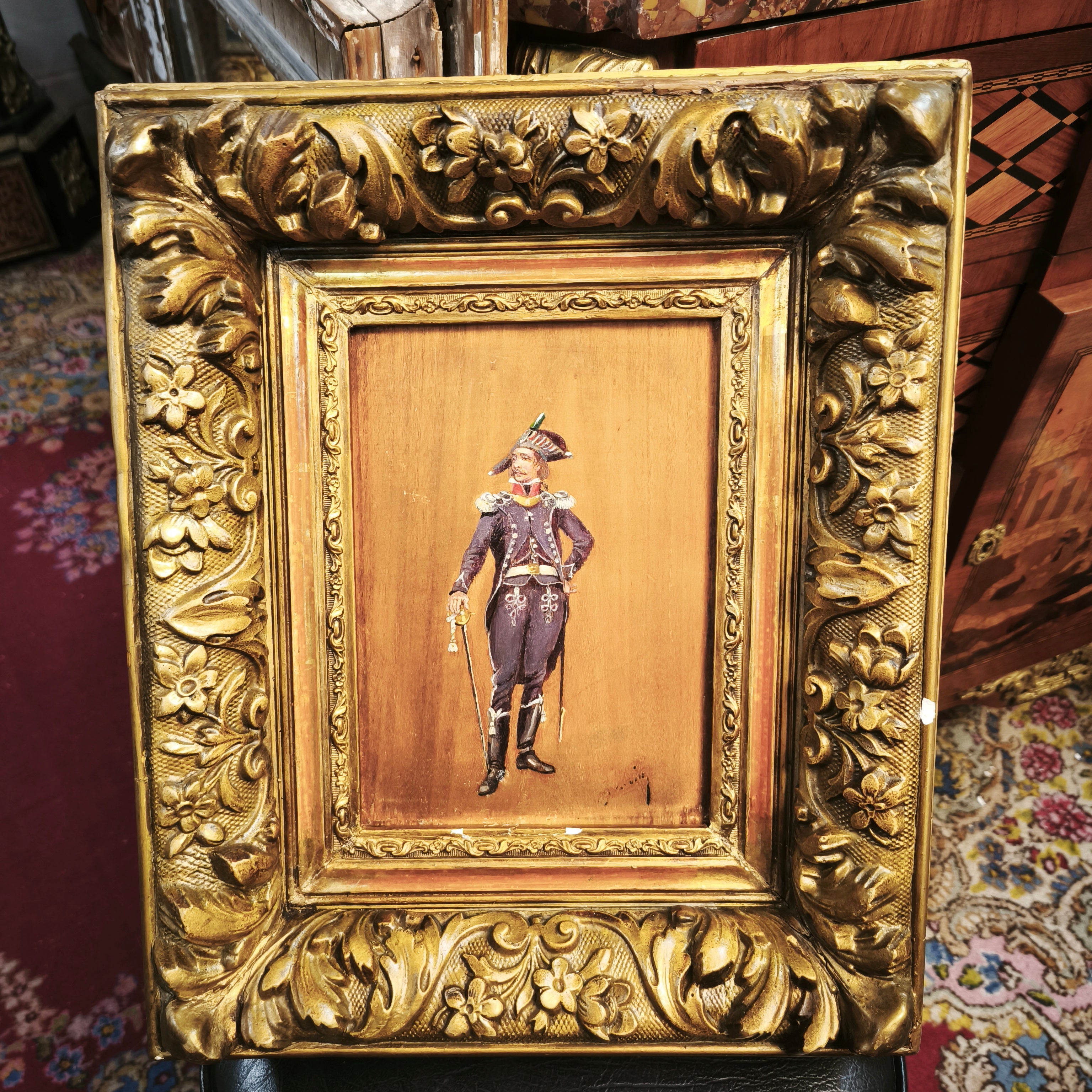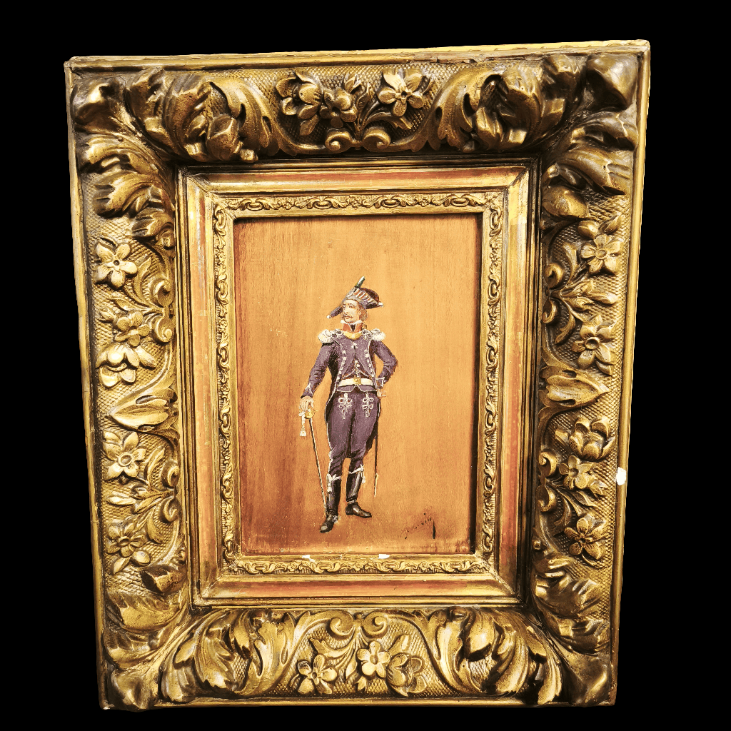 Óleo sobre madera, de origen Europeo y firma ilegible representando a un soldado francés de alto rango, retratando todos los detalles de su uniforme y gesto. el artista decide pintar solamente la figura sin cubrir el fondo, dejando en evidencia la materialidad de la madera, elemento que le da un toque particular a la pieza. La obra está enmarcada en madera tallada con espectaculares relieves florales y pintada en dorado.