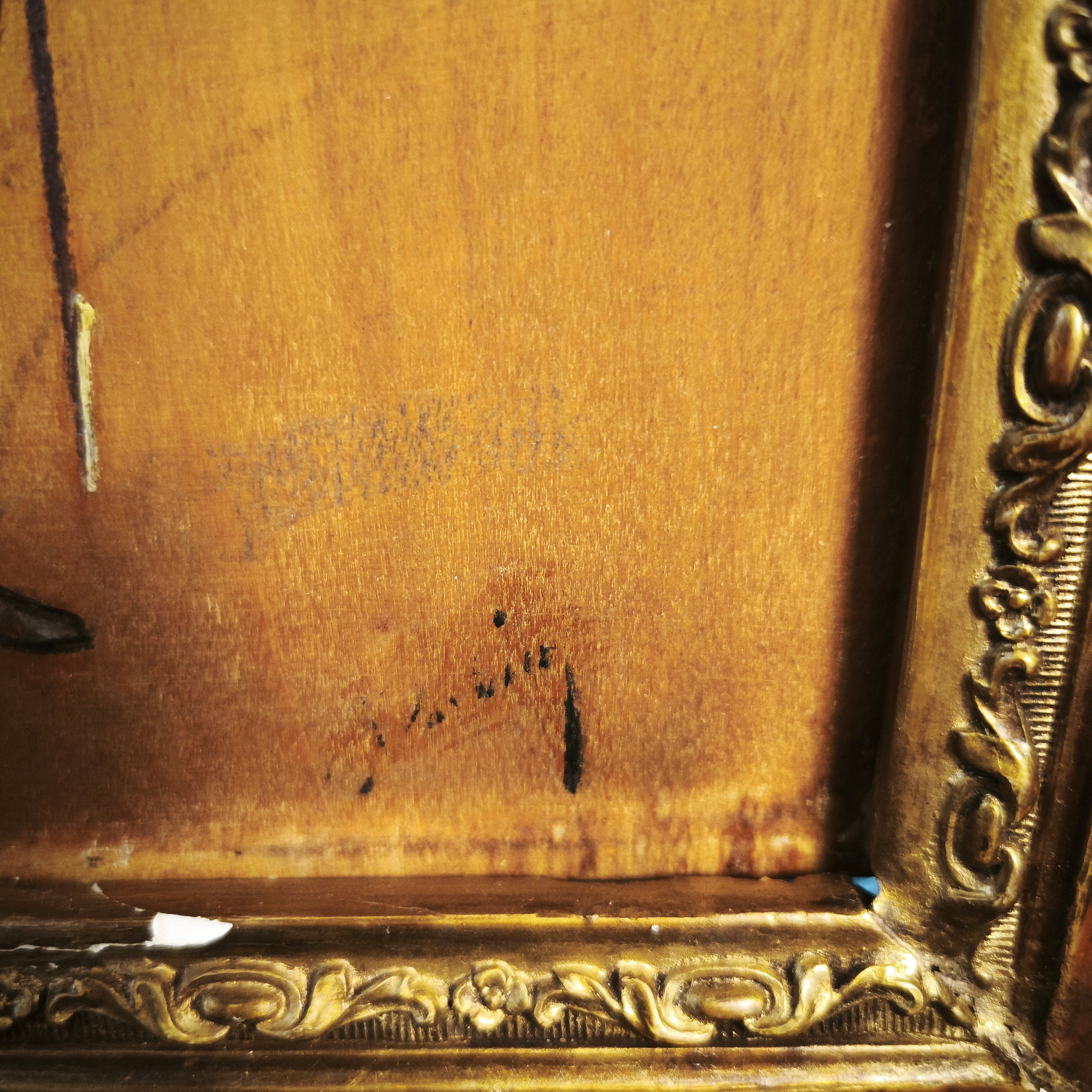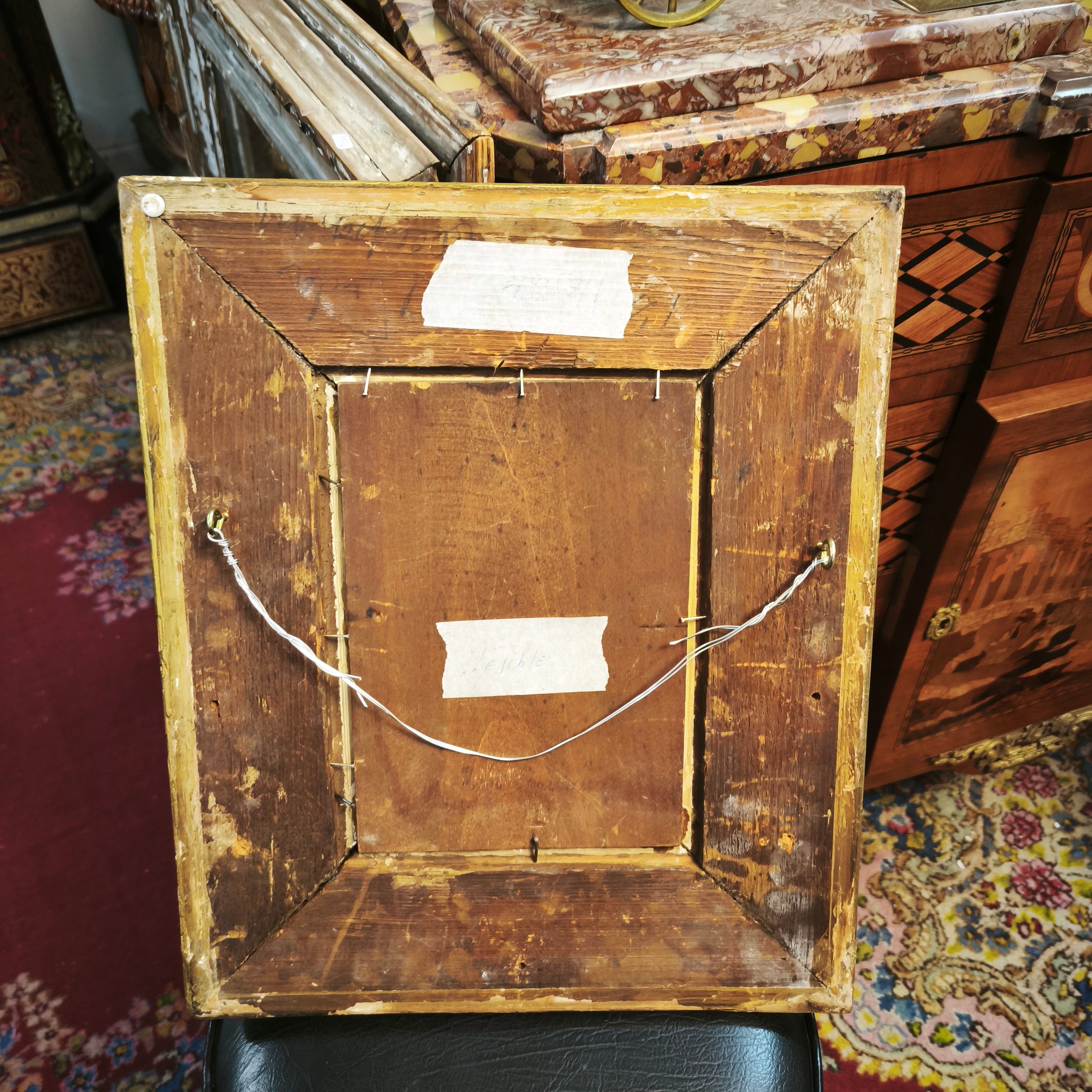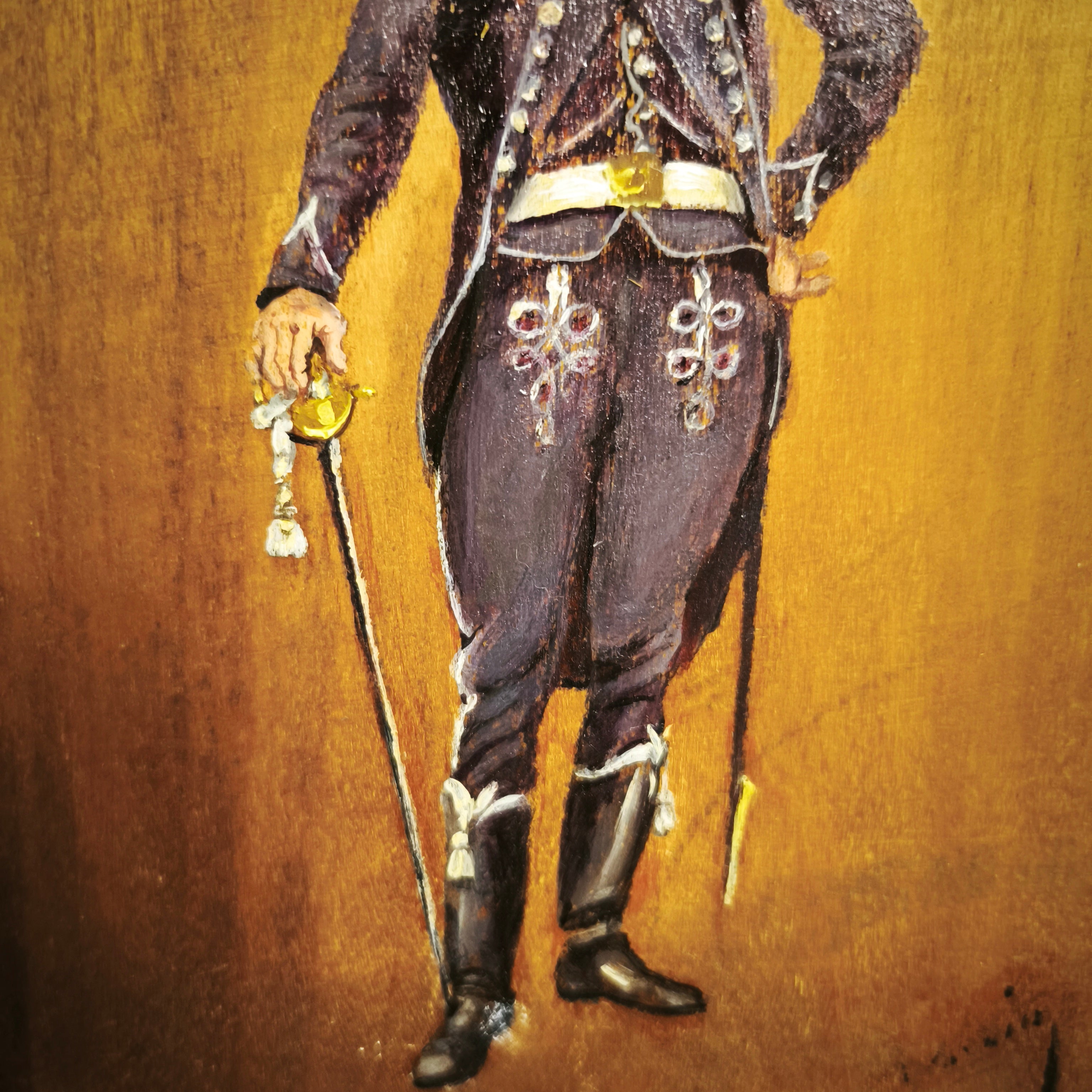 Óleo sobre madera, de origen Europeo y firma ilegible representando a un soldado francés de alto rango, retratando todos los detalles de su uniforme y gesto. el artista decide pintar solamente la figura sin cubrir el fondo, dejando en evidencia la materialidad de la madera, elemento que le da un toque particular a la pieza. La obra está enmarcada en madera tallada con espectaculares relieves florales y pintada en dorado.