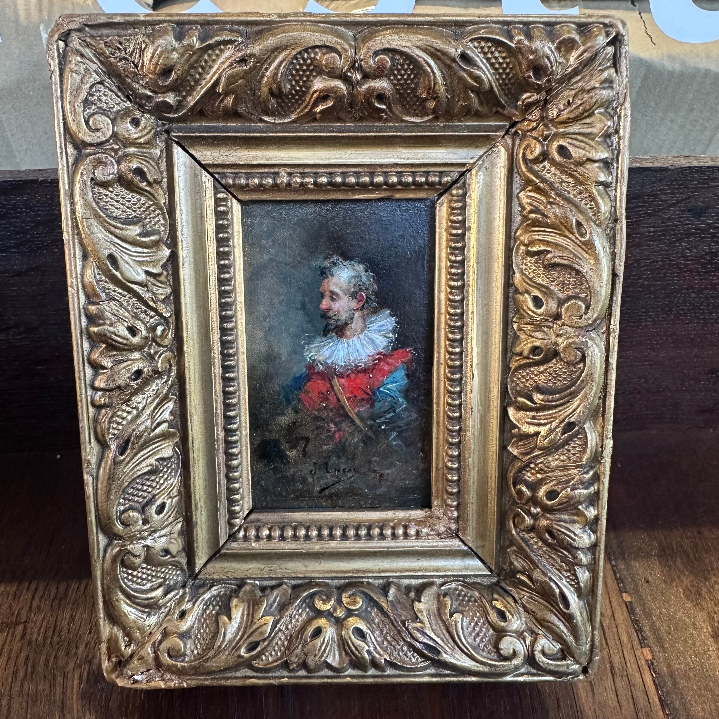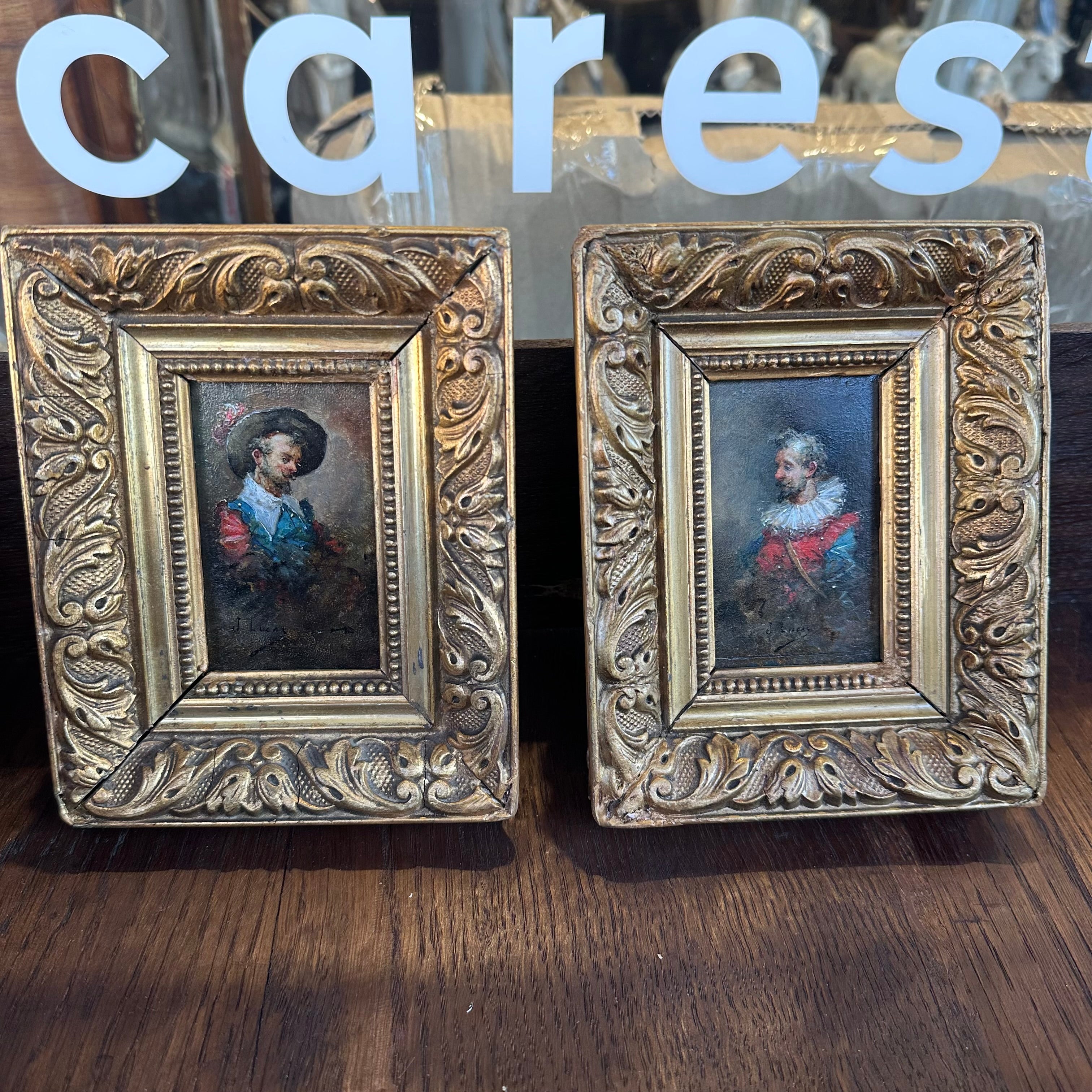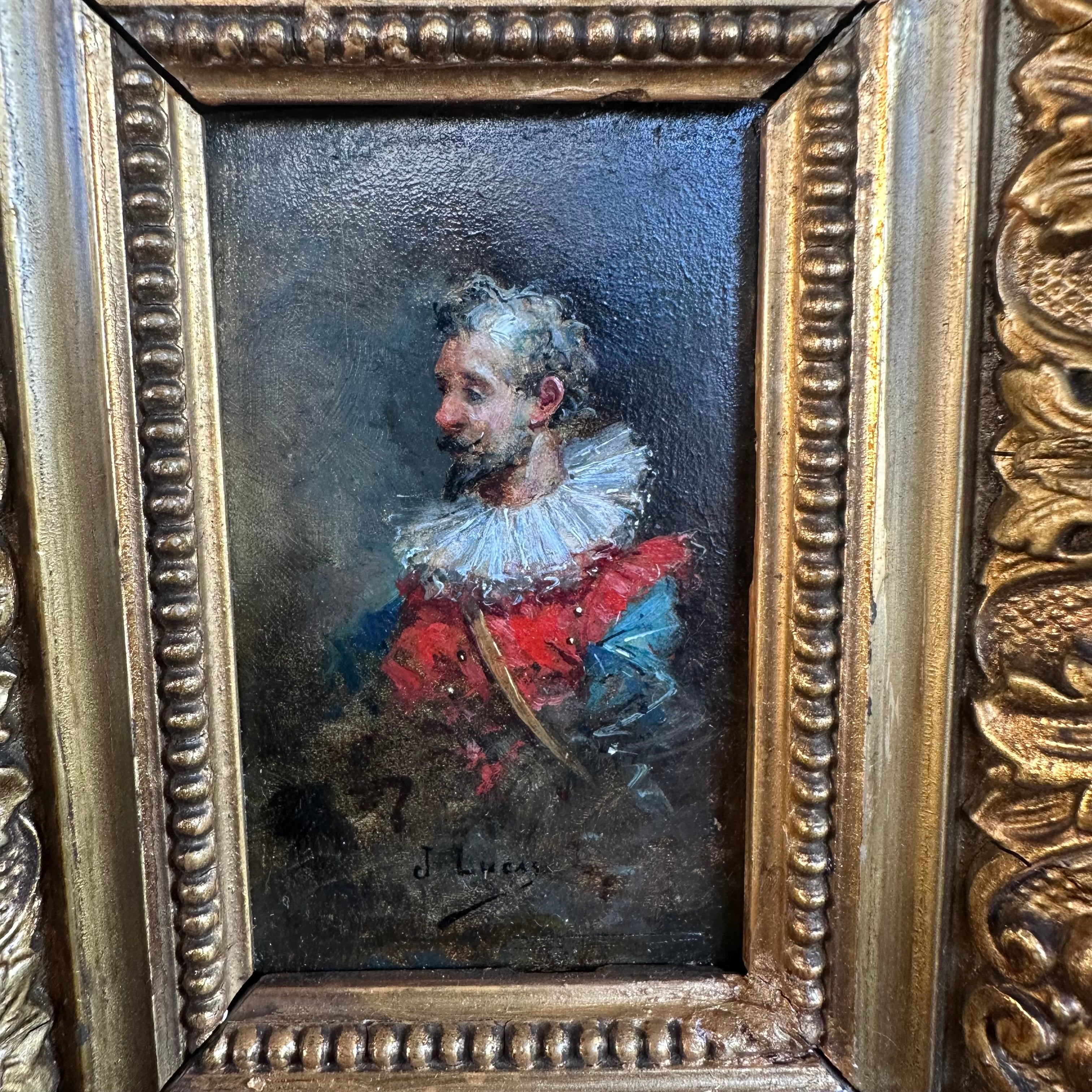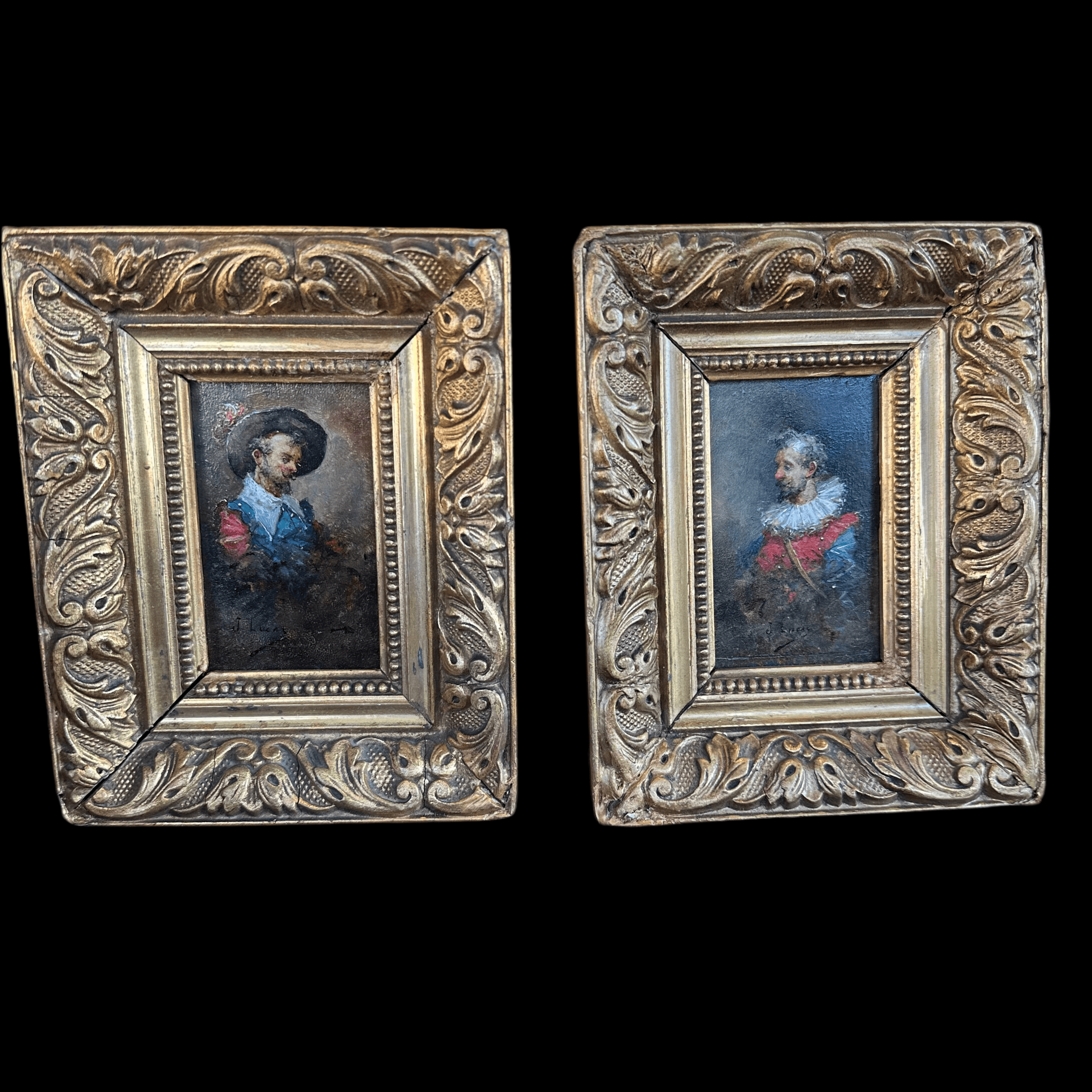 Dos óleos sobre madera de pequeño formato, de origen europeo firmados J. Lucas, retratando detalladamente cada uno a un caballero medieval con un delicado trabajo de luz y sombra. Cada obra tiene un bellísimo marco de madera tallada en relieves y pintada de elegante dorado.