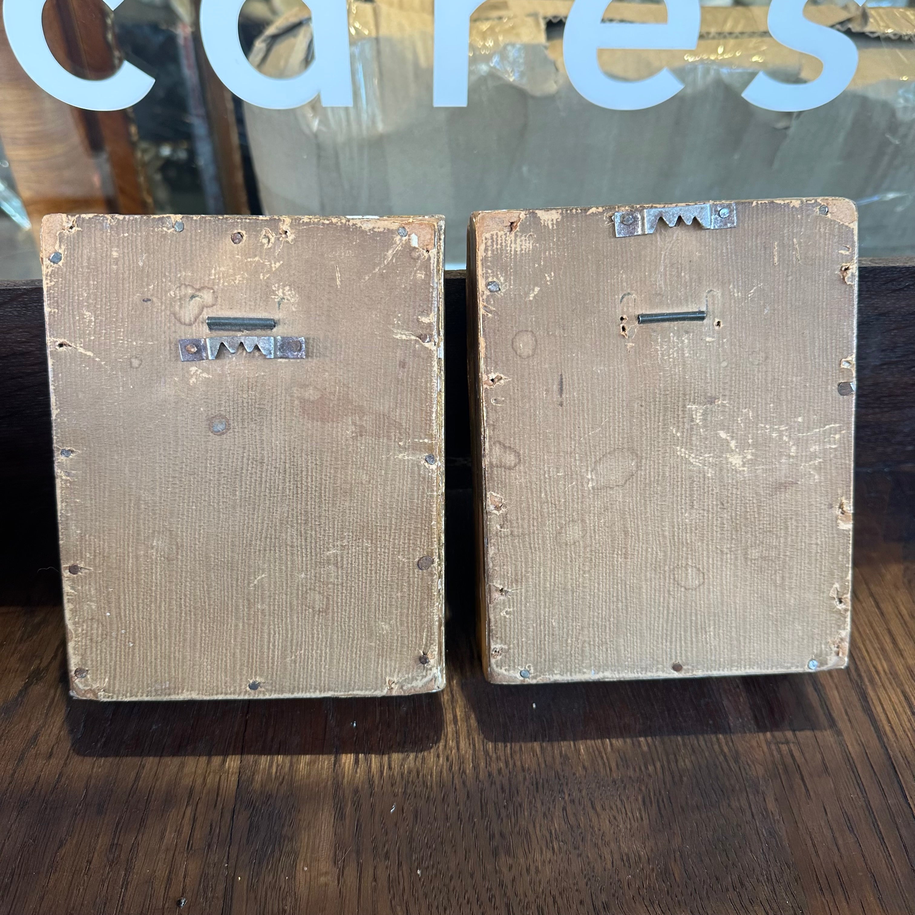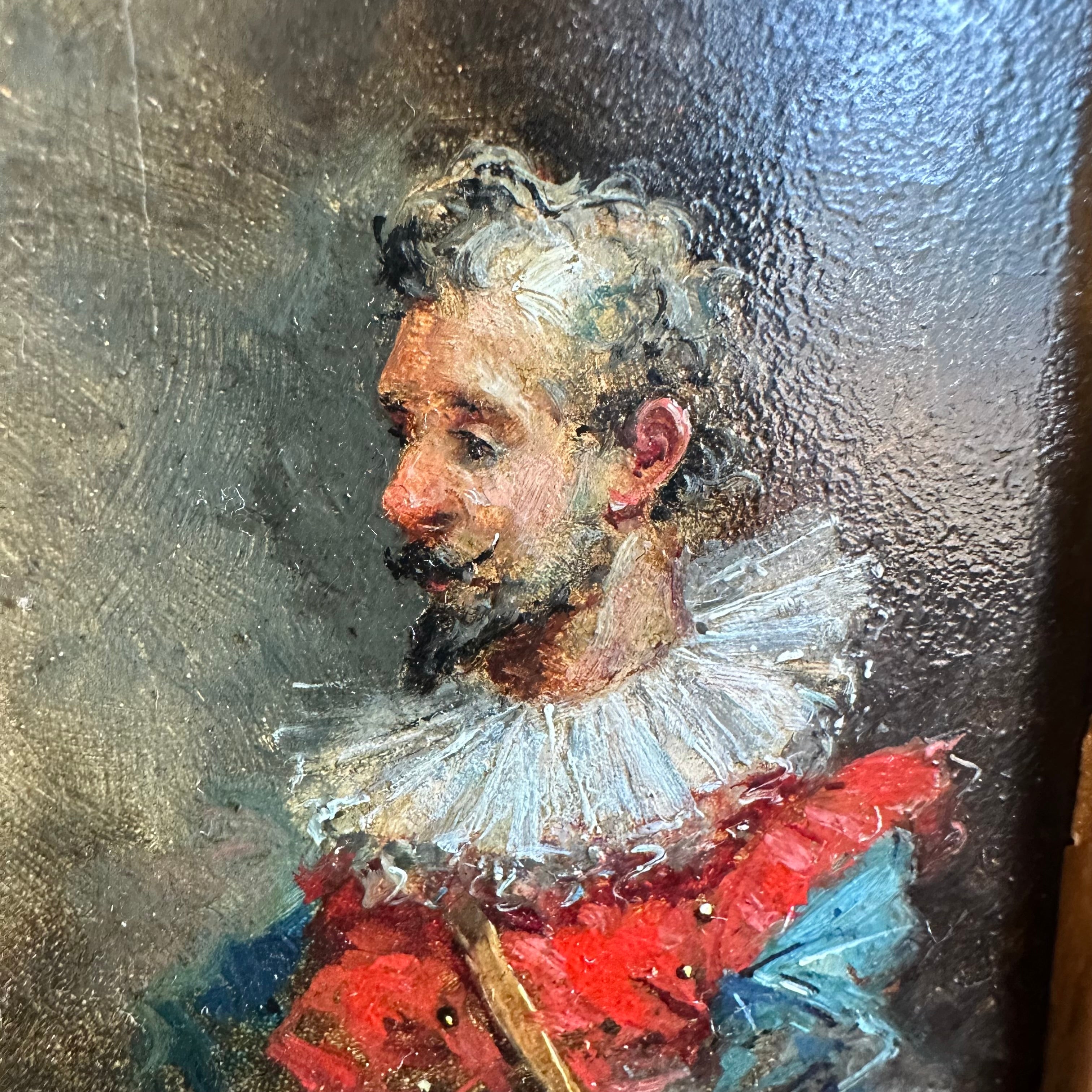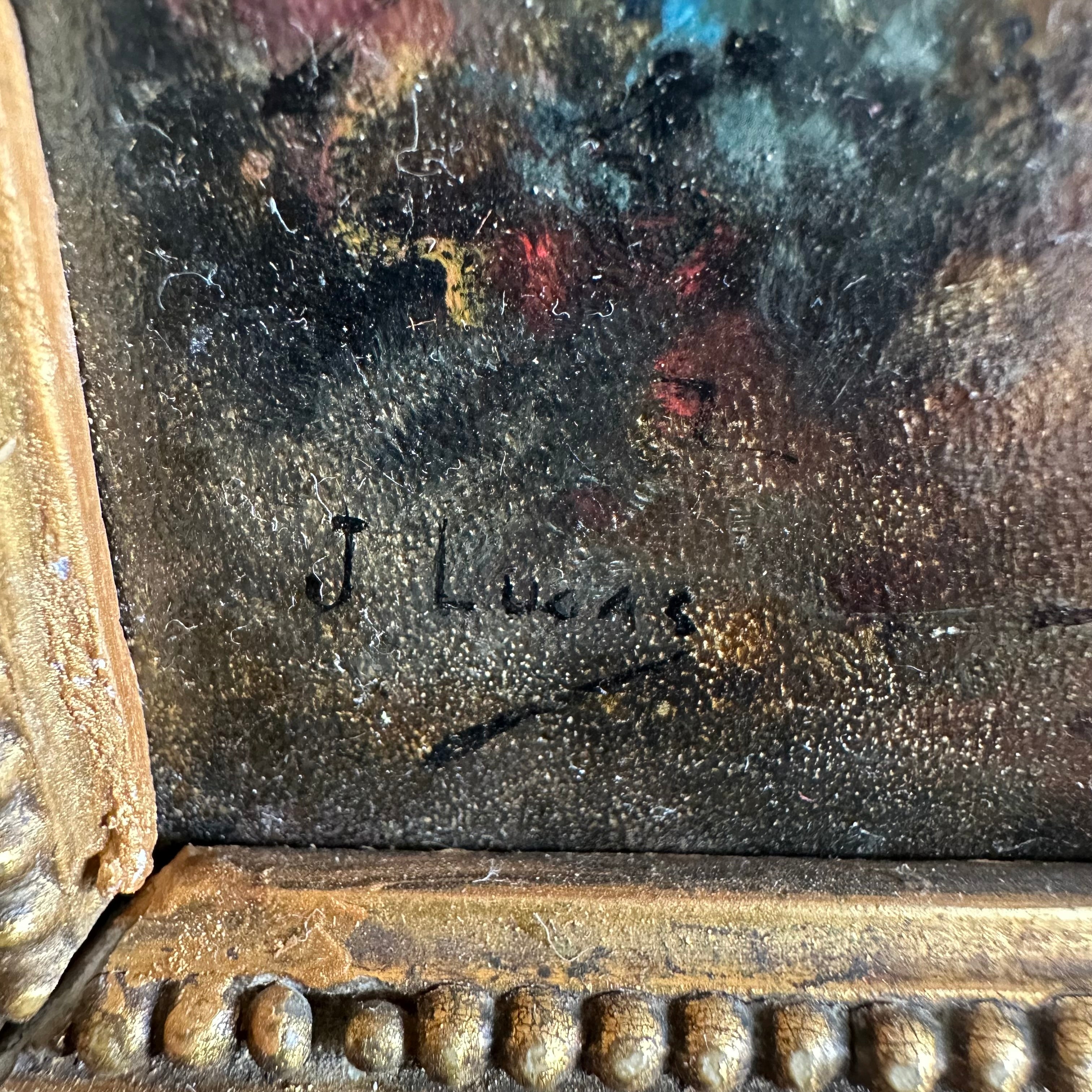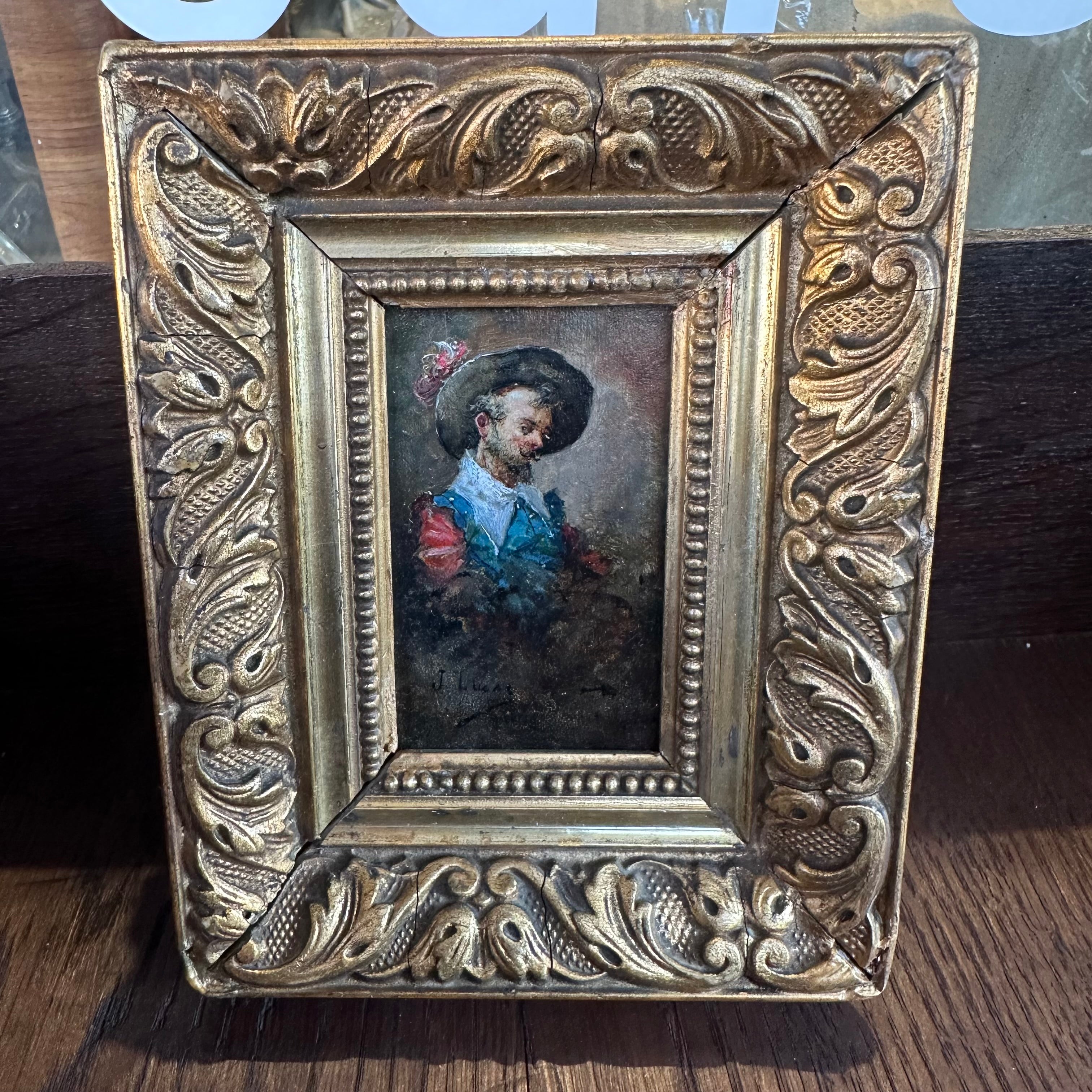 Dos óleos sobre madera de pequeño formato, de origen europeo firmados J. Lucas, retratando detalladamente cada uno a un caballero medieval con un delicado trabajo de luz y sombra. Cada obra tiene un bellísimo marco de madera tallada en relieves y pintada de elegante dorado.