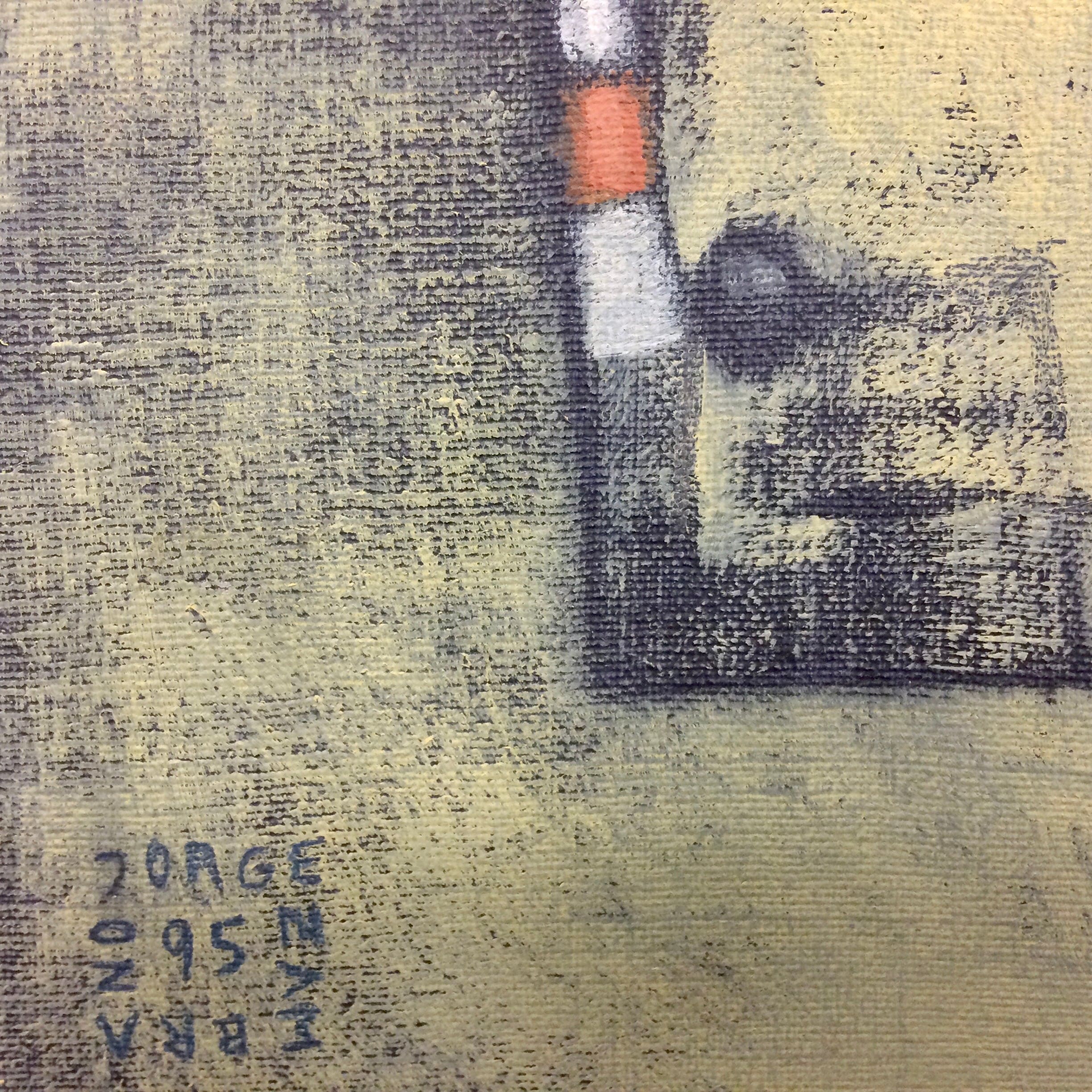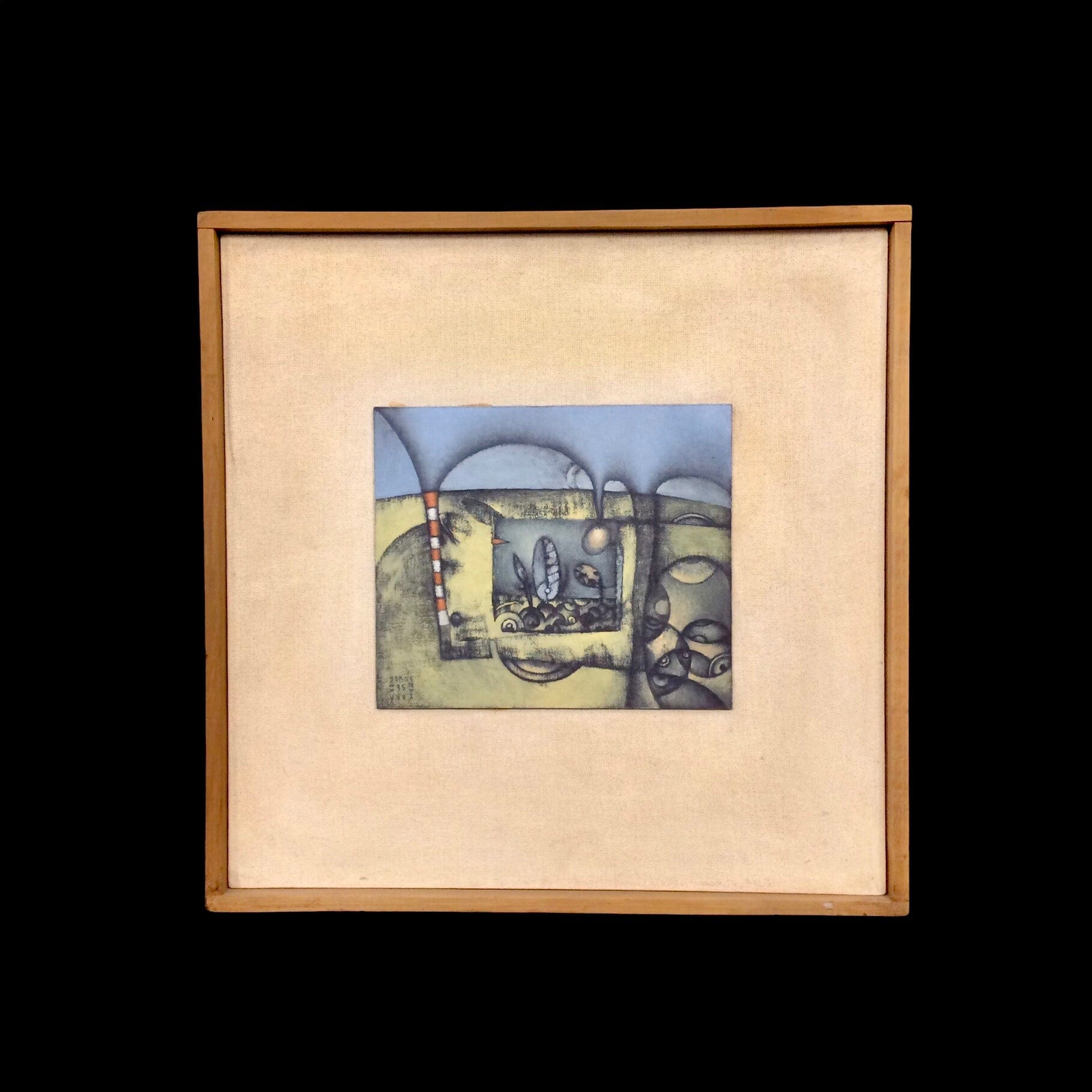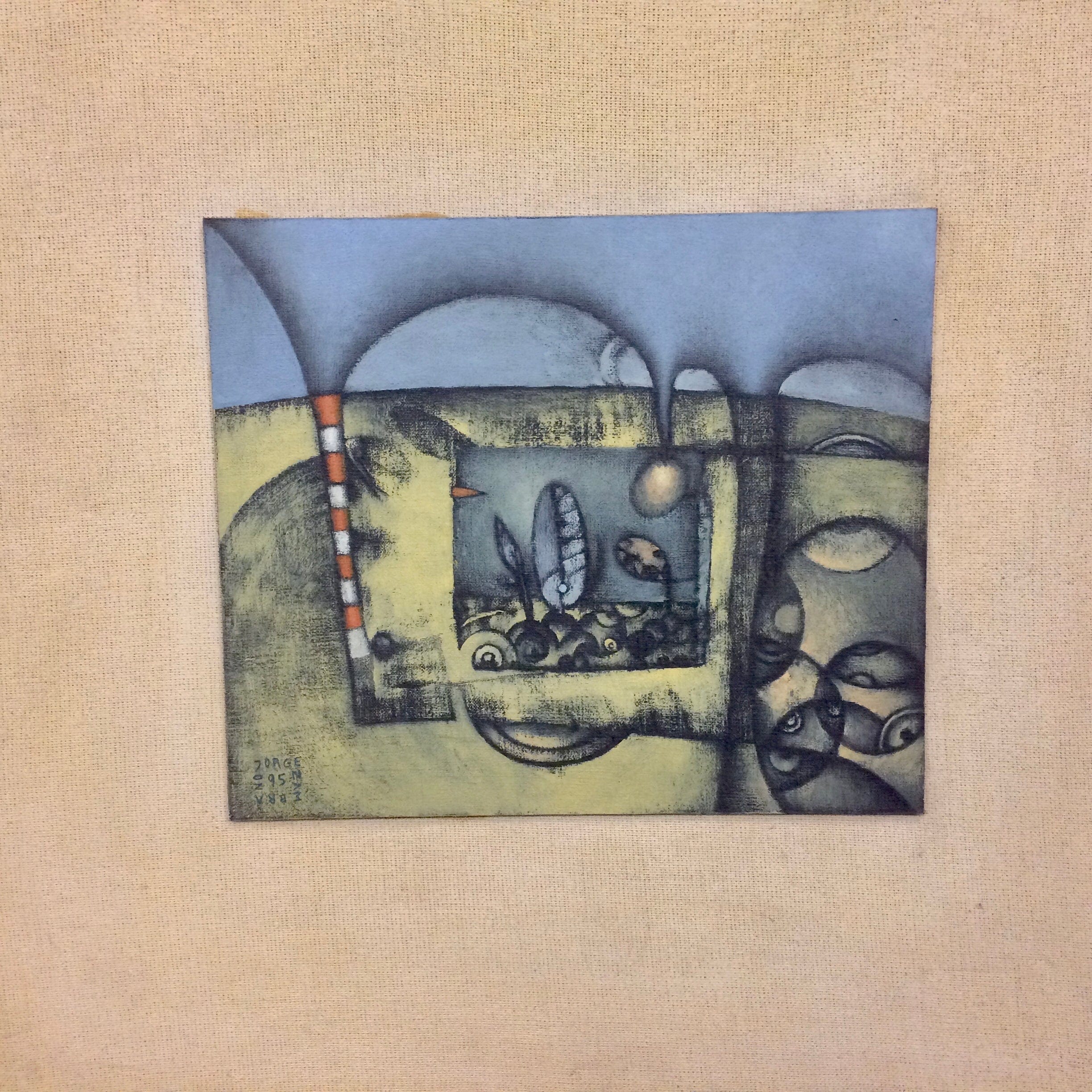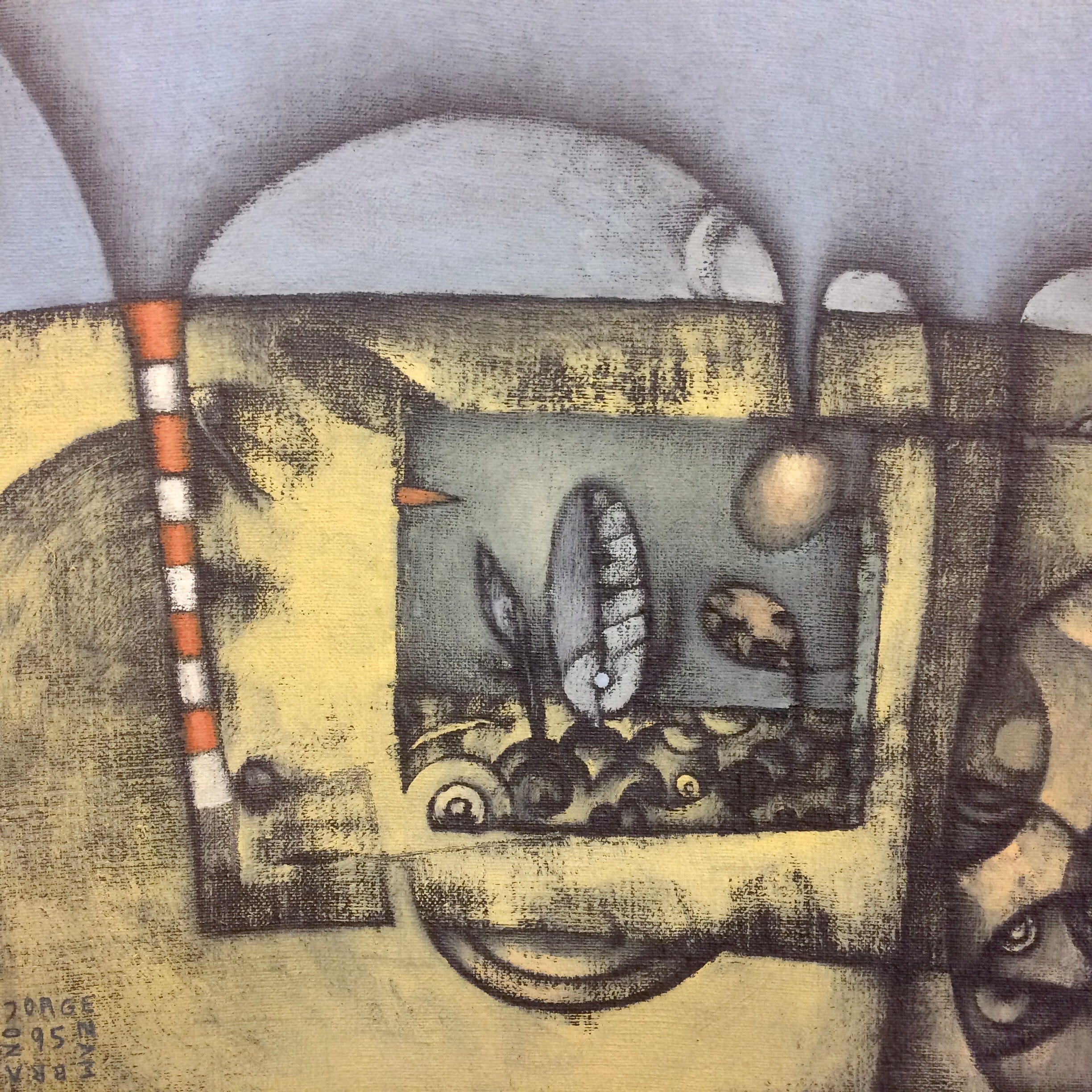 Acrílico sobre madera del artista chileno Jorge Zambrano. En tonos grisáceos y azules se perfilan arcos y columnas entre otras figuras, destaca una columna en azul y rojo. Firmado a mano. La obra se encuentra montada sobre tela y marco de madera.