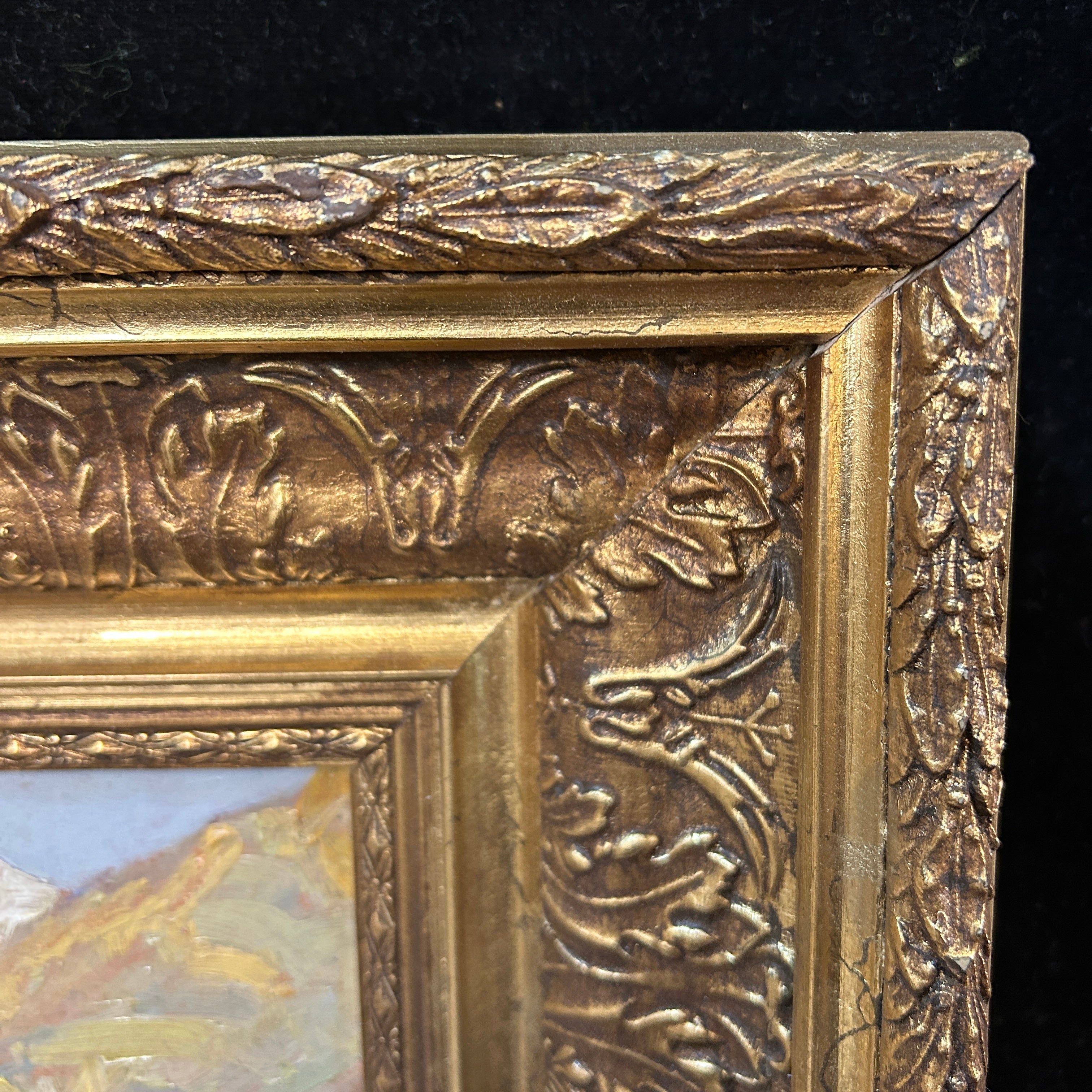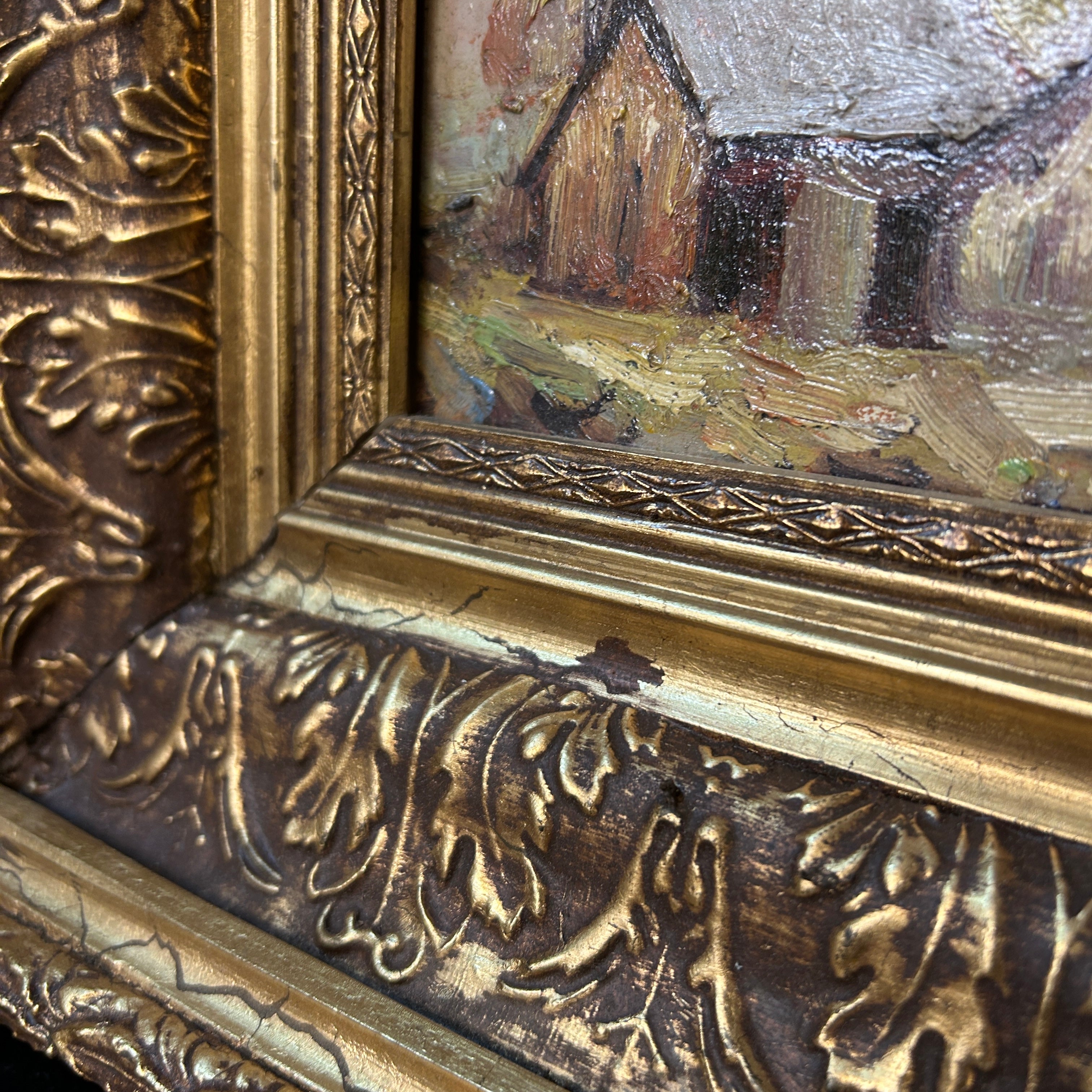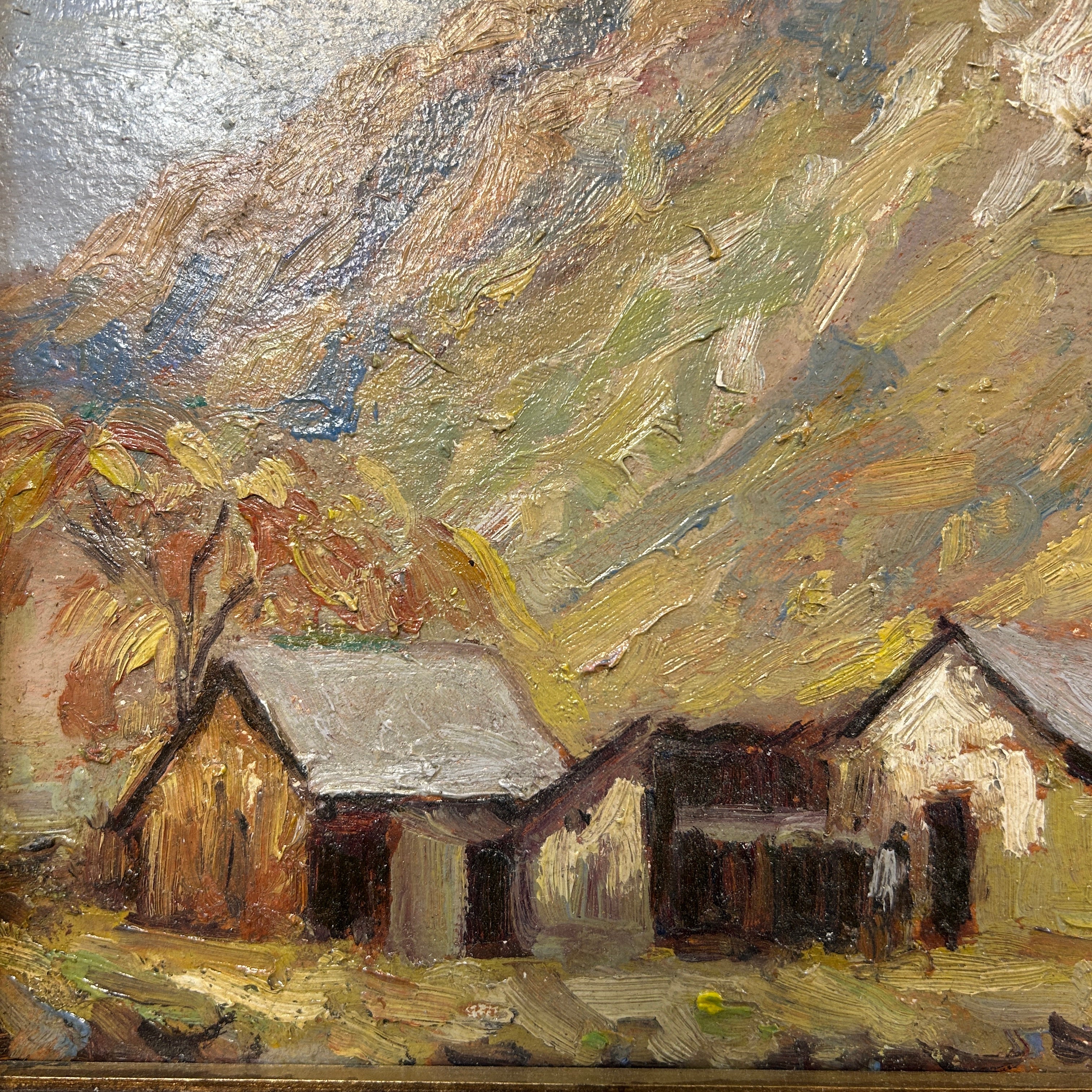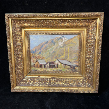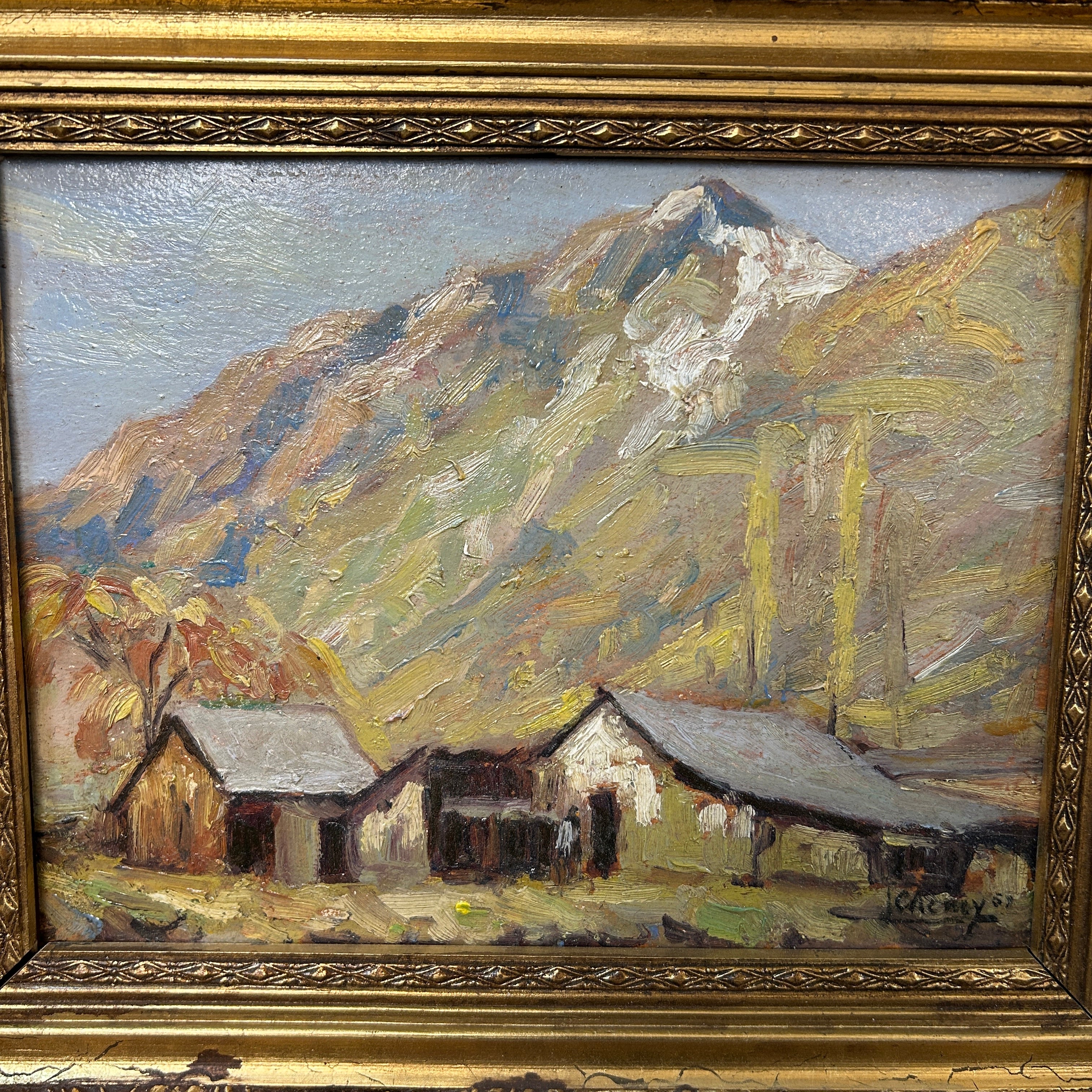 Óleo sobre cartón del artista chileno Ladislao Cheney, representando un paisaje chileno cordillerano, en el que se ve una casa de adobe a los pies de la cordillera y rodeada de algunos árboles. Se trata de una composición de tonos cálidos y amarillos, con reflejos de luz blanca y un pálido azul en el cielo, relevando la sutileza con que este pintor captura lo lo bello y cotidiano del mundo rural. La obra está enmarcada en madera tallada en relieves y terminada de un luminoso dorado.