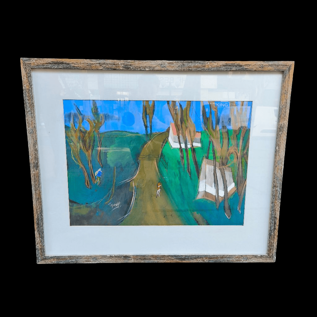 Acuarela en técnica Wash del artista chileno Luis Tejada, representando una quinta a lo lejos con dos campesinos llevando carga en su espalda. La composición tiene un nivel de abstracci9n que simplifica el paisaje, dejando sus elementos fundamentales y haciendo resaltar los trazos del artista.