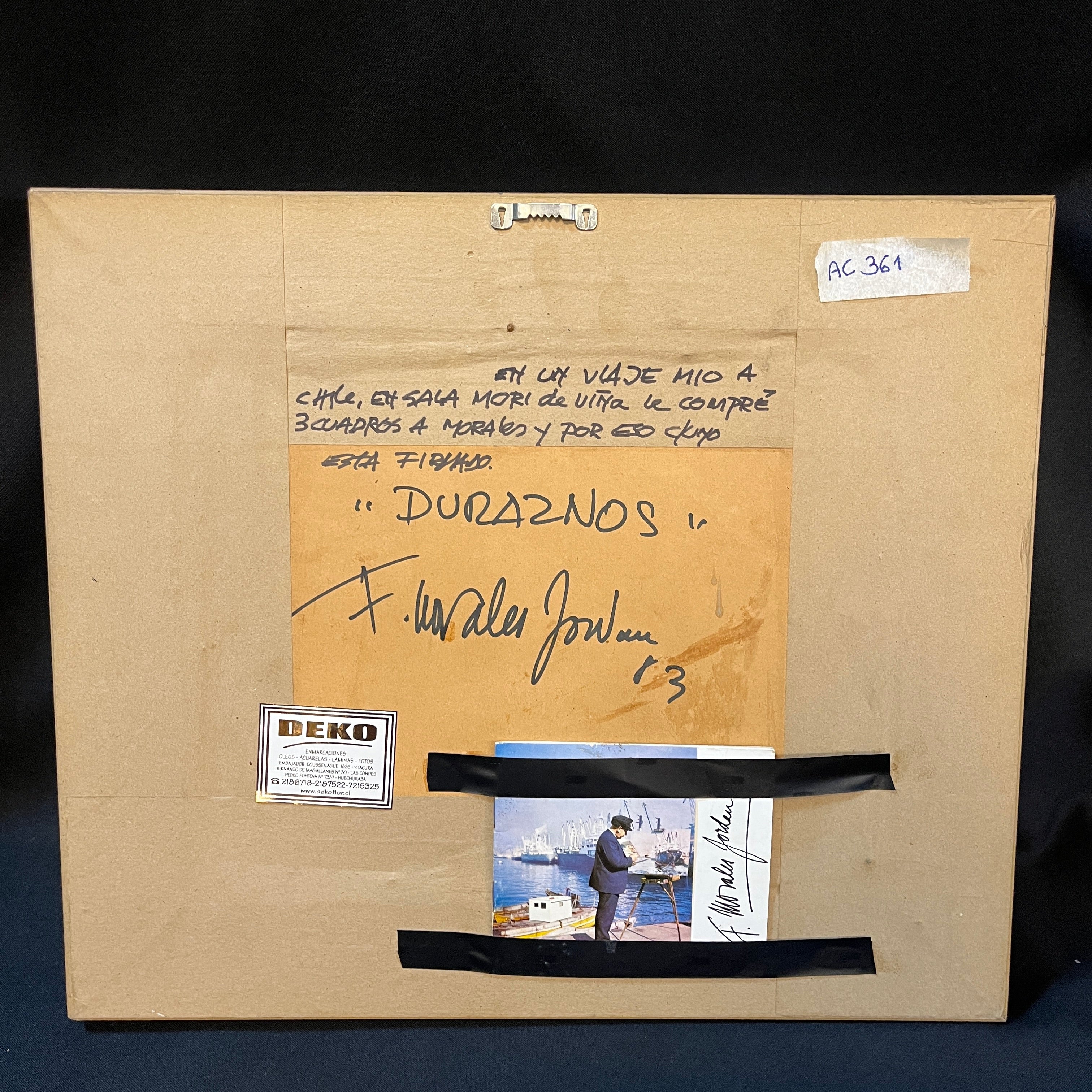 Particular bodegón del reconocido artista chileno Fernando Morales Jordán titulado por el propio artista como 'Duraznos'. La obra nos presenta un plato con tres duraznos uno de ellos a medio comer, lo que permite ver su pulpa y carozo. El plato viene acompañado de un paño blanco que entrega una neutralidad para que el foco sólo quede en la fruta.