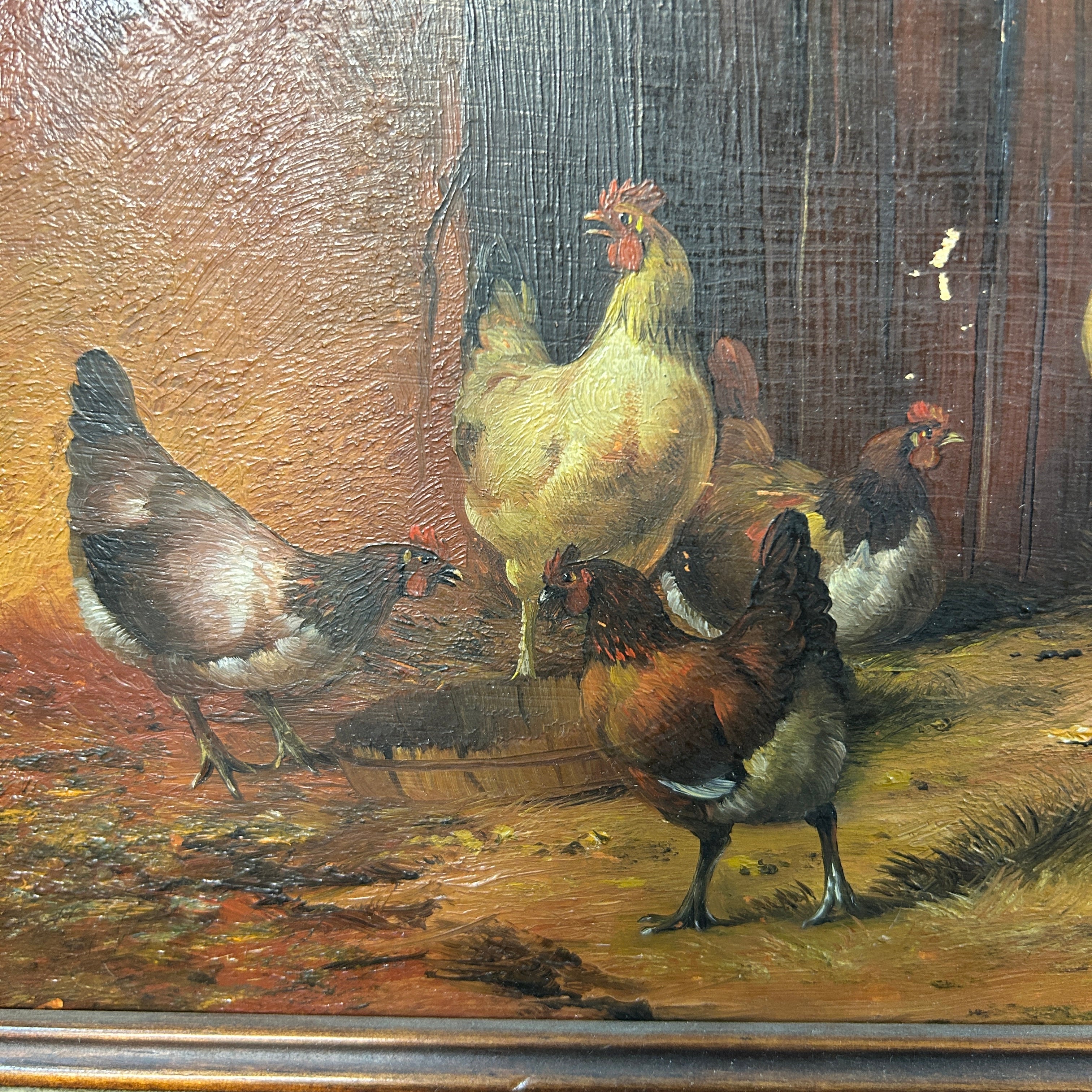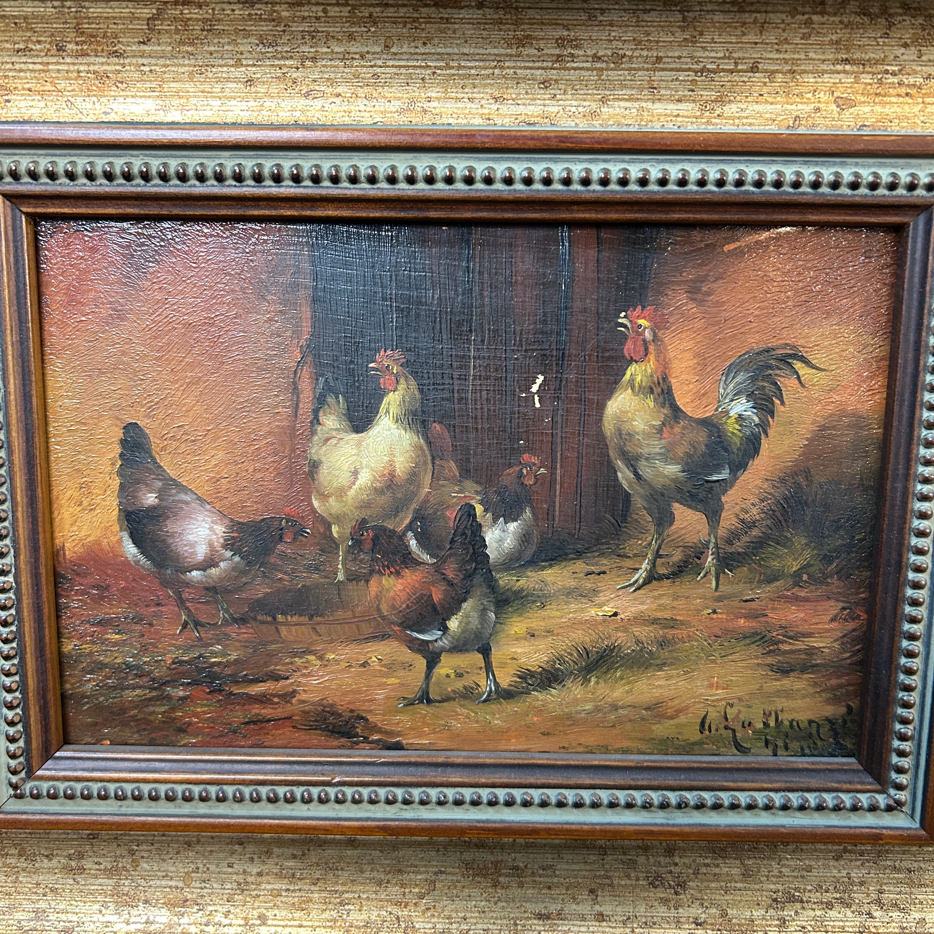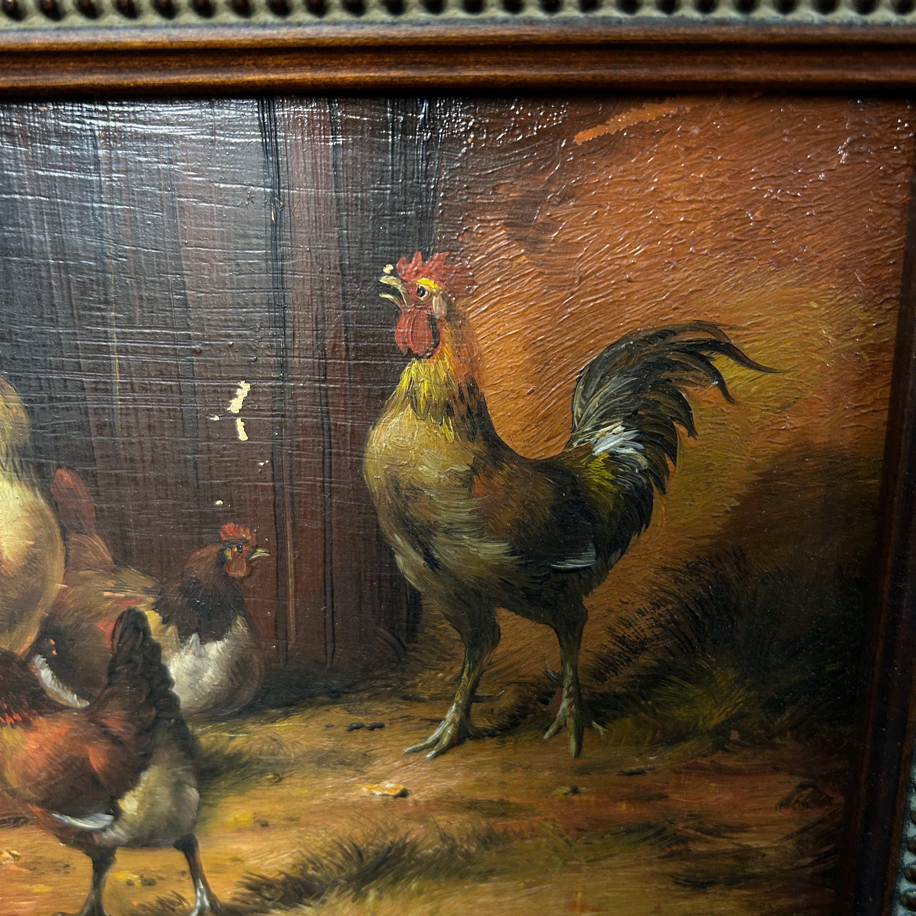 Óleo sobre tela del artista chileno x representando su reconocible temática de gallinas y gallos dentro de sus gallineros, retratando con detalle sus plumajes y la textura de la paja. La obra tiene un marco de madera con bordes tallados en relieves y terminada de un tono cobrizo, que combina muy bien con la calidez anaranjada del interior de gallinero.