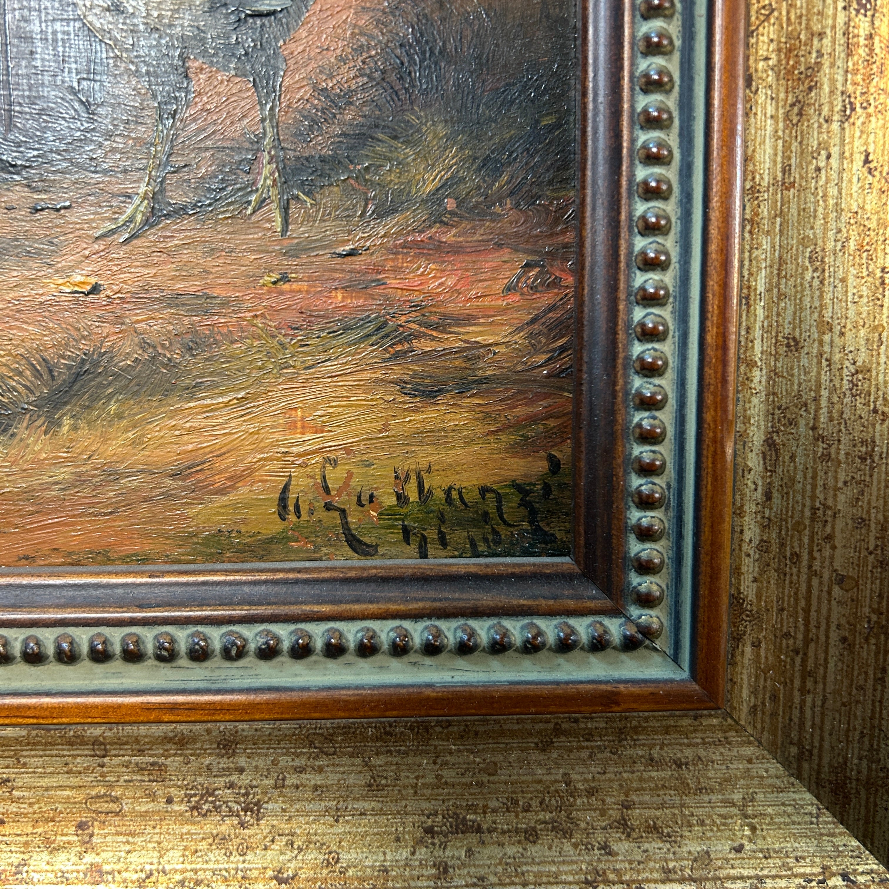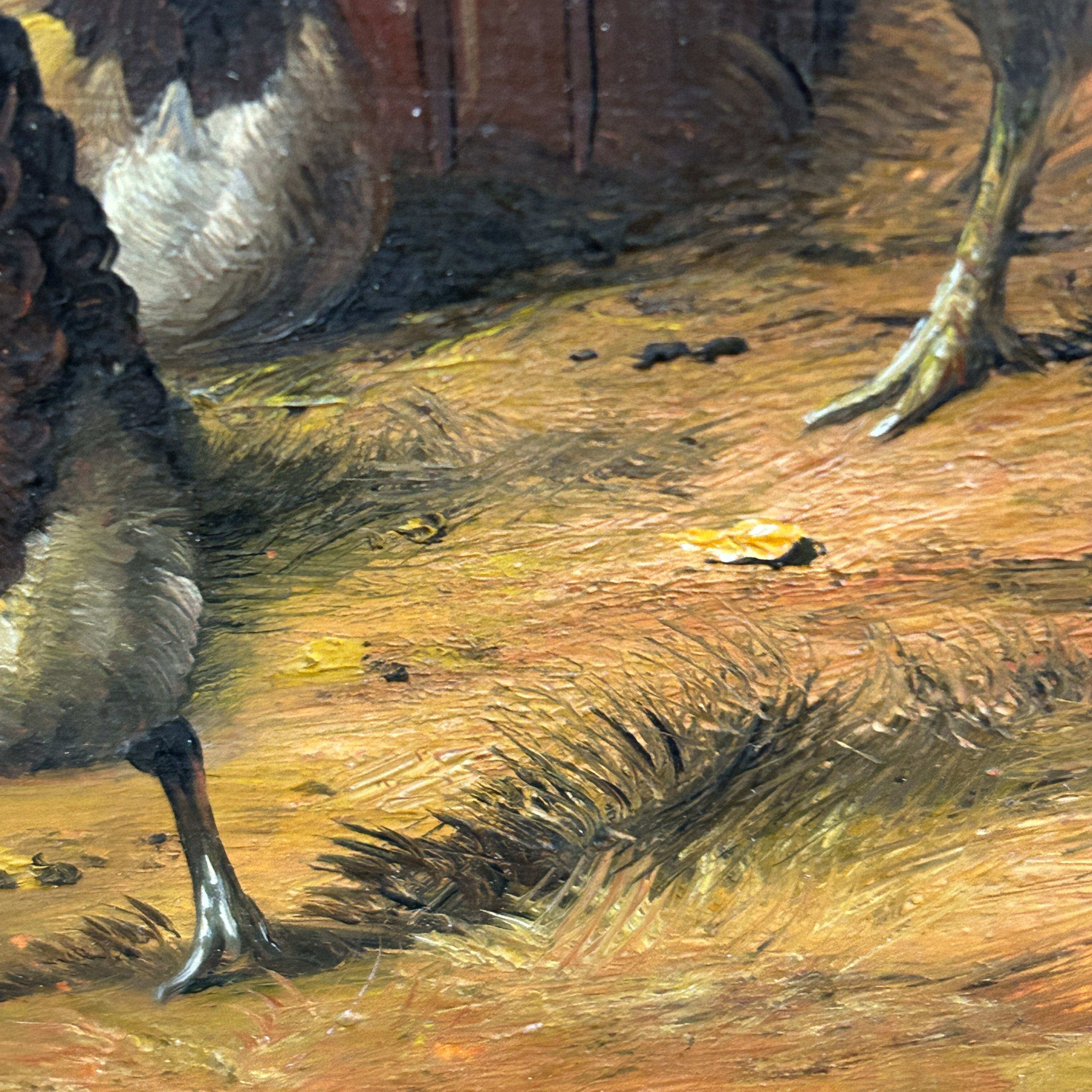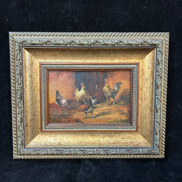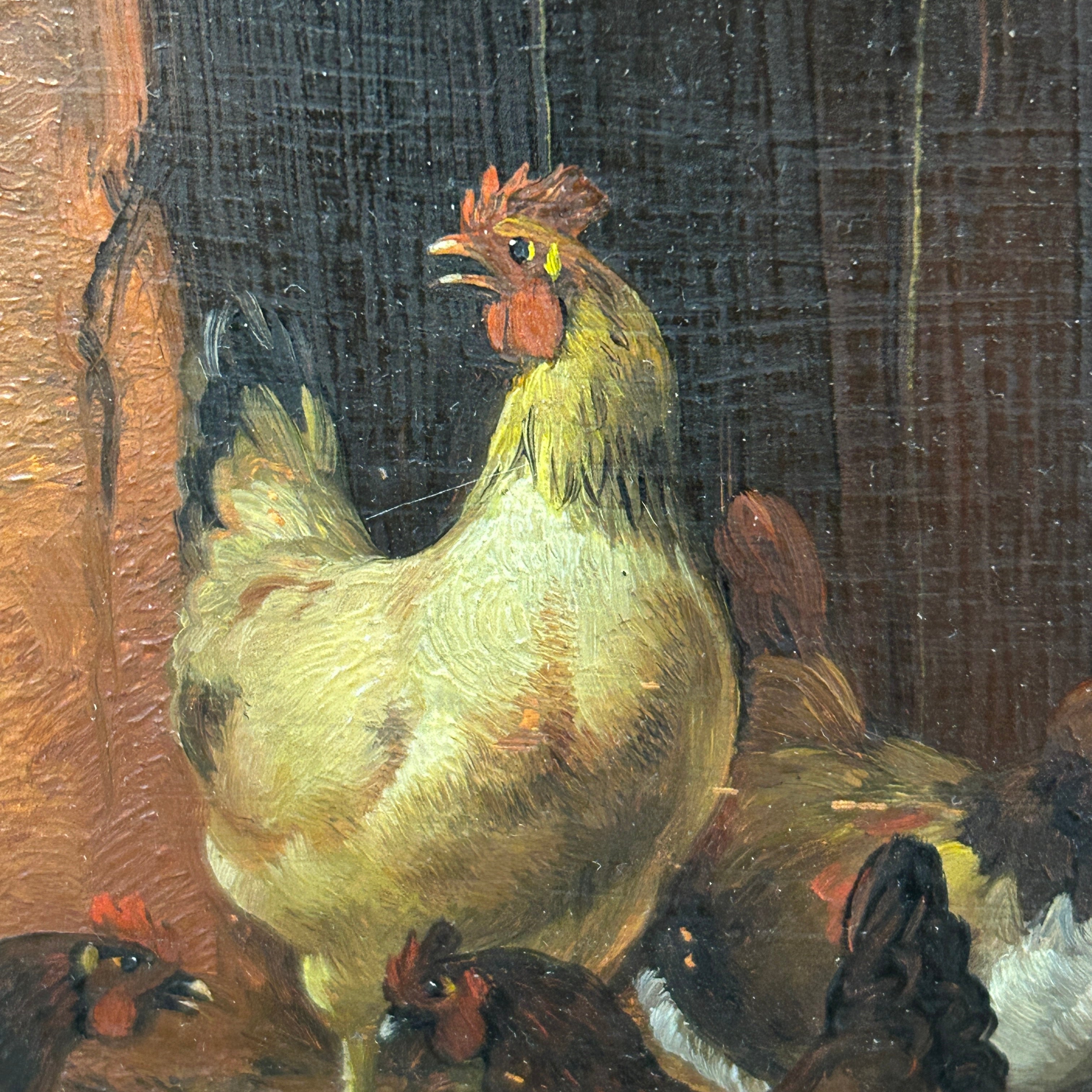 Óleo sobre tela del artista chileno x representando su reconocible temática de gallinas y gallos dentro de sus gallineros, retratando con detalle sus plumajes y la textura de la paja. La obra tiene un marco de madera con bordes tallados en relieves y terminada de un tono cobrizo, que combina muy bien con la calidez anaranjada del interior de gallinero.