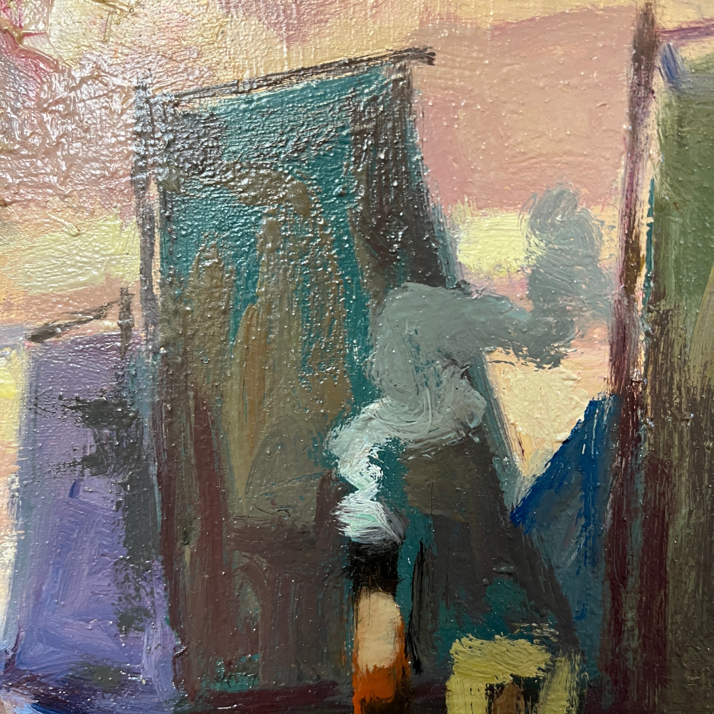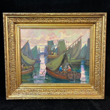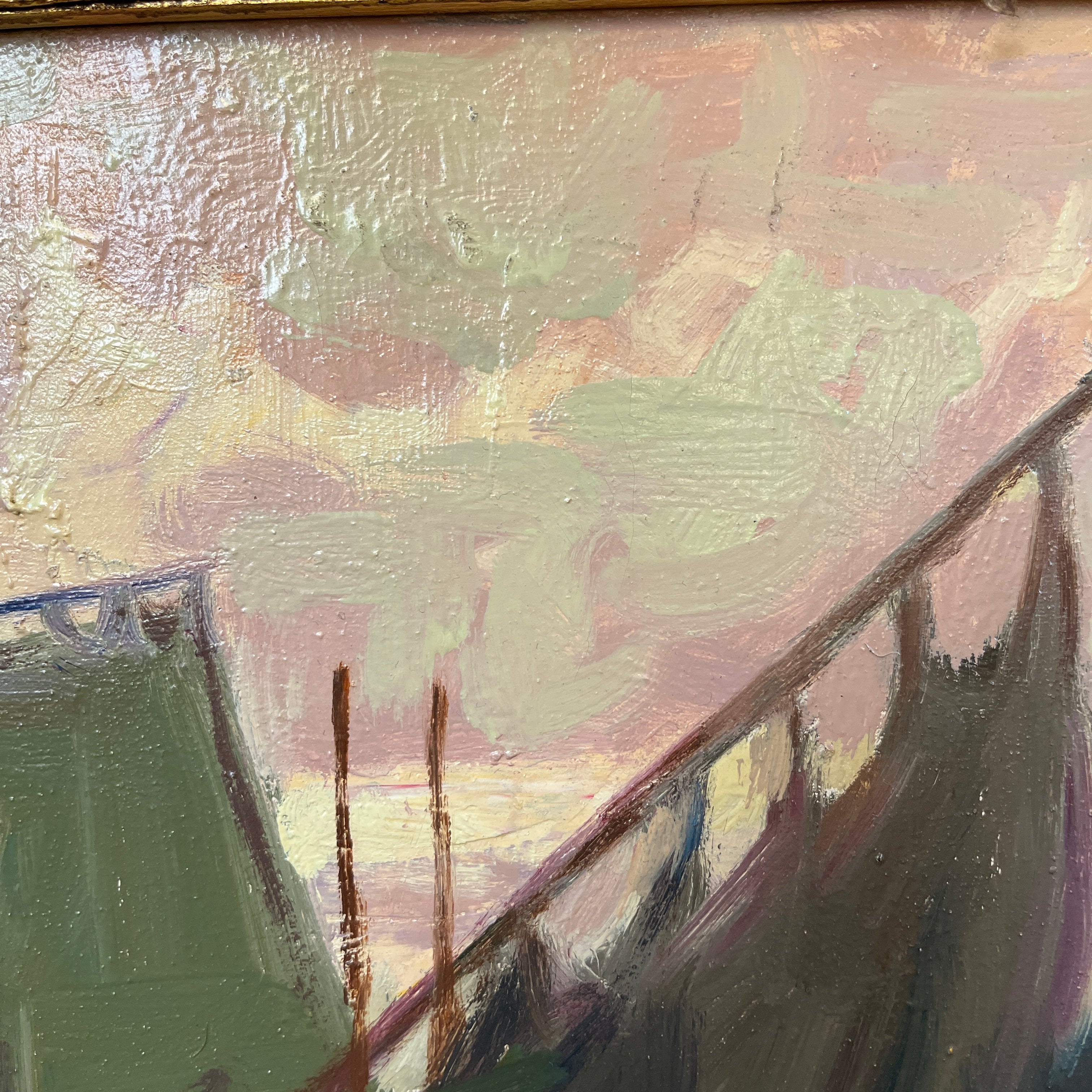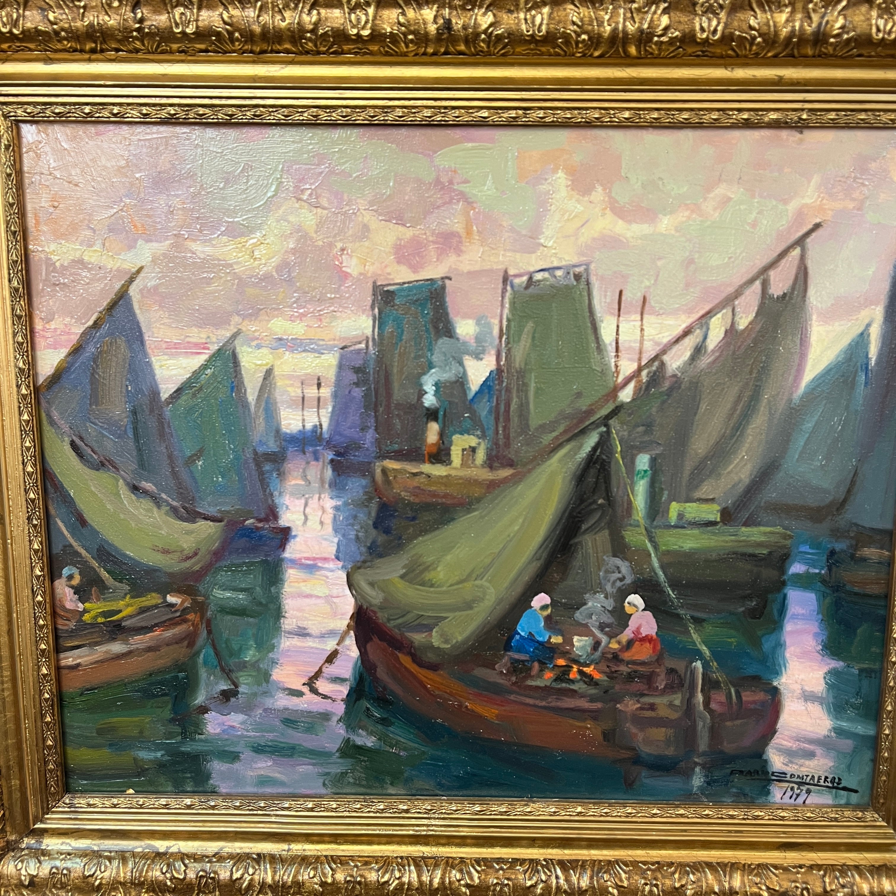 Óleo sobre tela del artista chileno Darío Contreras (1904-1988), pintado en 1979. La obra representa una escena náutica, de veleros amarrados con un amanecer de fondo, indicado por un bellísimo cielo en tonos rosados. En primer plano se puede ver a un par de mujeres sobre uno de los veleros, calentando una olla, seguramente preparando el desayuno. Se trata de una escena pacífica y cotidiana, de gran belleza, que representa fielmente la mezcla de inclinaciones impresionistas e intereses en el realismo que marcaron la obra del pintor. La obra está enmarcada en madera tallada en relieves y pintada de dorado.