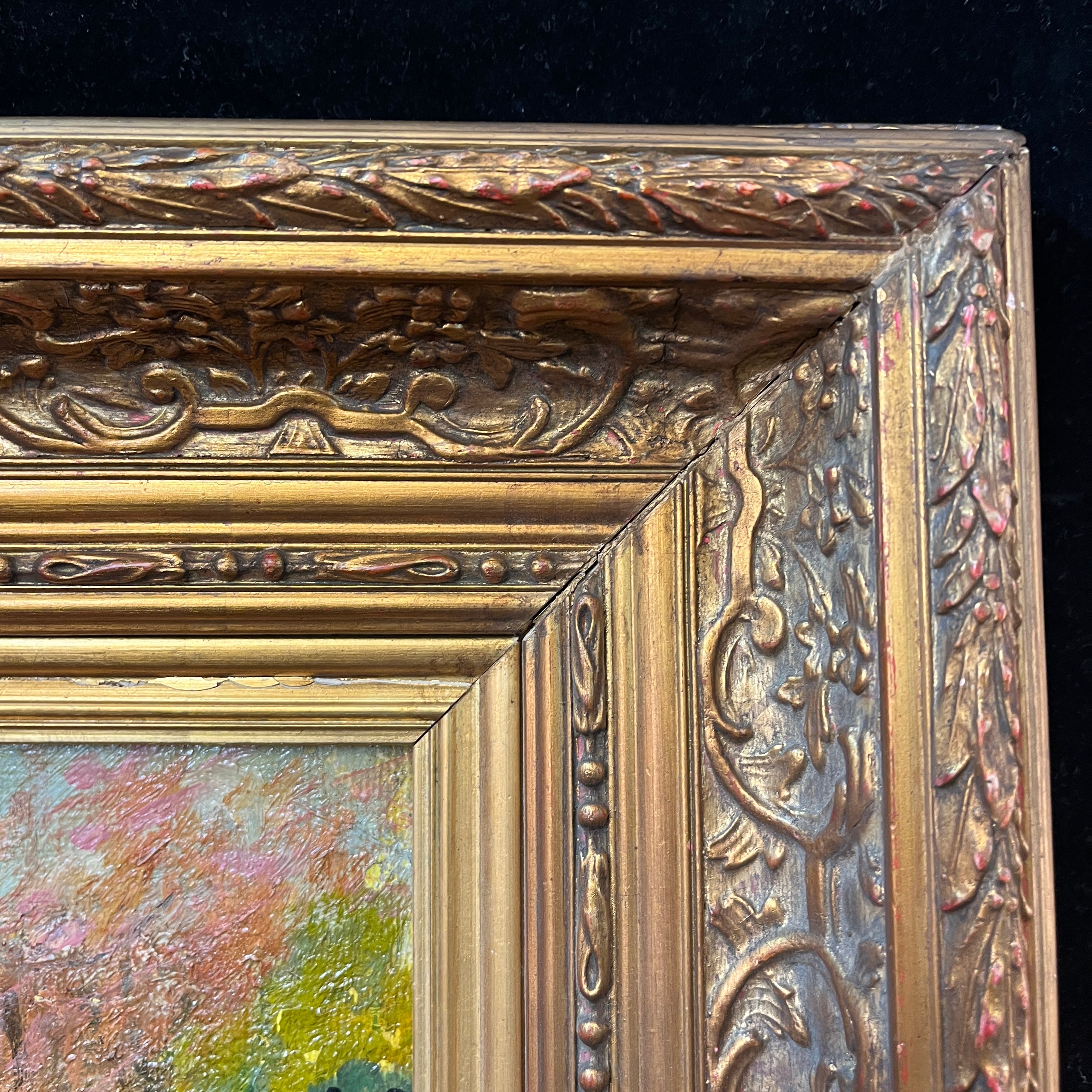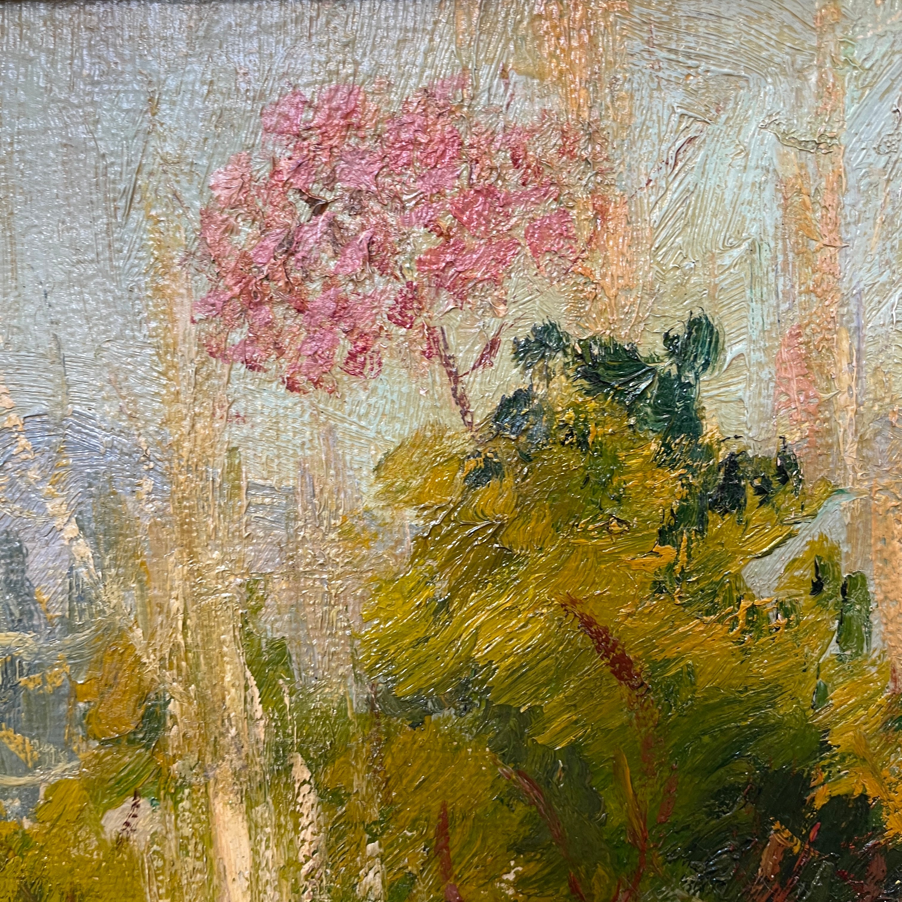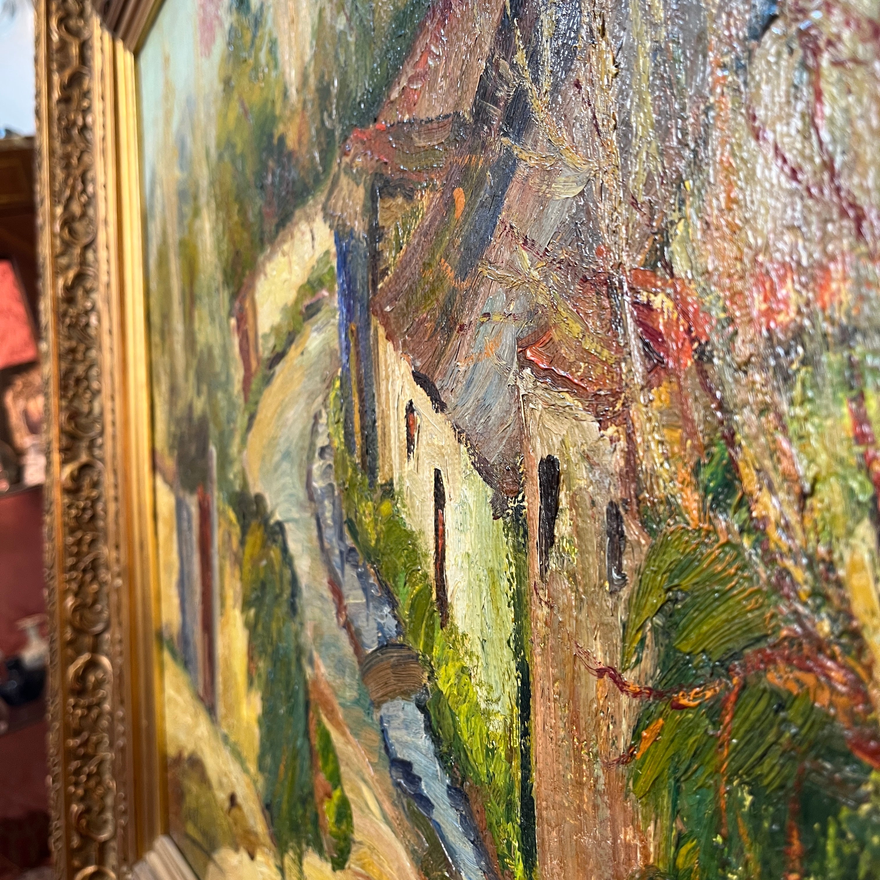 Óleo sobre tela, de origen chileno, del artista Humberto Martínez González, activo principalmente durante la década de los 50. La obra representa, con trazos expresivos y cargados, un frondoso y colorido paisaje de campo en el que, desde una colina, se puede ver un camino, las puertas y fachadas de diversas casas de adobe con techo de paja por un lado, y una gran pandereta que deja ver las copas de los árboles de un precioso jardín. La obra tiene un espectacular marco de madera tallada en relieves decorados, terminado en pintura dorada.