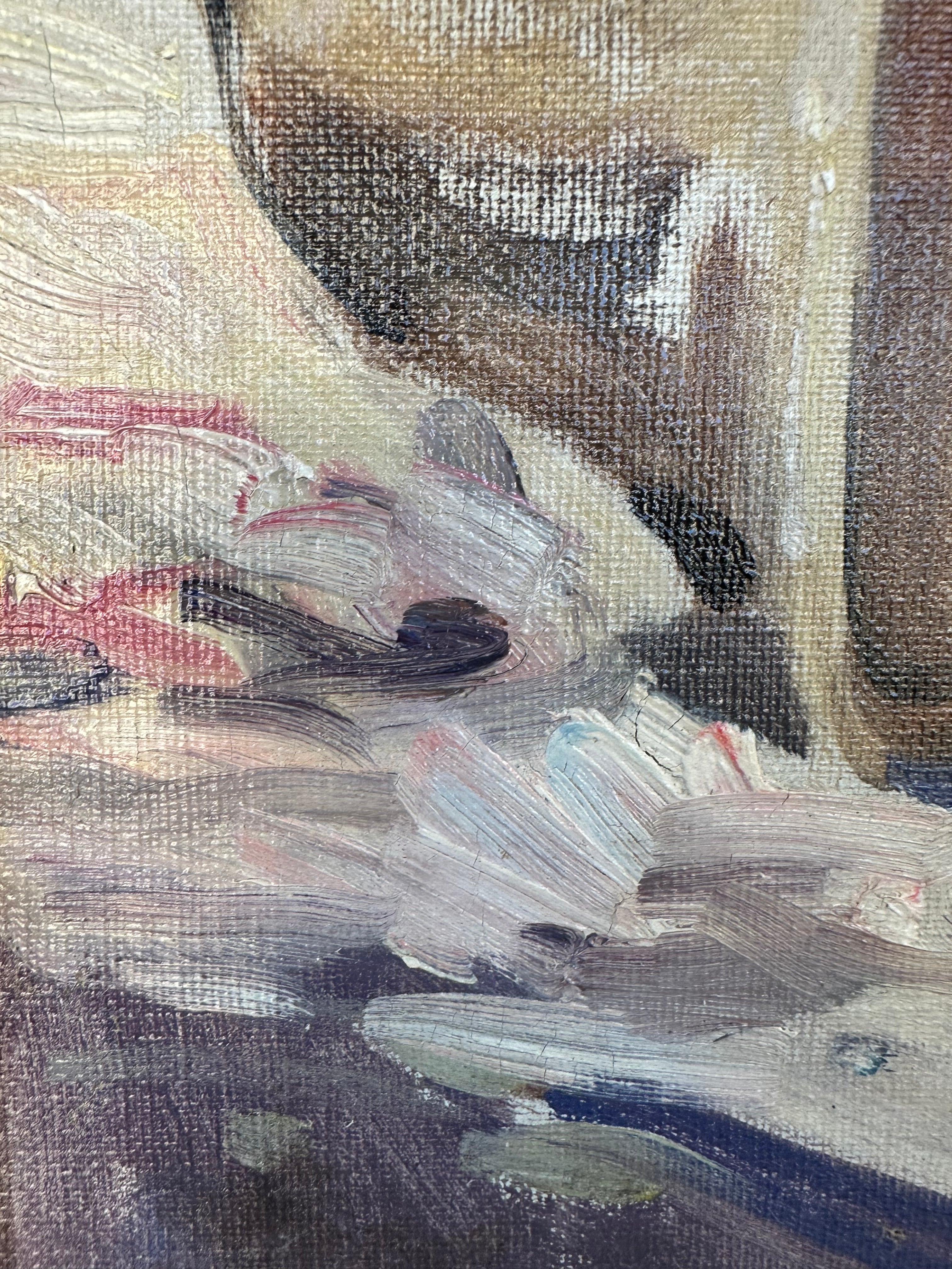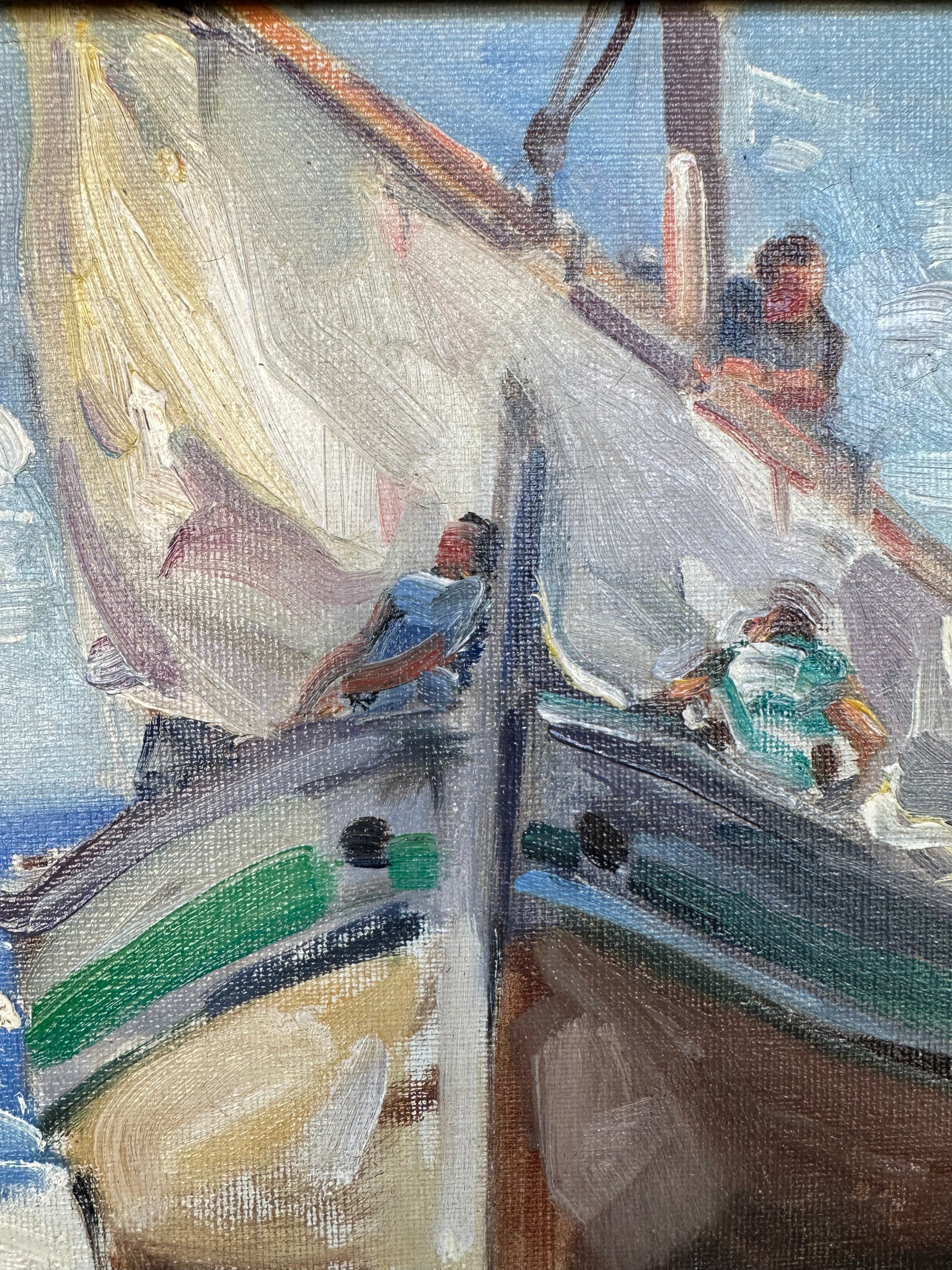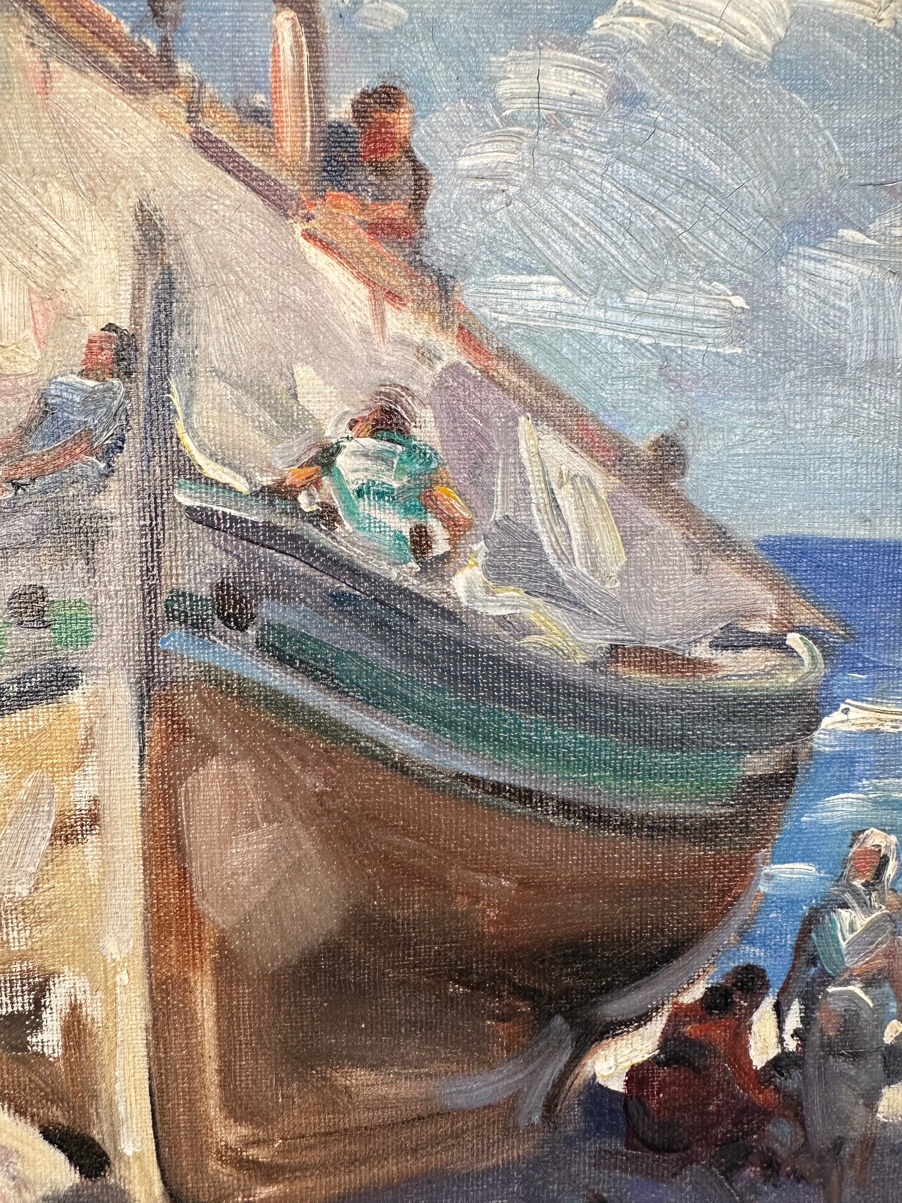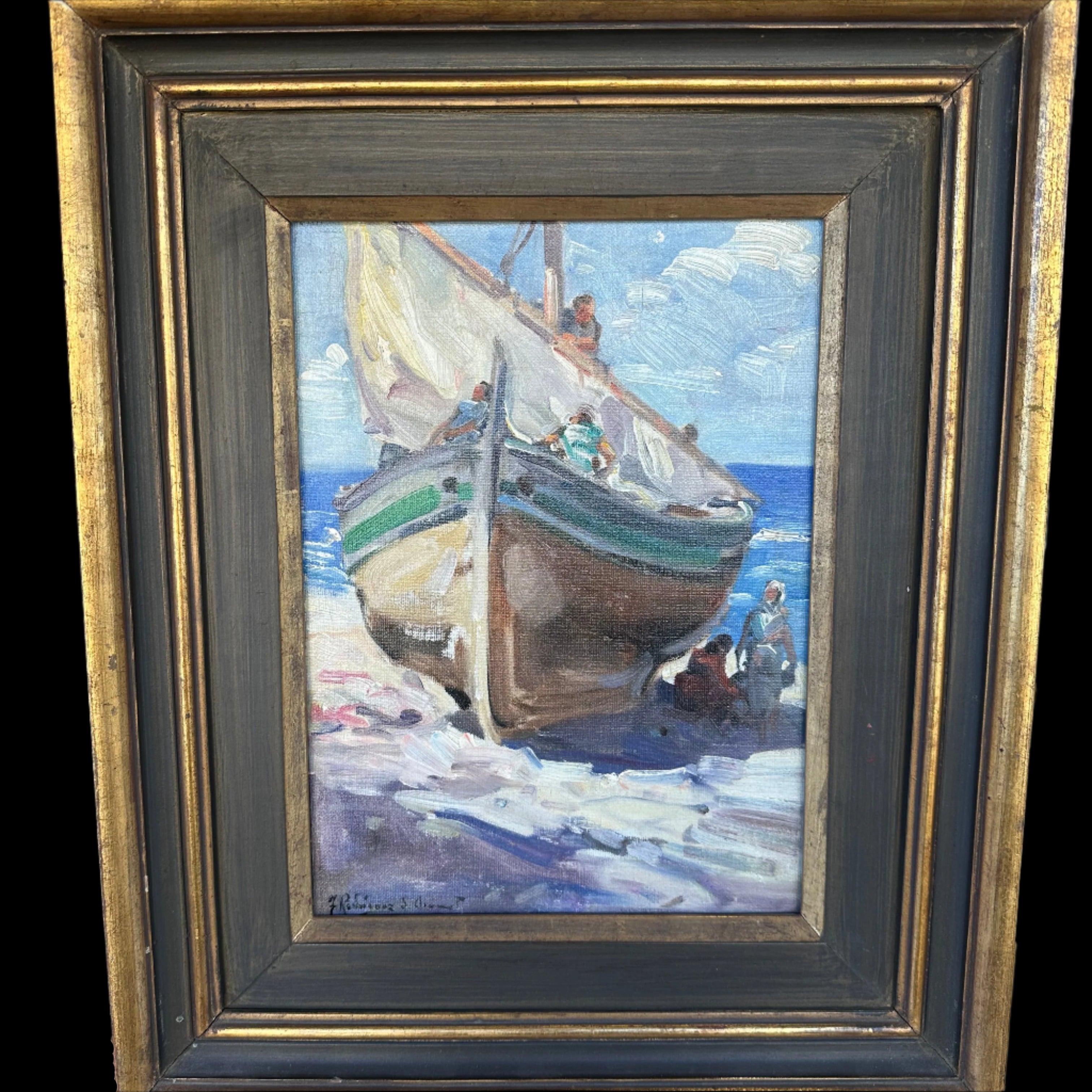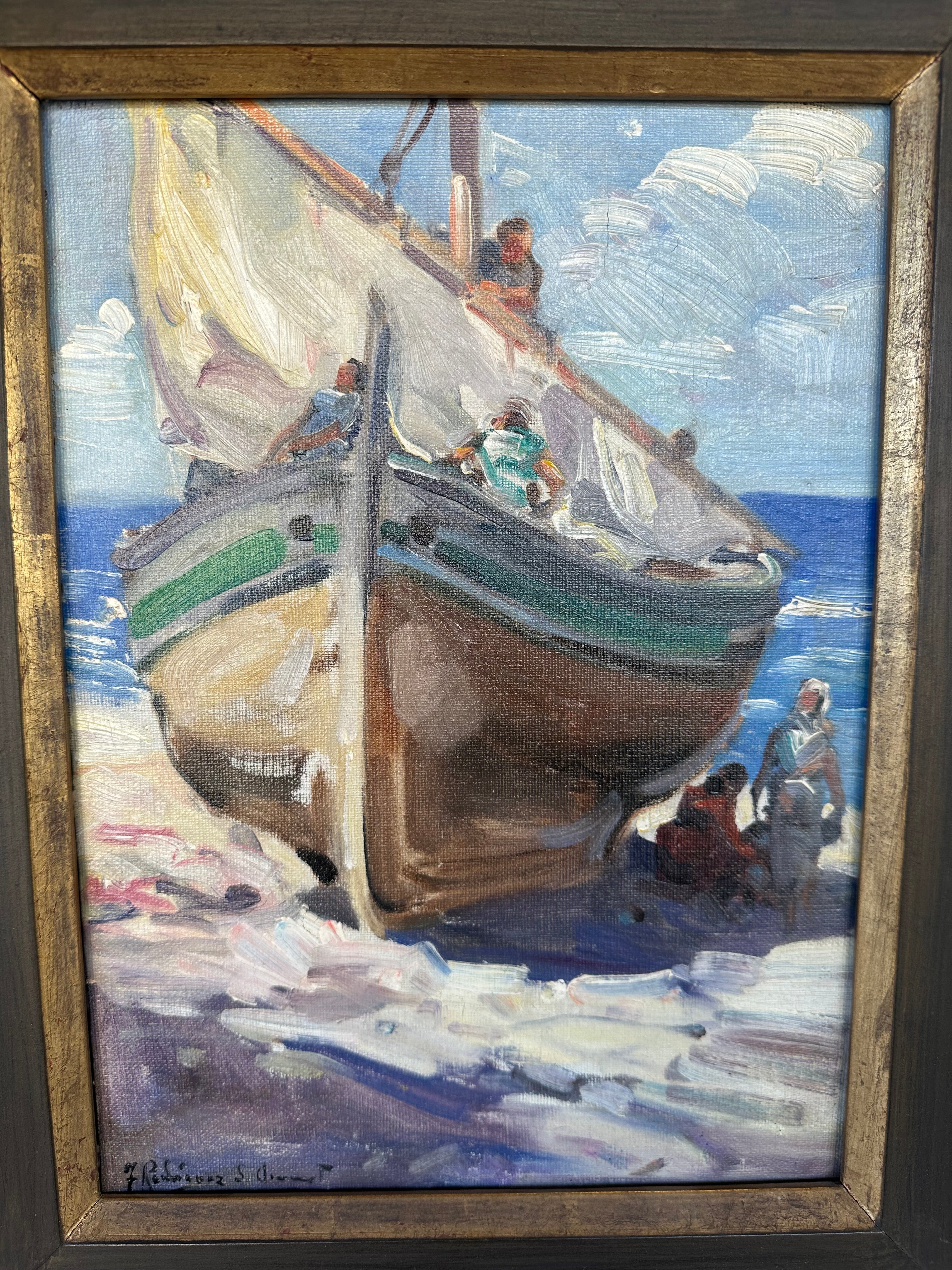 Óleo sobre tela, de origen europeo, representando un velero en la orilla de una playa con personajes, posiblemente pescadores, guardando las velas. El trazo es expresivo y llena el paisaje y los materiales, como las nubes y la arena, de la textura de la pincelada. La obras tiene un marco de madera oscura con bordes dorados.
