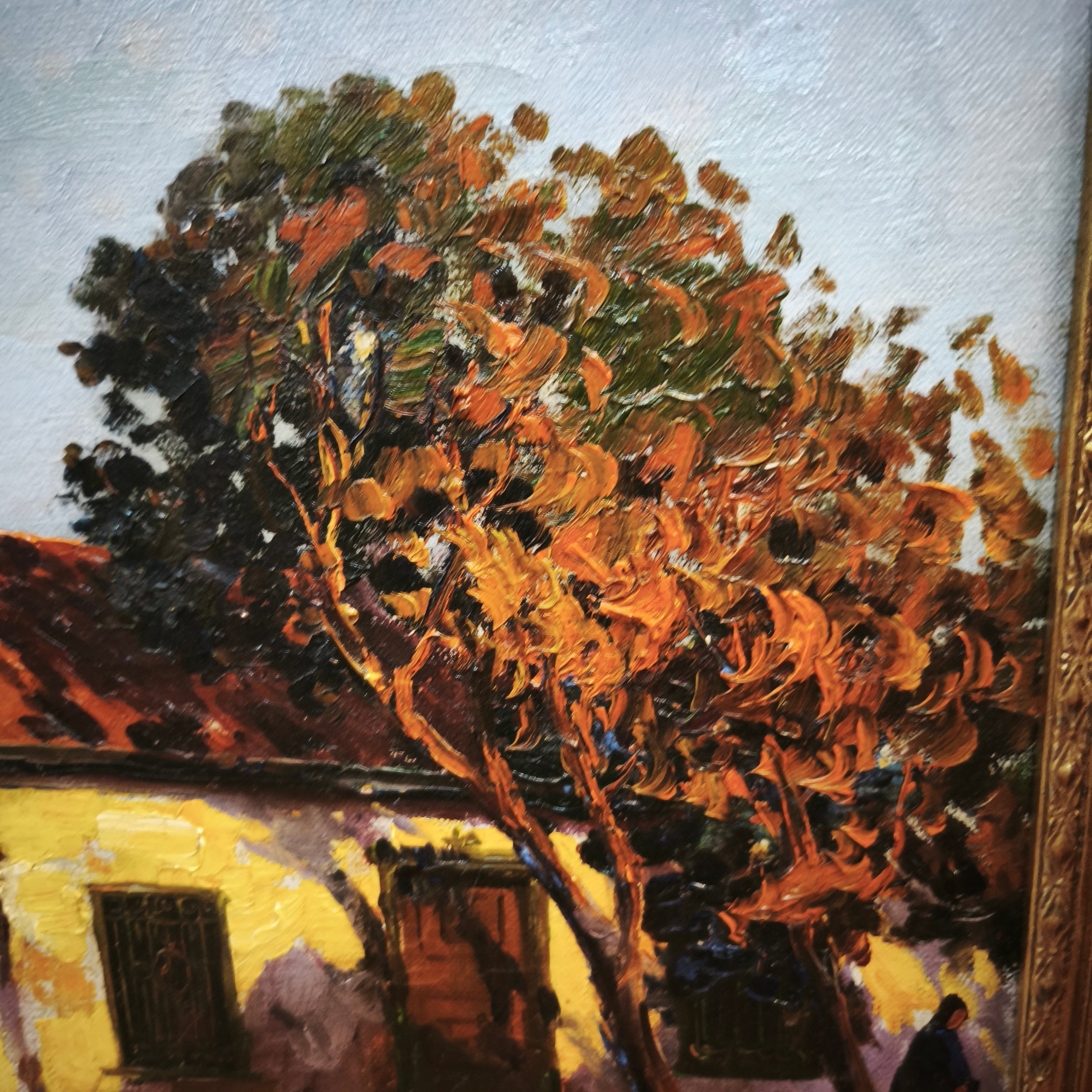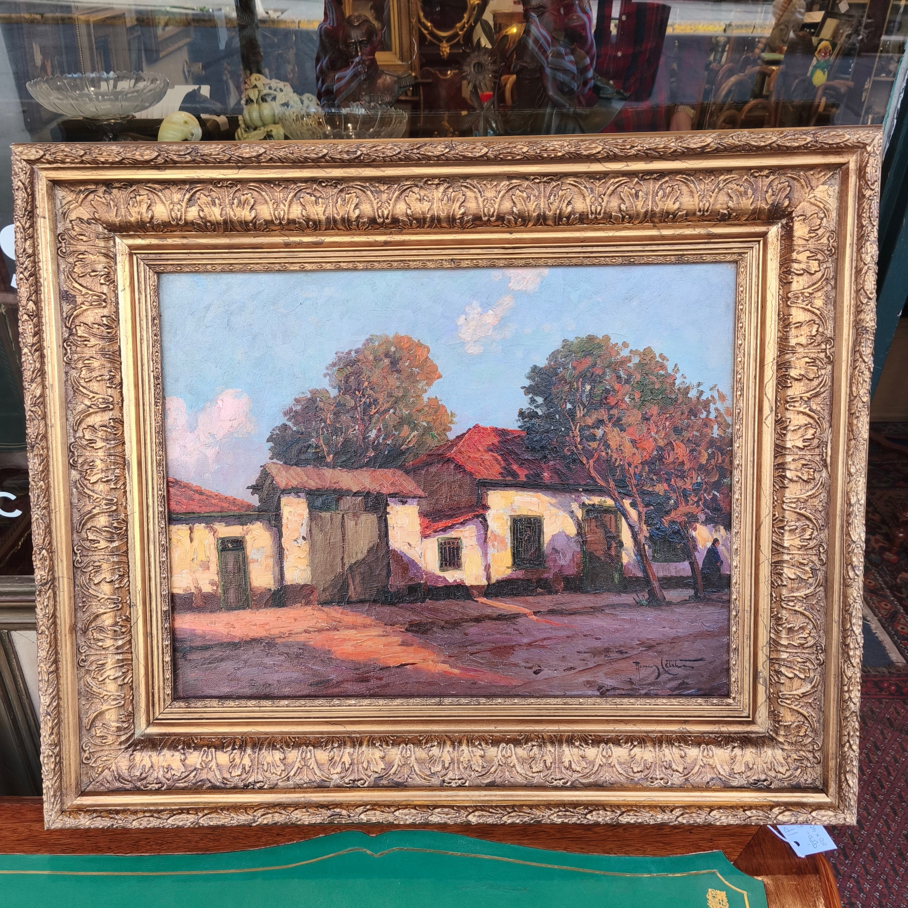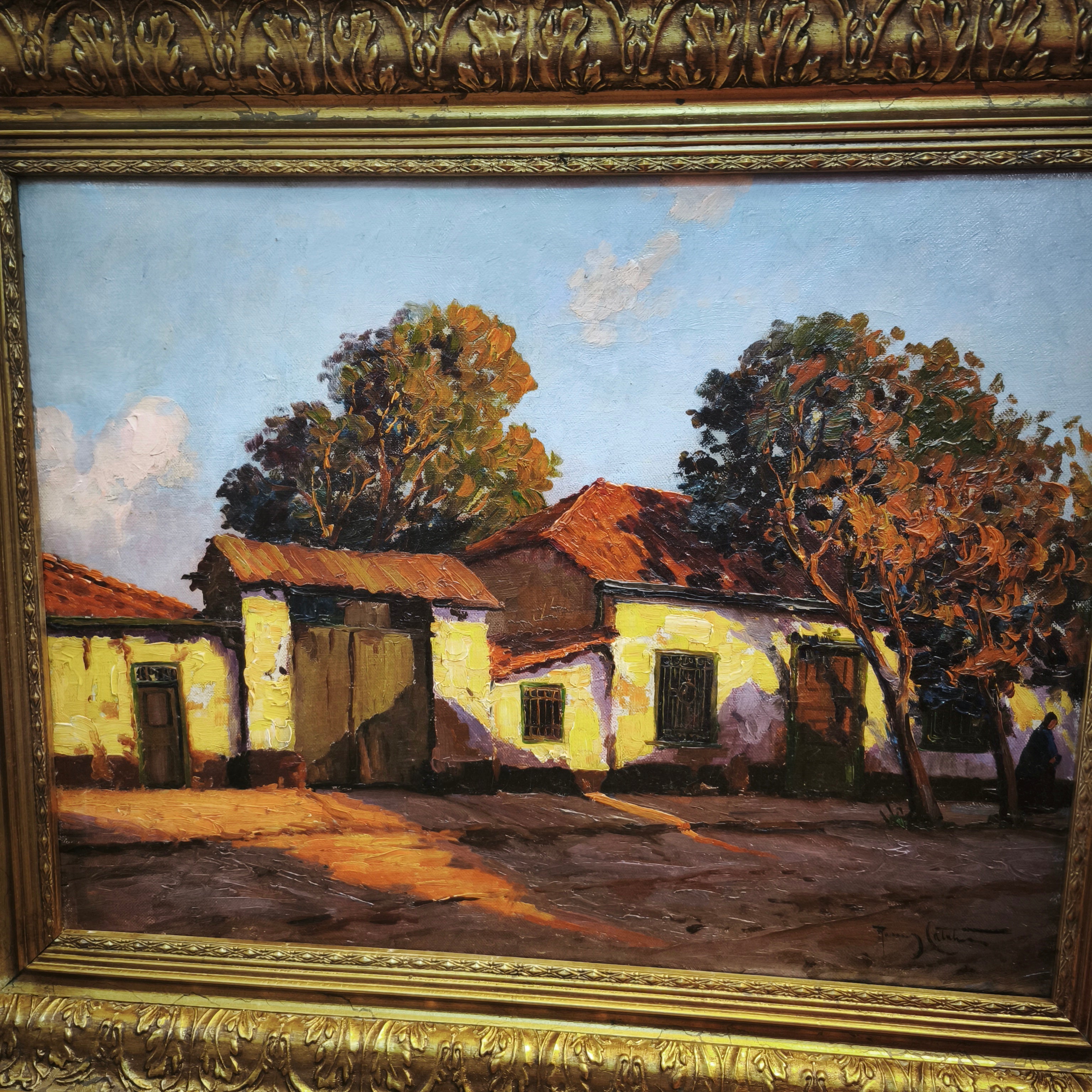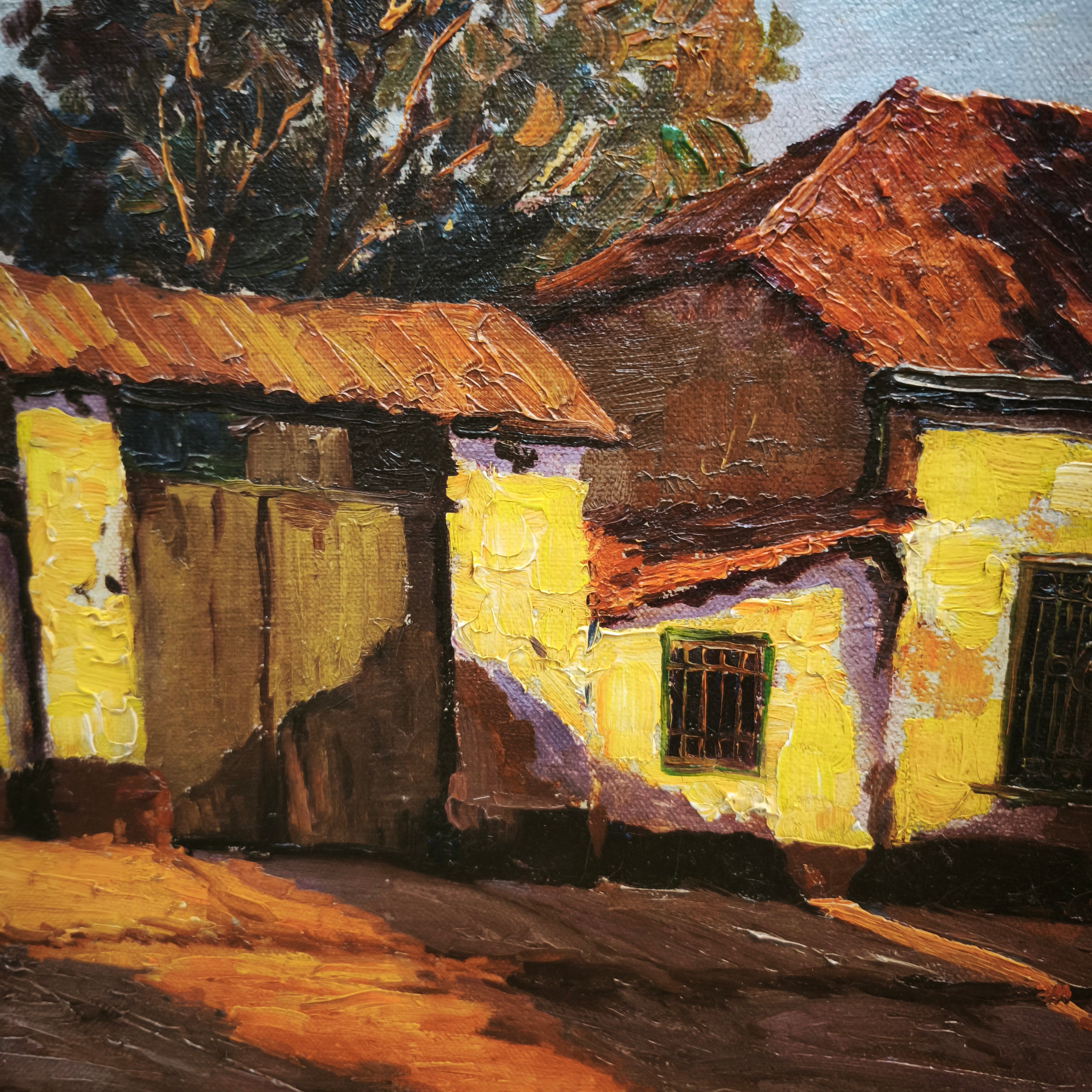 Óleo sobre tela del reconocido artista chileno Benito Ramos Catalán, representando con detalle y calidez la fachada de una casa sencilla, la calle en la que se encuentra, algunos árboles iluminados por la luz naranja del atardecer y un personaje femenino vestido de negro en la esquina inferior derecha. Todos los elementos son representados con trazos cargados de expresión, dándole mucha textura al cuadro. La obra está enmarcada en madera tallada de relieves y pintada de un elegante dorado.
