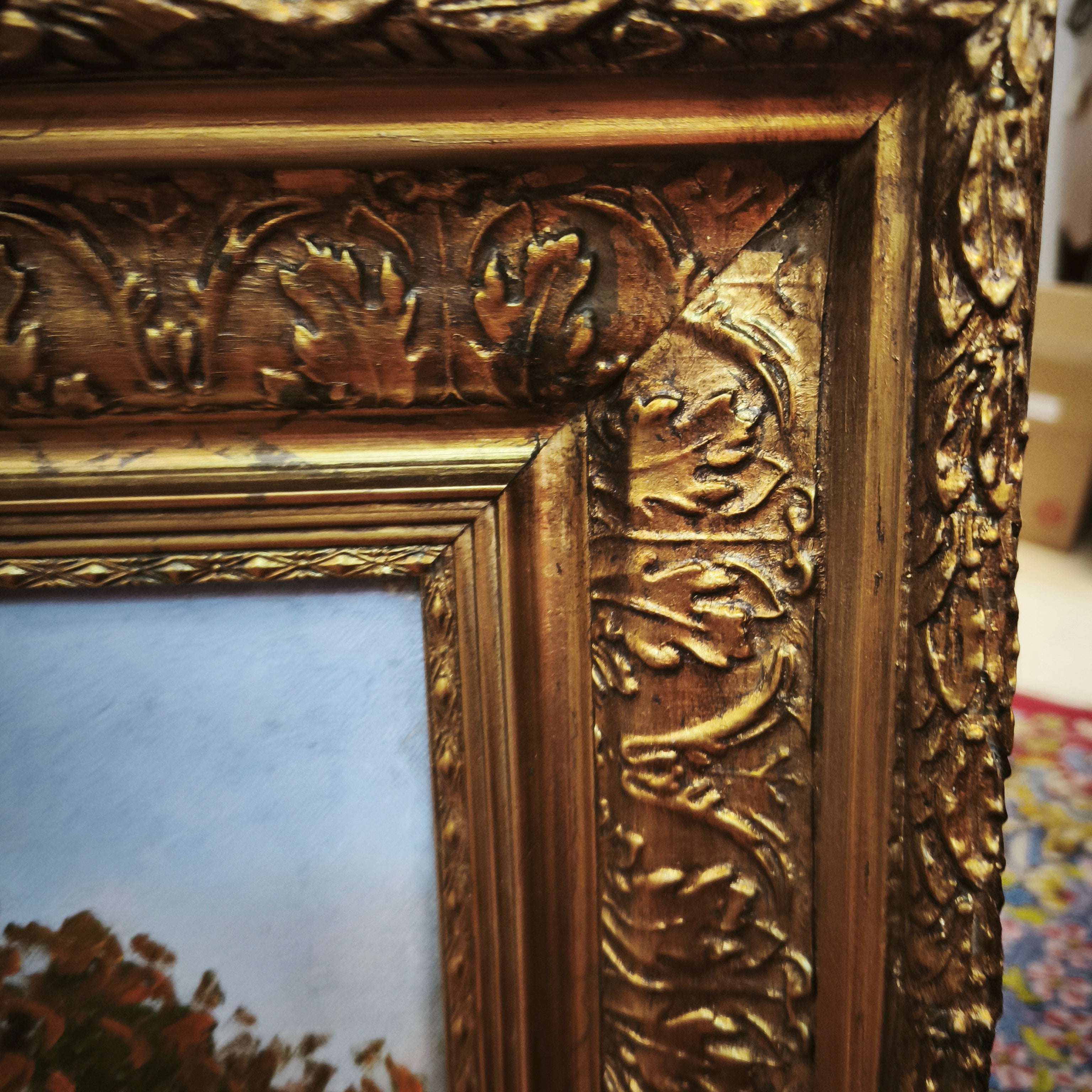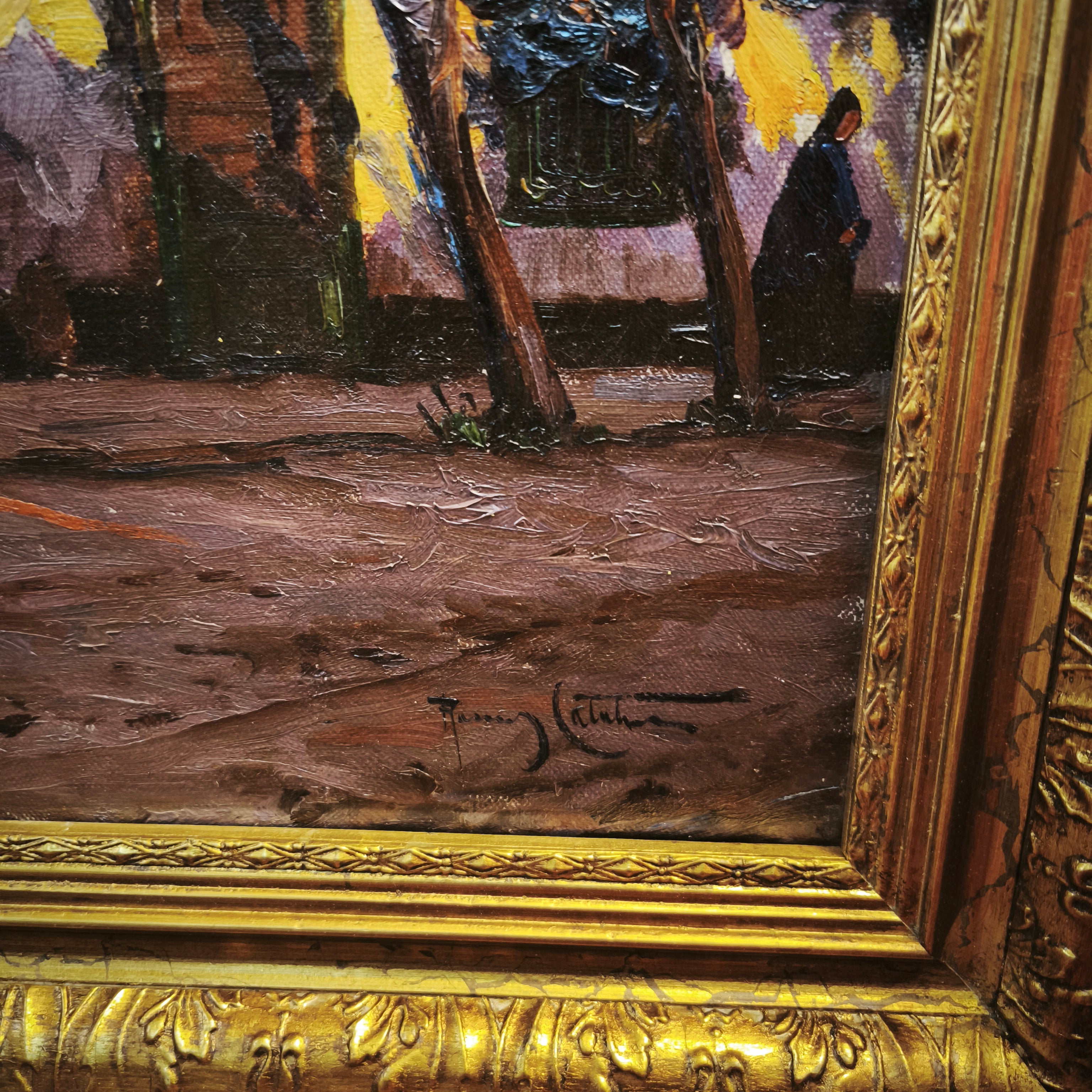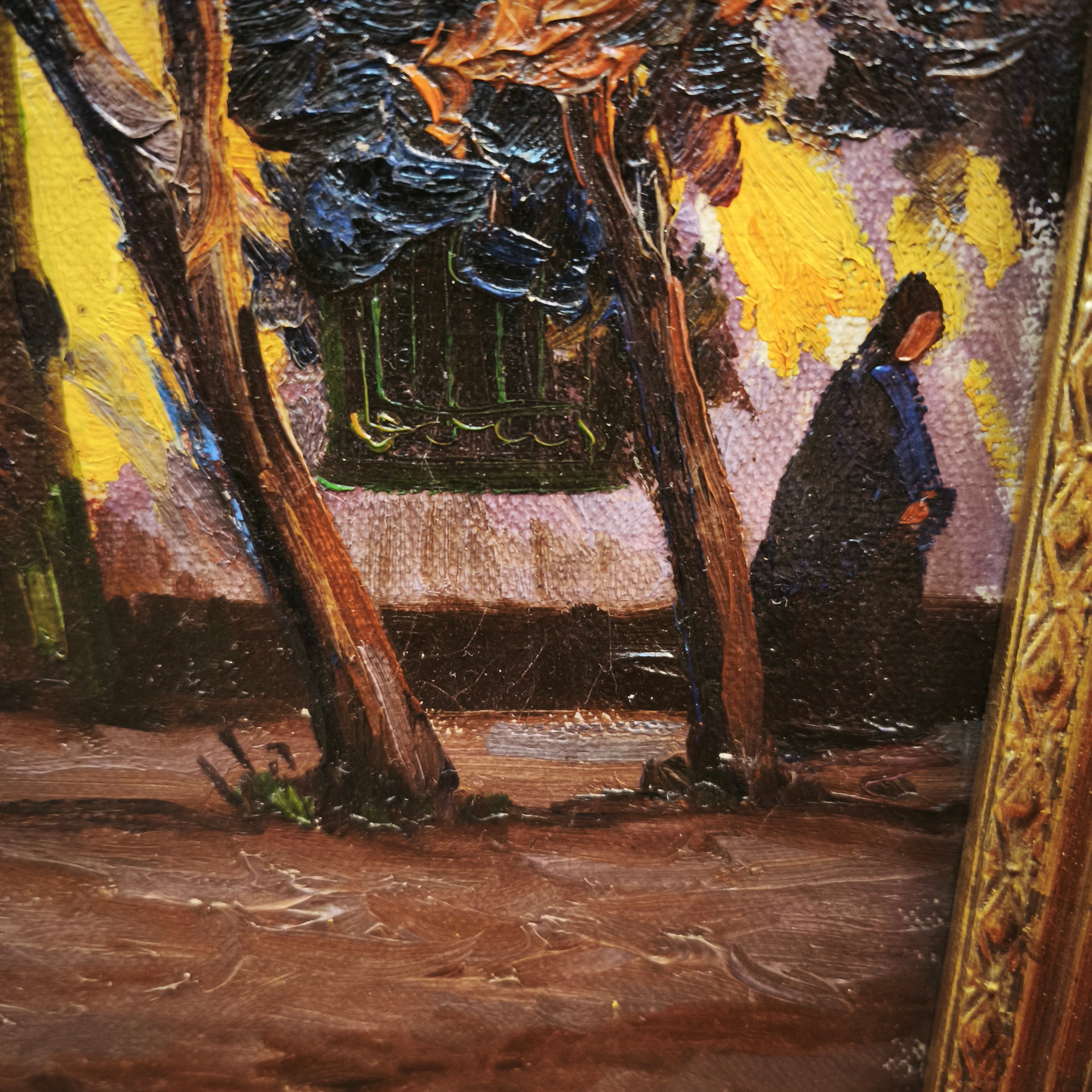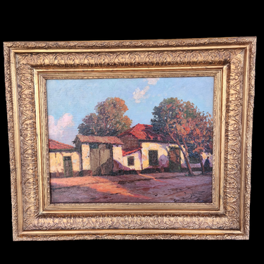 Óleo sobre tela del reconocido artista chileno Benito Ramos Catalán, representando con detalle y calidez la fachada de una casa sencilla, la calle en la que se encuentra, algunos árboles iluminados por la luz naranja del atardecer y un personaje femenino vestido de negro en la esquina inferior derecha. Todos los elementos son representados con trazos cargados de expresión, dándole mucha textura al cuadro. La obra está enmarcada en madera tallada de relieves y pintada de un elegante dorado.