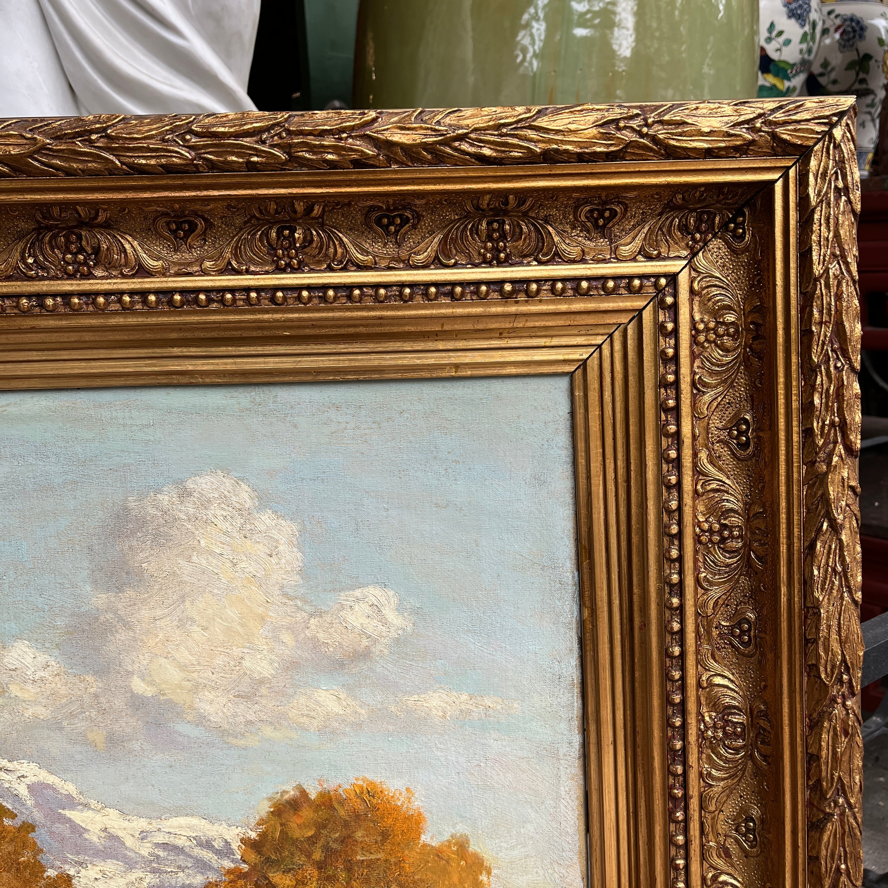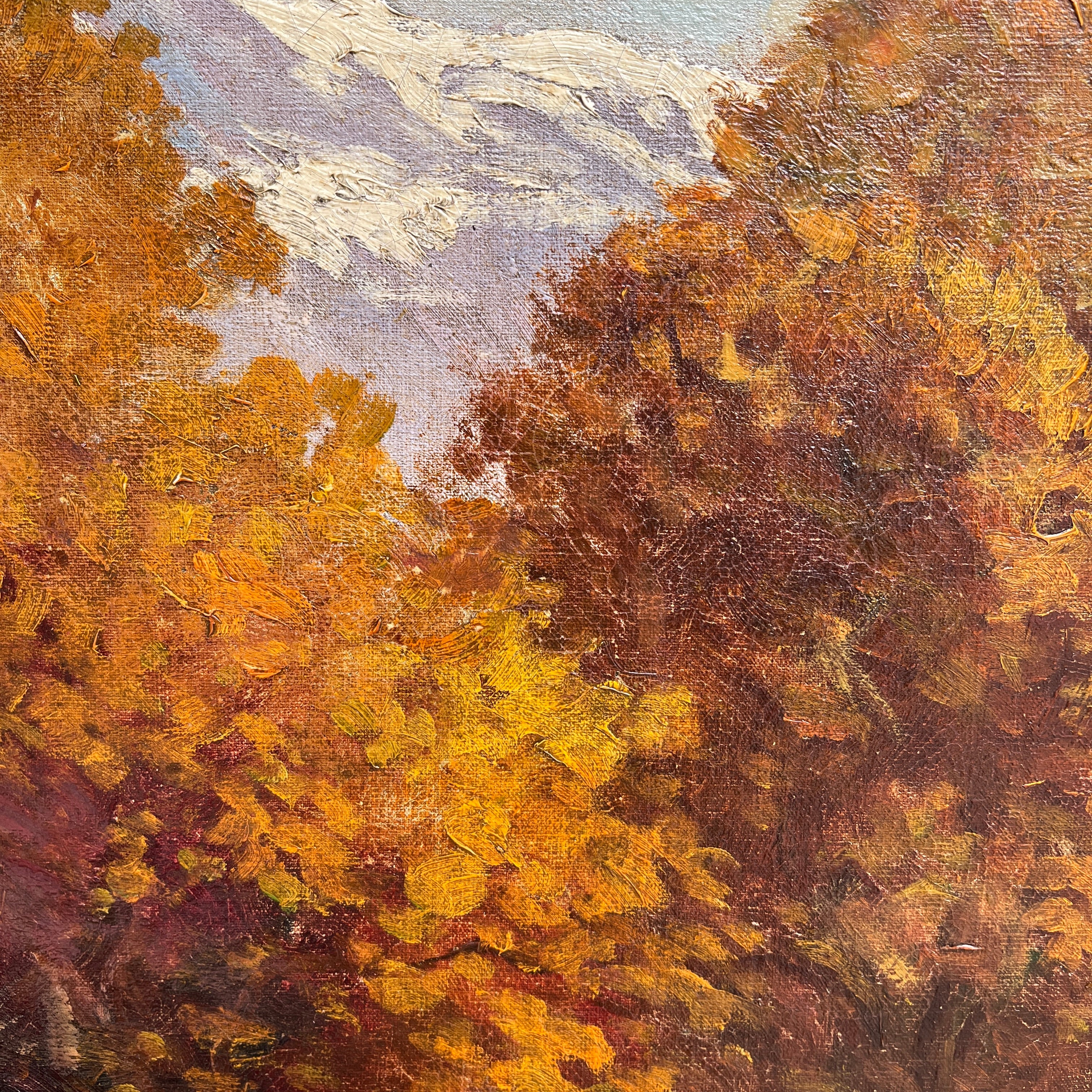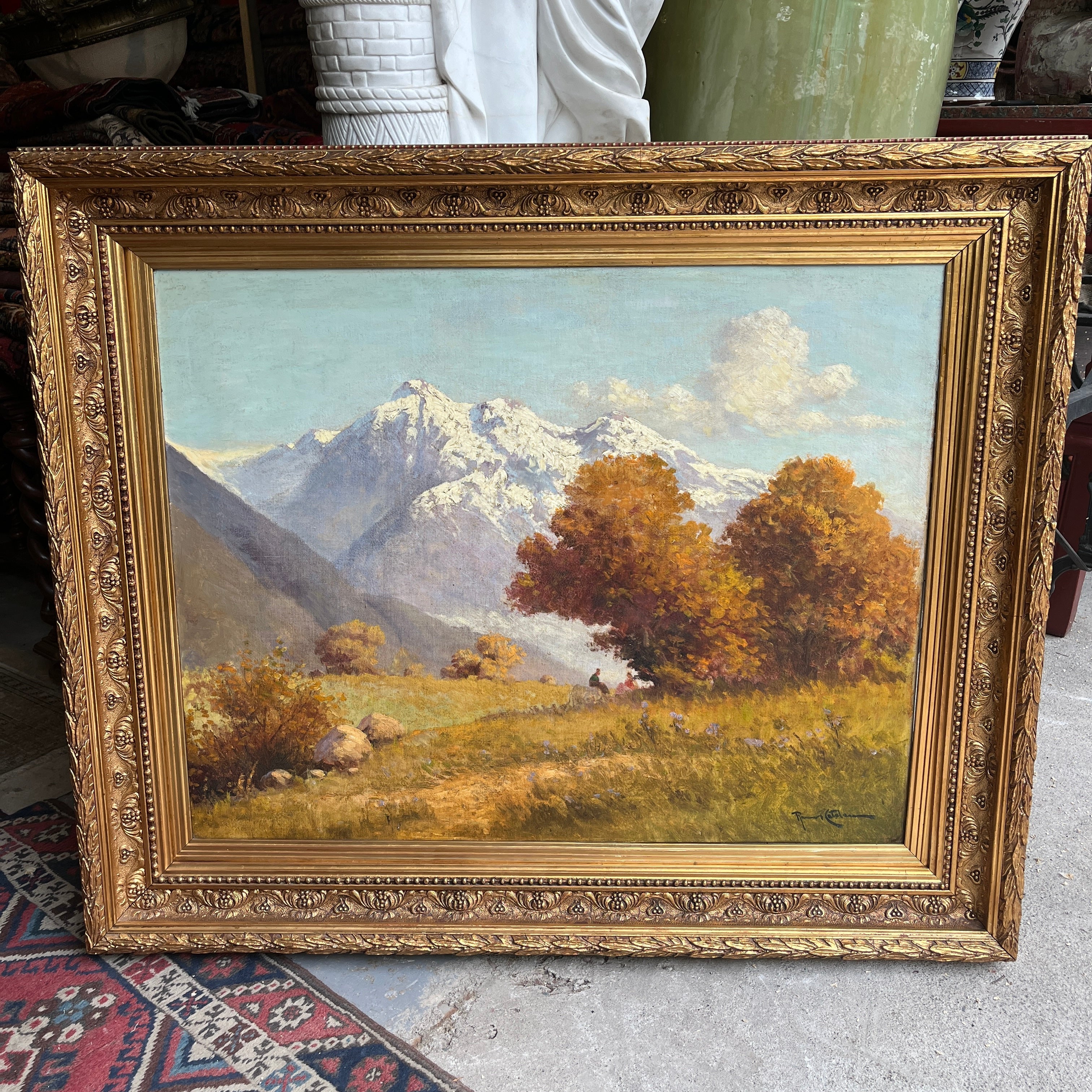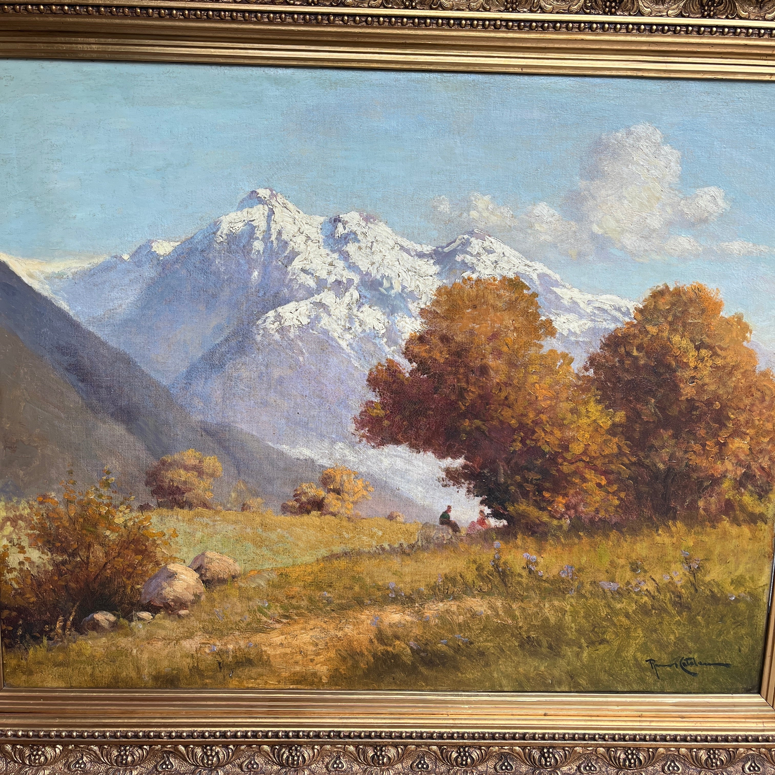Óleo sobre tela del reconocido artista chileno Benito Ramos Catalán, representando un majestuoso paisaje otoñal, cargado de naranjo y texturas en el pasto y follaje, con la imponente cordillera de fondo. Al centro, a lo lejos, una pareja se sienta en medio de la naturaleza, haciendo notar la dimensión del paisaje. La obra está enmarcada en un elegante marco de madera tallada en relieves y terminada en dorado.