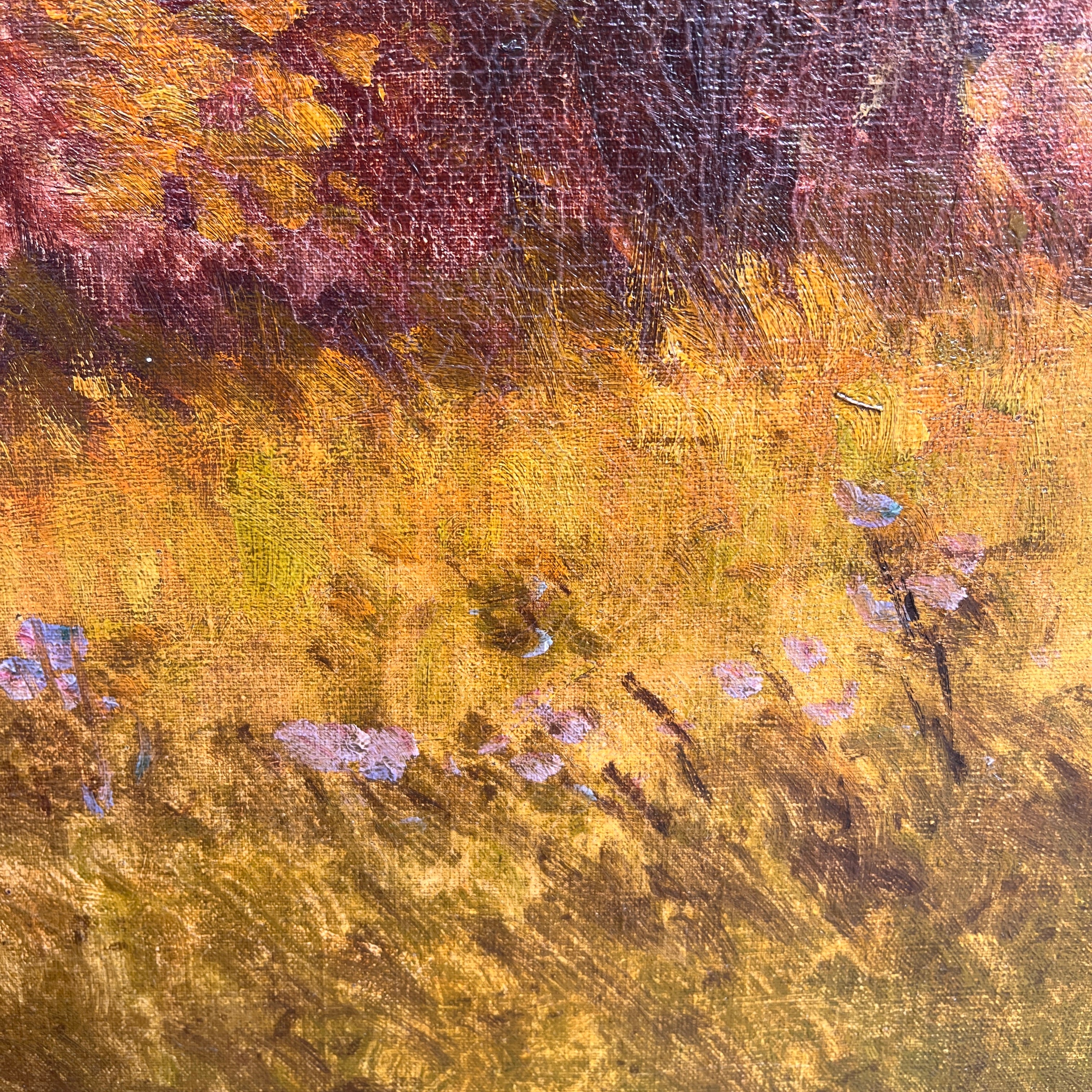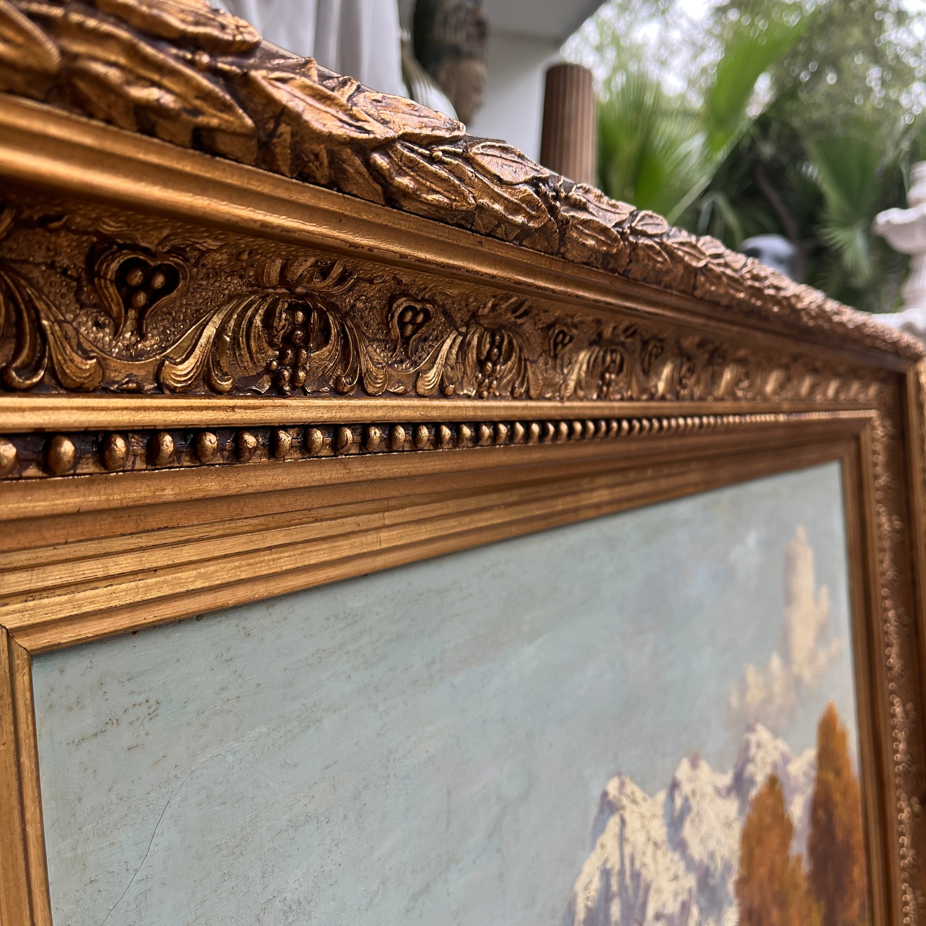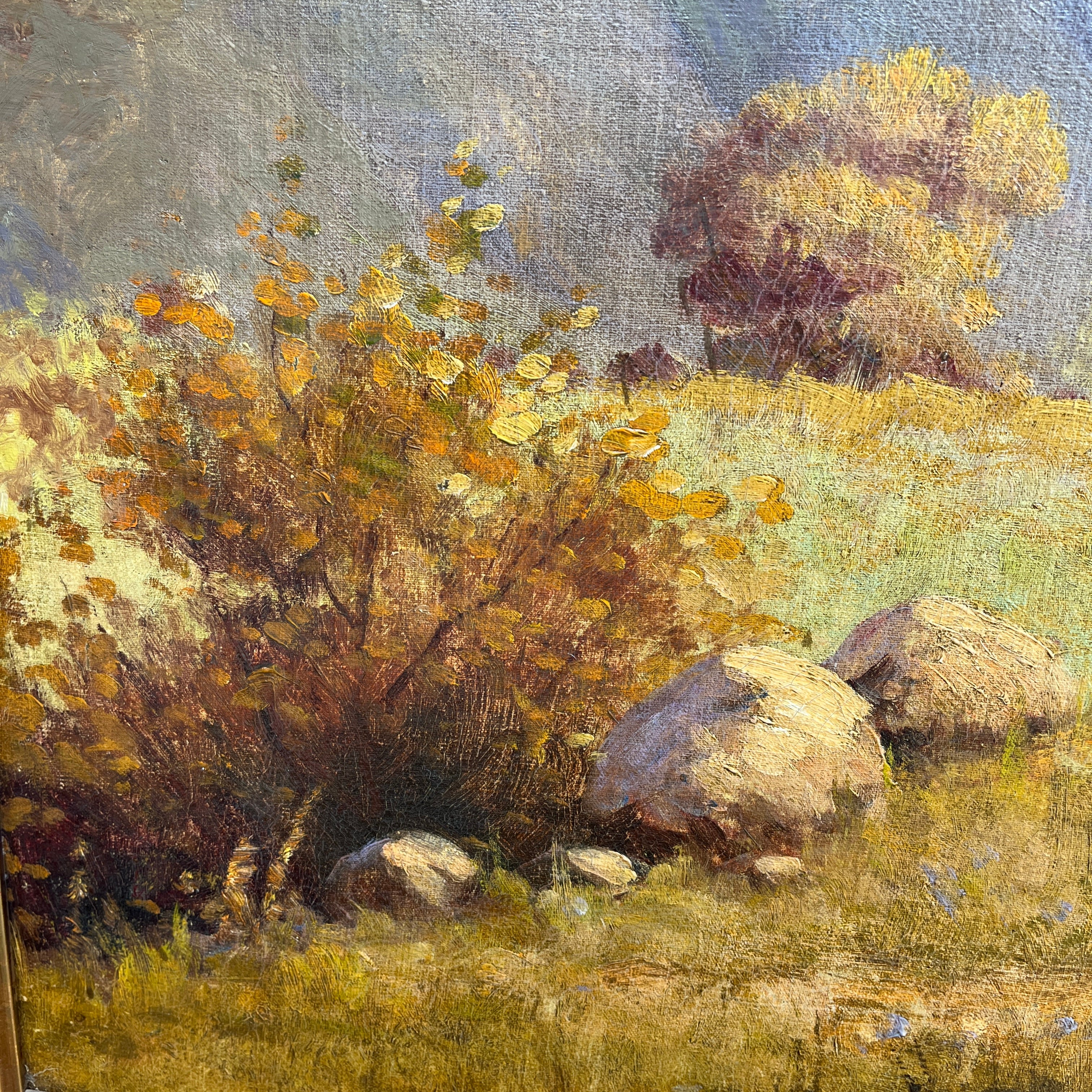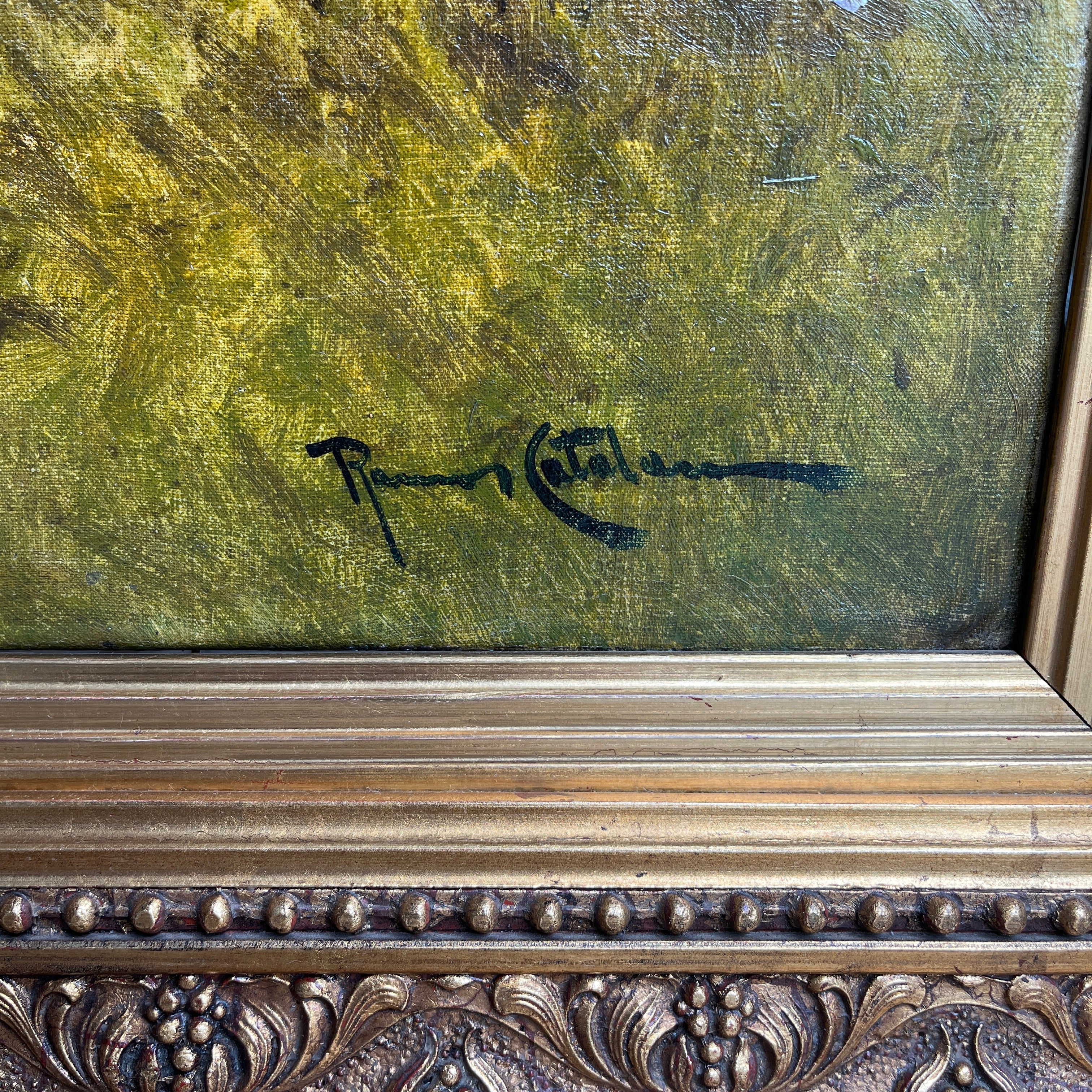 Óleo sobre tela del reconocido artista chileno Benito Ramos Catalán, representando un majestuoso paisaje otoñal, cargado de naranjo y texturas en el pasto y follaje, con la imponente cordillera de fondo. Al centro, a lo lejos, una pareja se sienta en medio de la naturaleza, haciendo notar la dimensión del paisaje. La obra está enmarcada en un elegante marco de madera tallada en relieves y terminada en dorado.