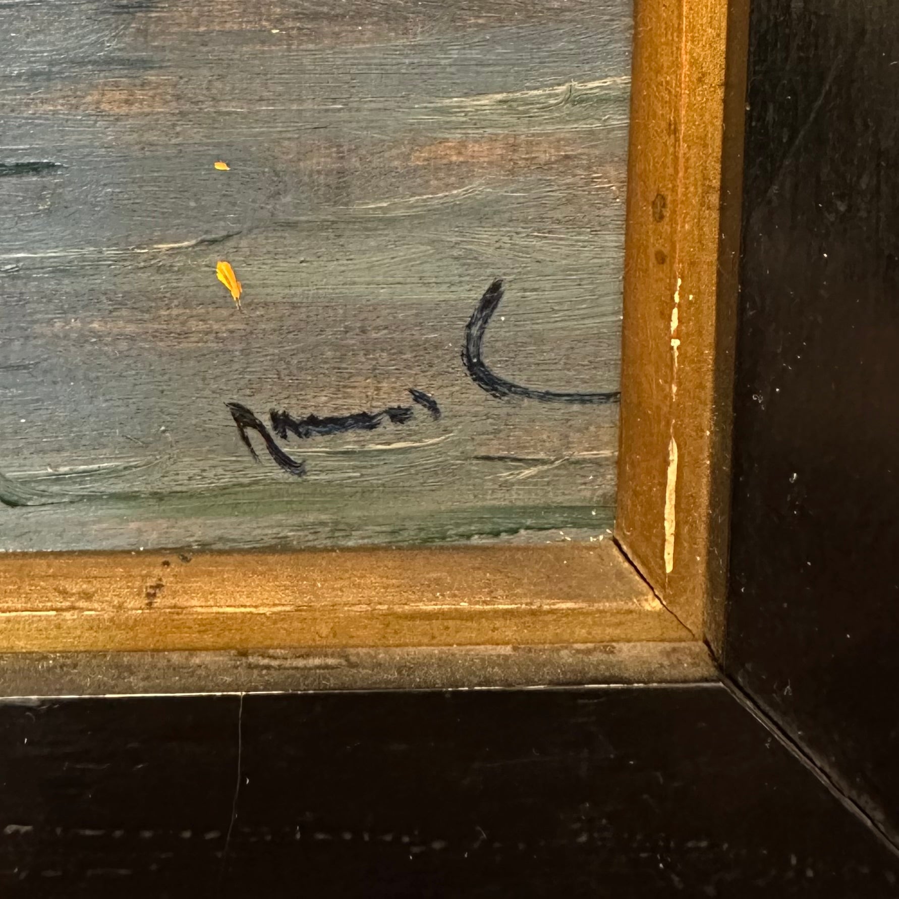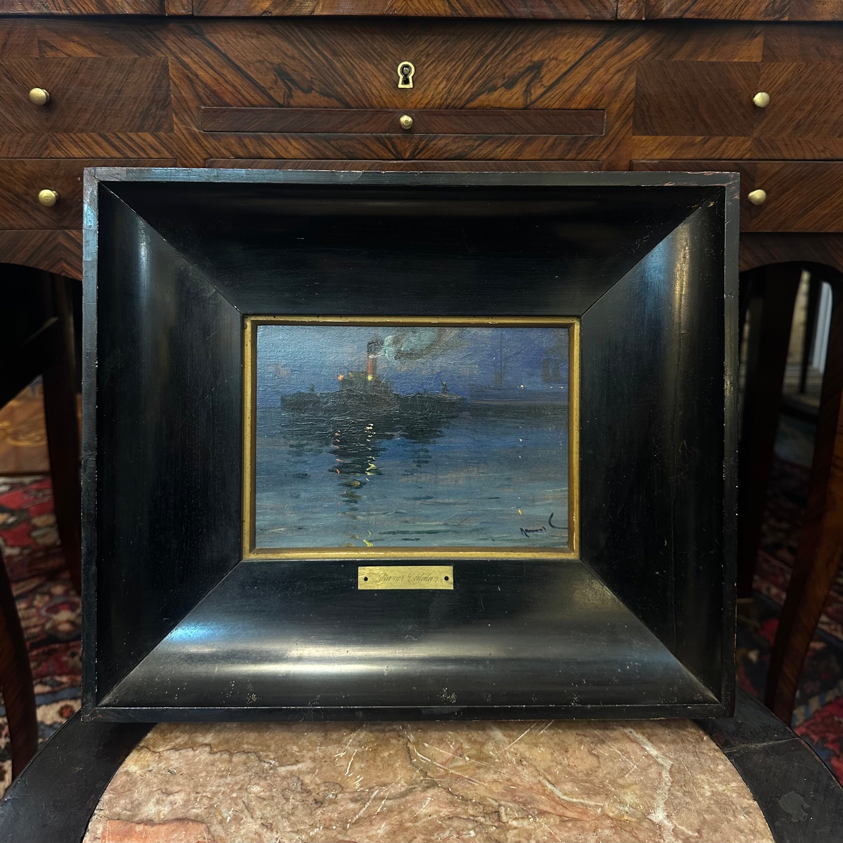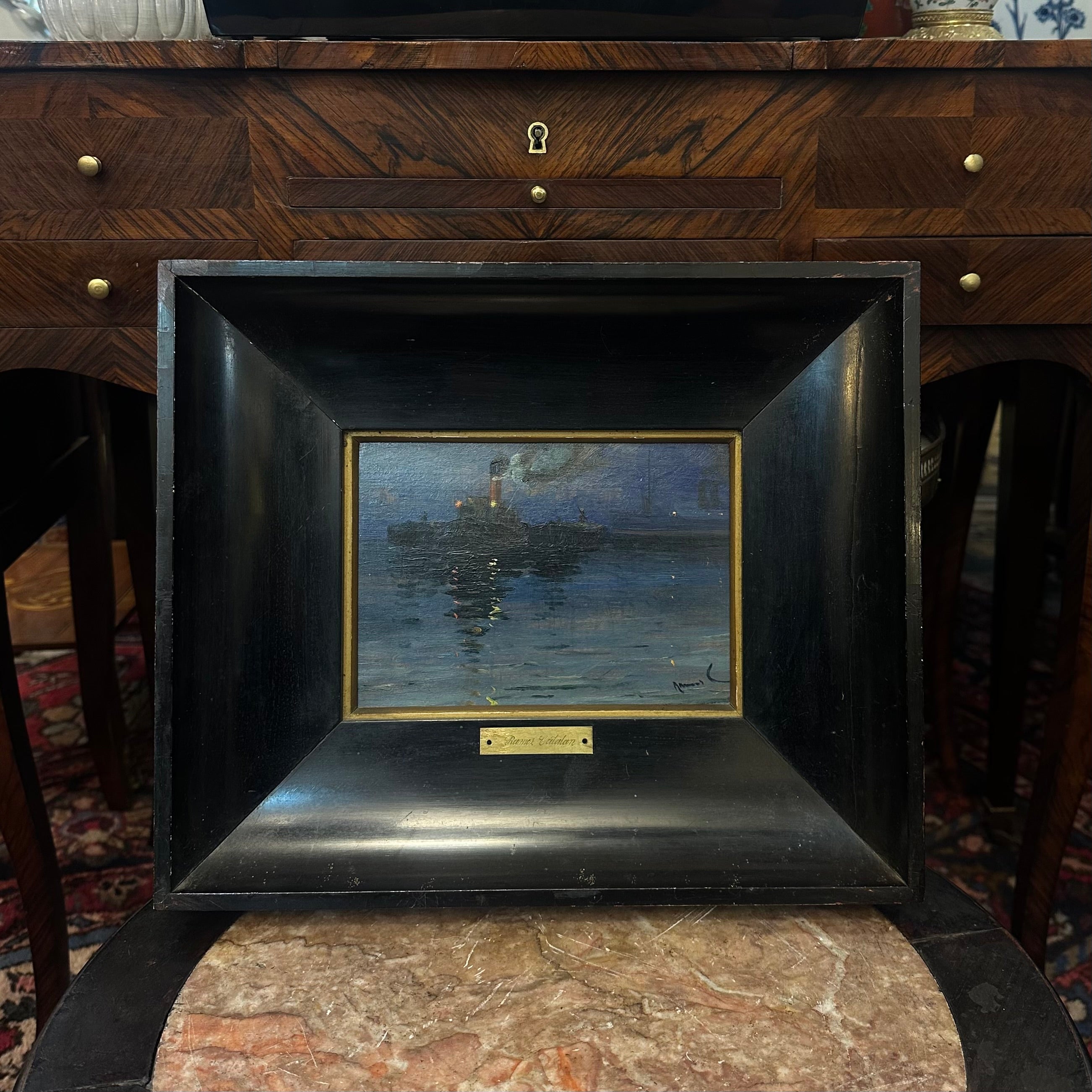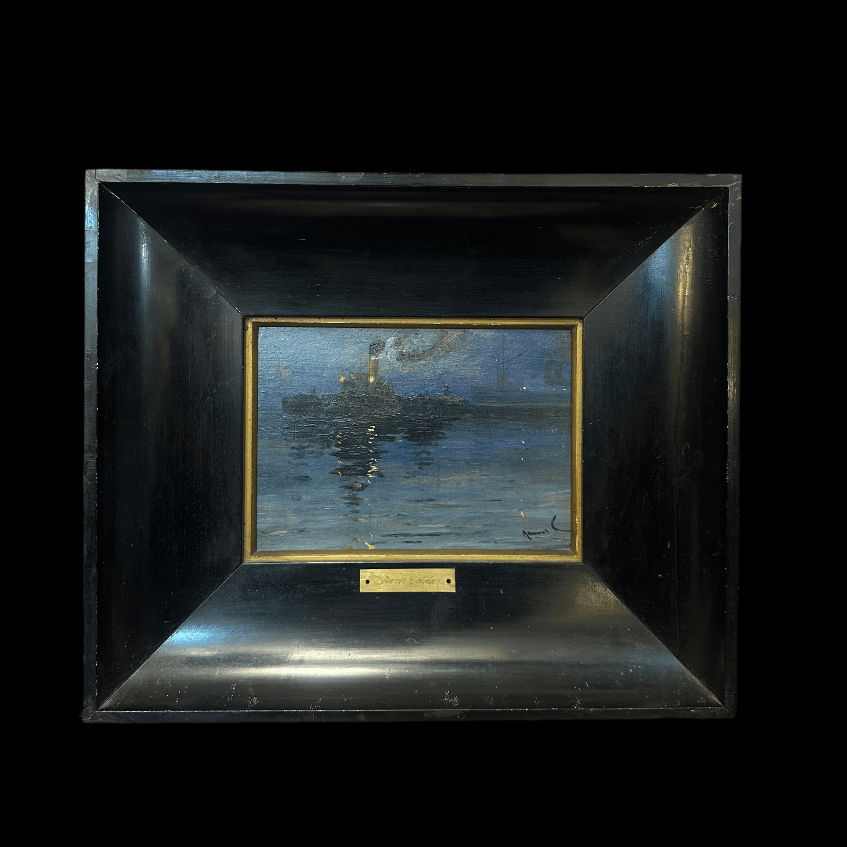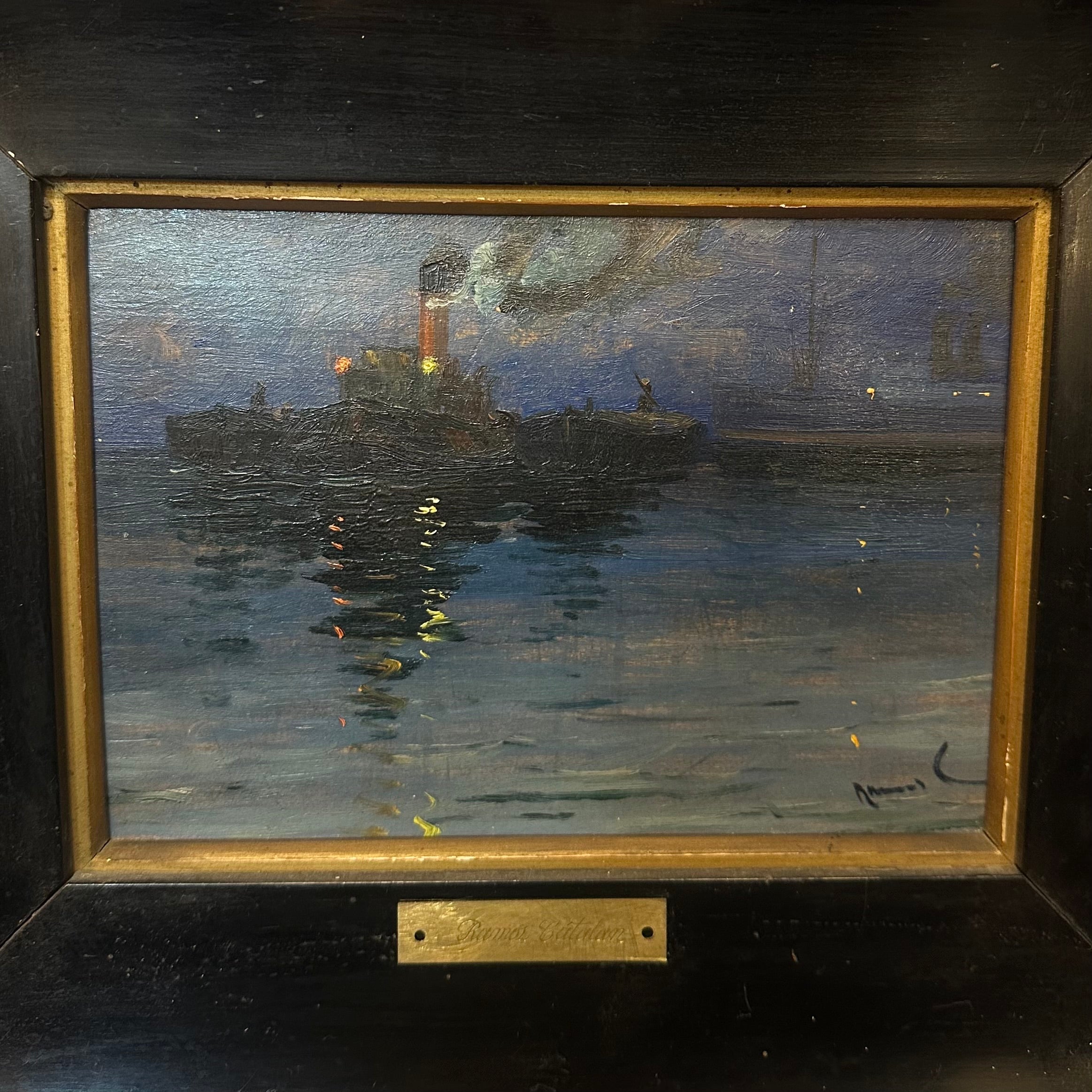 Óleo sobre tela del artista chileno Benito Ramos Catalán. La obra representa un remolcador navegando en alta mar, envuelto en la atmósfera serena de lo que parece ser una noche. Enmarcada en madera pintada en negro con borde dorado, posee una placa con nombre del autor.