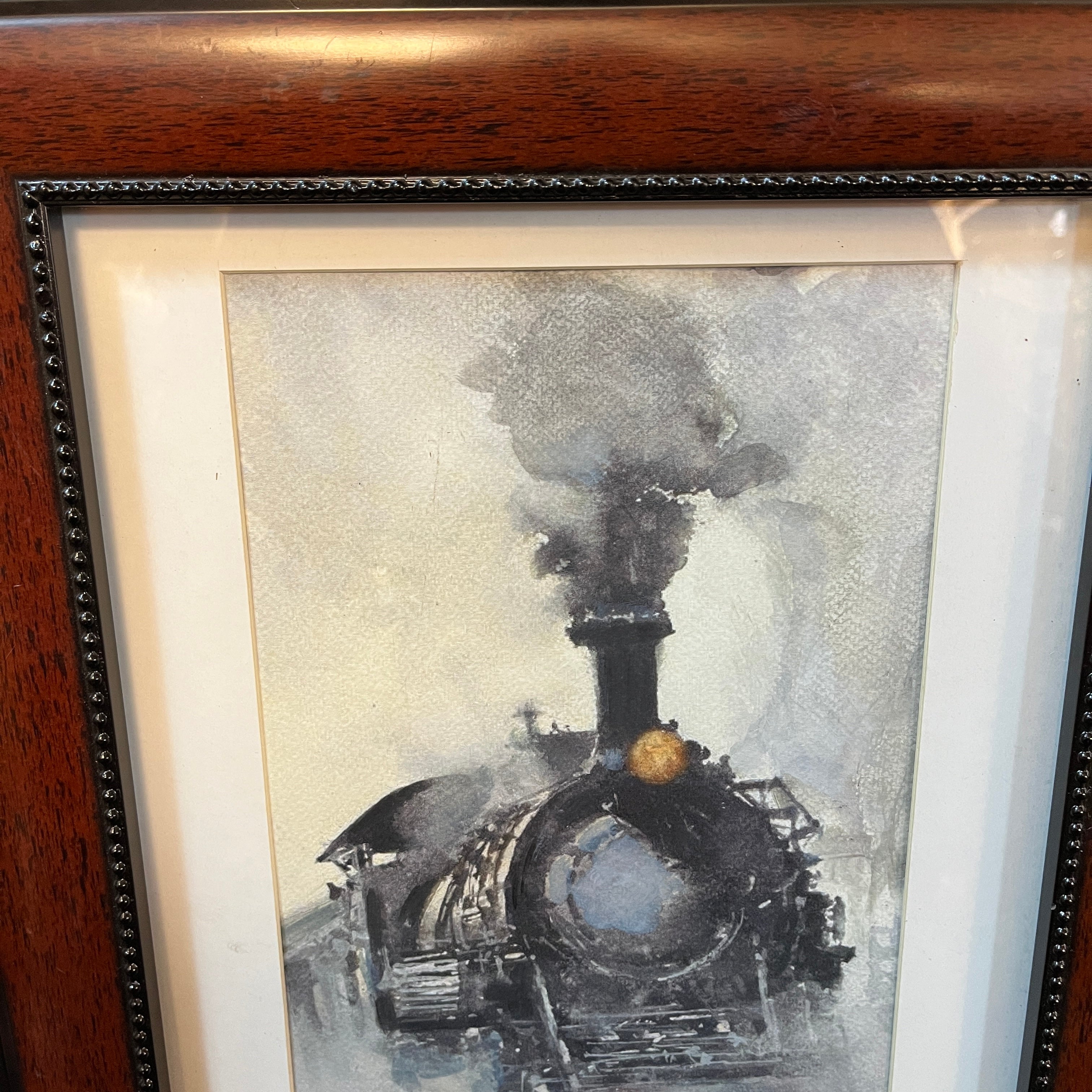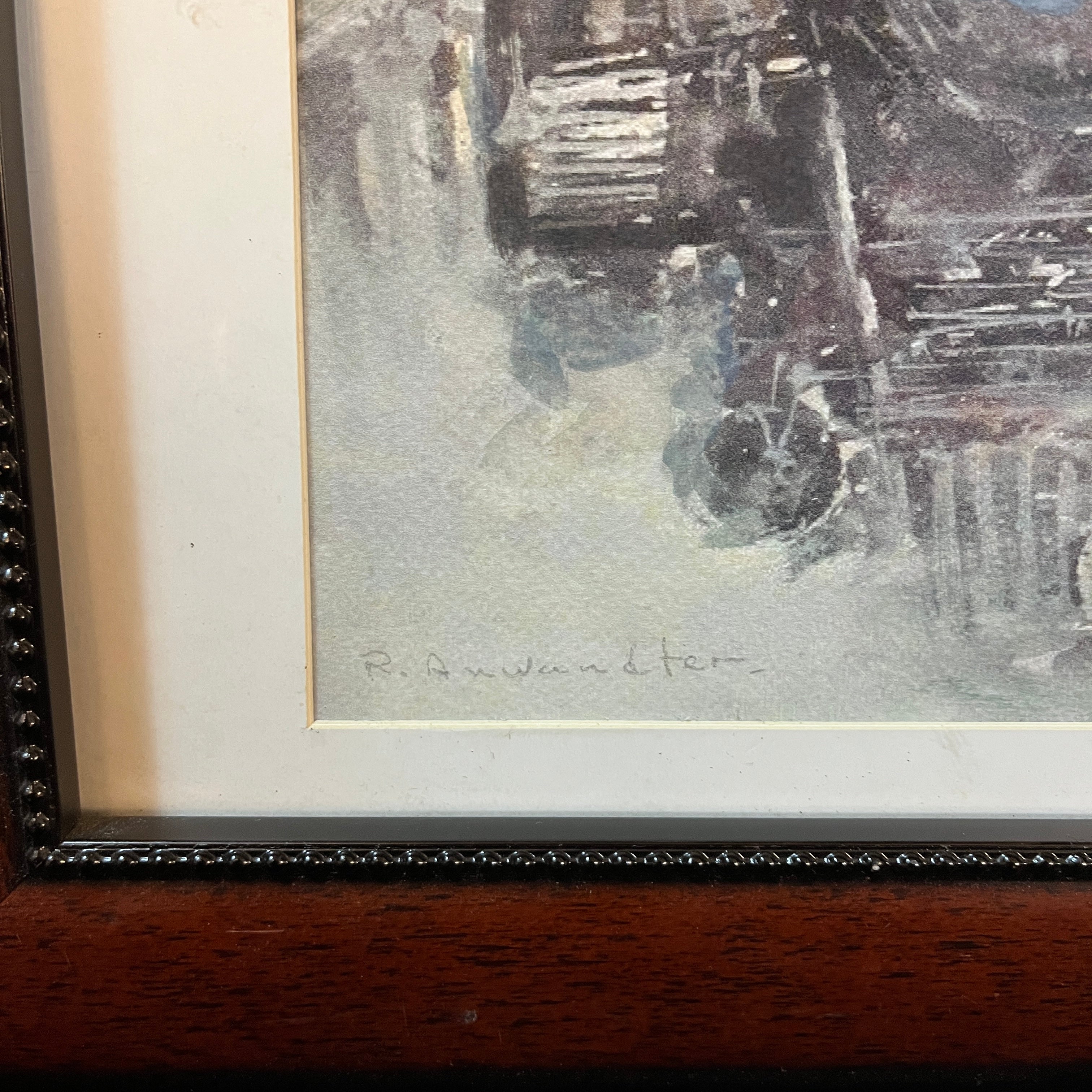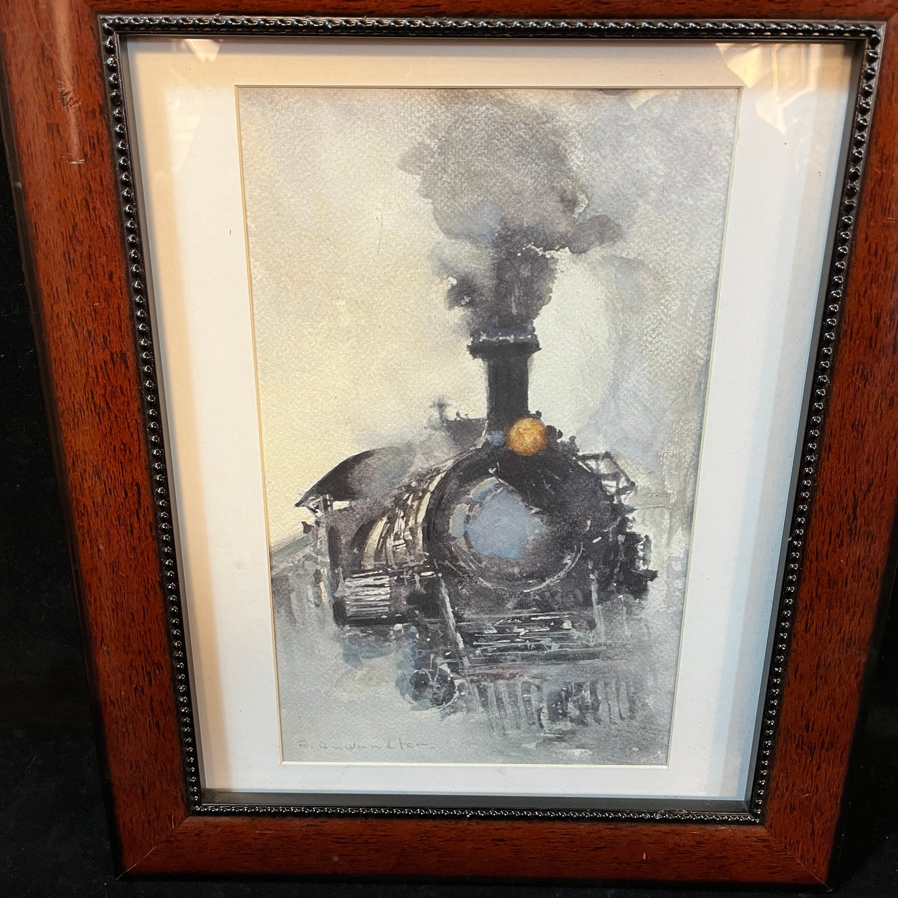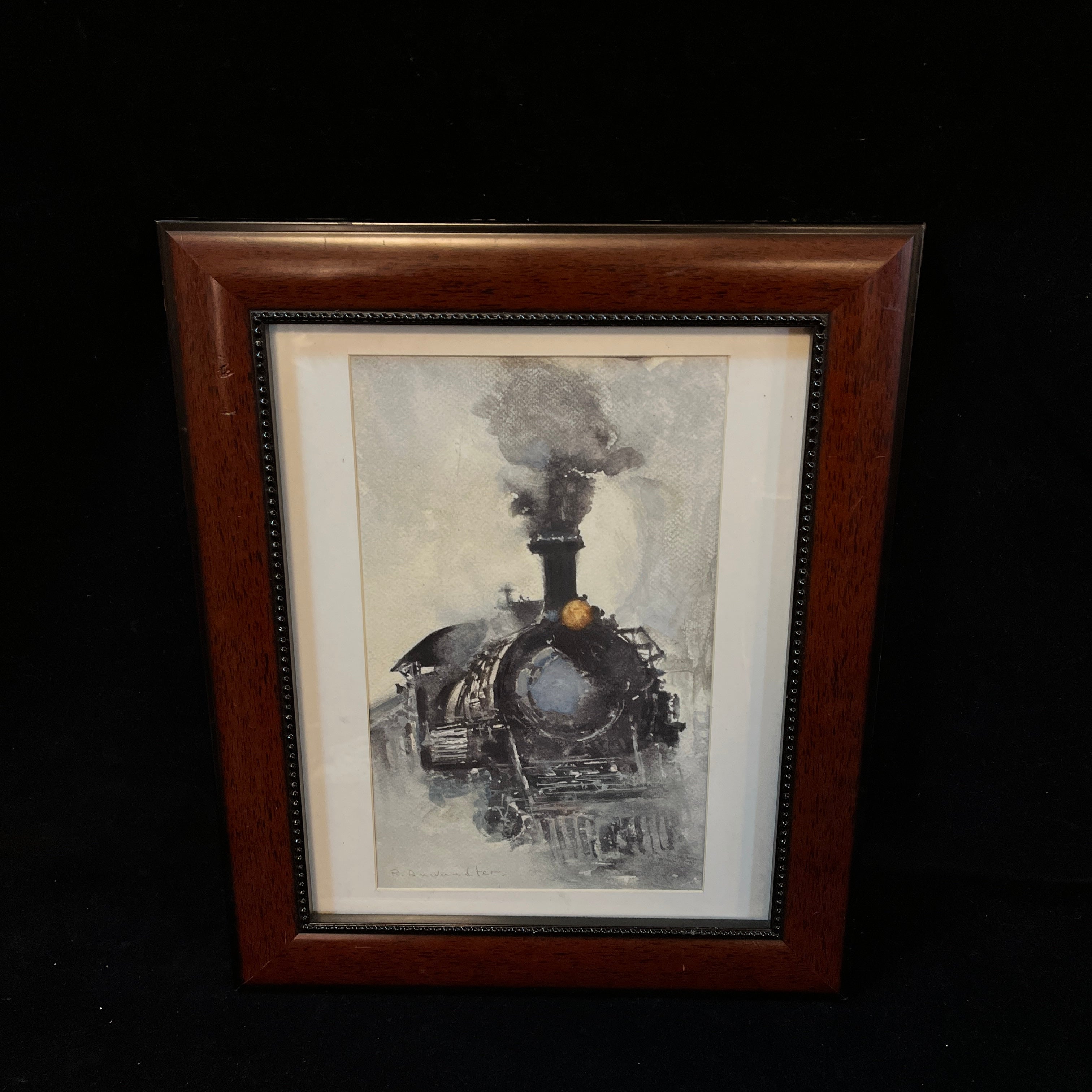 Acuerela del artista de origen chileno, nacido en Valdivia, Ricardo Andwanter (1919-1993). La obrarepresenta la locomotora de un tren a vapor, utilizando la materialidad de la acuarela para generar un efecto difuminado, en tonos negros, grises y azules fríos. La obra tiene un marco de madera, de diseño sobrio y contemporáneo, de color café.