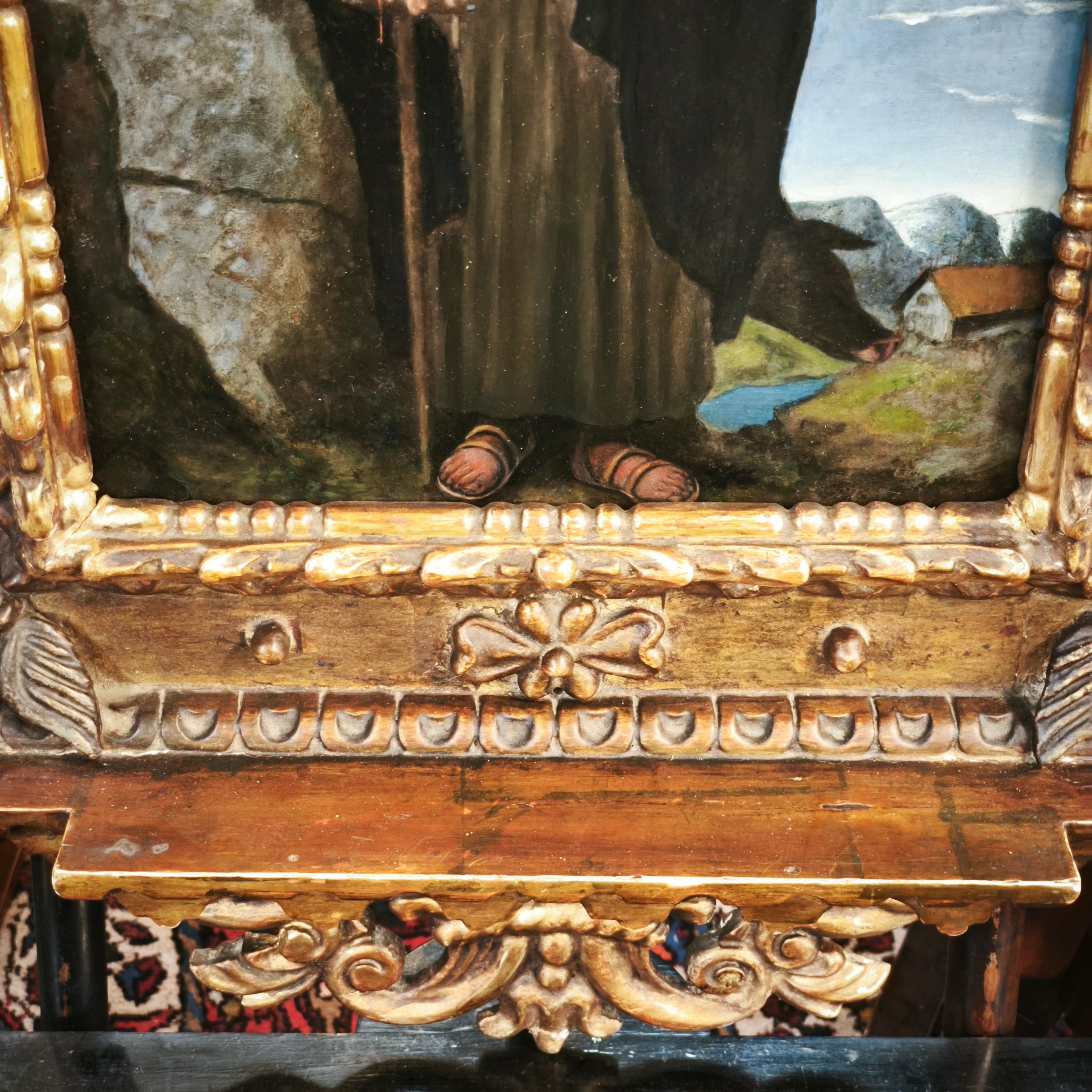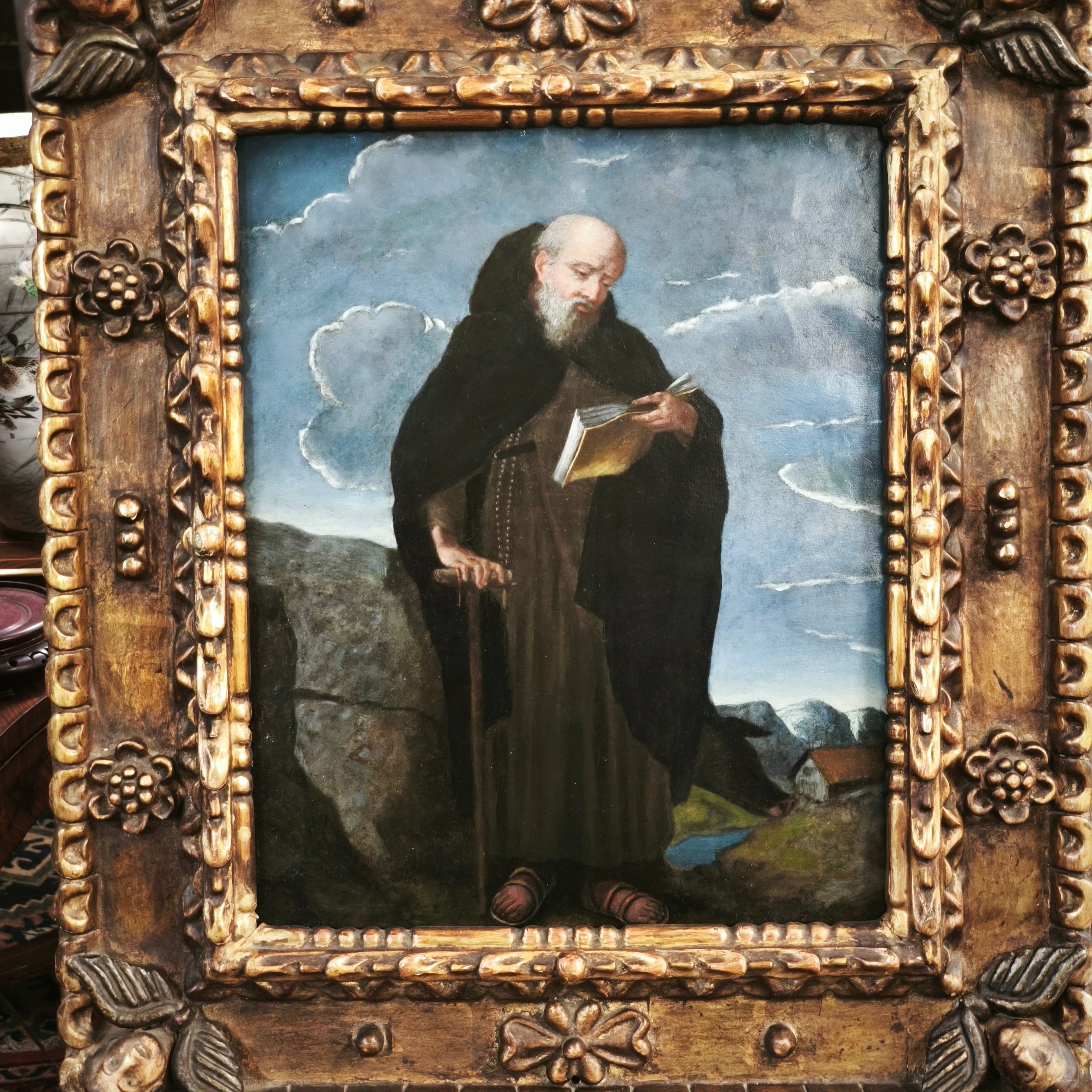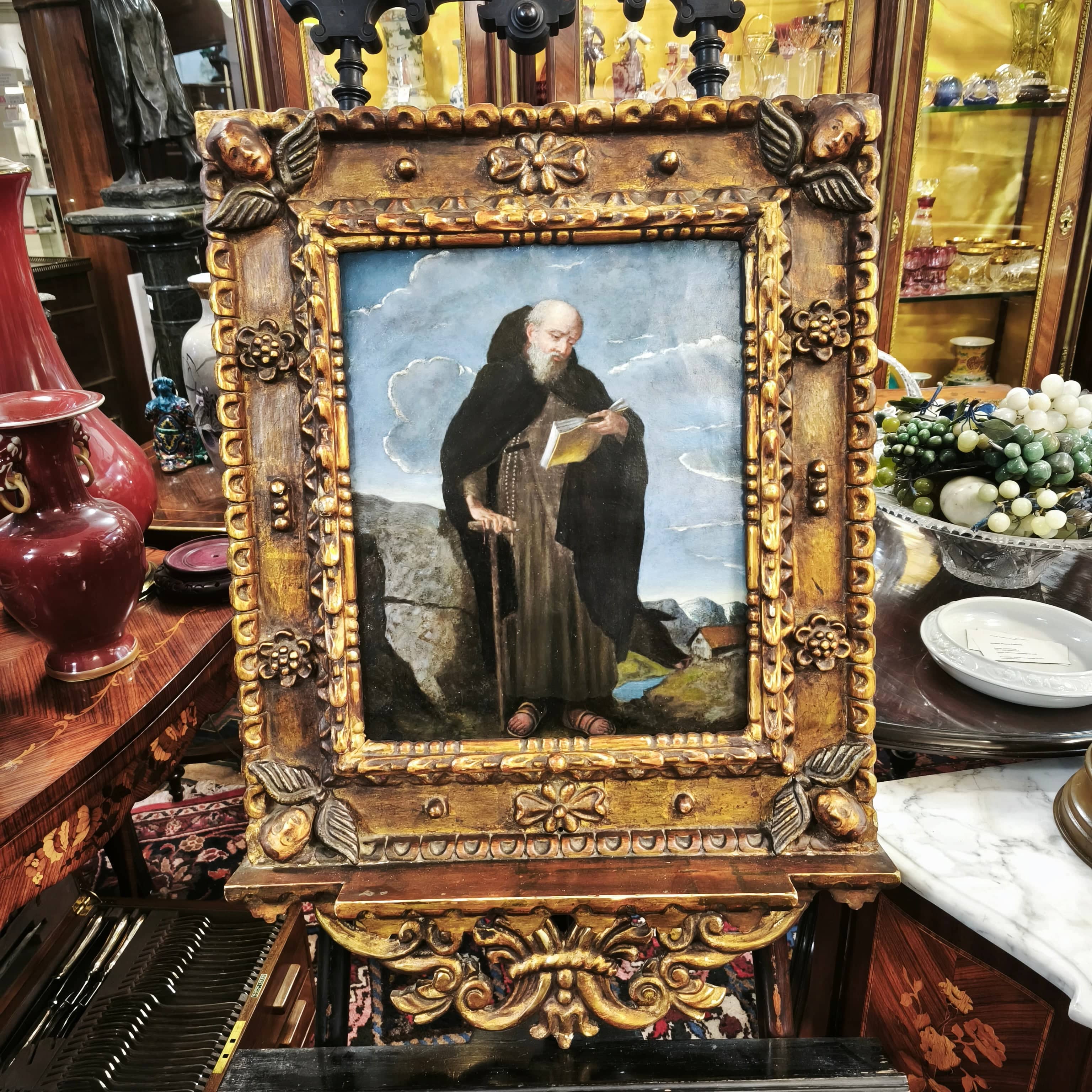 Pintura religiosa del siglo XIX en óleo sobre madera. Retrata a San Benito llevando un libro en una mano y un bastón en la otra en medio de la naturaleza. Tiene un hermoso marco tallado en madera en tonos dorados opacos, con un pequeño soporte en la parte inferior.