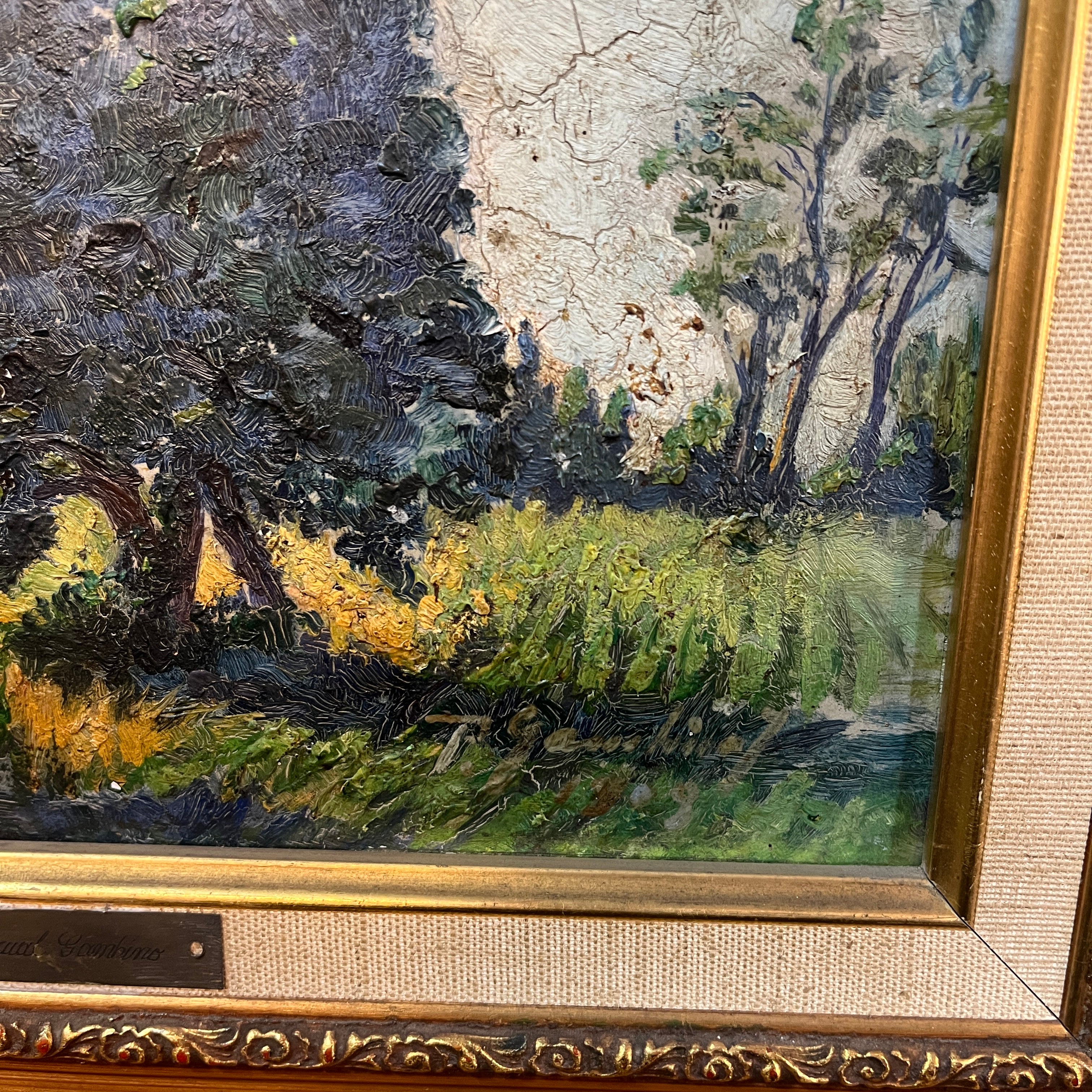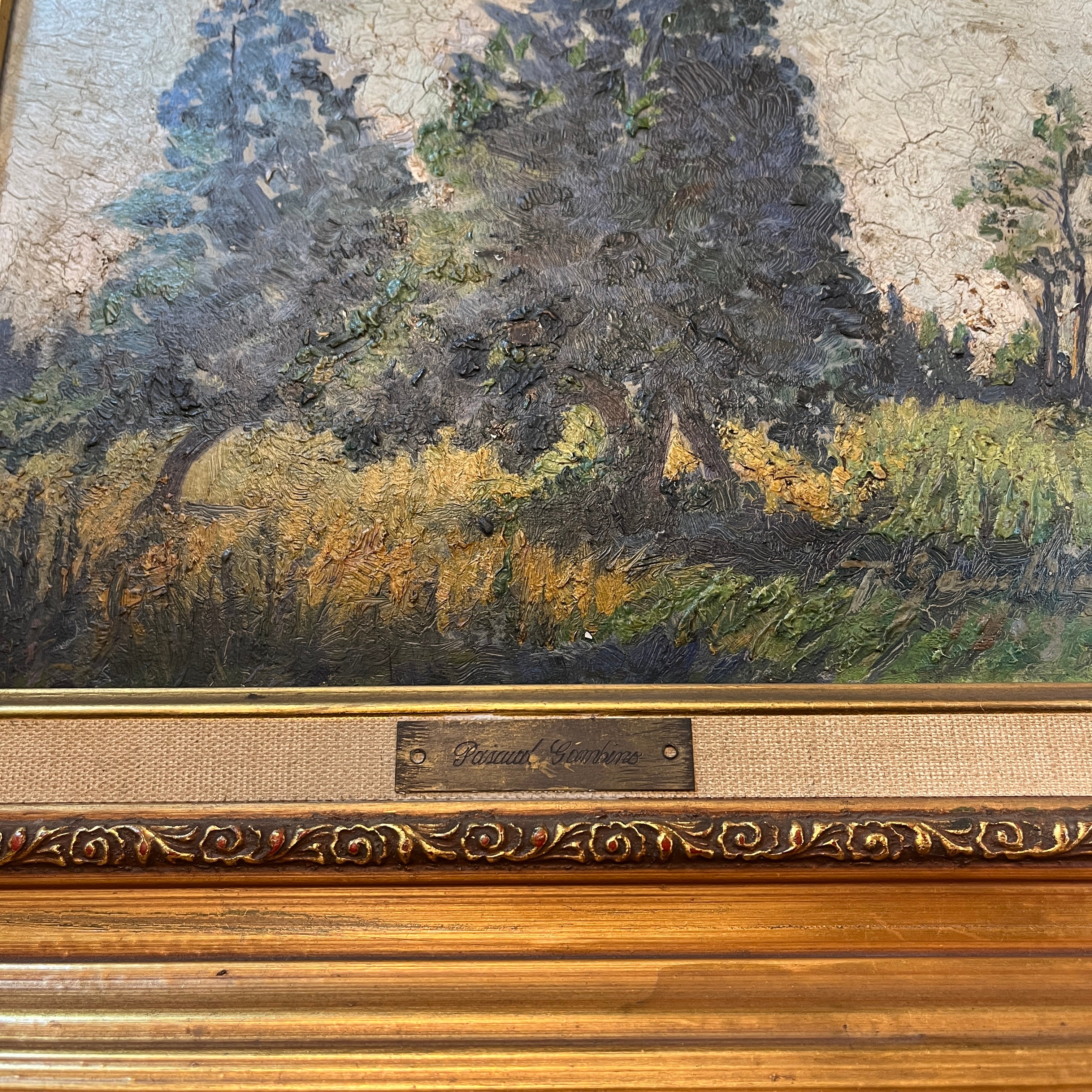 Óleo sobre madera del artista uruguayo radicado en Chile, Pascual Gambino (1981-1994). La obra retrata un sereno paisaje con trazos que realzan las pinceladas y el óleo. La composición tiene como figuras centrales a dos arboles, que tapan la línea del horizonte, sobre un pasto verde y frondoso. La obra está enarcada en madera sobria, con un bello borde interno de fibra y decorado de cintillo terminado en dorado. Además, el marco tiene una inscripción con el nombre del artista.