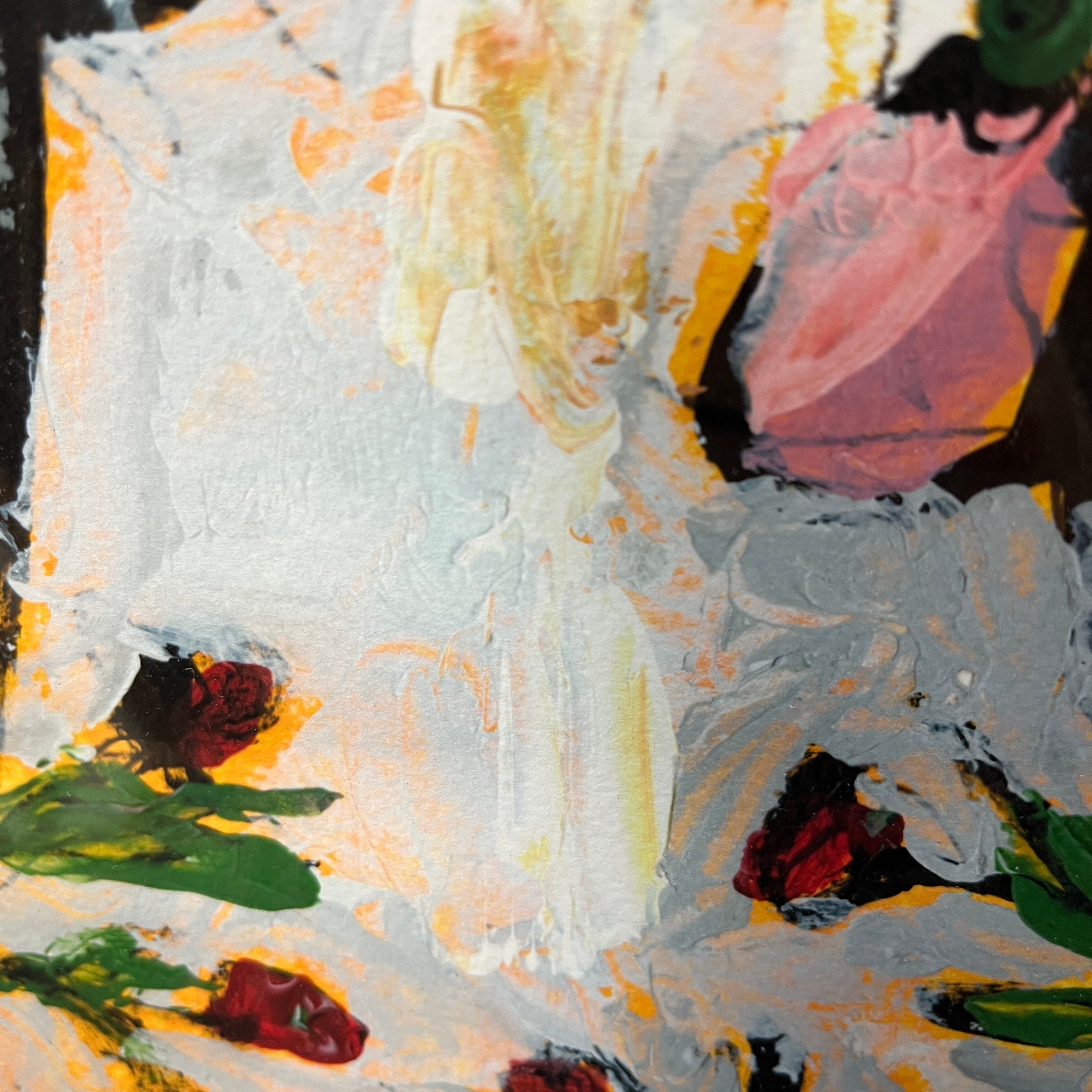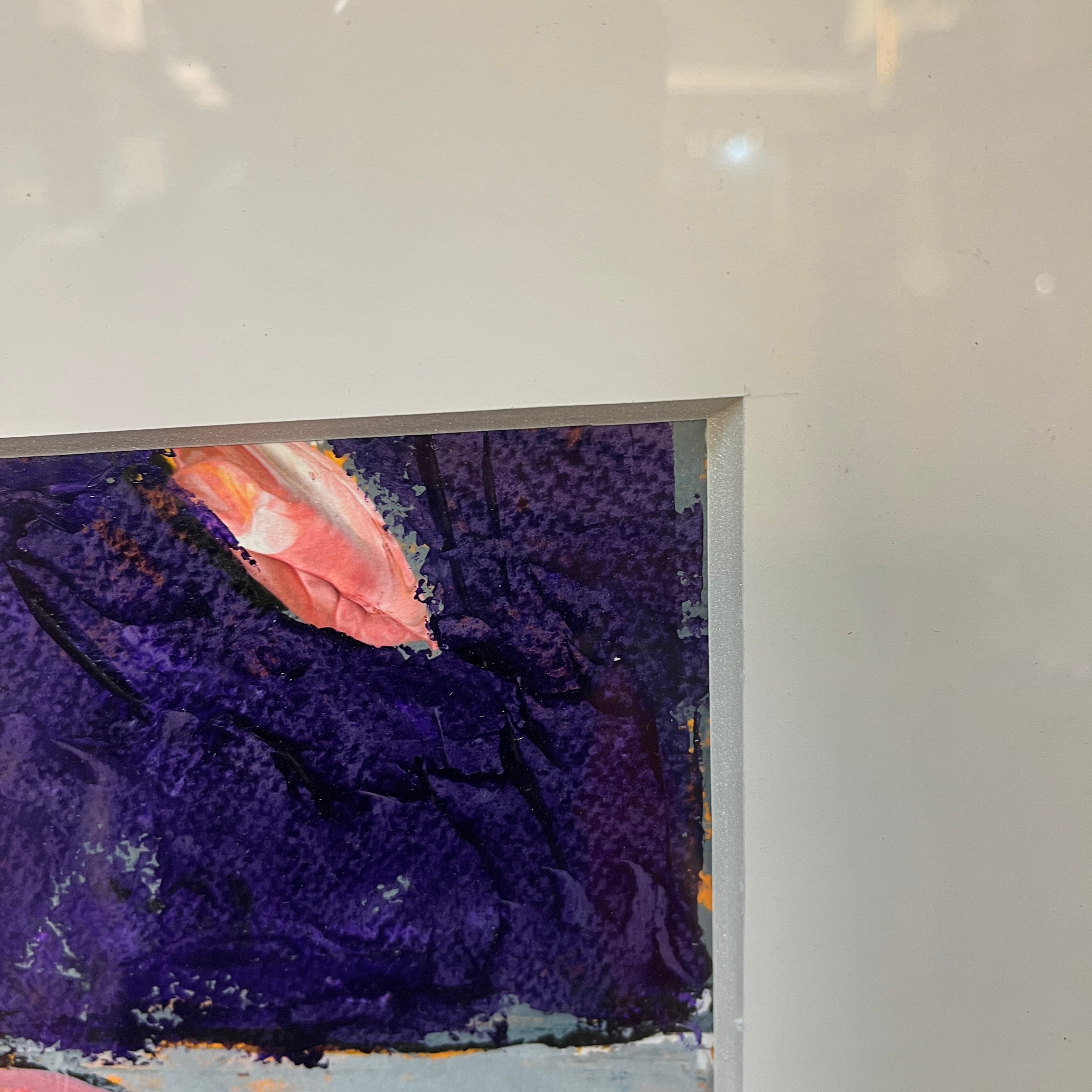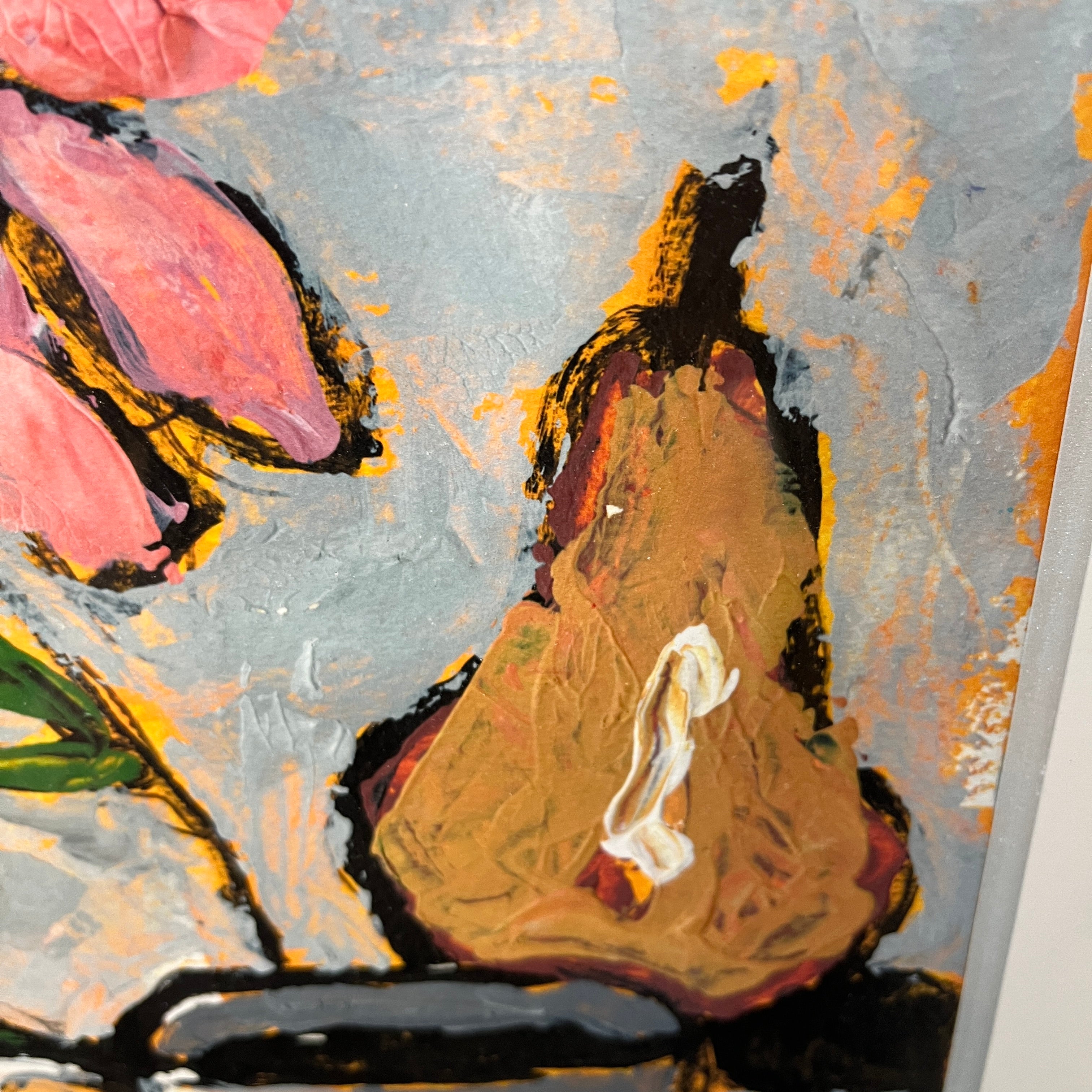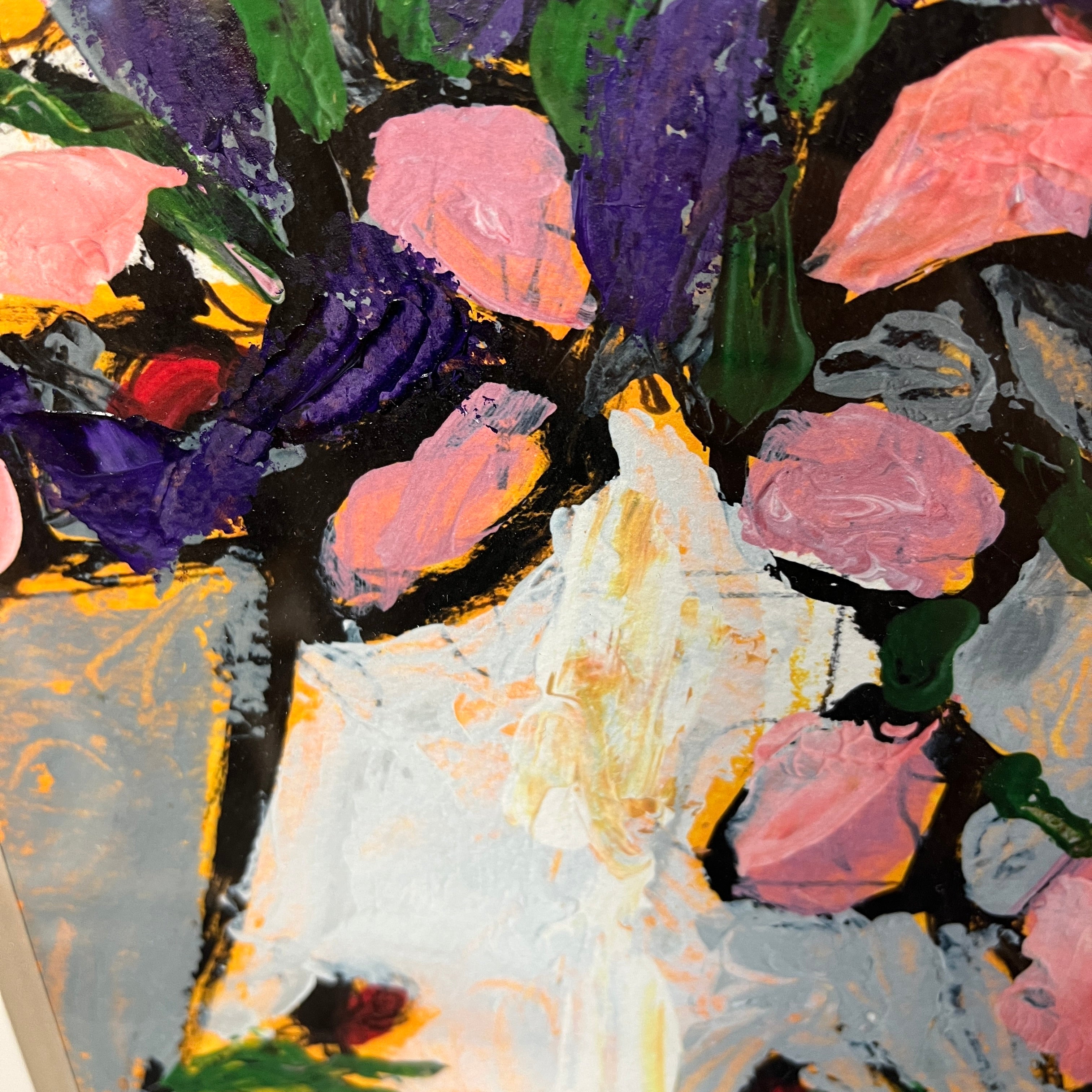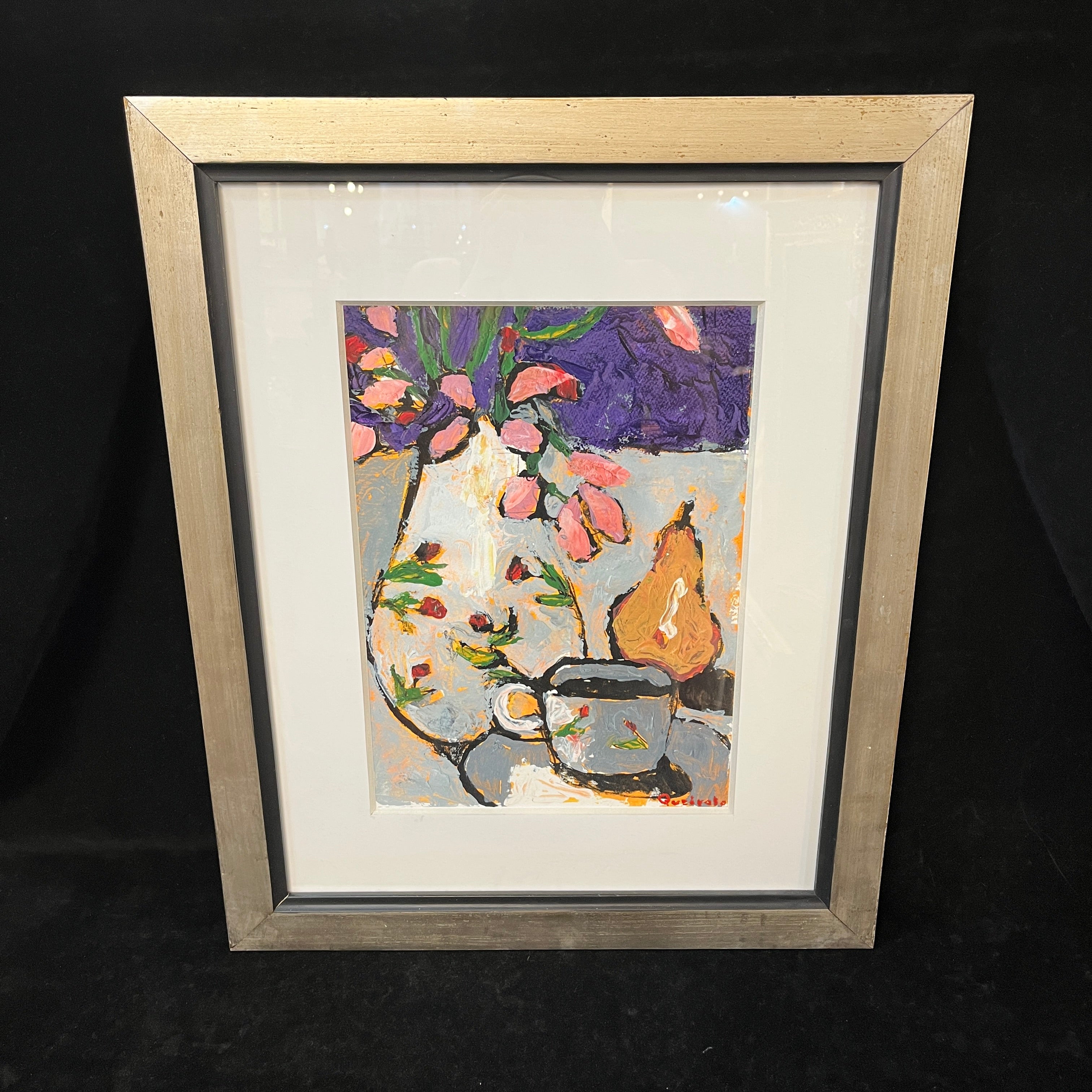 Acrílico sobre papel del artista chileno Vittorio Queirolo, representando un bodegón con su particular y reconocible estilo.En la composición podemos ver un florero blanco con unos delicados tulipanes de color rosa, una pera y una taza de café. El bodegón tiene un fondo morado, que contrasta muy bien con los blancos, el rojo y el rosado elegido por el artista. La obra tiene un marco contemporáneo, de diseño minimalista, pintado en plateado.