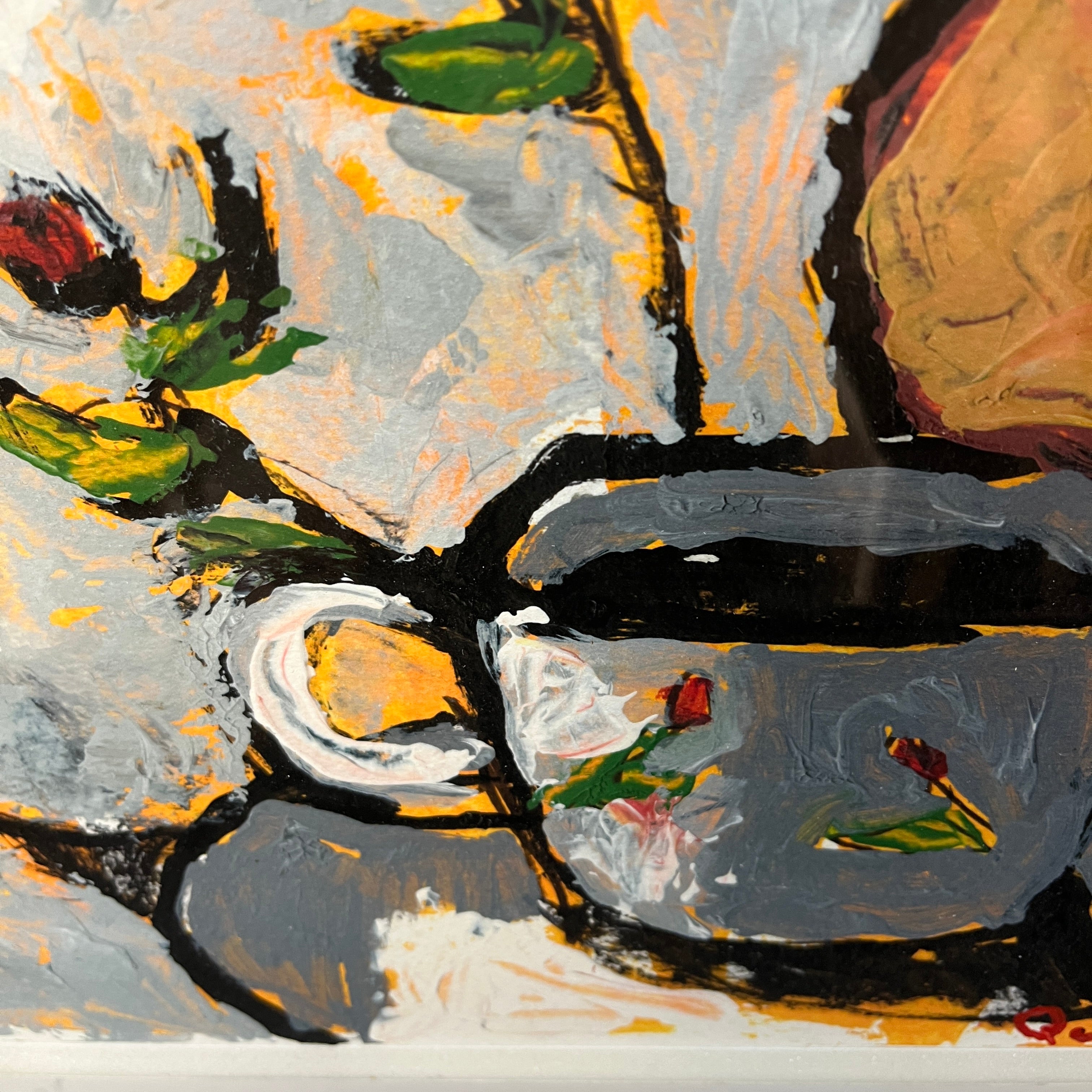 Vittorio Queirolo - Acrílico sobre papel Bodegón ‘Pera, flores y café’