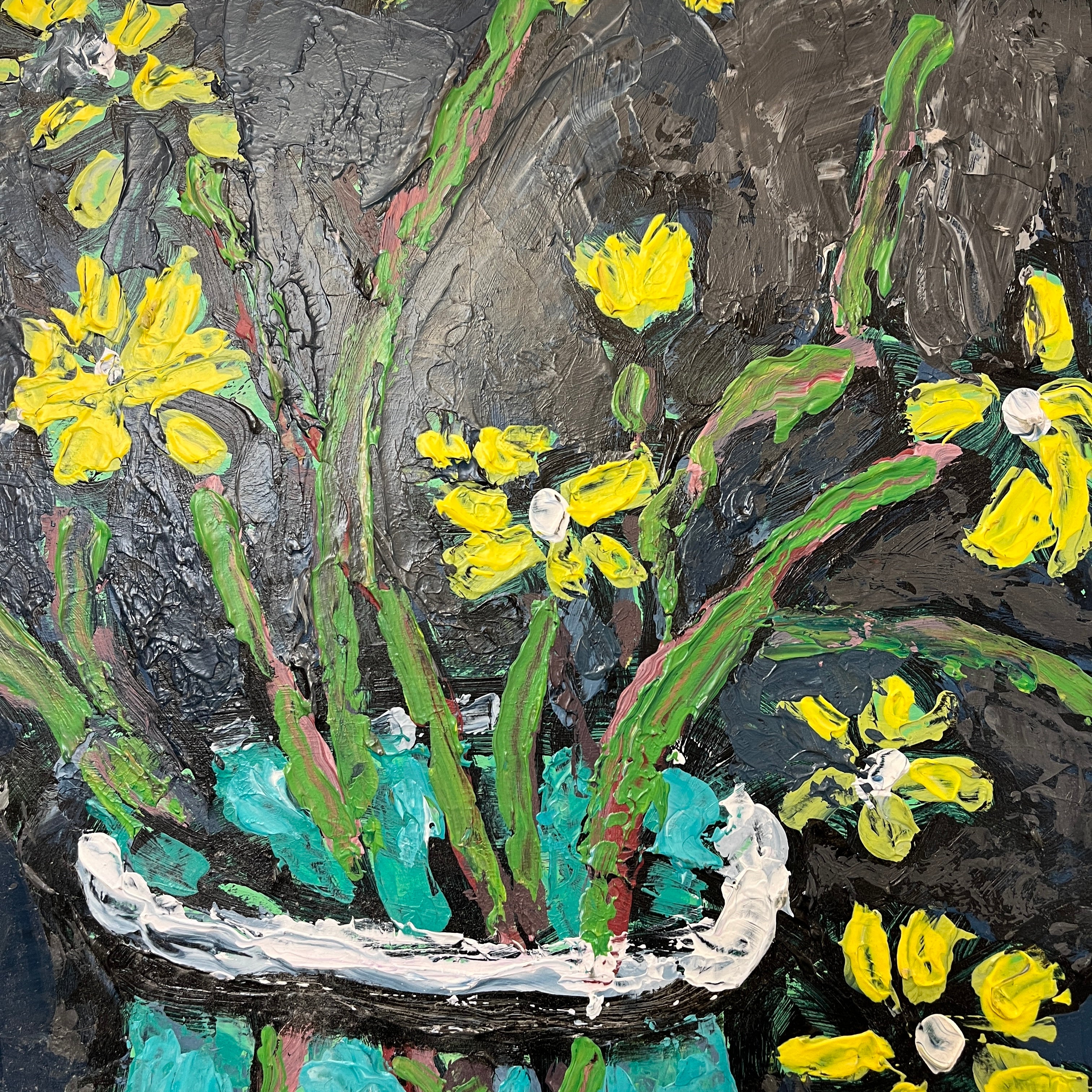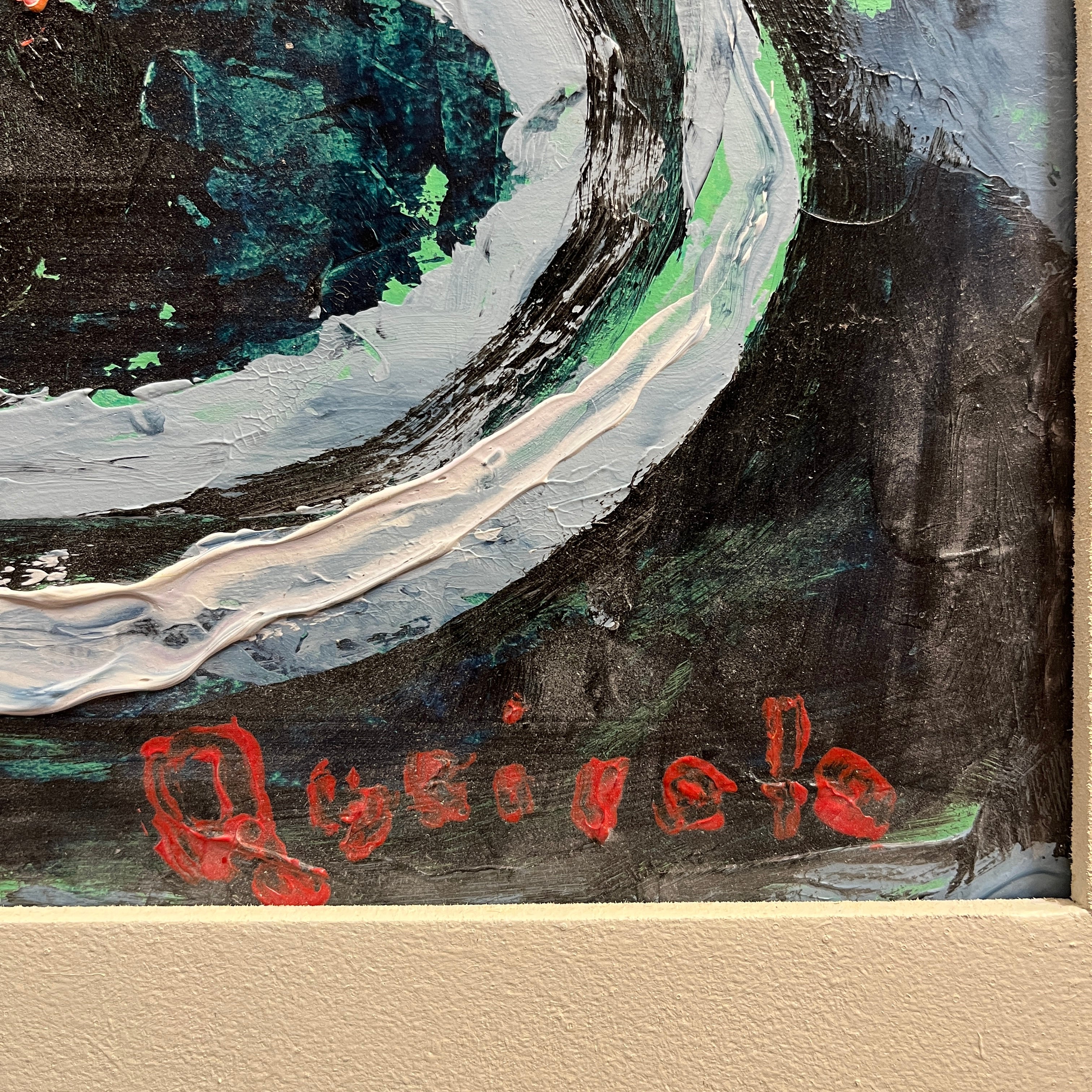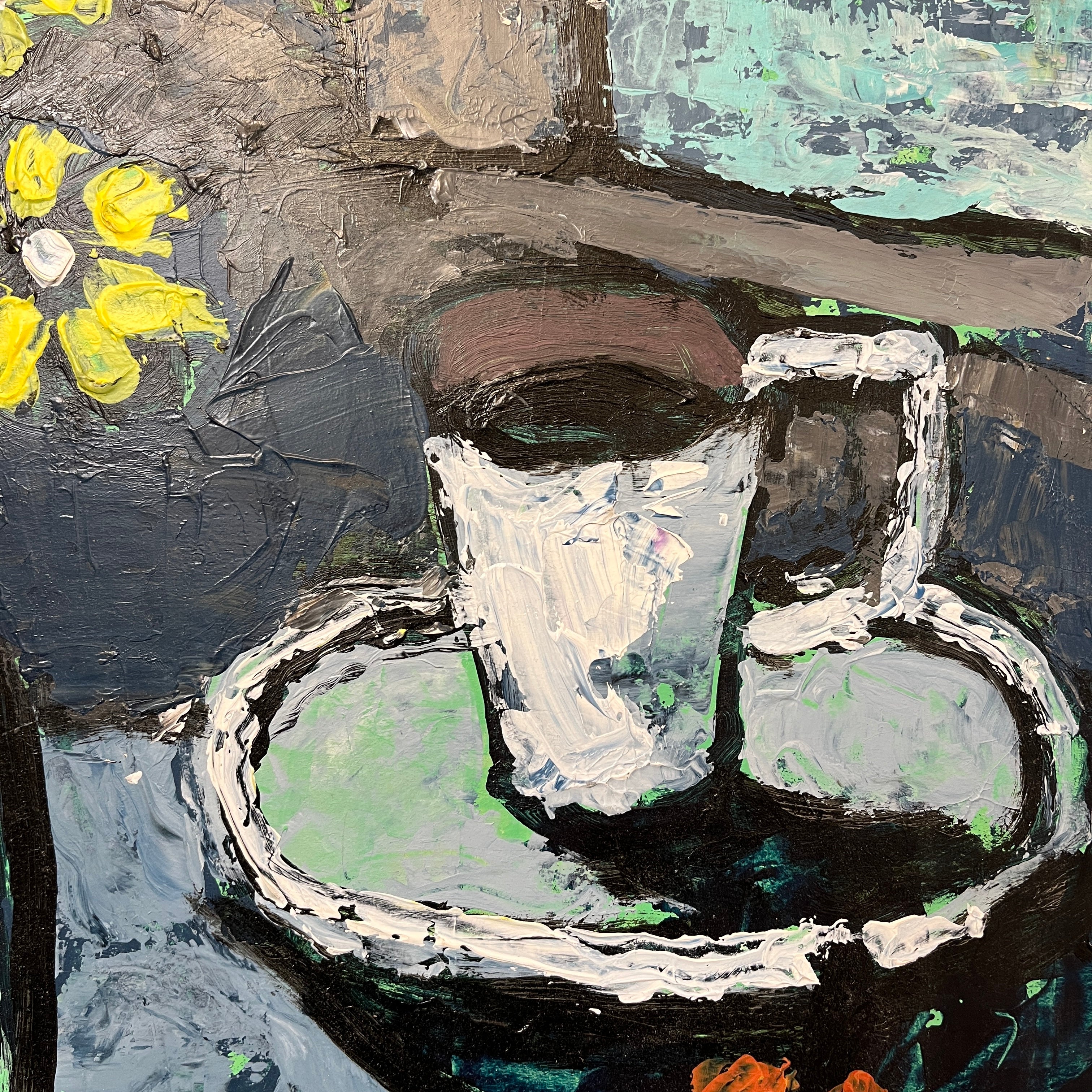 Colorido acrílico del talentoso artista chileno Vittorio Queirolo, nos presenta un interesante bodegón con diferentes puntos de atracción. Tenemos un jarrón con varas de flores amarillas una taza con café, acompañado de un plato con uvas y una pera, todo con un fondo en tonos grises que confluyen con los intensos colores y el fuerte empaste que permite ver cada pincelada del artista.