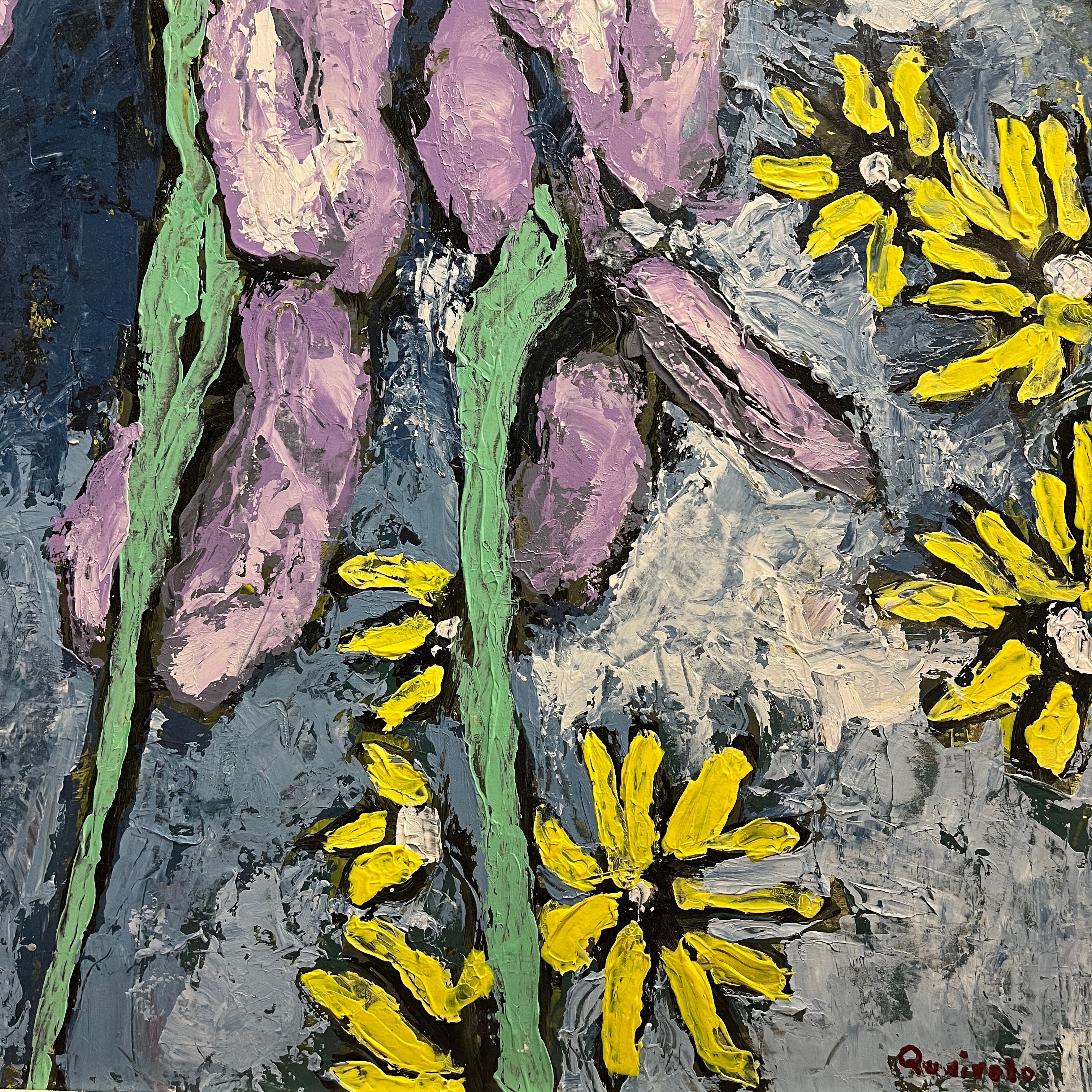 Vittorio Queirolo - Acrílico sobre cartón 'Lirios lilas y margaritas'