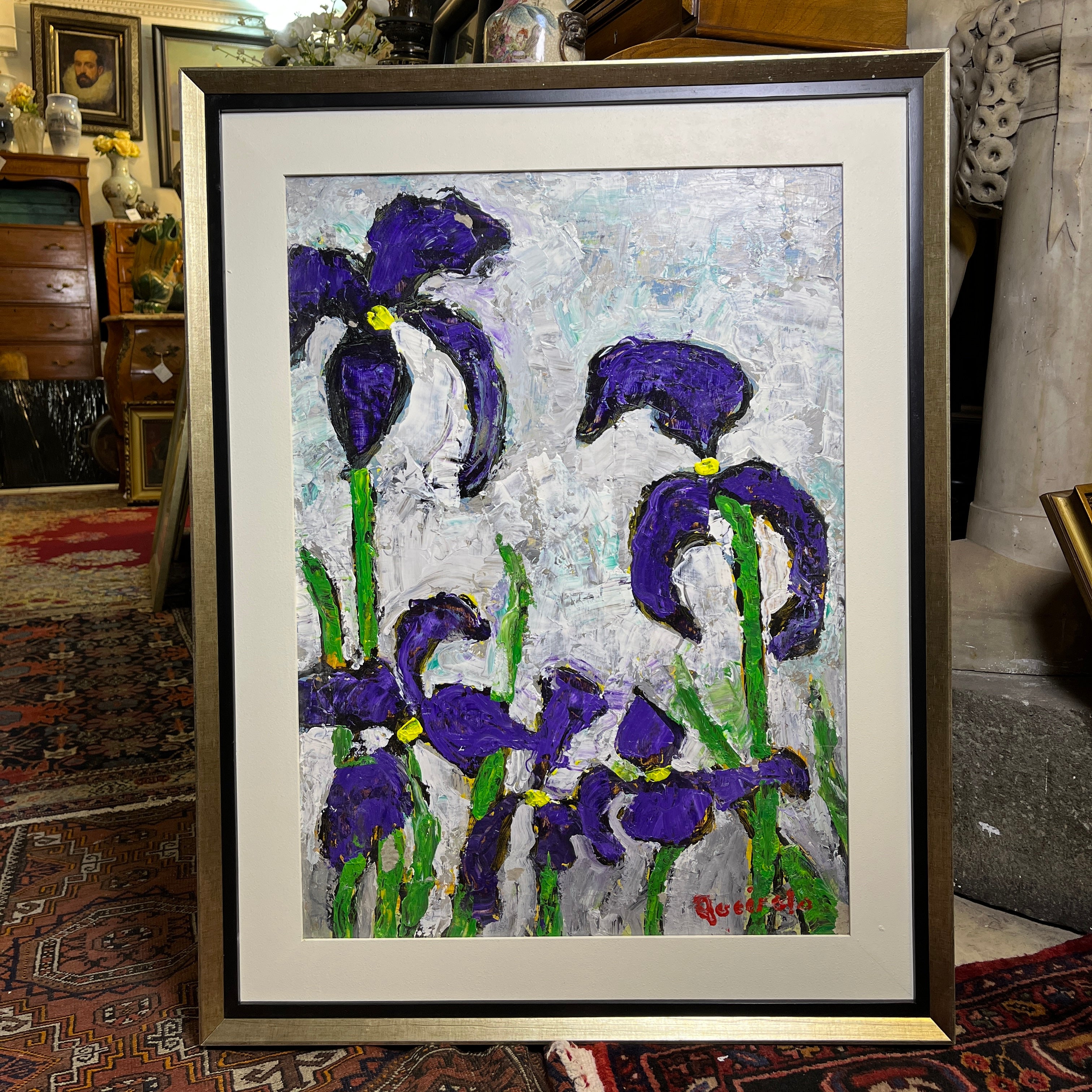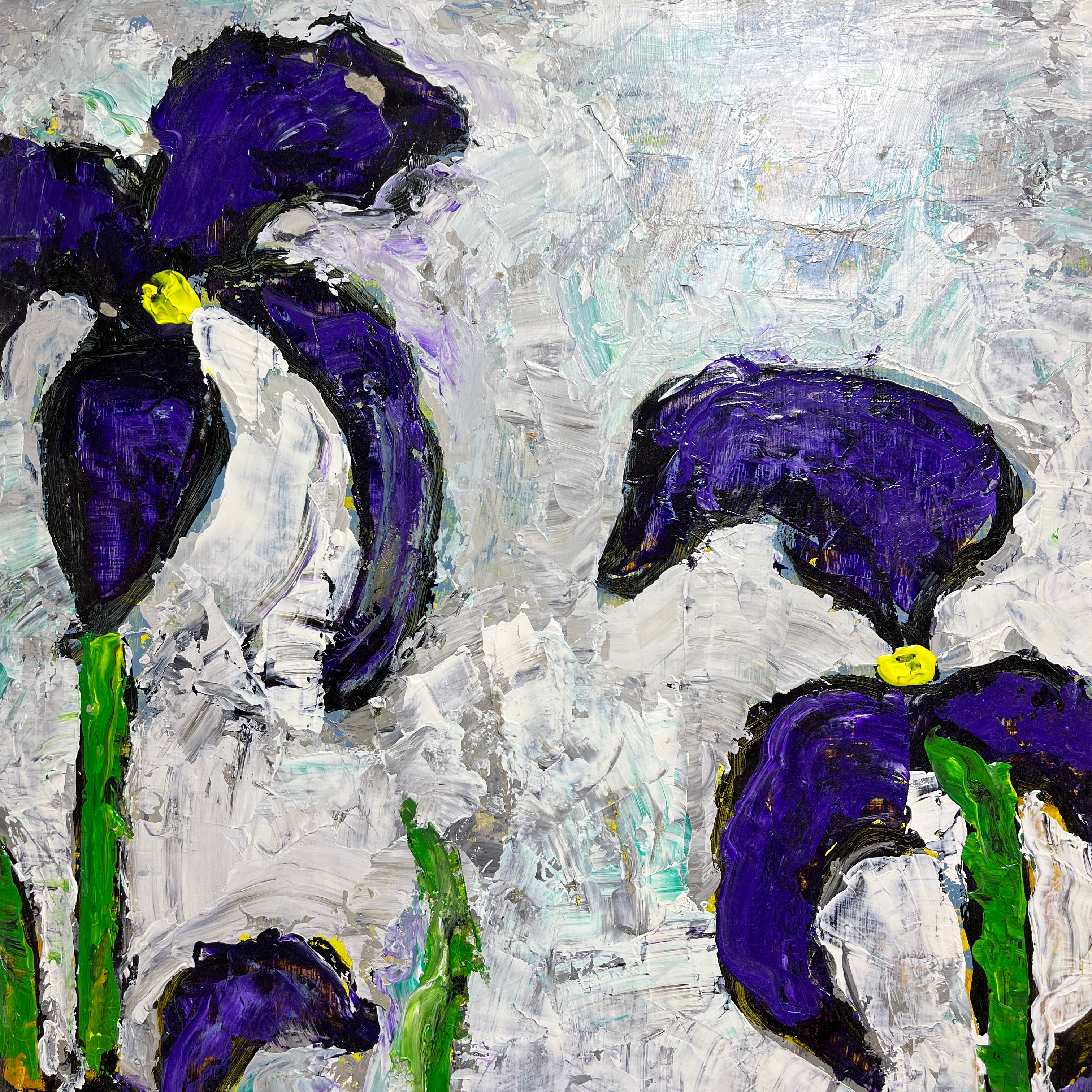 En esta obra del artista chileno Vittorio Queirolo, vemos nuevamente su gusto por las flores, en este caso lirios. Aprovecha el color morado de las flores y los tallos verdes para exacerbar la saturación del color en contraste a un cielo nublado en tonos blancos, grisáceos y celeste, cargado de textura.