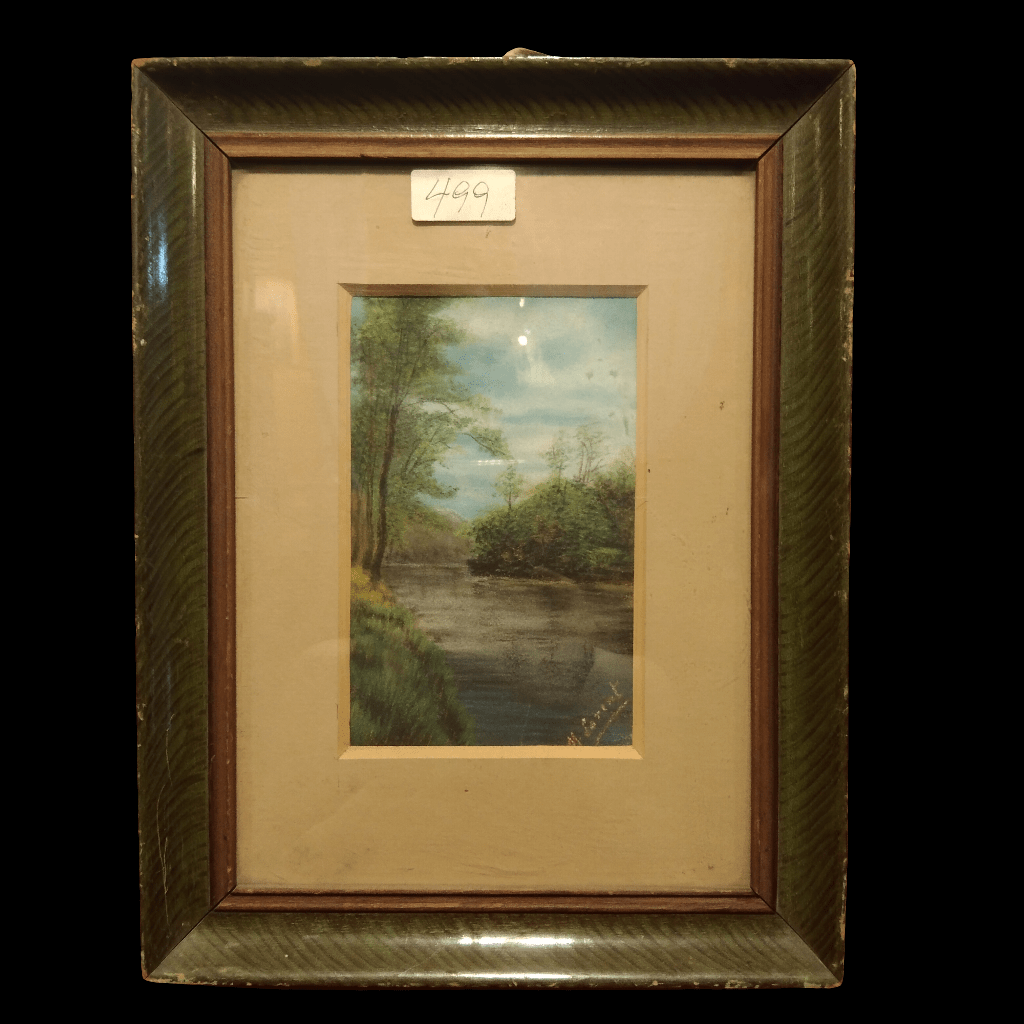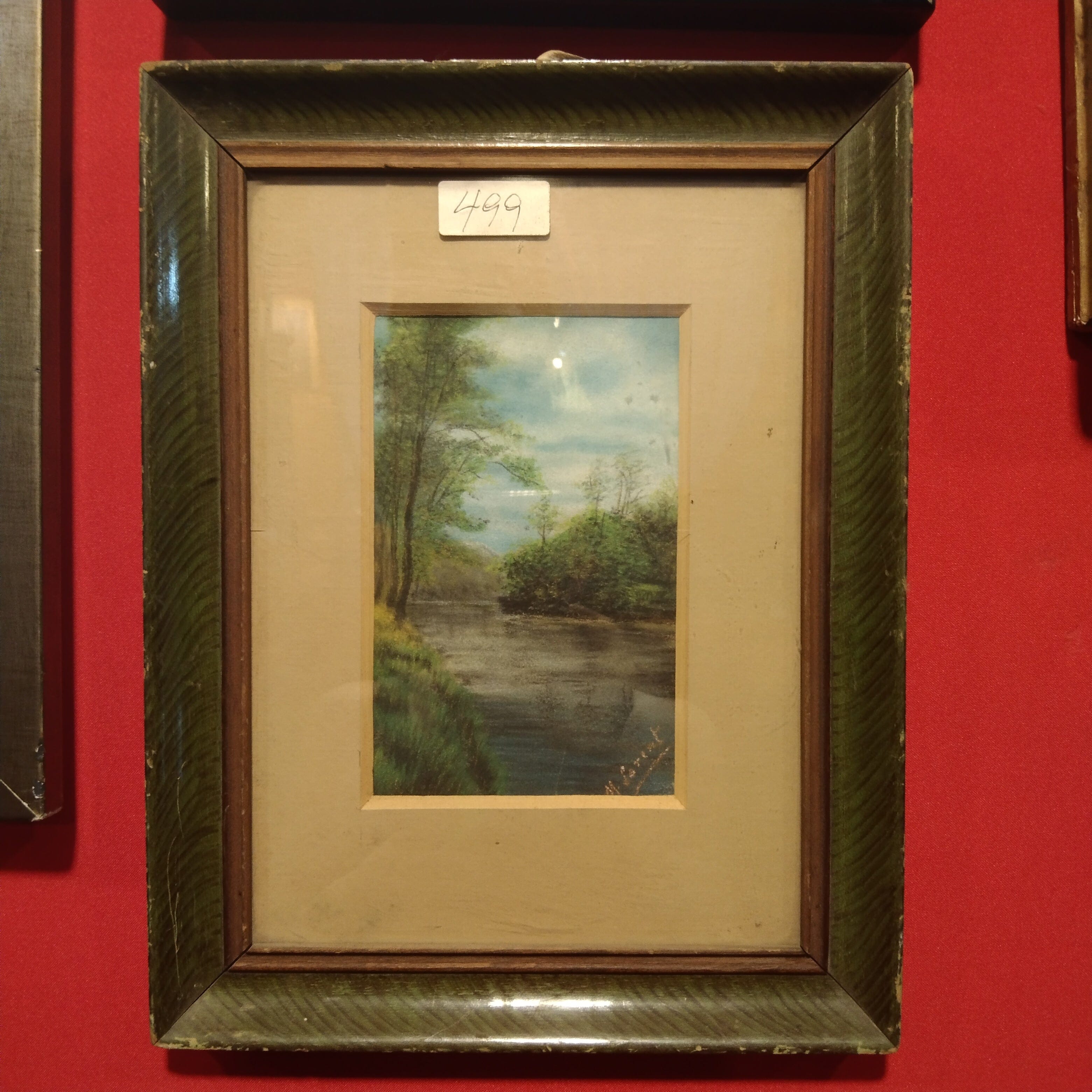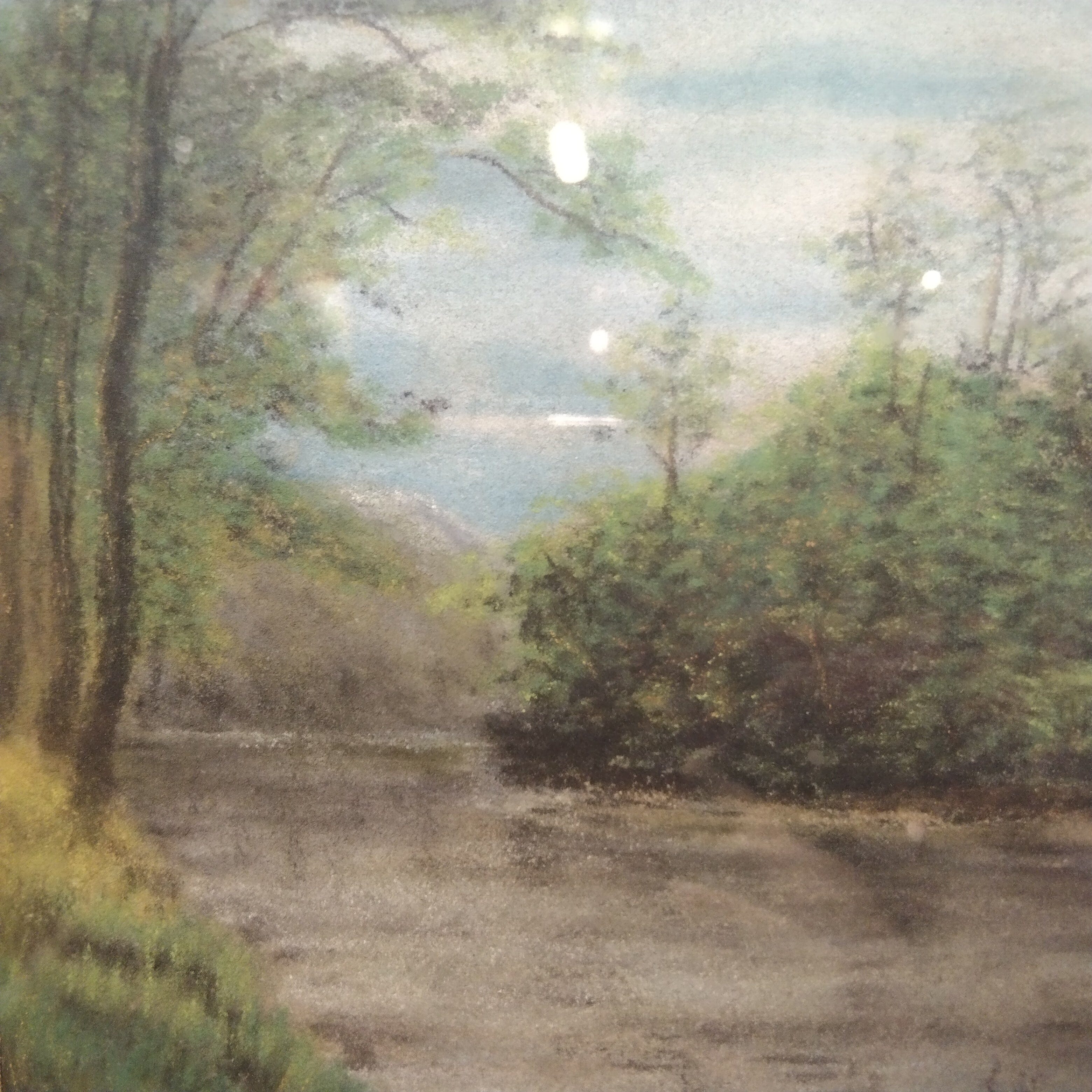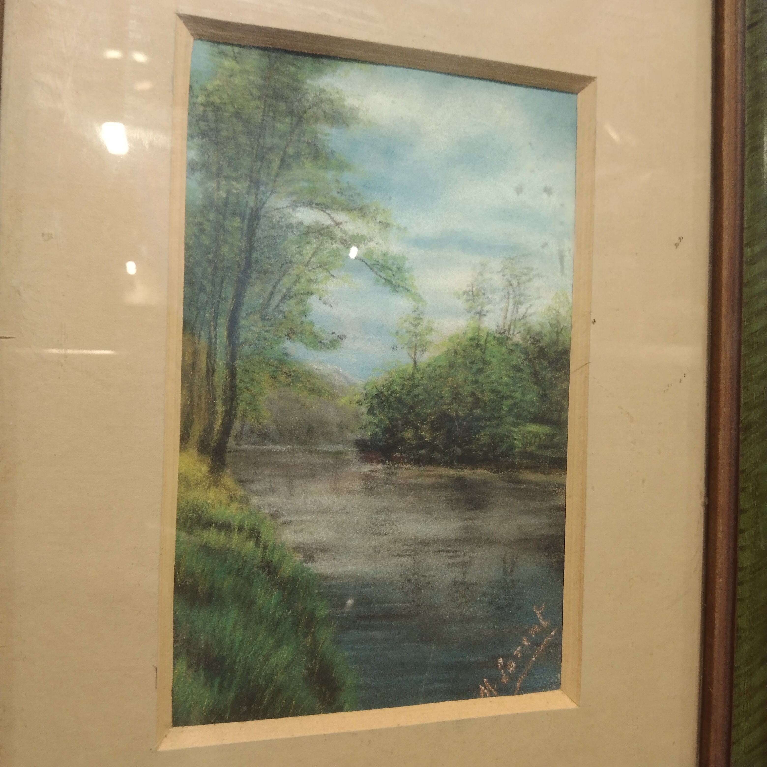 Lindo pastel sobre papel, representando un paisaje natural, con un río fluyendo entee frondosos árboles, con un delicado trazo con notables juegos de luces y sombras. La obra está enmarcada en madera verde con un acabado semi brillante y un paspartú color crudo.