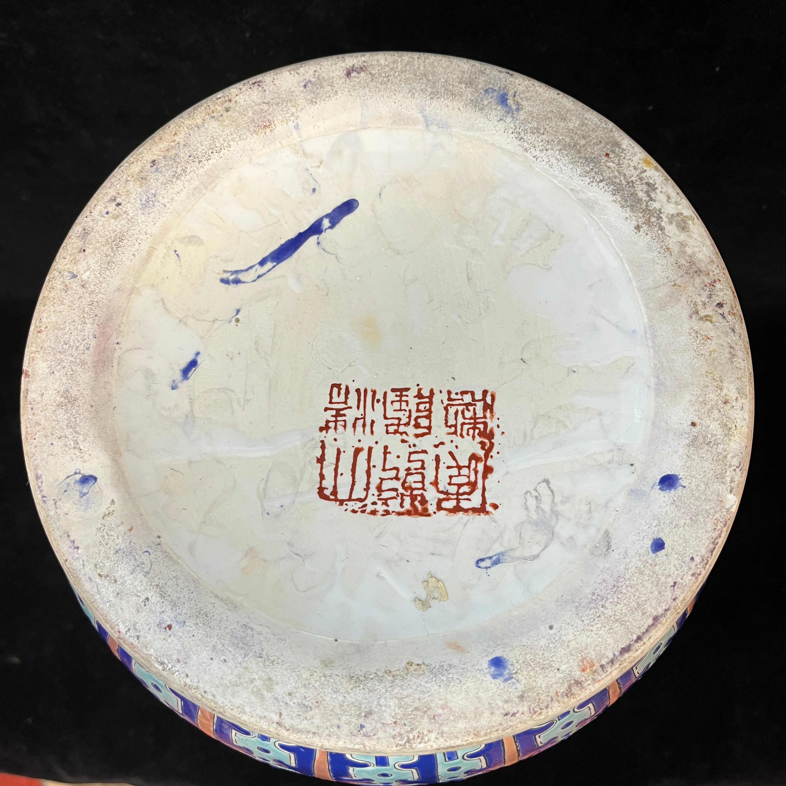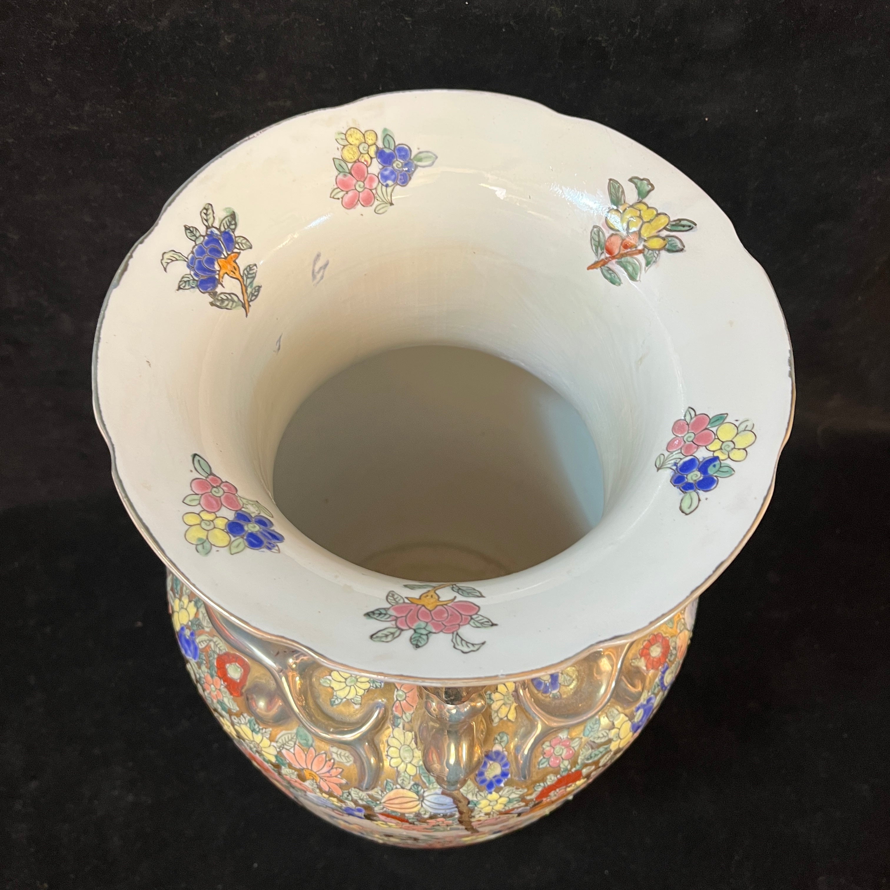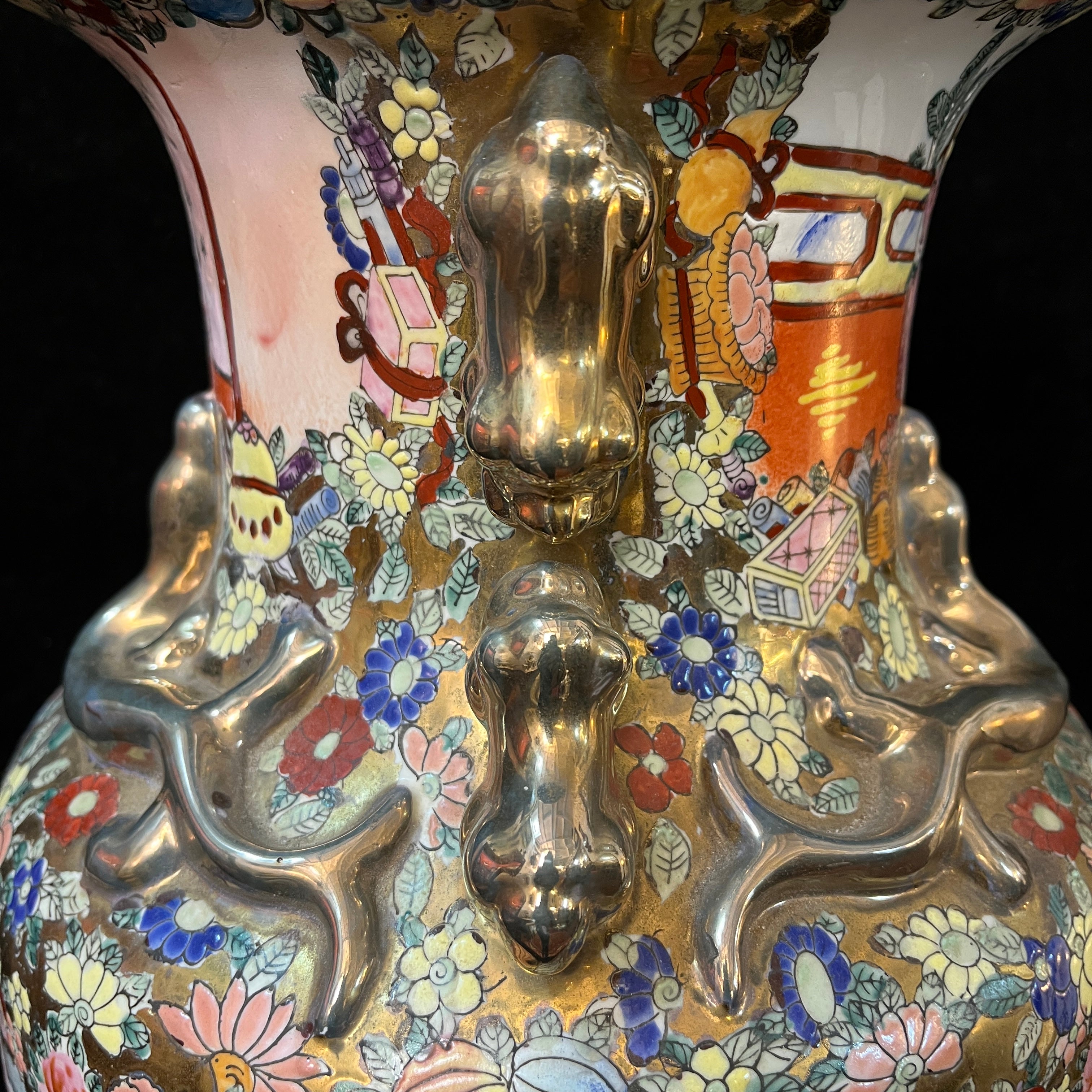 Imponente jarrón de porcelana china con molduras doradas. Presenta un diseño finamente trabajado representando un hogar de familia noble, con su jardín y sirvientes. El sello de fabricación está en la base.