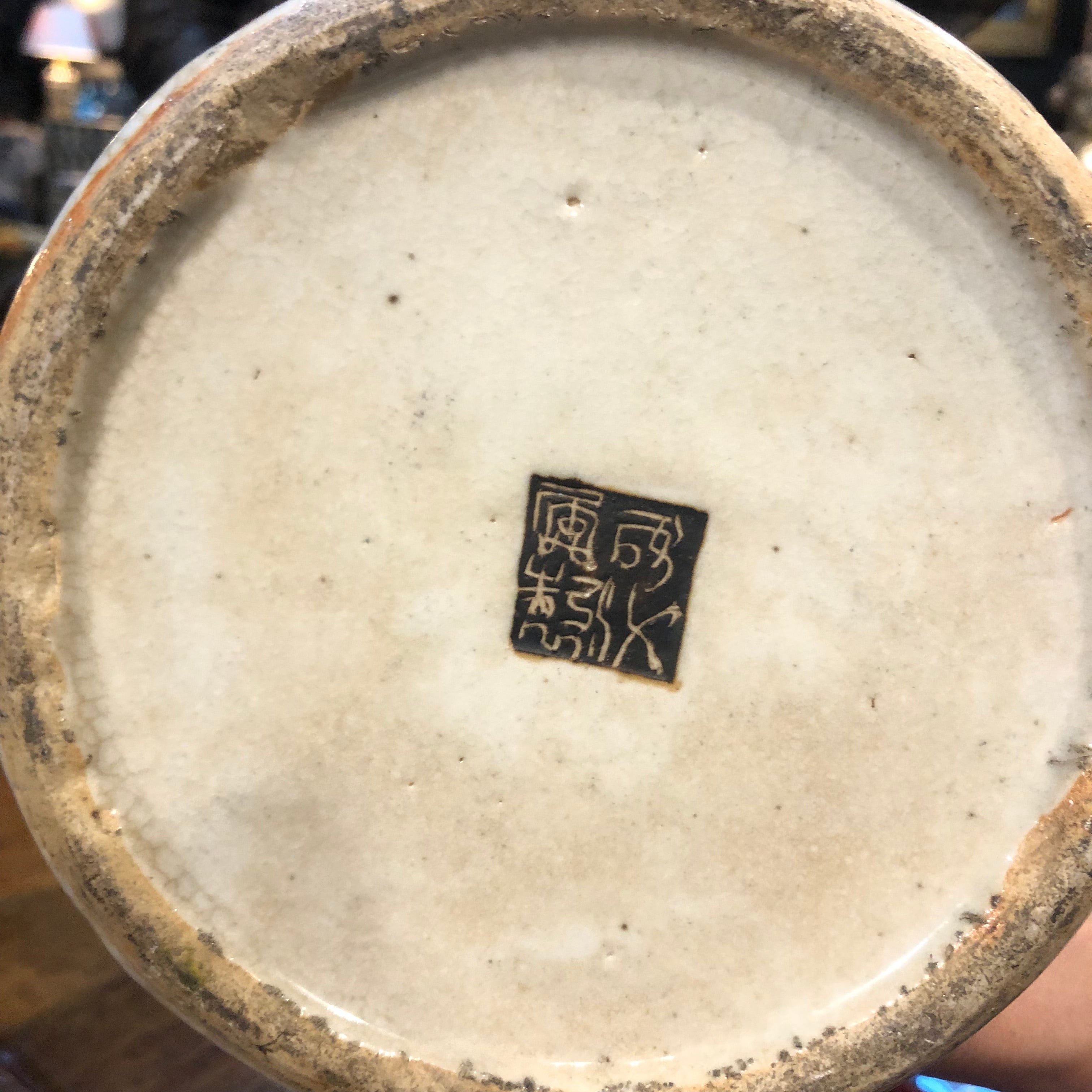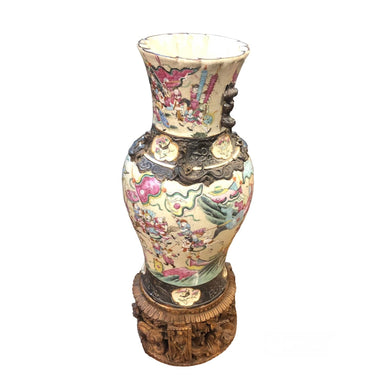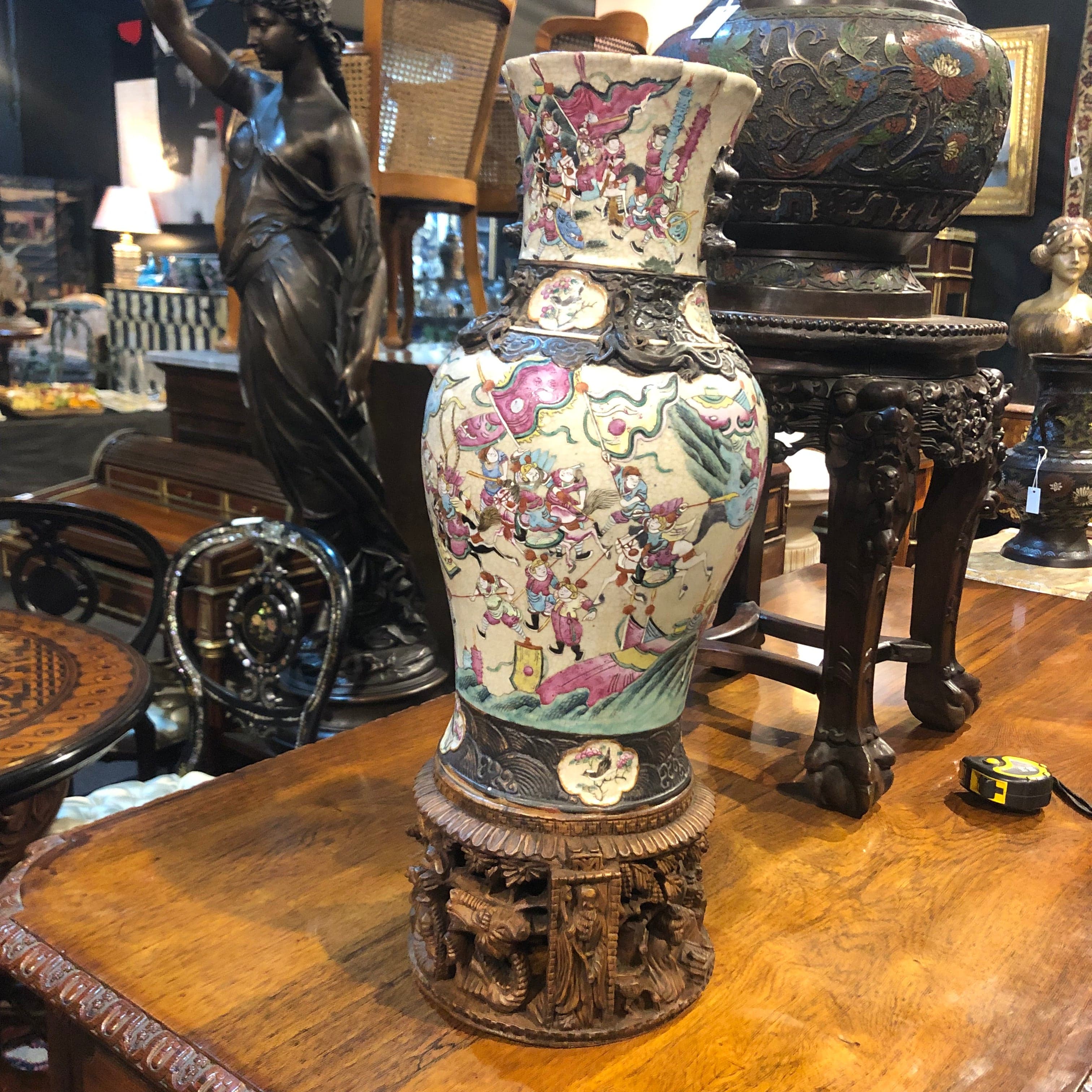 Hermoso Jarron de porcelana de origen chino, con peana tallada en madera. Hermoso diseño de flores y jinetes sobre porcelana blanca.