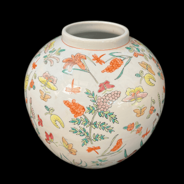 Hermoso jarrón de porcelana china con un diseño que representa un pequeño mundo conformado por arbustos, flores, insectos y hojas.