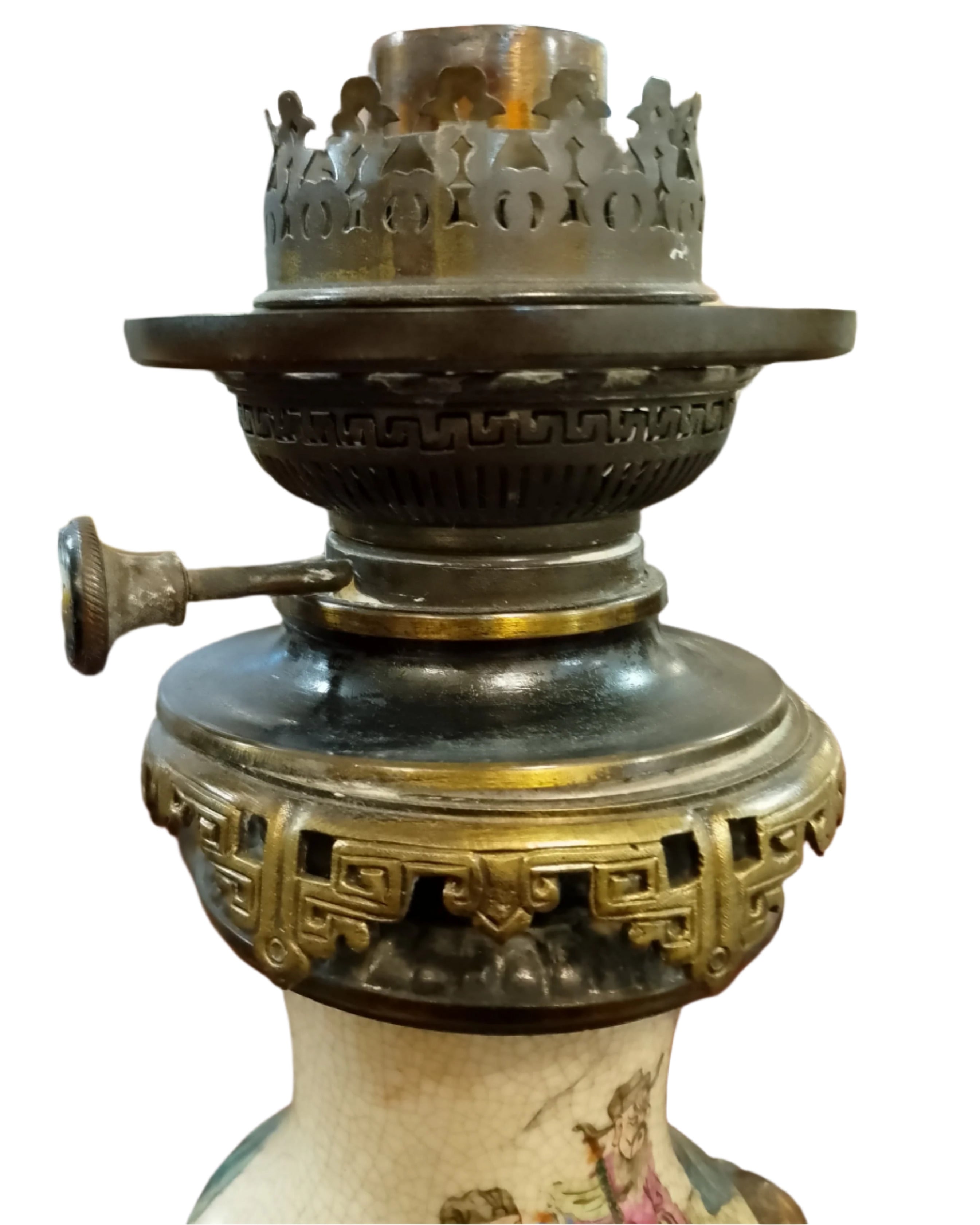 Hermosas lámparas mellizas antiguas de porcelana china en estilo Nankin. Presentan un cuerpo central de porcelana con escenas bélicas pintadas a mano, aplicaciones de metal para la base y finials en su parte superior, elementos decorativos que se atornillan en la varilla de la lámpara, asegurando la pantalla en su lugar. Elegante elemento decorativo para su mesa o sala de estar.