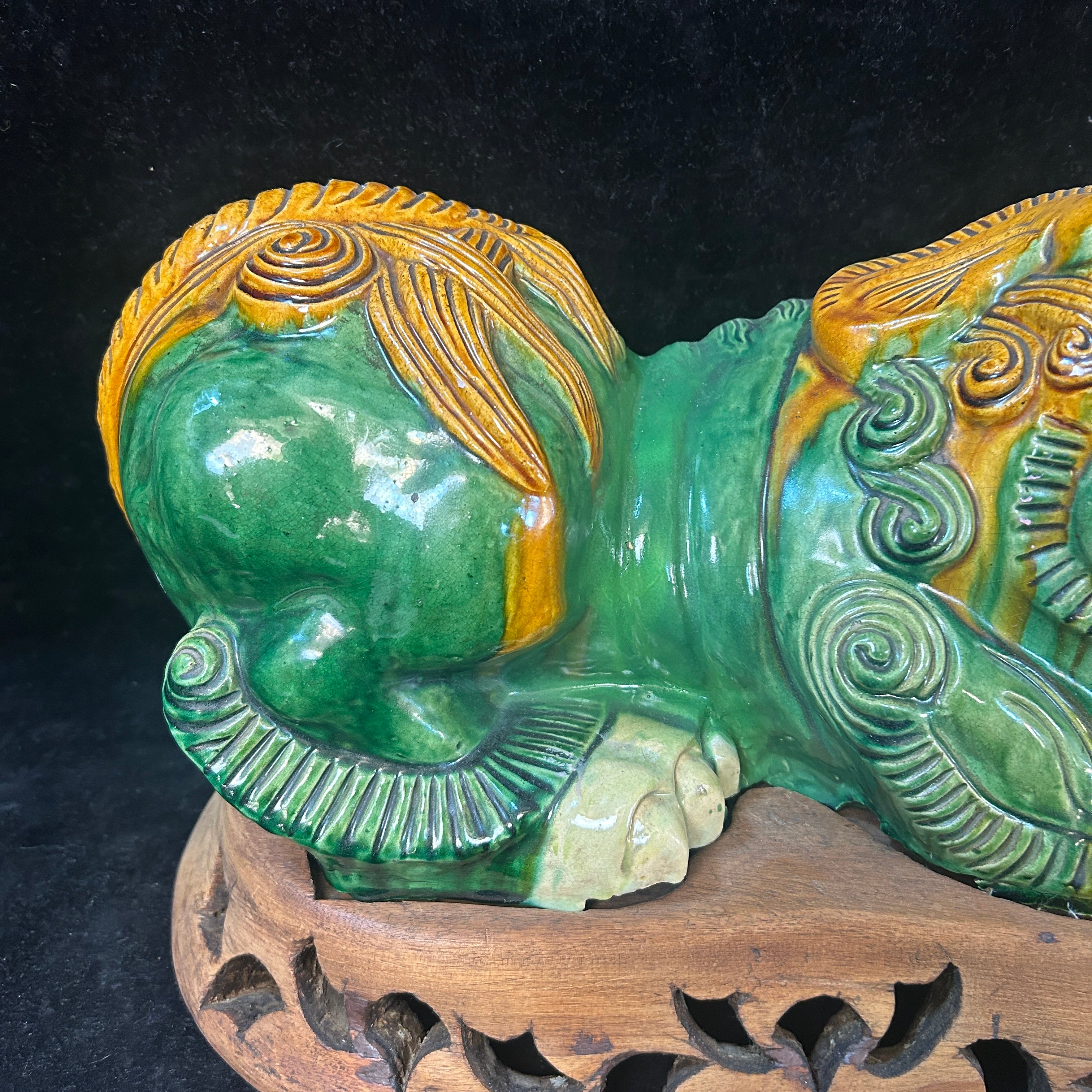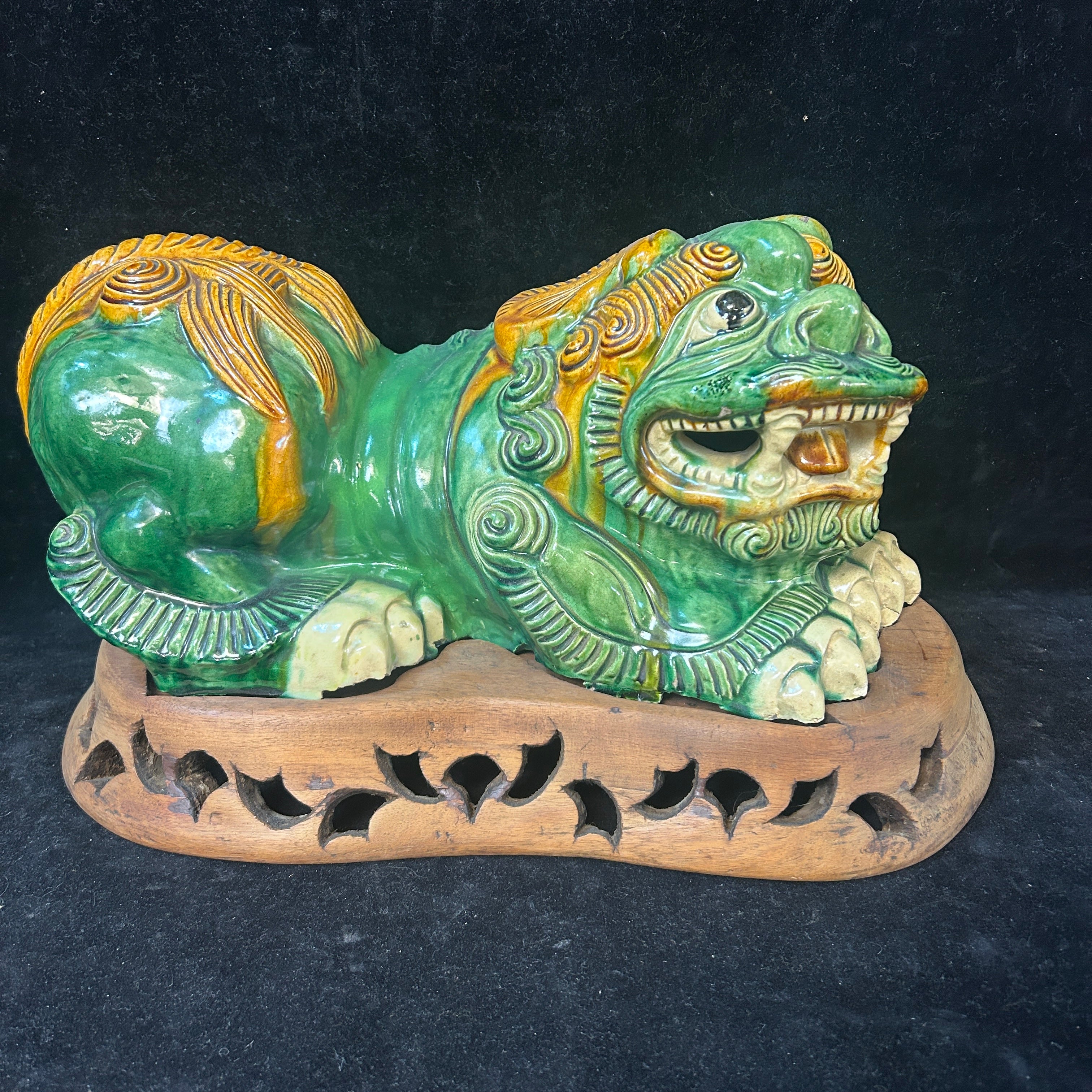 Juguetón Perro Fu de cerámica china pintada a mano sobre peana de madera original. Podemos observar una figura clásica de la cultura china, símbolo de protección en los hogares, de un verde intenso y tonos naranjos sobre su lomo. La figura posee restauración visible en las fotografías y la peana tiene un pequeño detalle también visible en las fotografías.