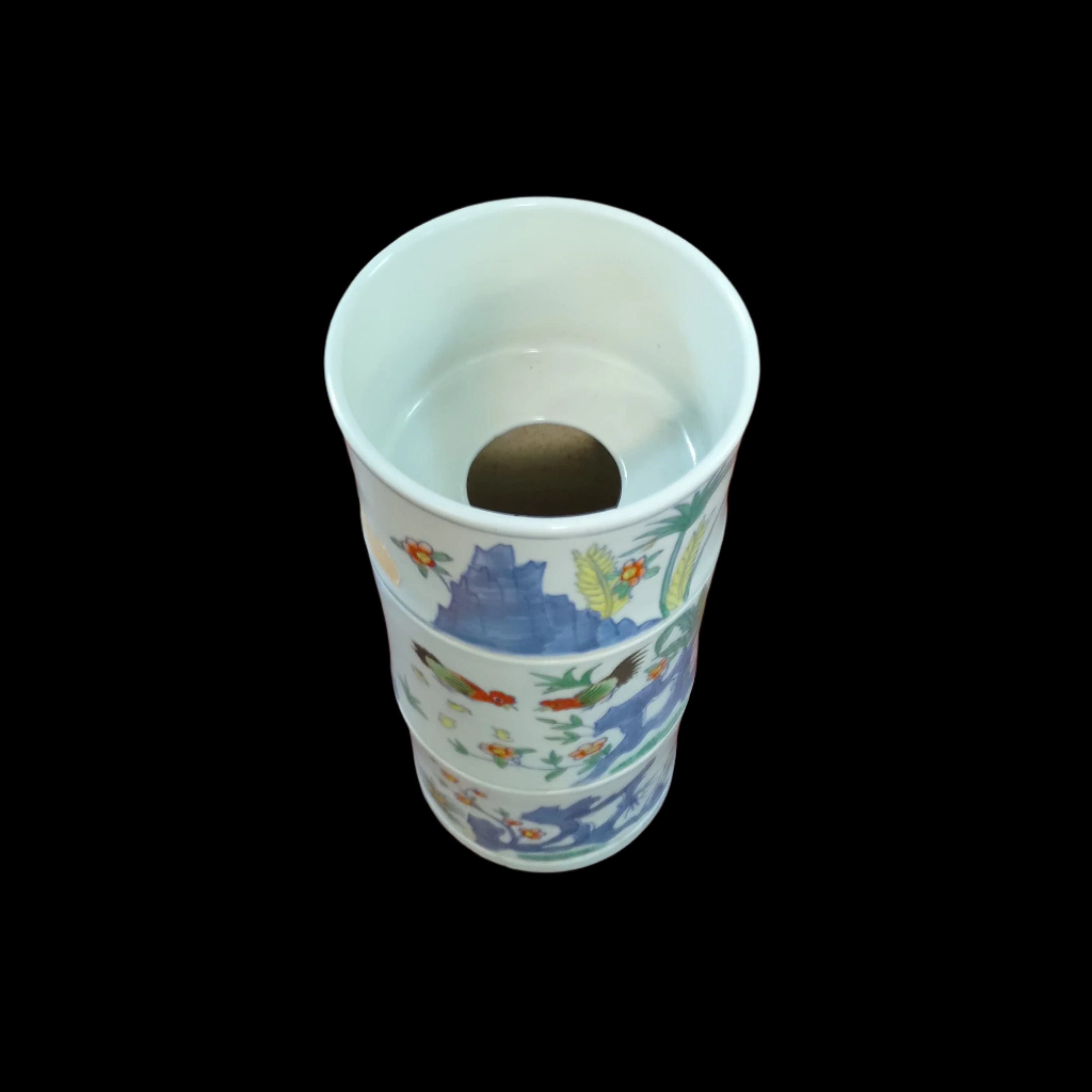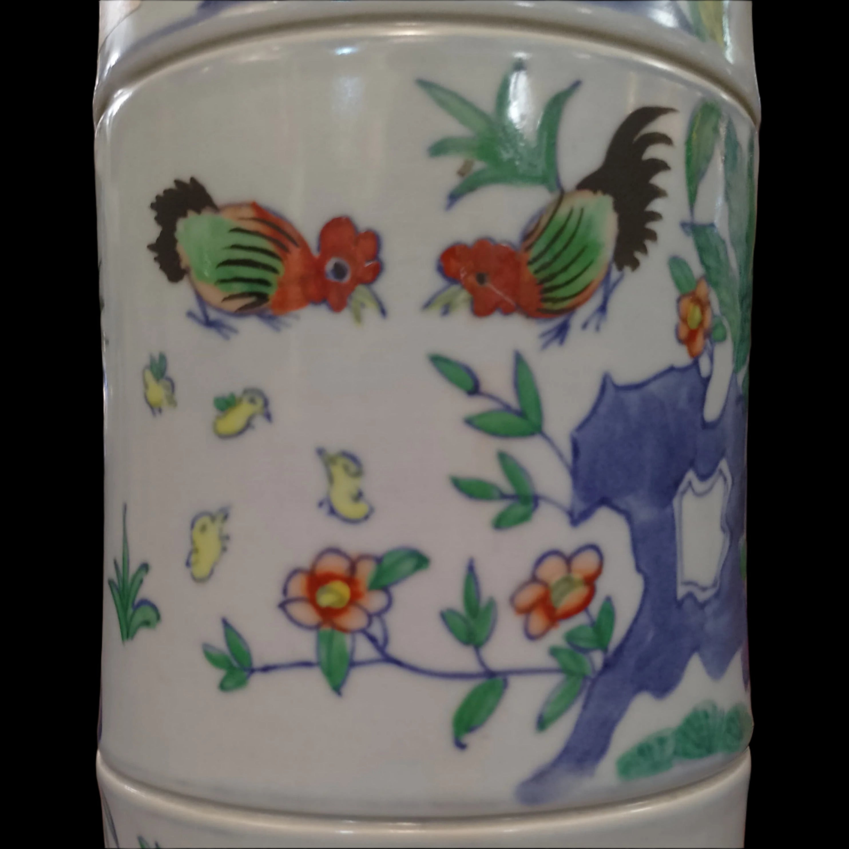 Portapinceles de porcelana china en forma de bambú "Gallos y Vegetación"
