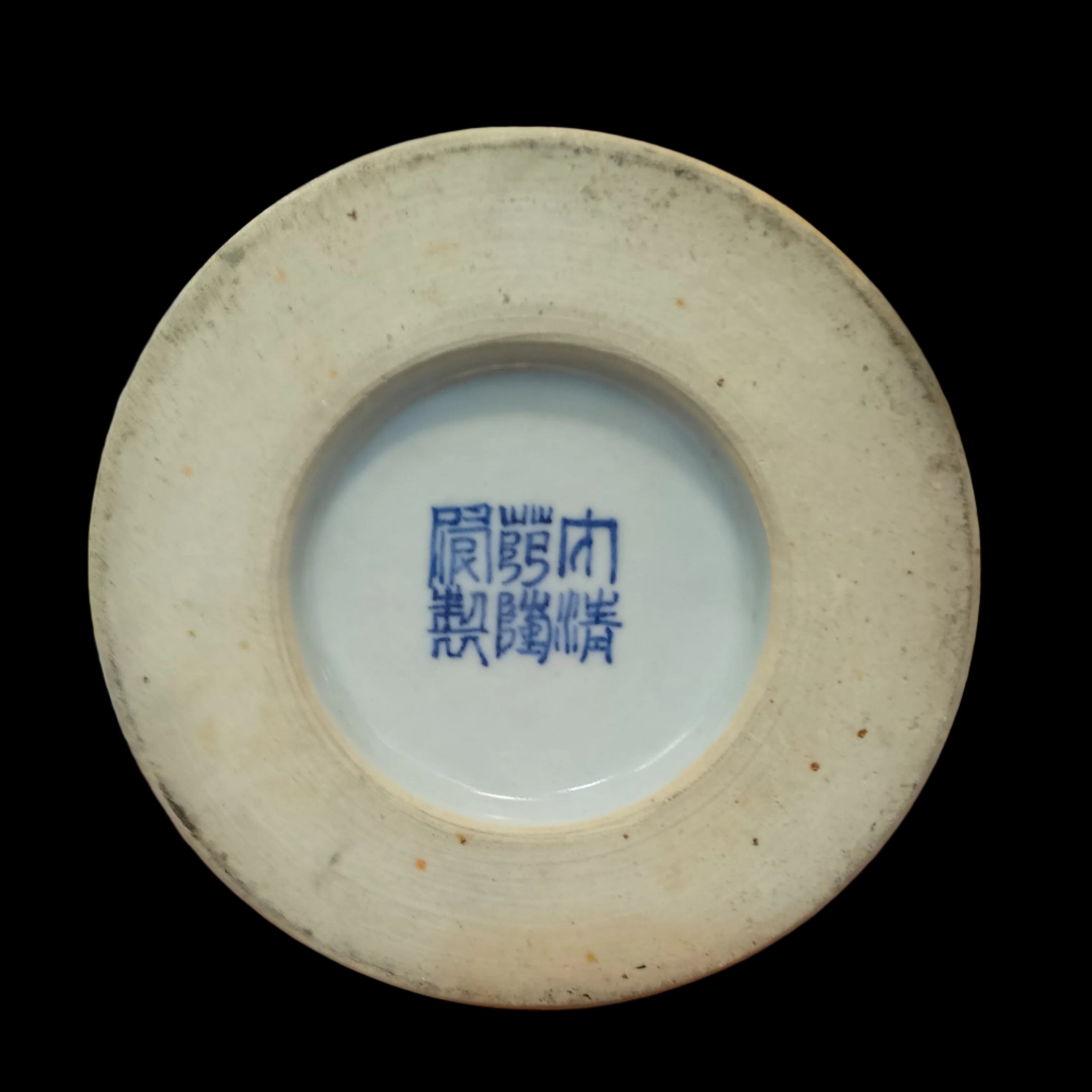 Hermoso portapinceles de porcelana china en forma de bambú representando una escena campestre. Cuenta con un sello en su base que da cuenta de su origen y función.