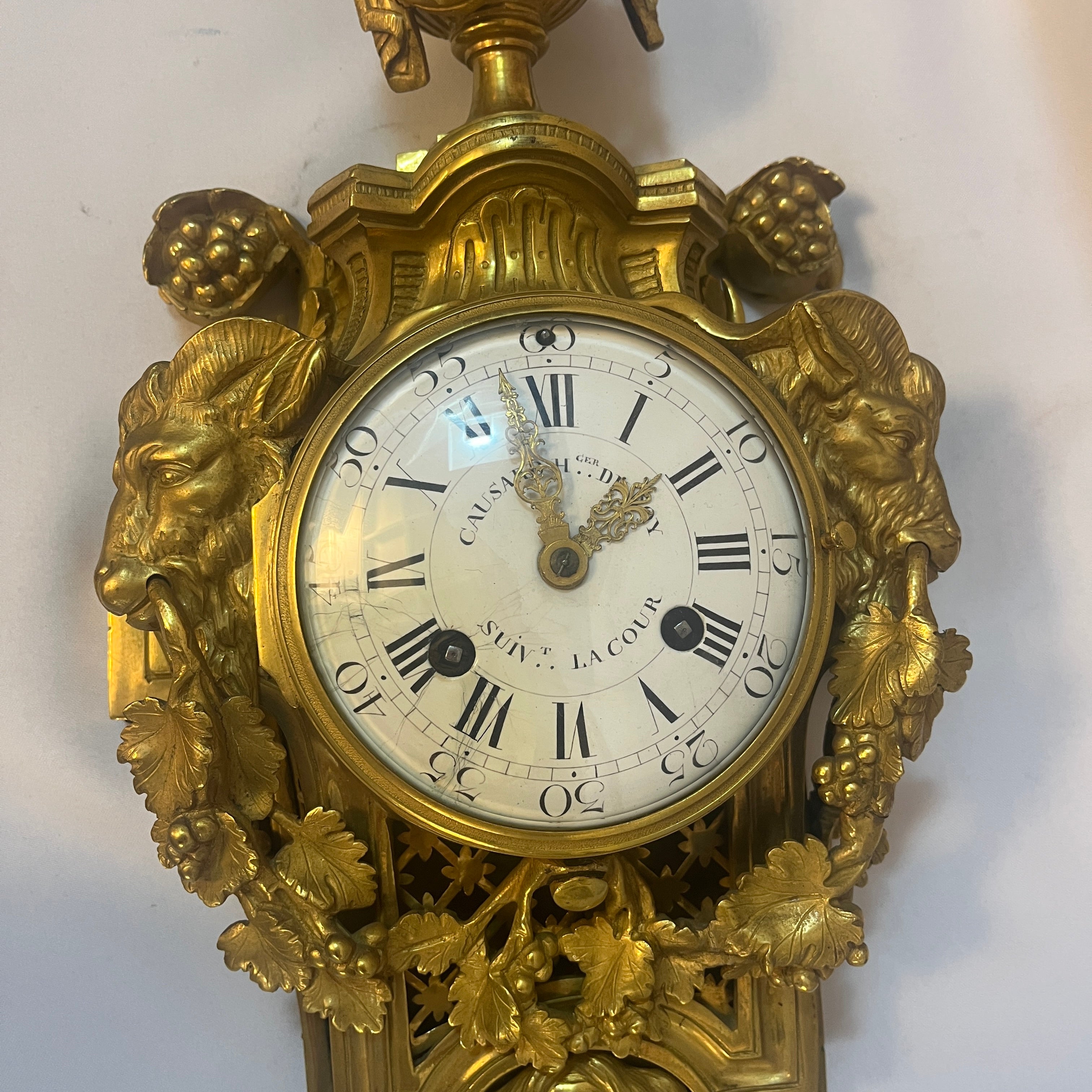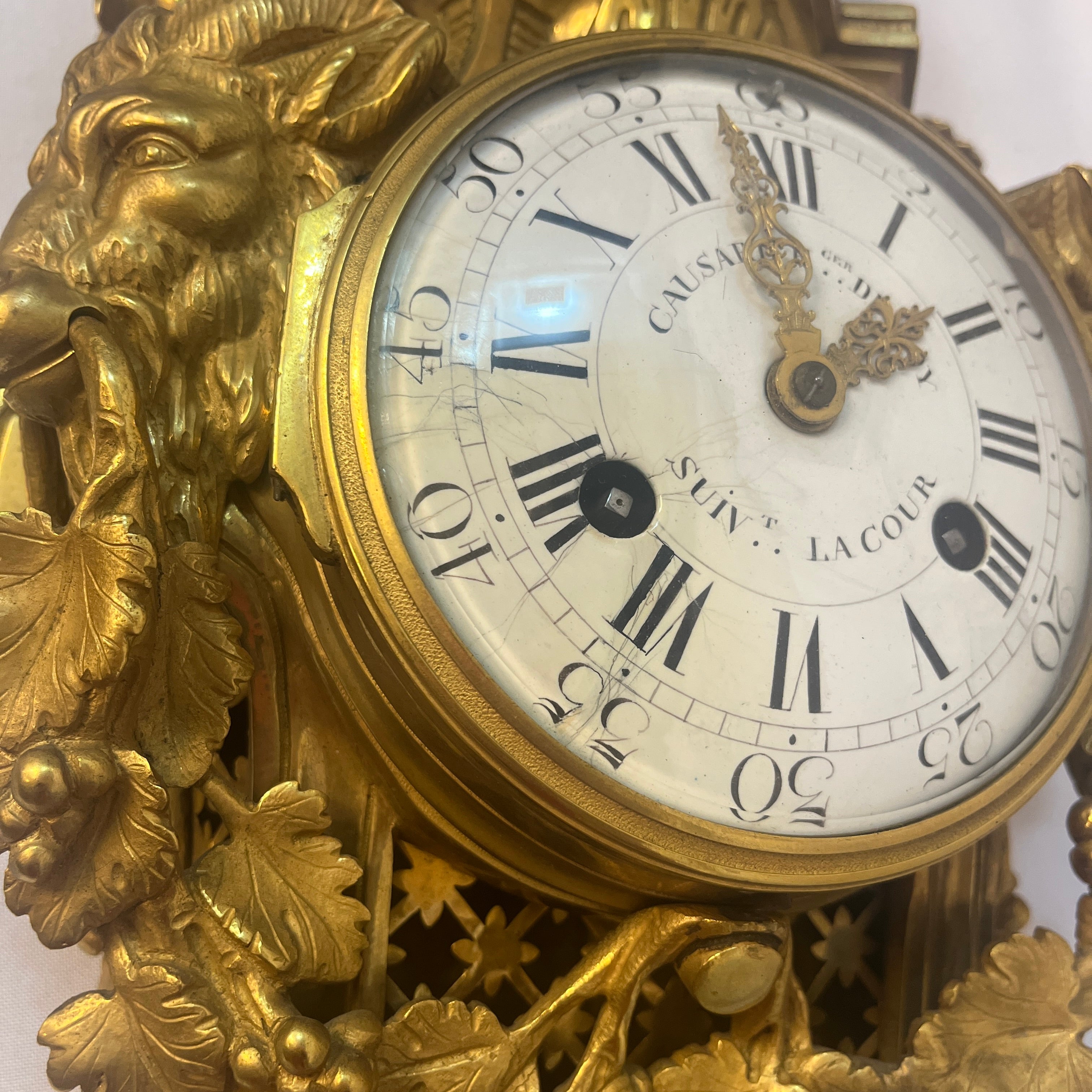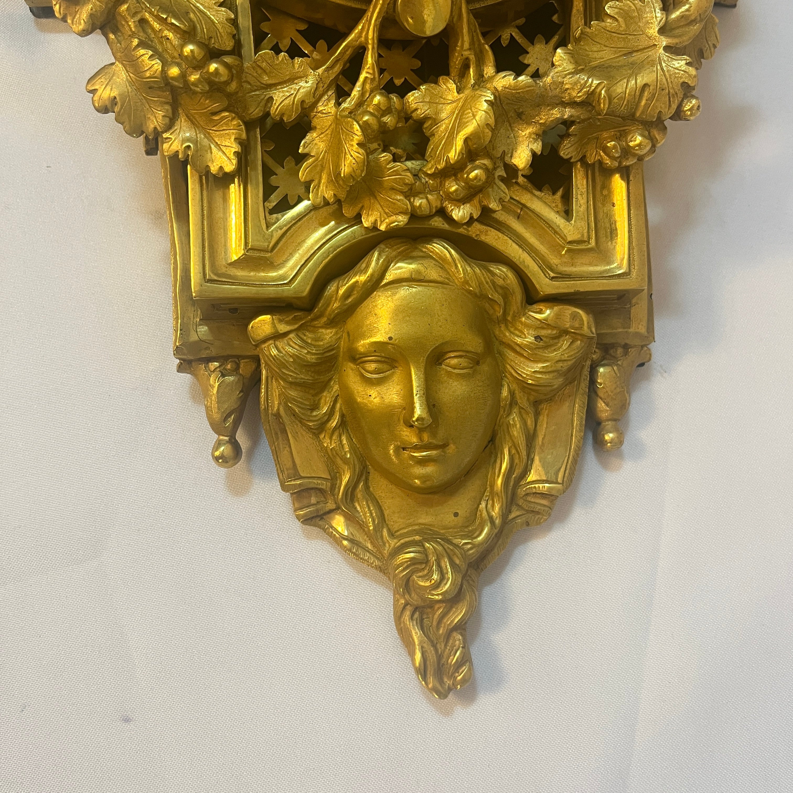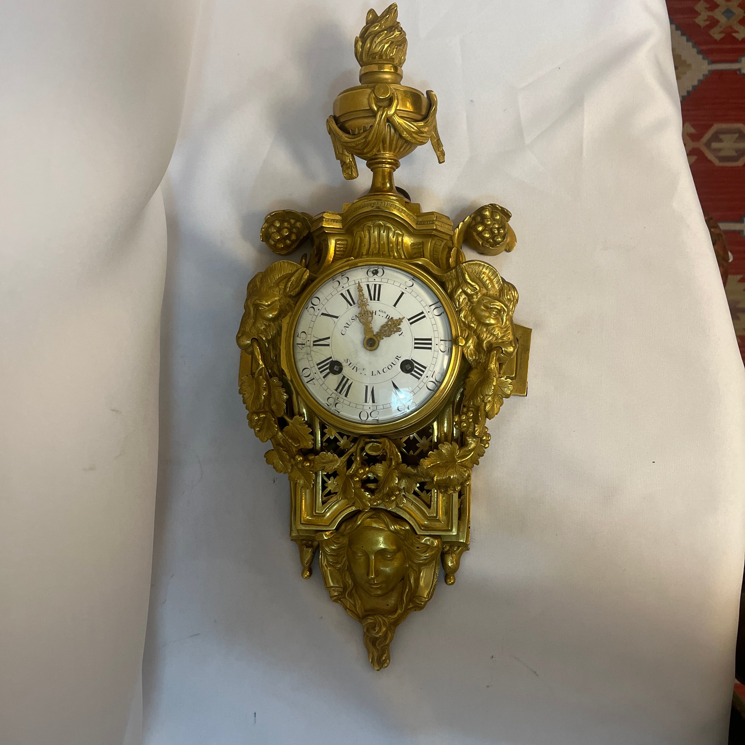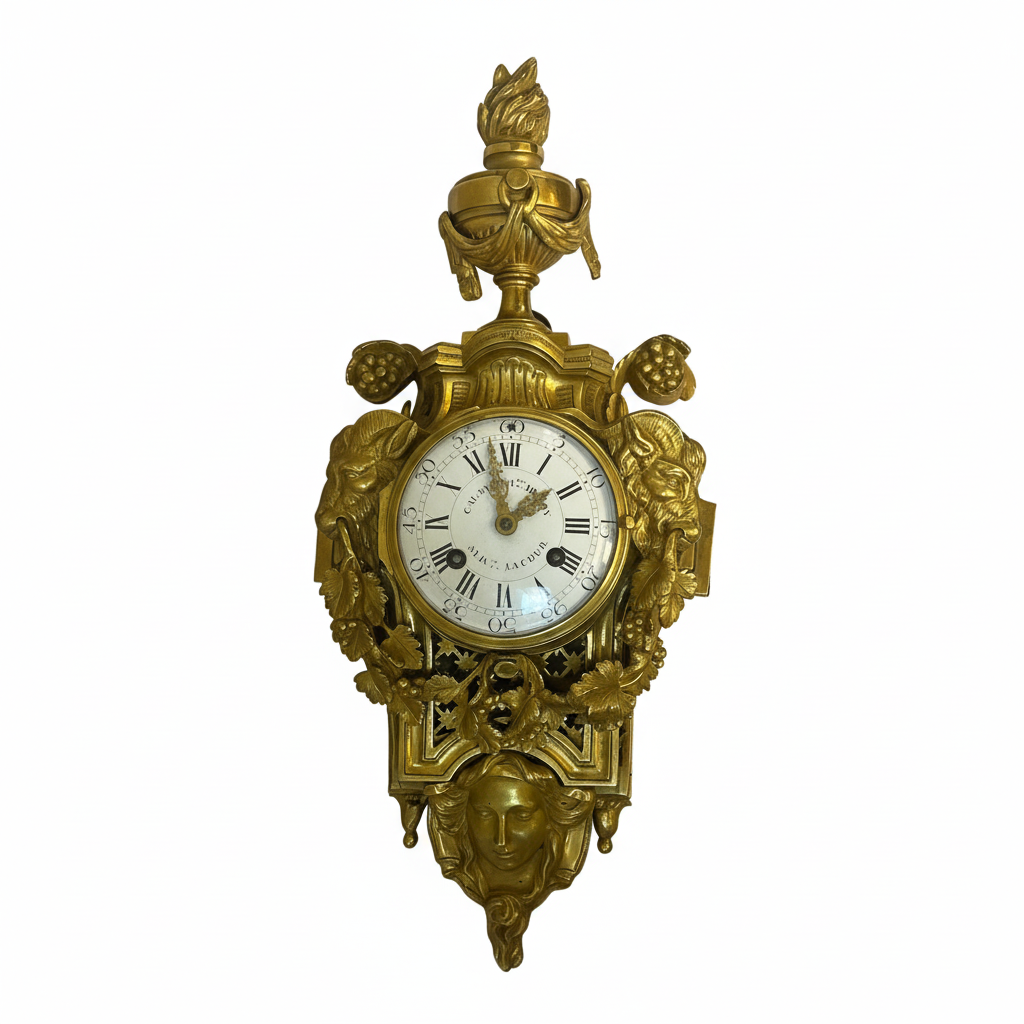 La estructura está coronada por una elegante urna clásica drapeada, símbolo de antigüedad. Los laterales están flanqueados por dinámicas figuras de machos cabríos que emergen entre exuberantes hojas de parra y racimos de uvas. La base del reloj un majestuoso rostro femenino, una cariátide, de rasgos clásicos y serenos ancla la composición, aportando un dramatismo único inigualable. El corazón de esta pieza es su inmaculada esfera de esmalte blanco, protegida por cristal, que presenta números romanos para las horas y arábigos para los minutos, recorridos por aguja de bronce finamente caladas.