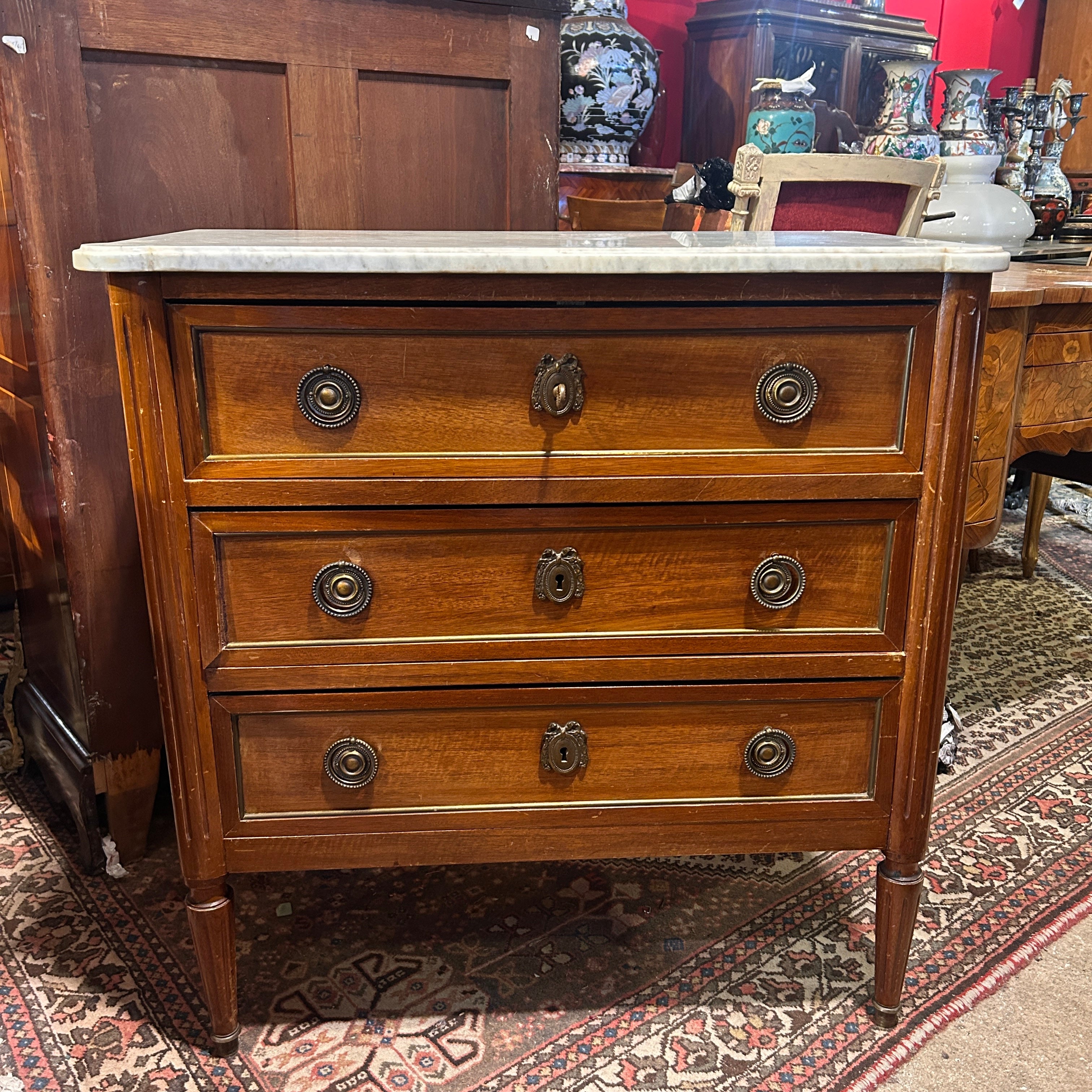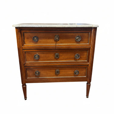 Elegante cómoda francesa estilo Normando trabajada en roble con enchape de caoba con cubierta de mármol veteado blanco grisáceo. Presenta una estructura simétrica, con postes laterales y patas acanaladas protegidas por regatones. Cuenta con tiradores de diseño circular y escudos de cerraduras de bronce patinado trabajados en detalle. Los tres cajones bien proporcionados le dan una alta funcionalidad y su pátina natural da cuenta del valor histórico de la pieza. Trae su llave.
