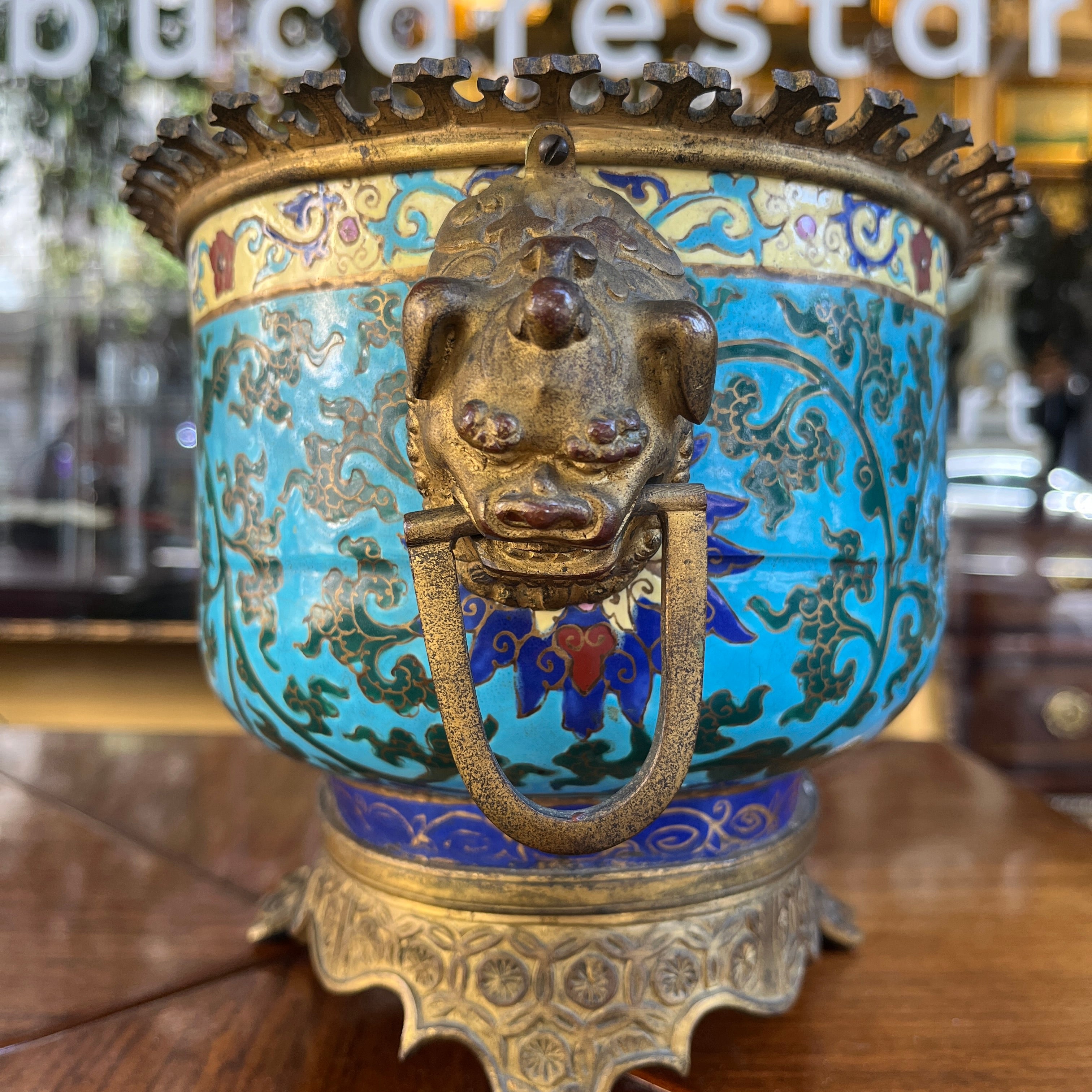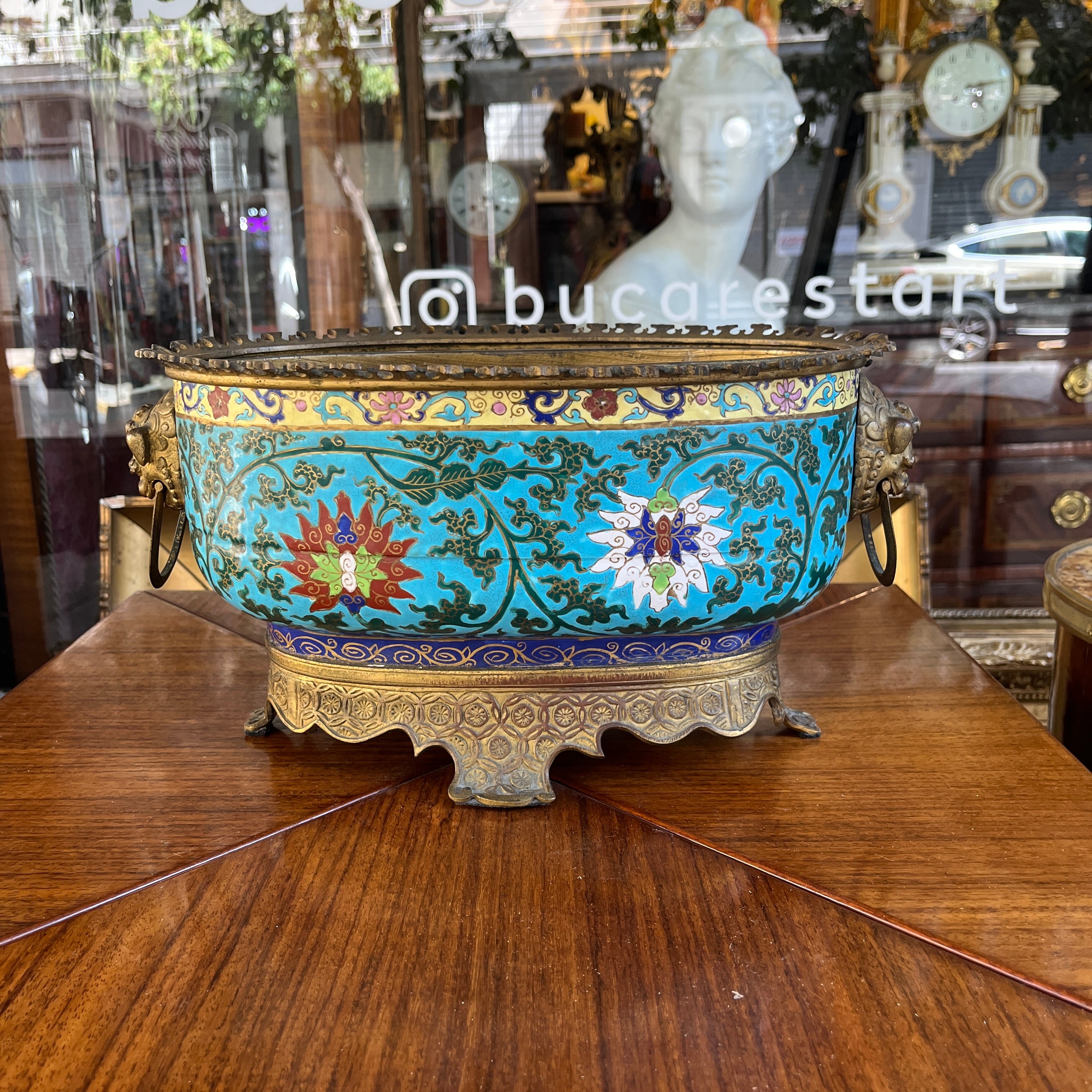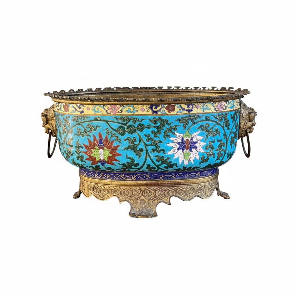 Hermosa jardinera de bronce émaillage estilo cloissoné, con delicado diseño floral y un fondo color celeste turquesa que le entrega una mayor intensidad al diseño. En la parte superior cuenta con una corona de bronce y la base un tallado a mano, además de dos tiradores laterales con forma de perro Fo. Si bien presenta un estilo oriental, fue fabricada en Francia, en estilo orientalista, particularmente en lo que se conoce como chinoisserie. Posiblemente la época es fines del s. XIX.
