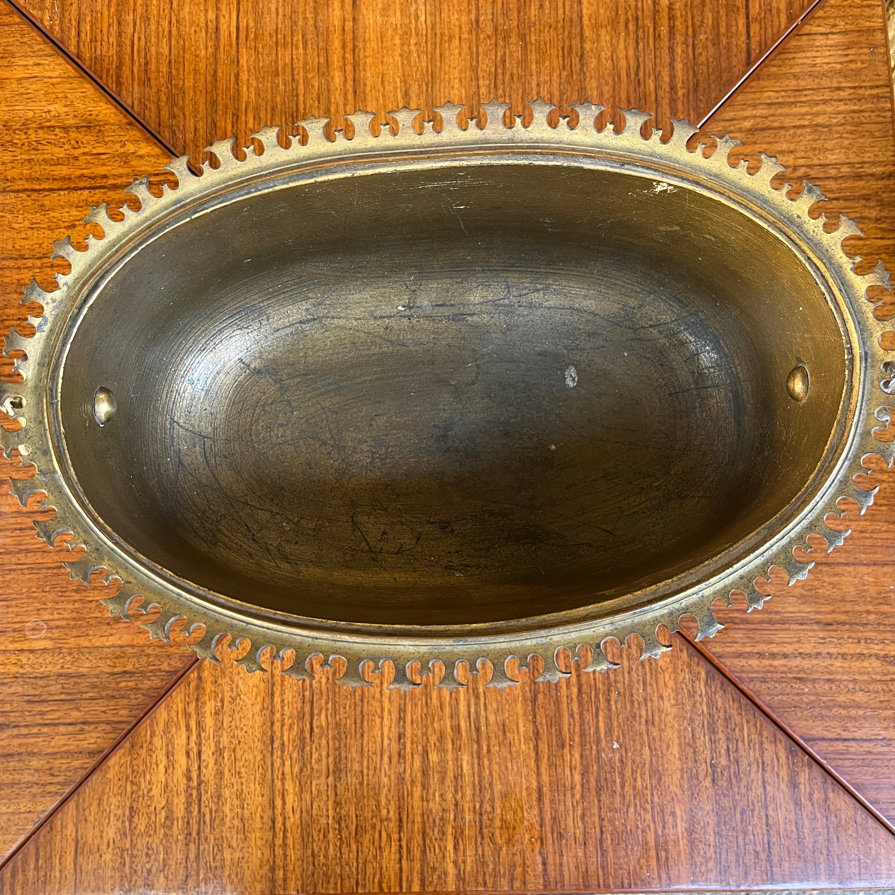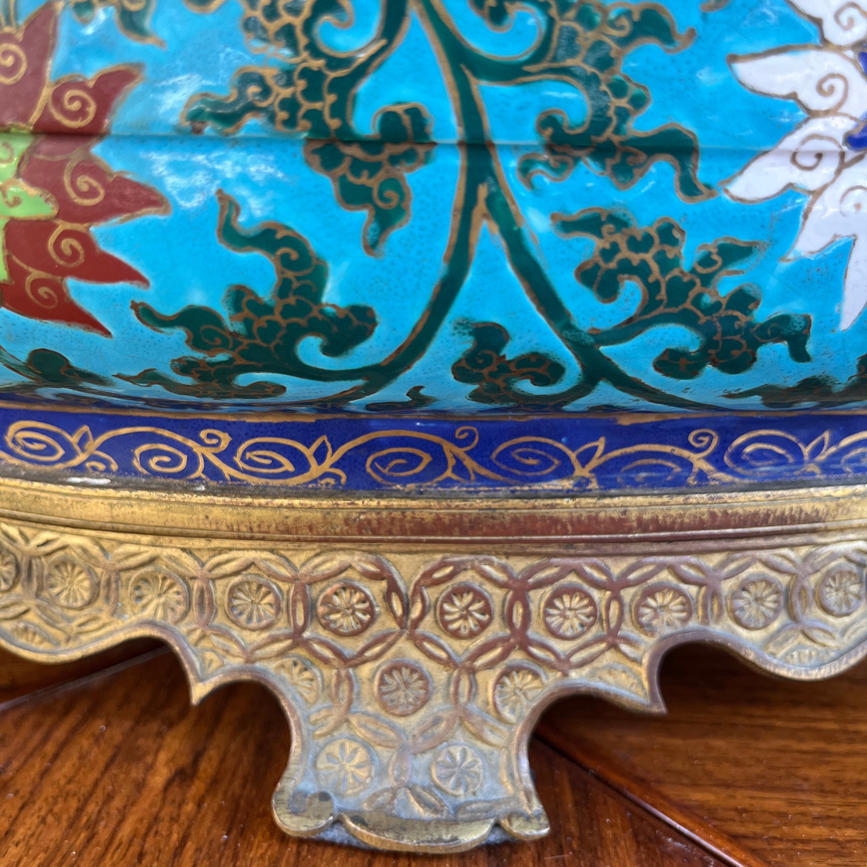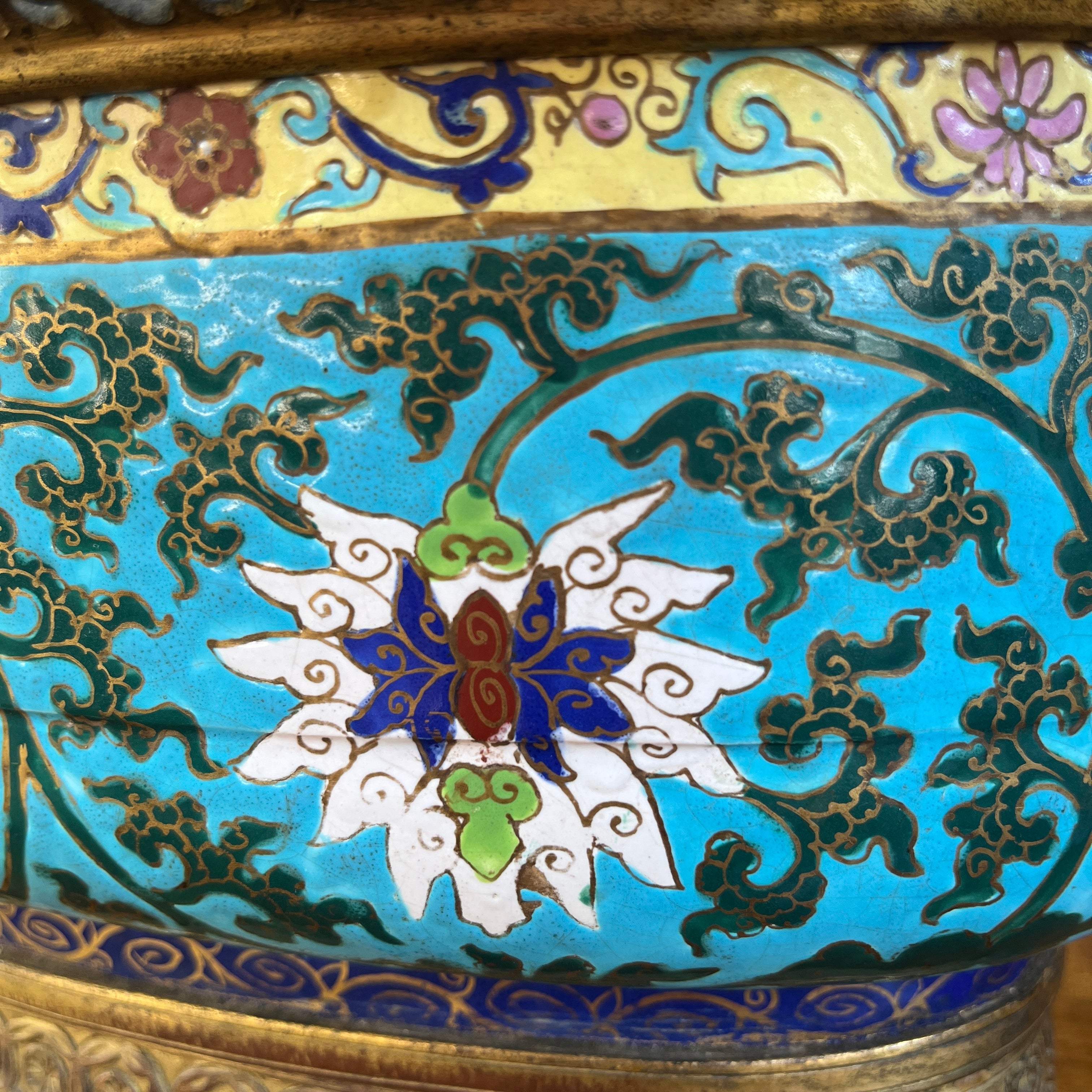 Hermosa jardinera de bronce émaillage estilo cloissoné, con delicado diseño floral y un fondo color celeste turquesa que le entrega una mayor intensidad al diseño. En la parte superior cuenta con una corona de bronce y la base un tallado a mano, además de dos tiradores laterales con forma de perro Fo. Si bien presenta un estilo oriental, fue fabricada en Francia, en estilo orientalista, particularmente en lo que se conoce como chinoisserie. Posiblemente la época es fines del s. XIX.