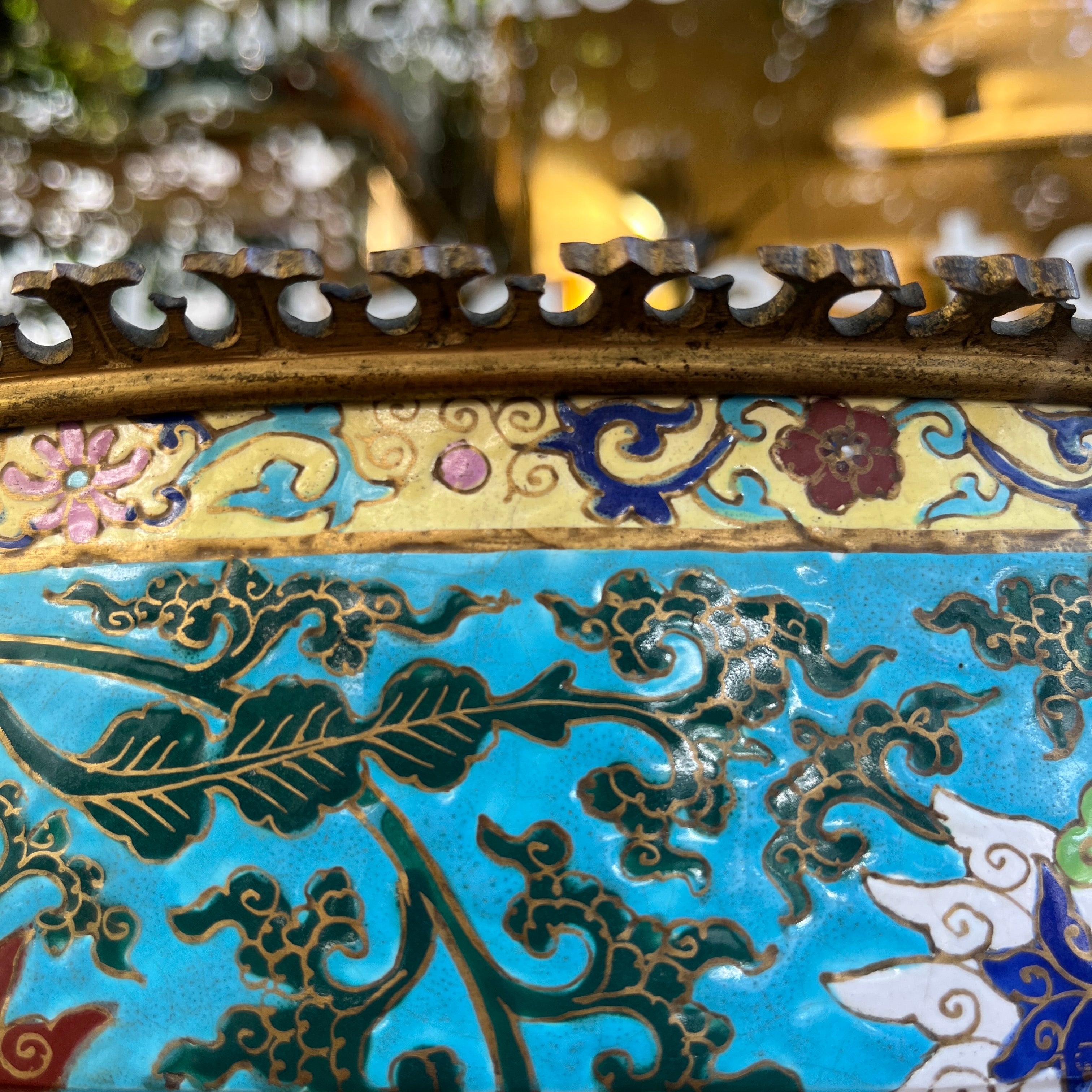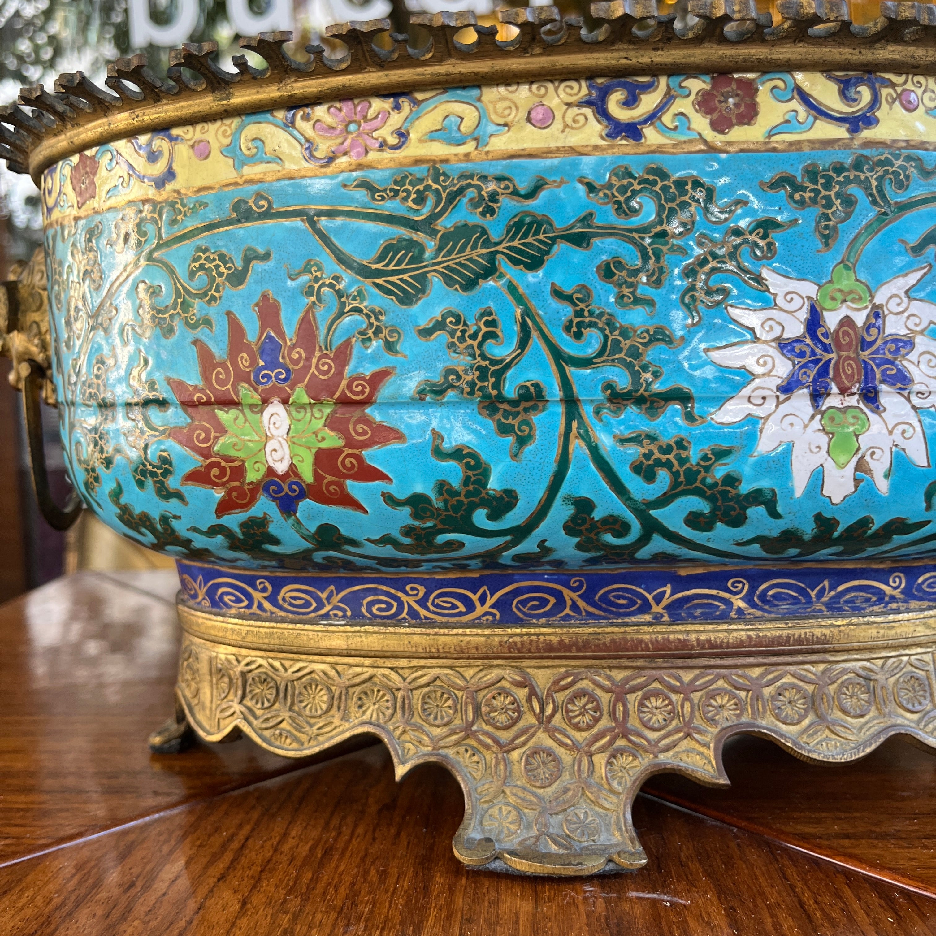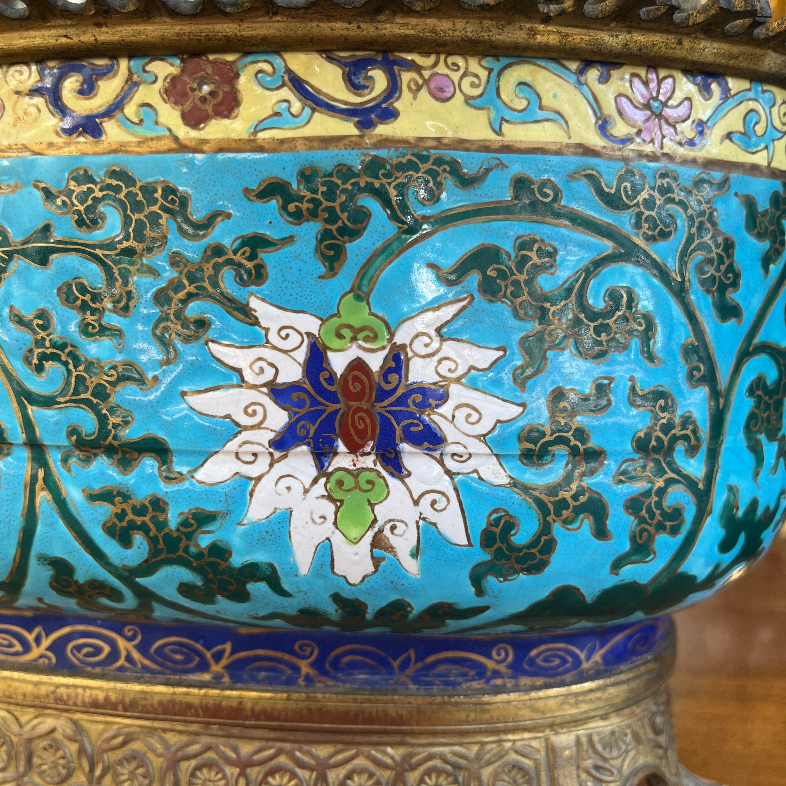 Jardinera francesa de bronce esmaltado chinoisserie con diseño floral fines s.XIX