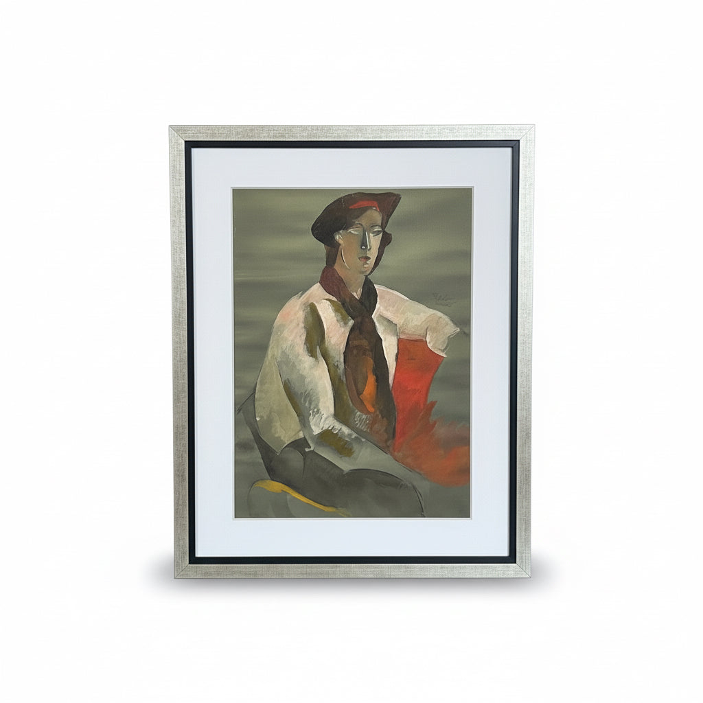 Técnica mixta Wash sobre papel del artista chileno Luis Tejada, representando a un joven sentado, con una bufanda y boina. La obra retrata gran parte del personaje, pero el artista hace el gesto de dejar inacabados algunos detalles y utilizando un fuerte contrapunto de rojos, generando una ausencia de partes del cuerpo y realzando la técnica por sobre la figura. La obra tiene un marco de madera contemporánea terminada en plateado.