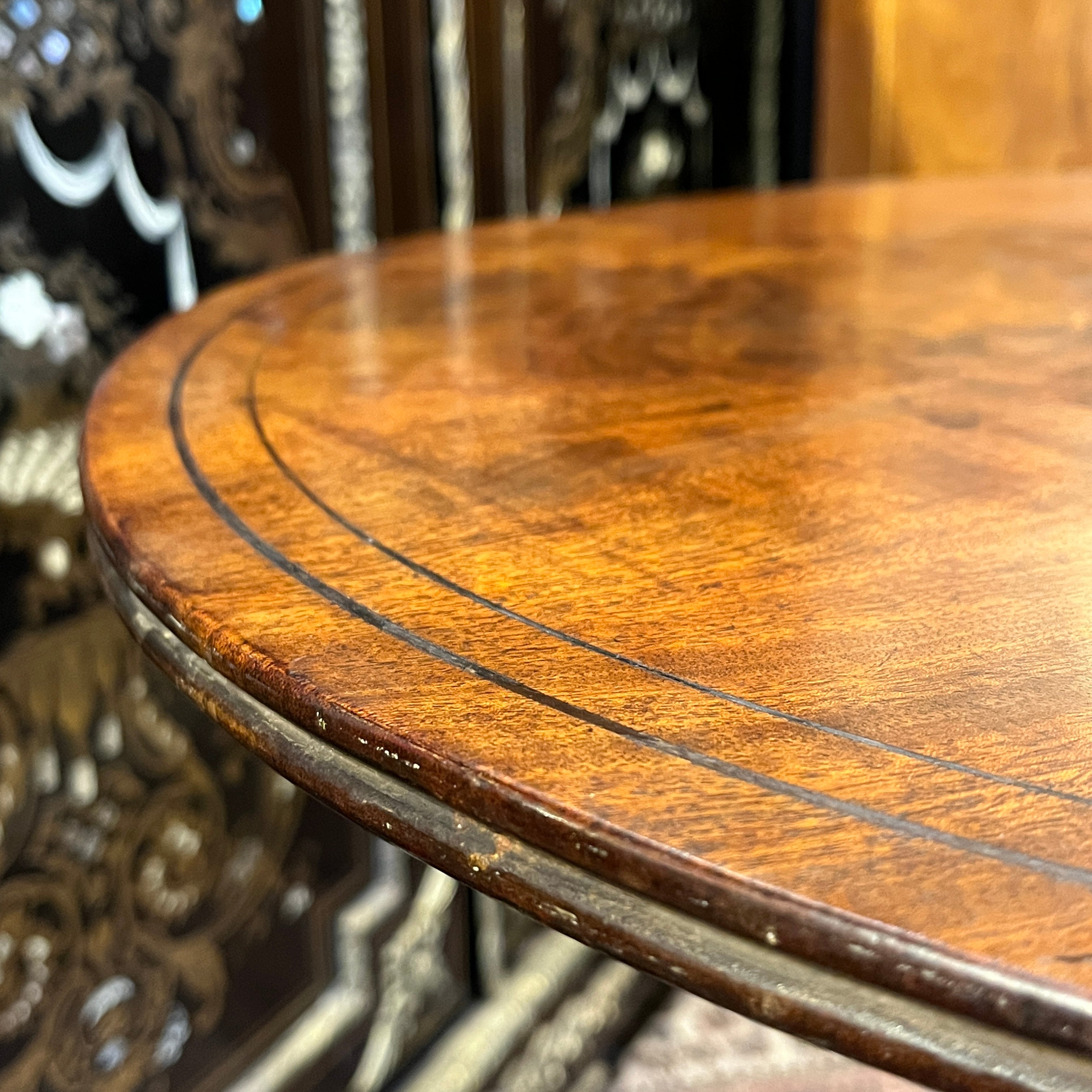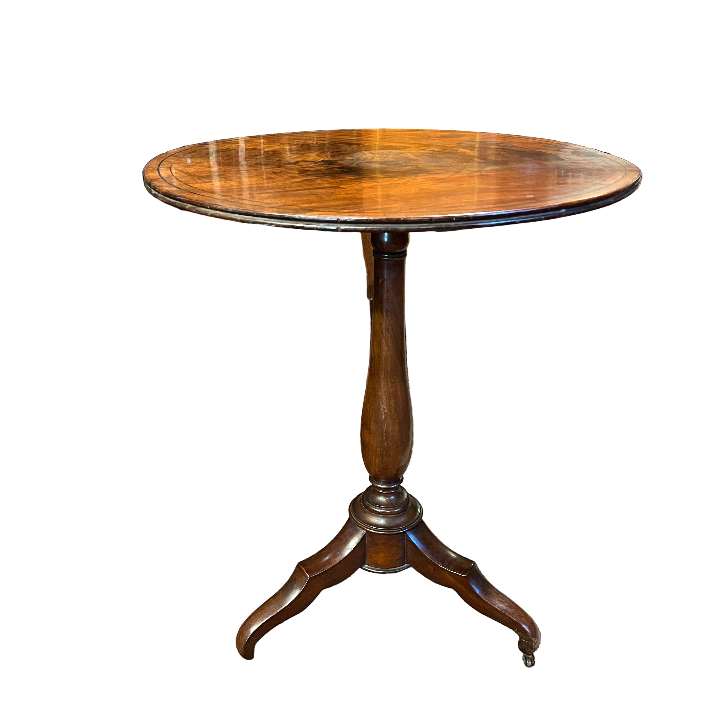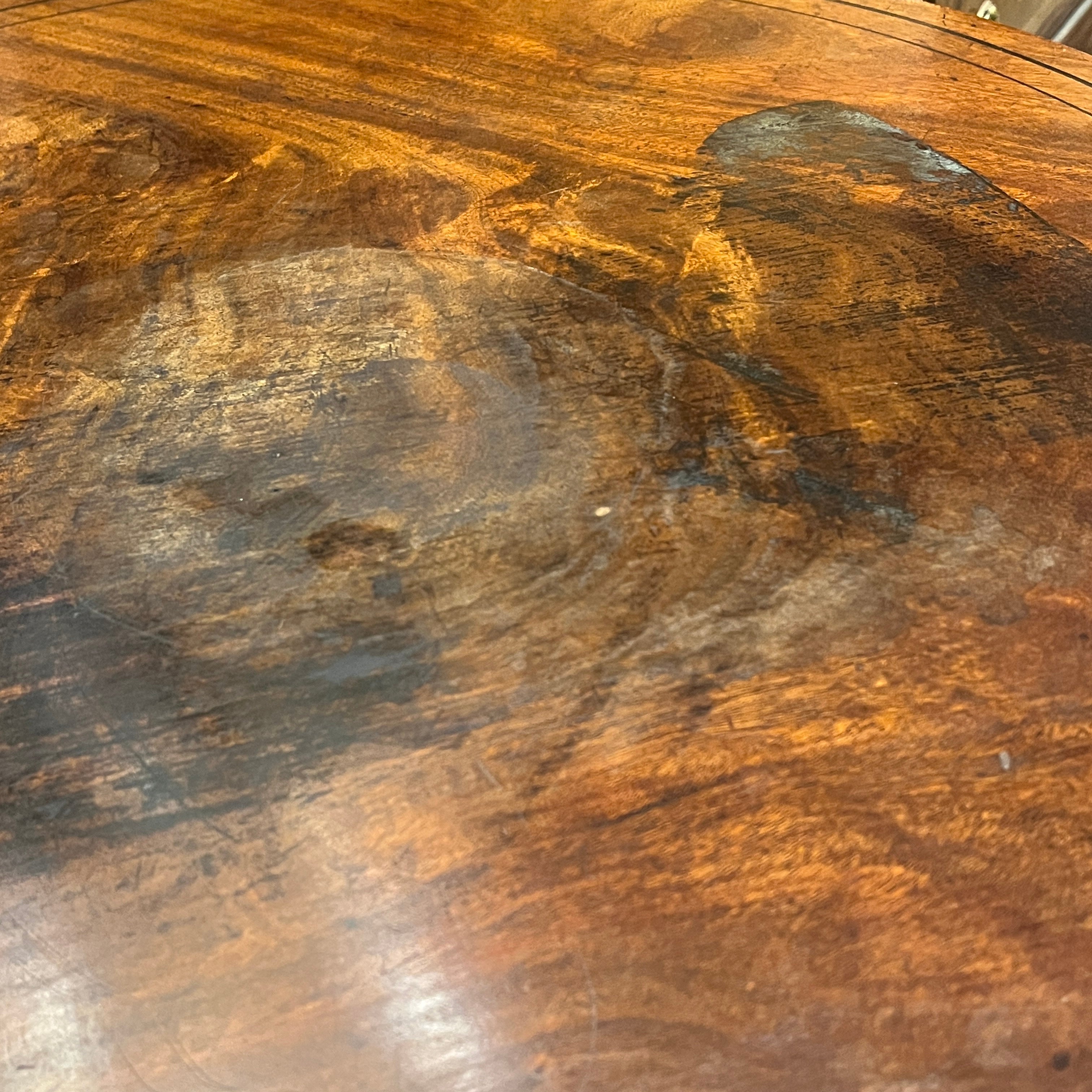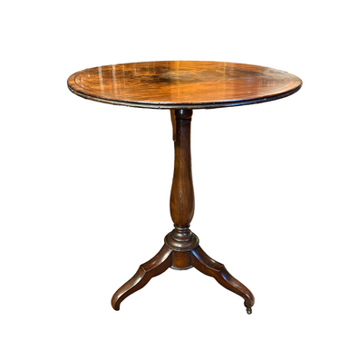 Elegante mesa de centro de origen francés, hecha de madera de caoba con patas torneadas en trípode y ruedas en sus extremos. La superficie de la mesa tiene un diseño simple y sobrio, con dos líneas circulares talladas.