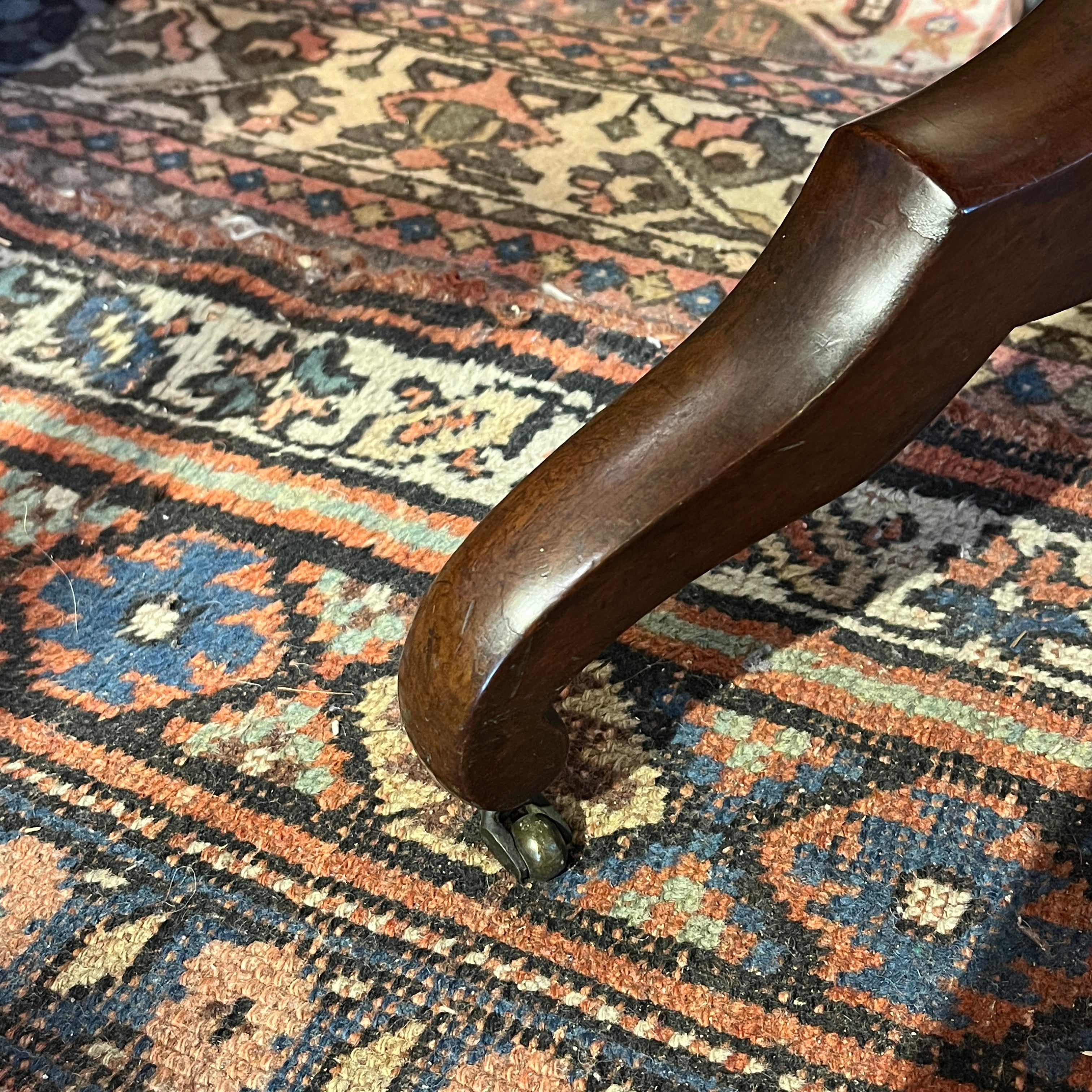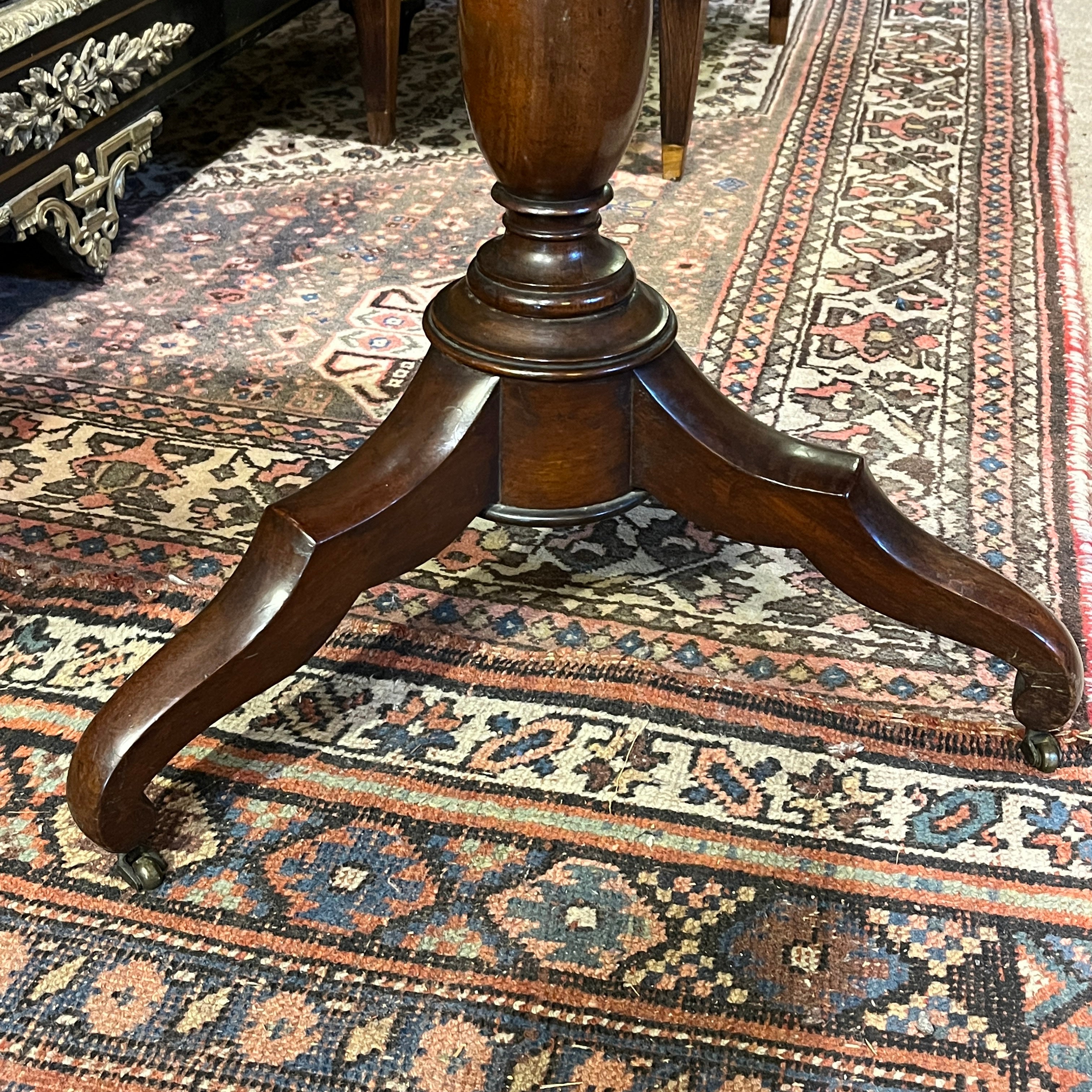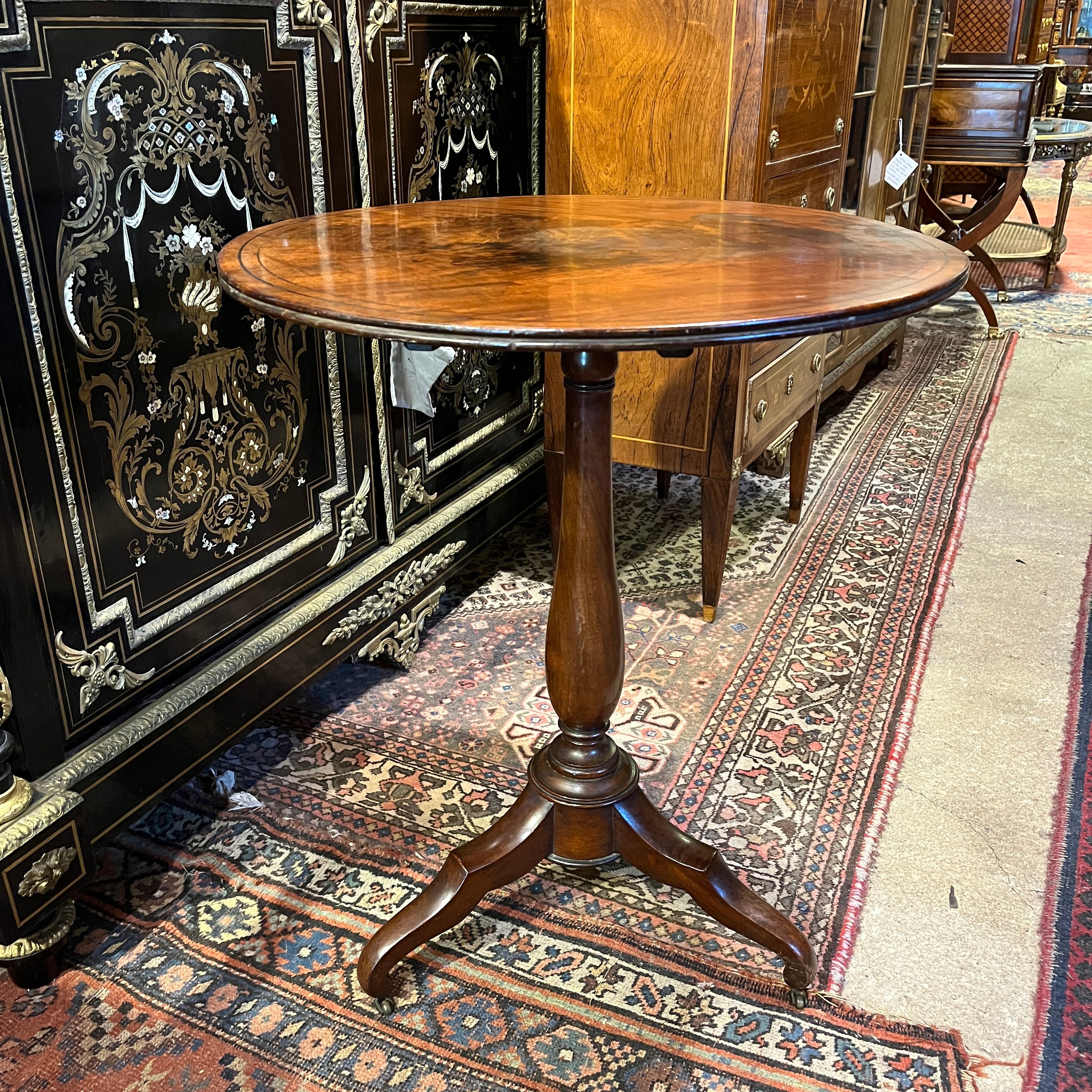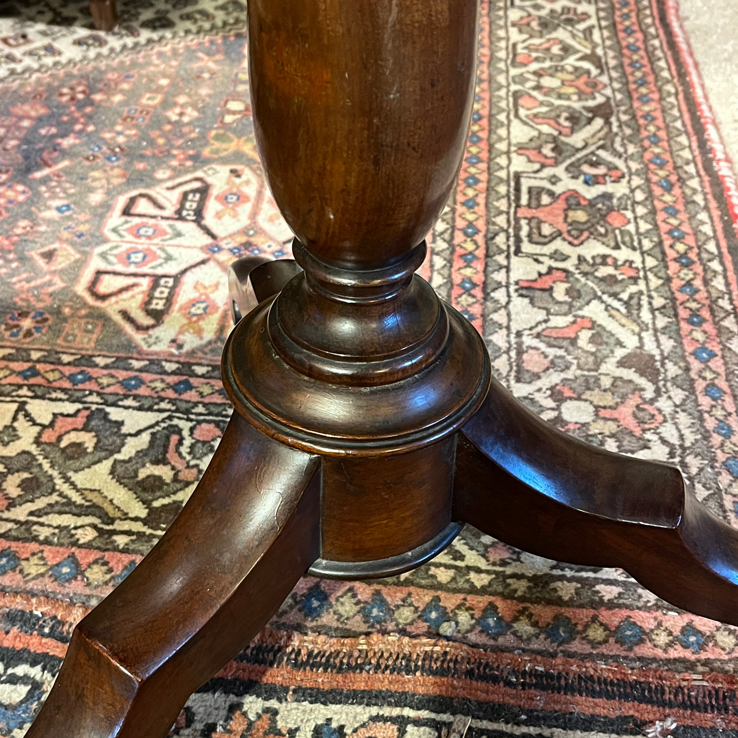 Elegante mesa de centro de origen francés, hecha de madera de caoba con patas torneadas en trípode y ruedas en sus extremos. La superficie de la mesa tiene un diseño simple y sobrio, con dos líneas circulares talladas.