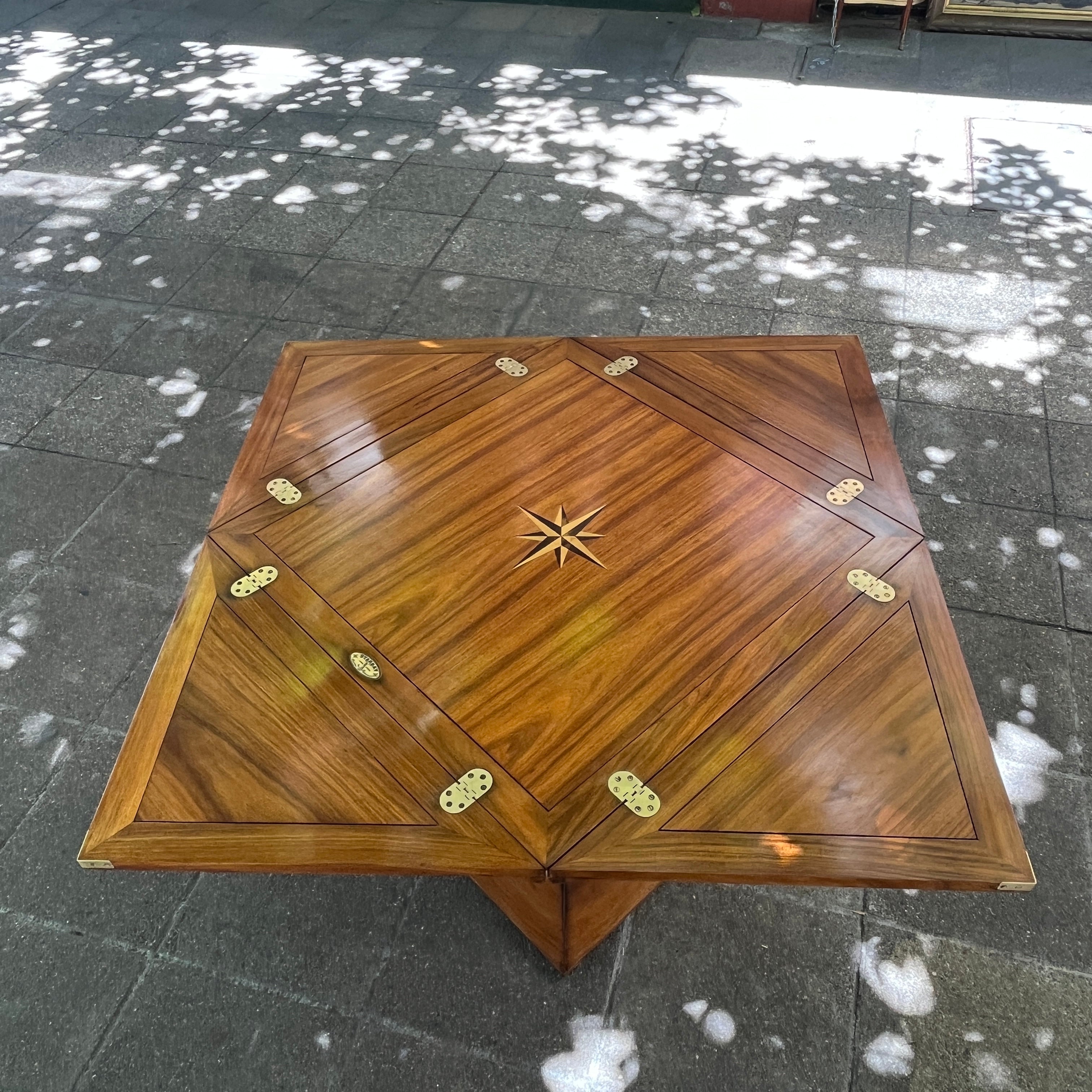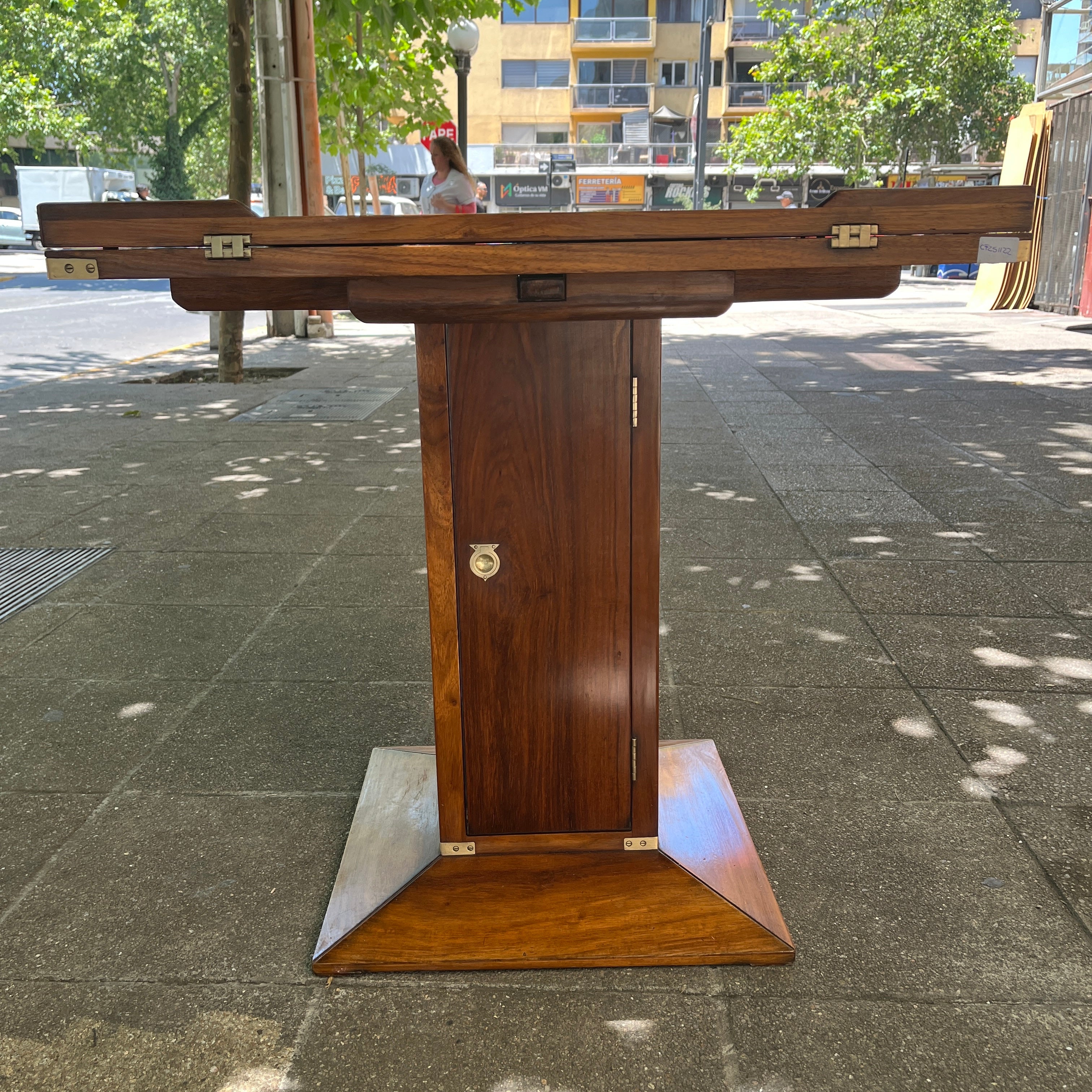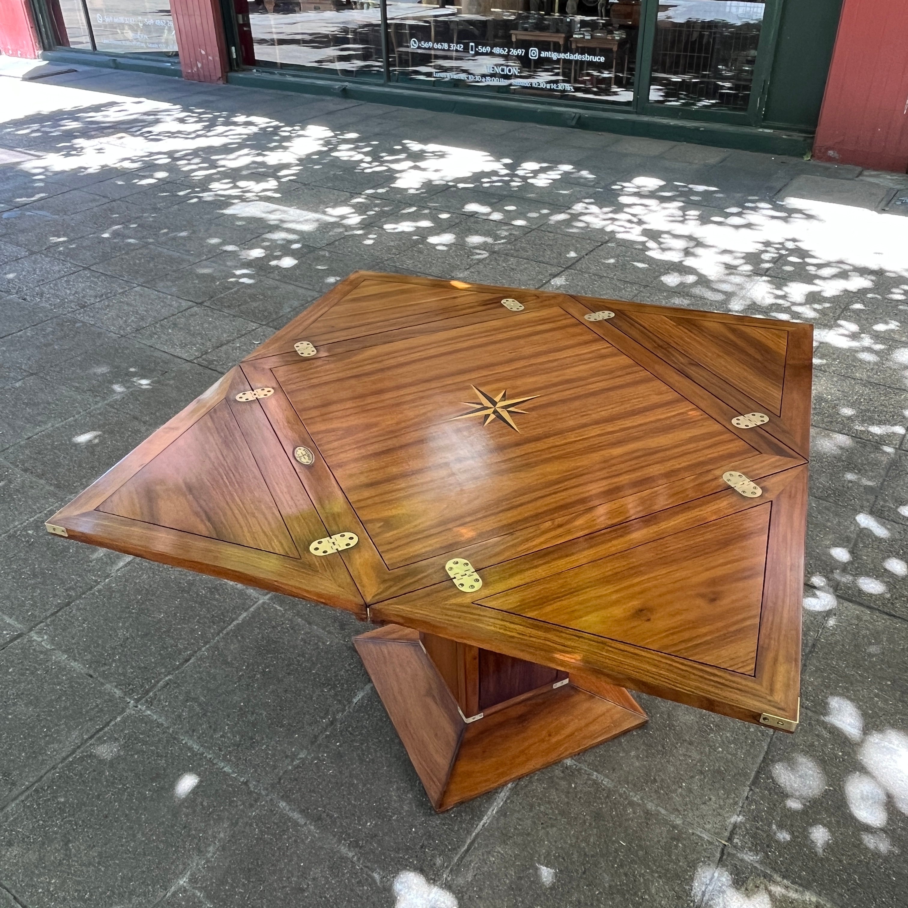 Bella mesa inglesa de la marca Starbay, de estilo marítimo, con estrella de madera clara y oscura, base rectangular con puerta y repisas. Inspirada en mueble naval. La mesa se despliega con un sistema de 4 puntas, aumentando sus dimensiones.